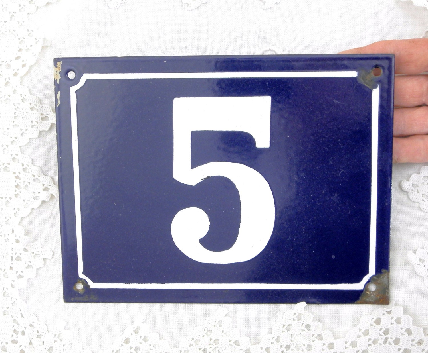 Large vintage dark blue colored enamel French house number plate, number 5.