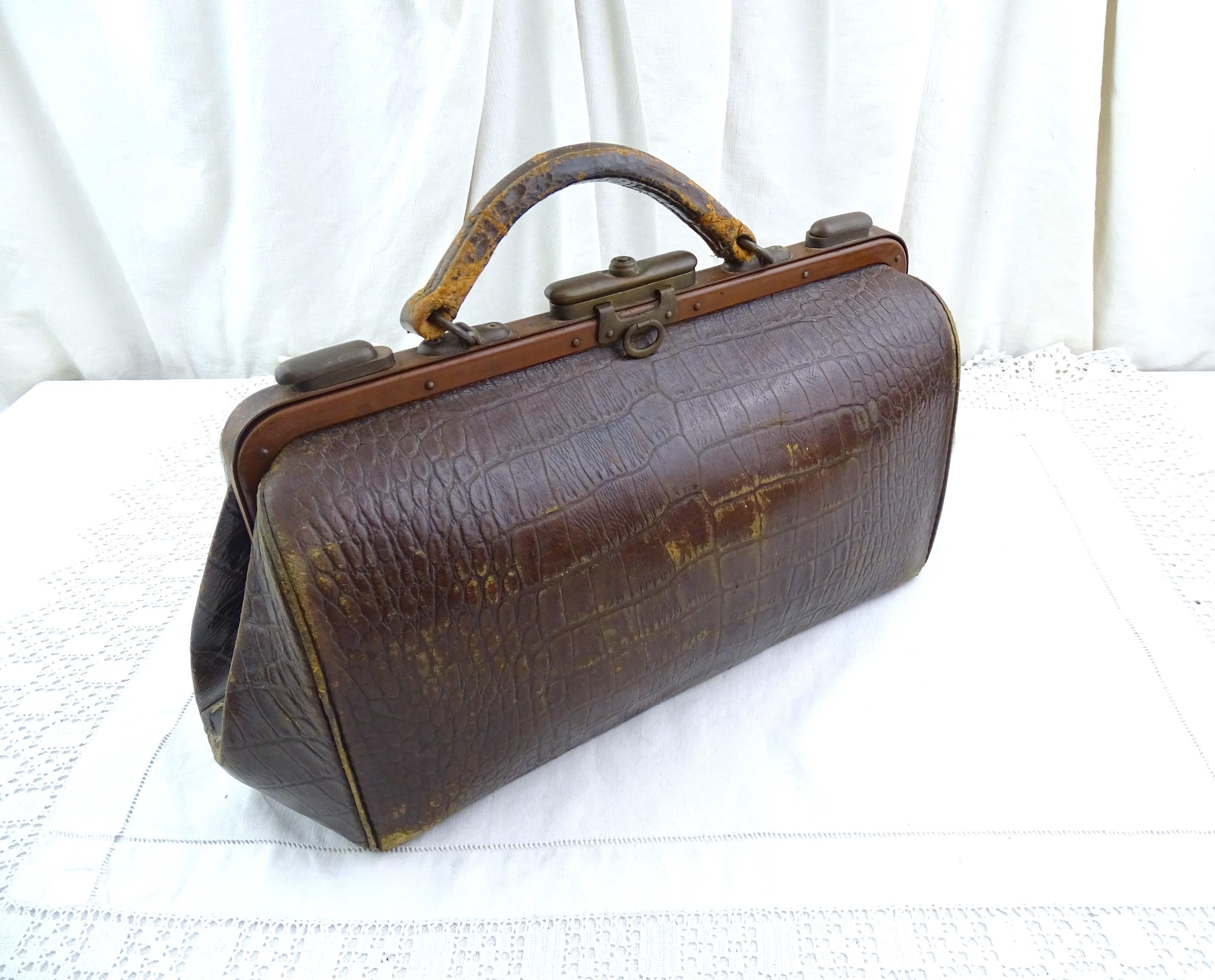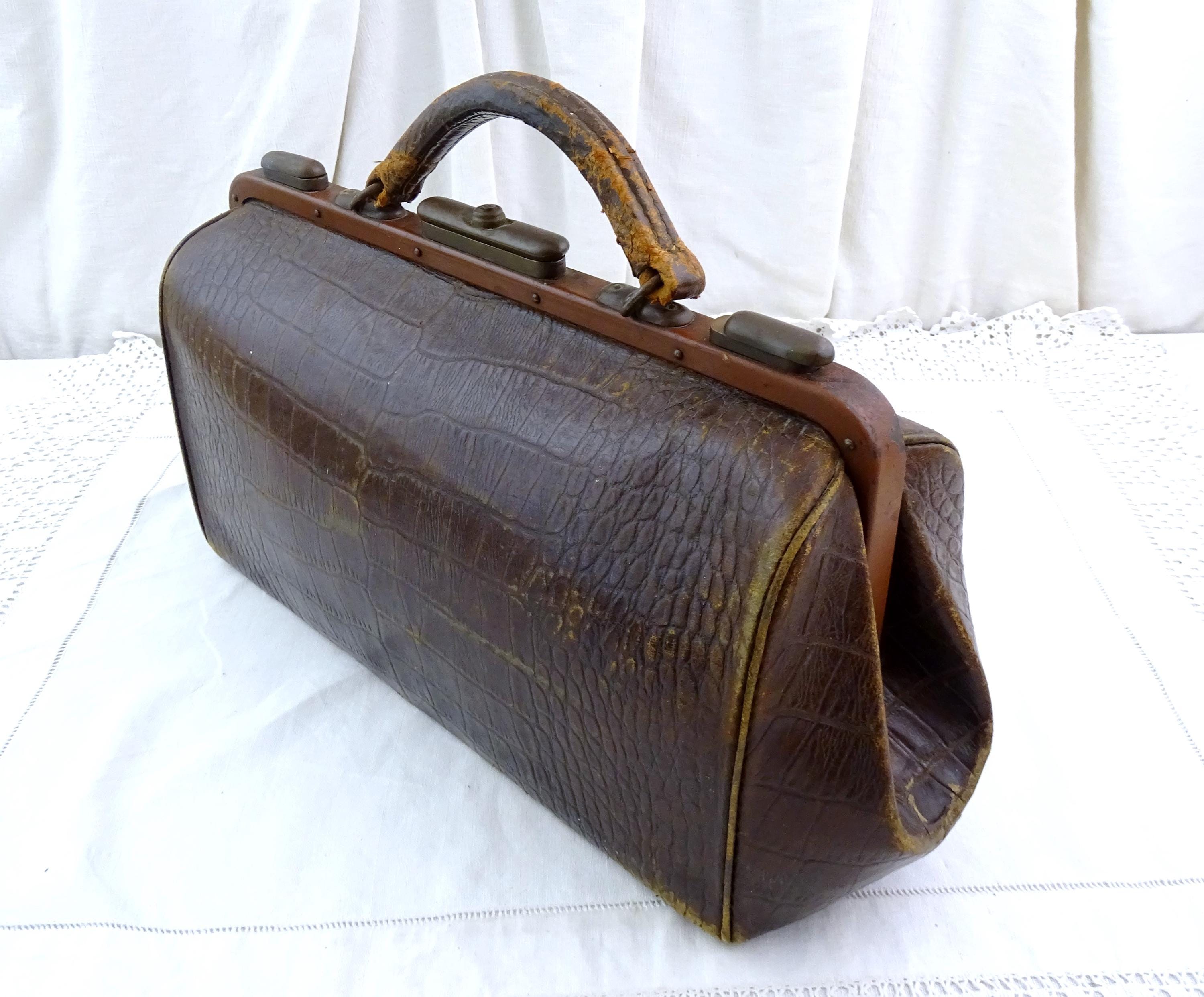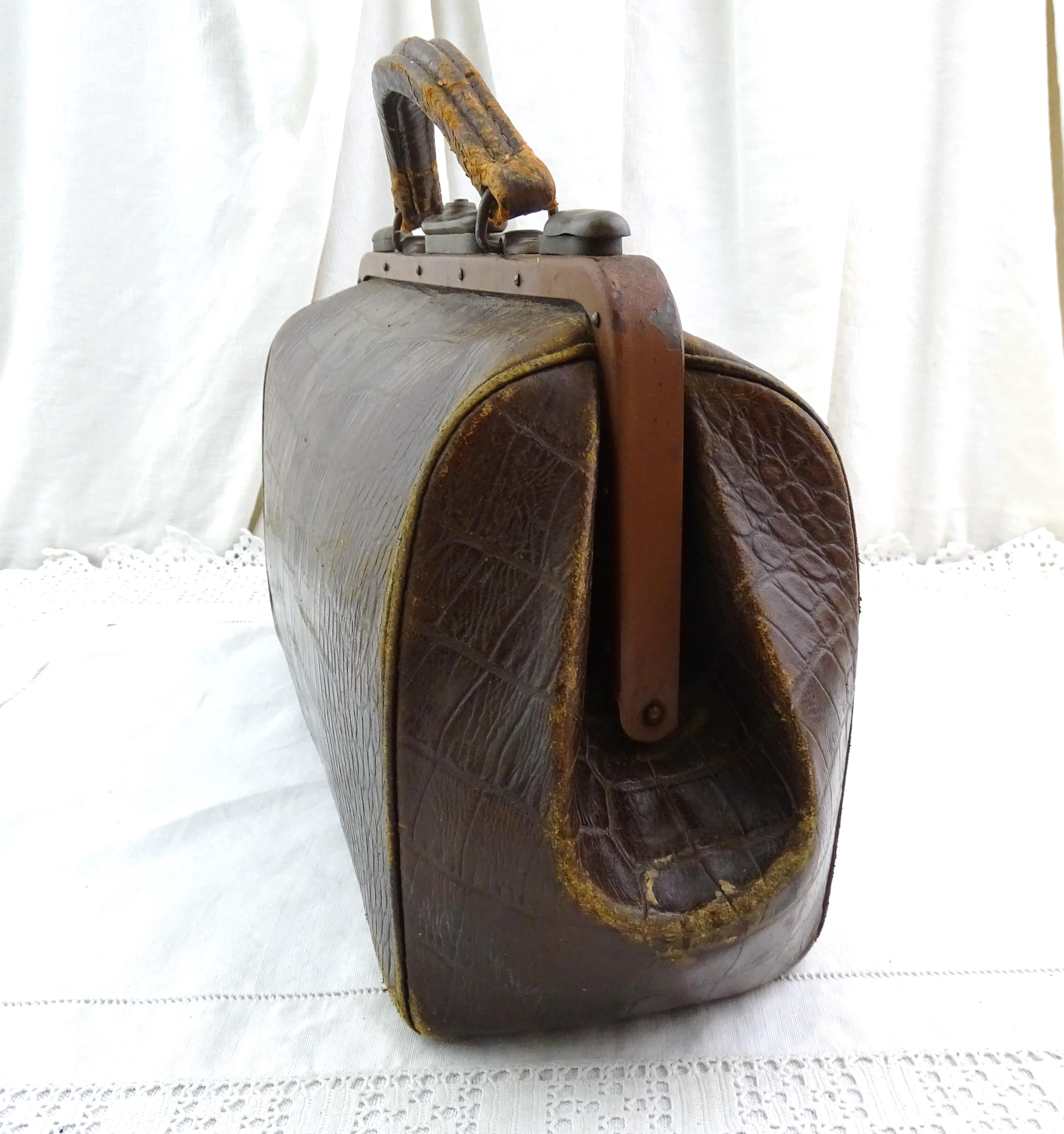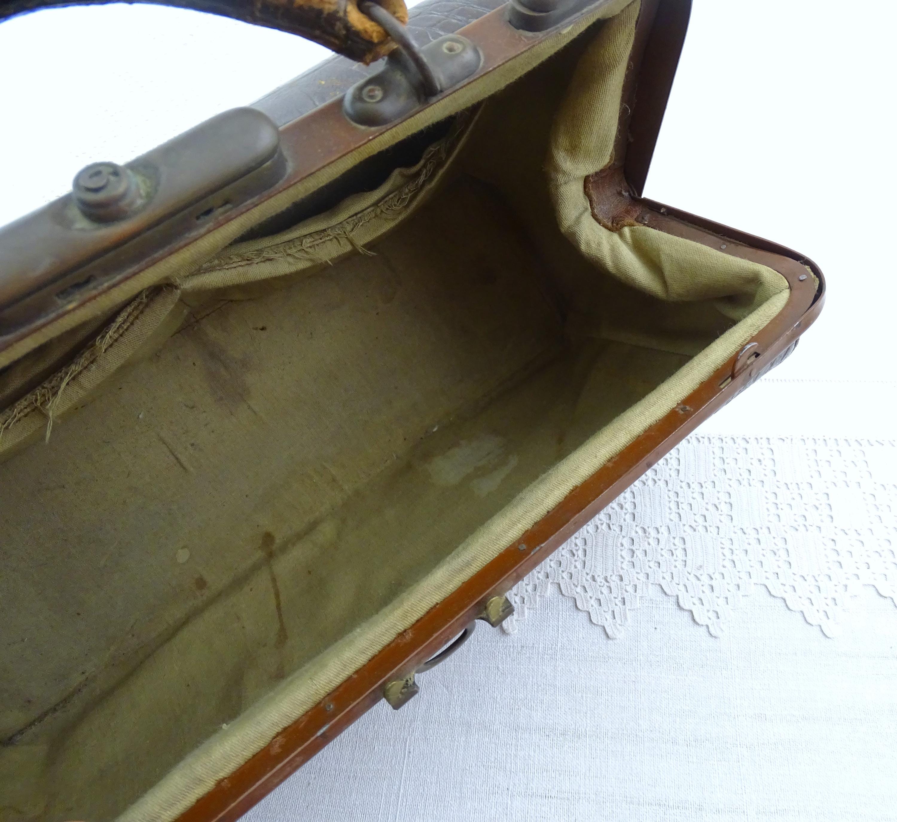 Antique French Gladstone bag. Leather exterior with fabric lining, Unfortunately no key to lock the bag. Circa 1920s.