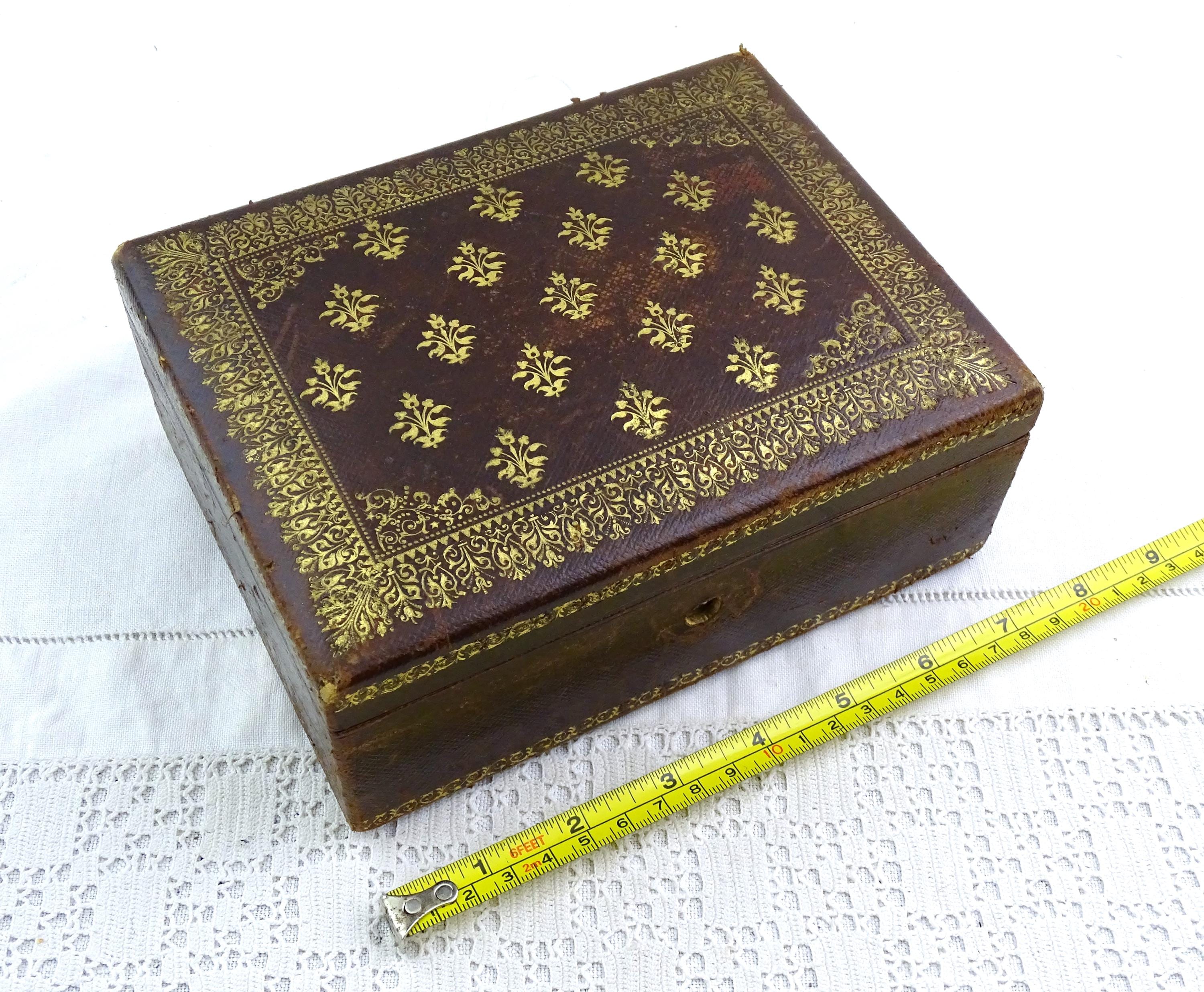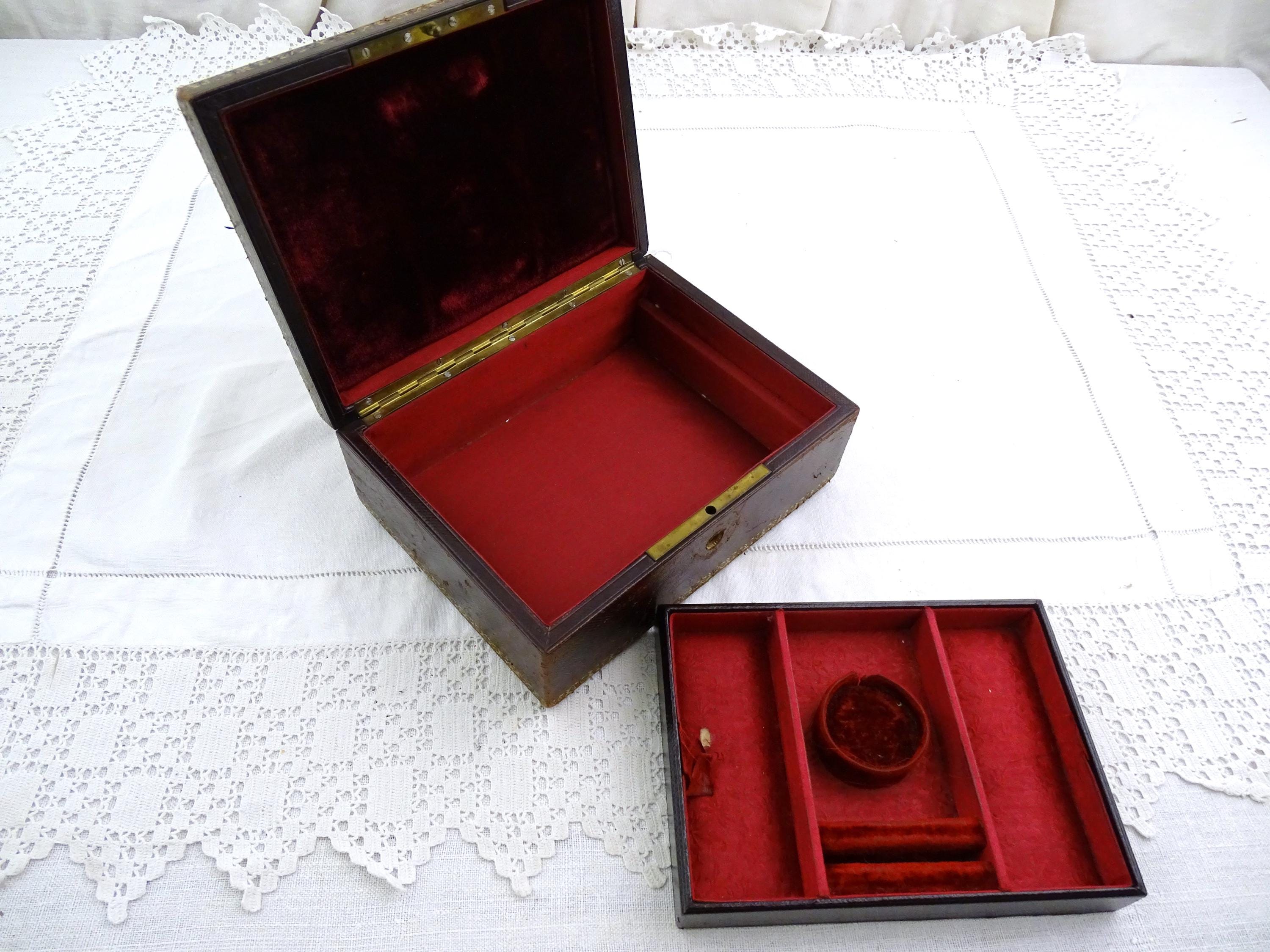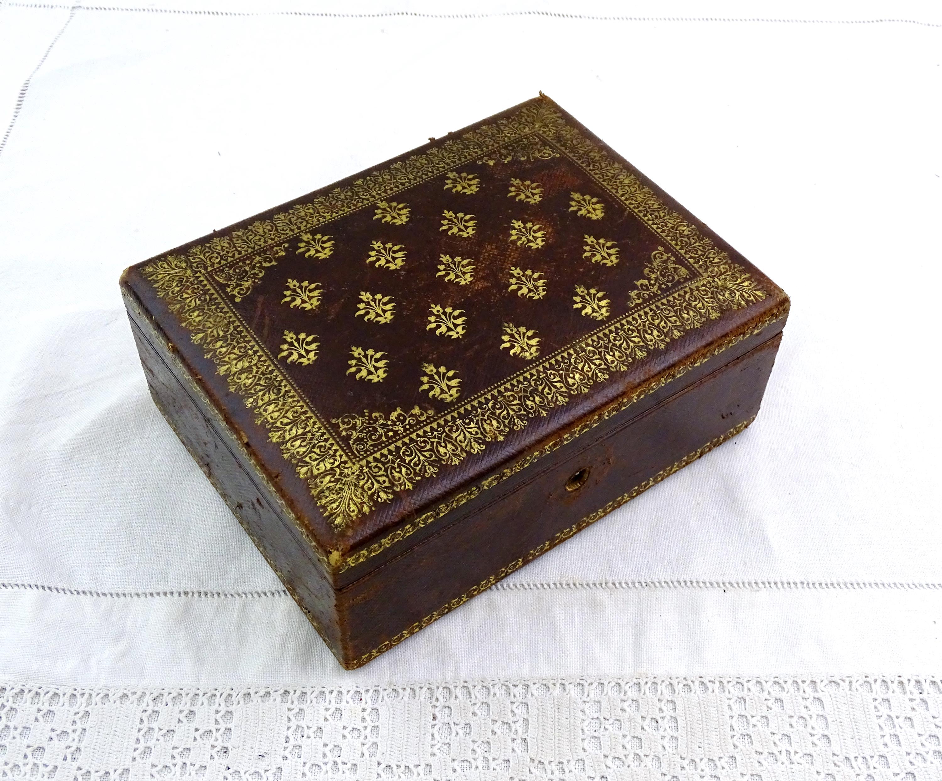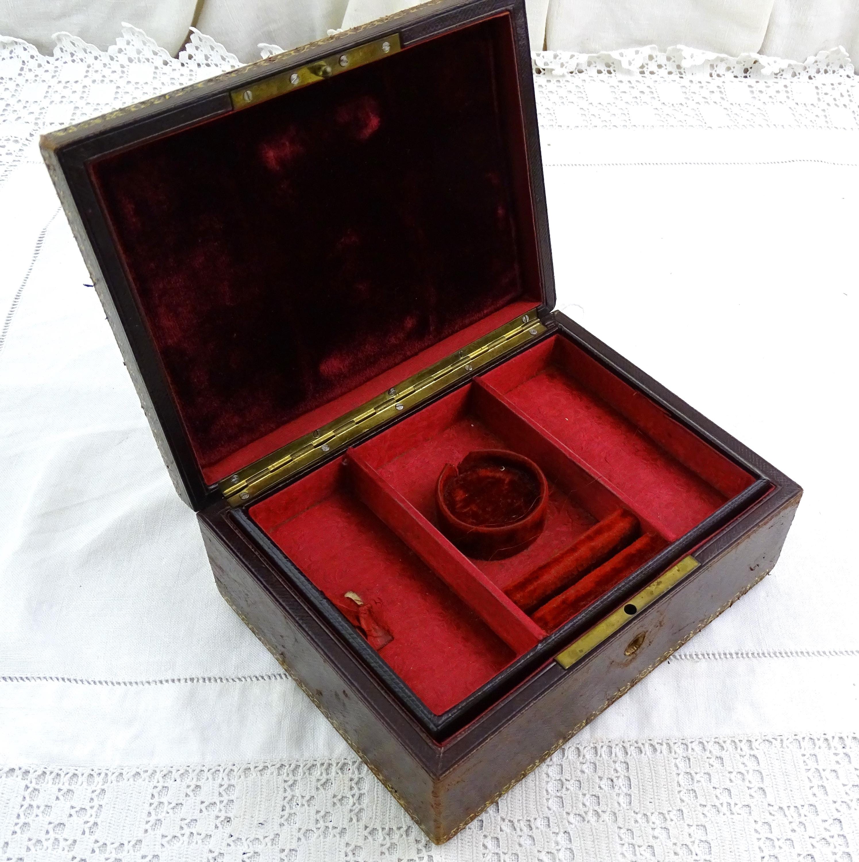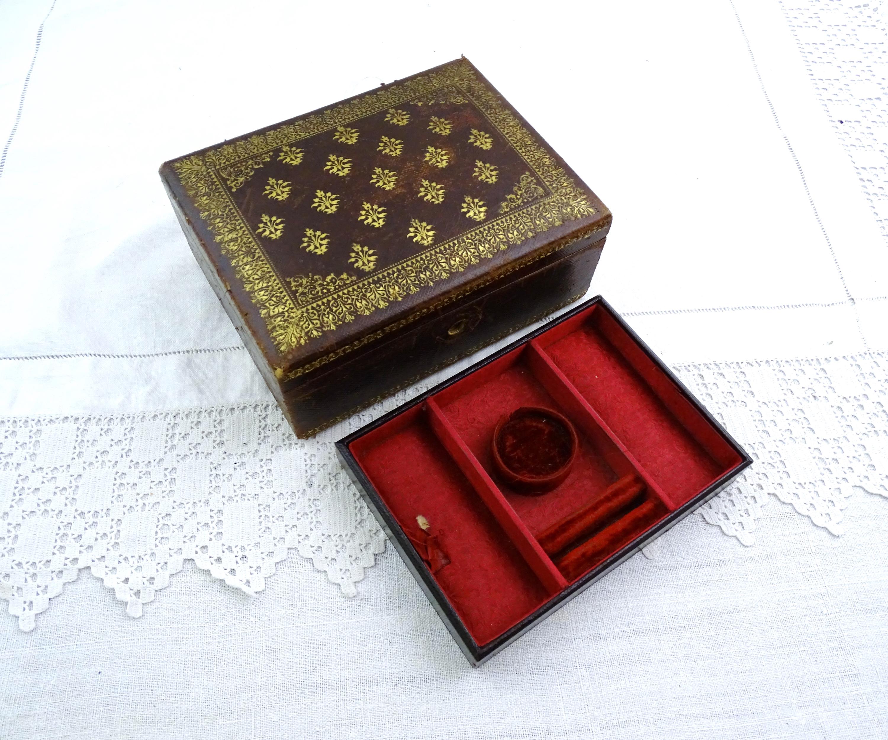 Antique French gilded leather jewelry box with removable interior compartment. Made of maroon leather with gold pattern on the lid the interior red velvet and satin. Ca 1800s.