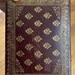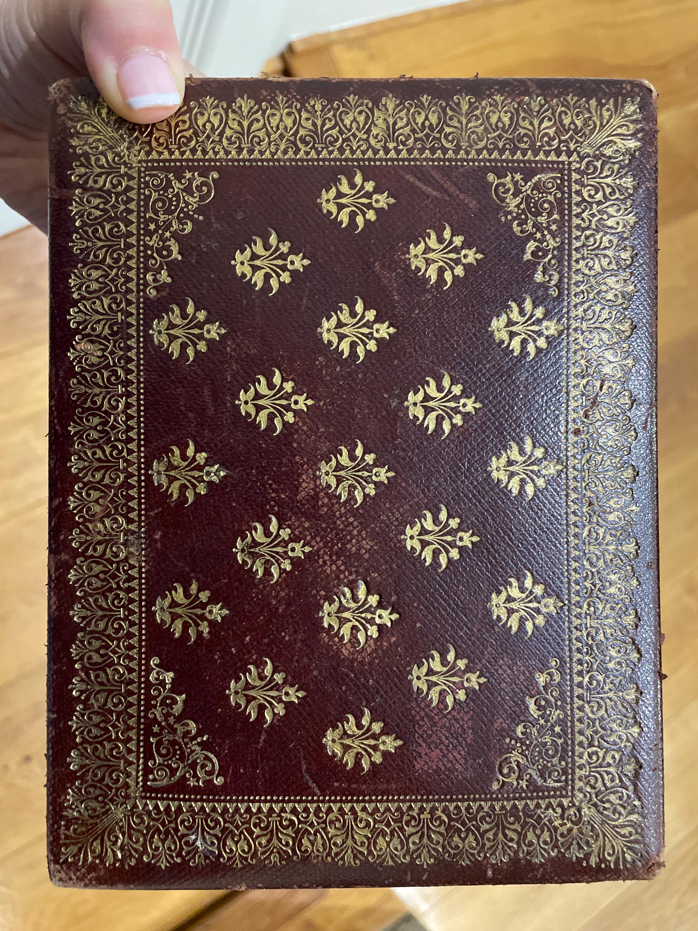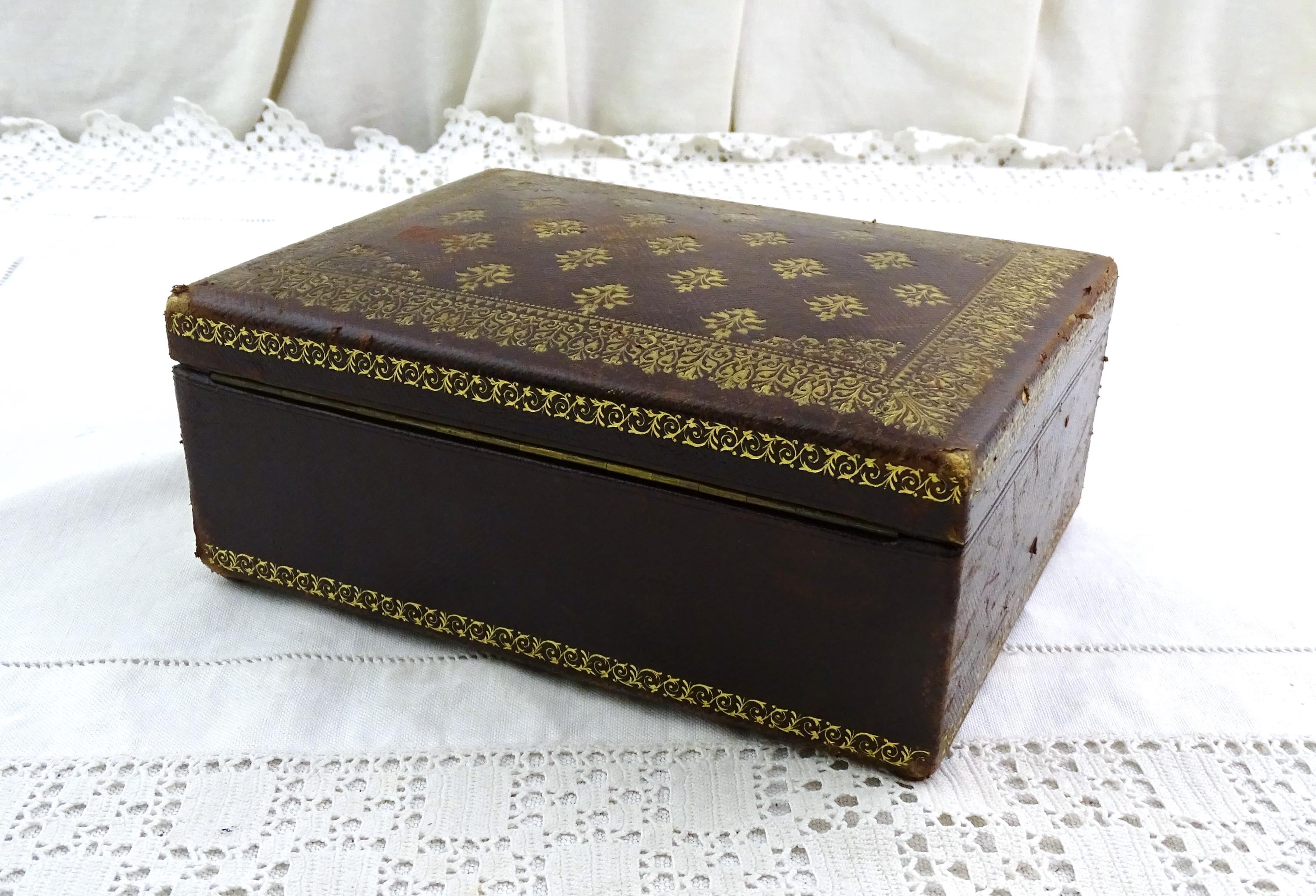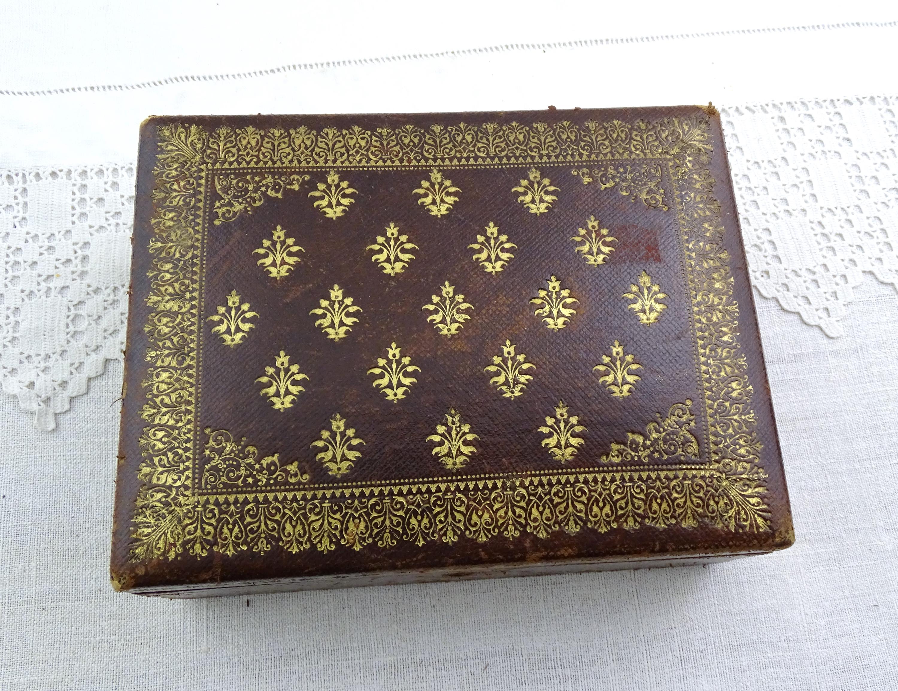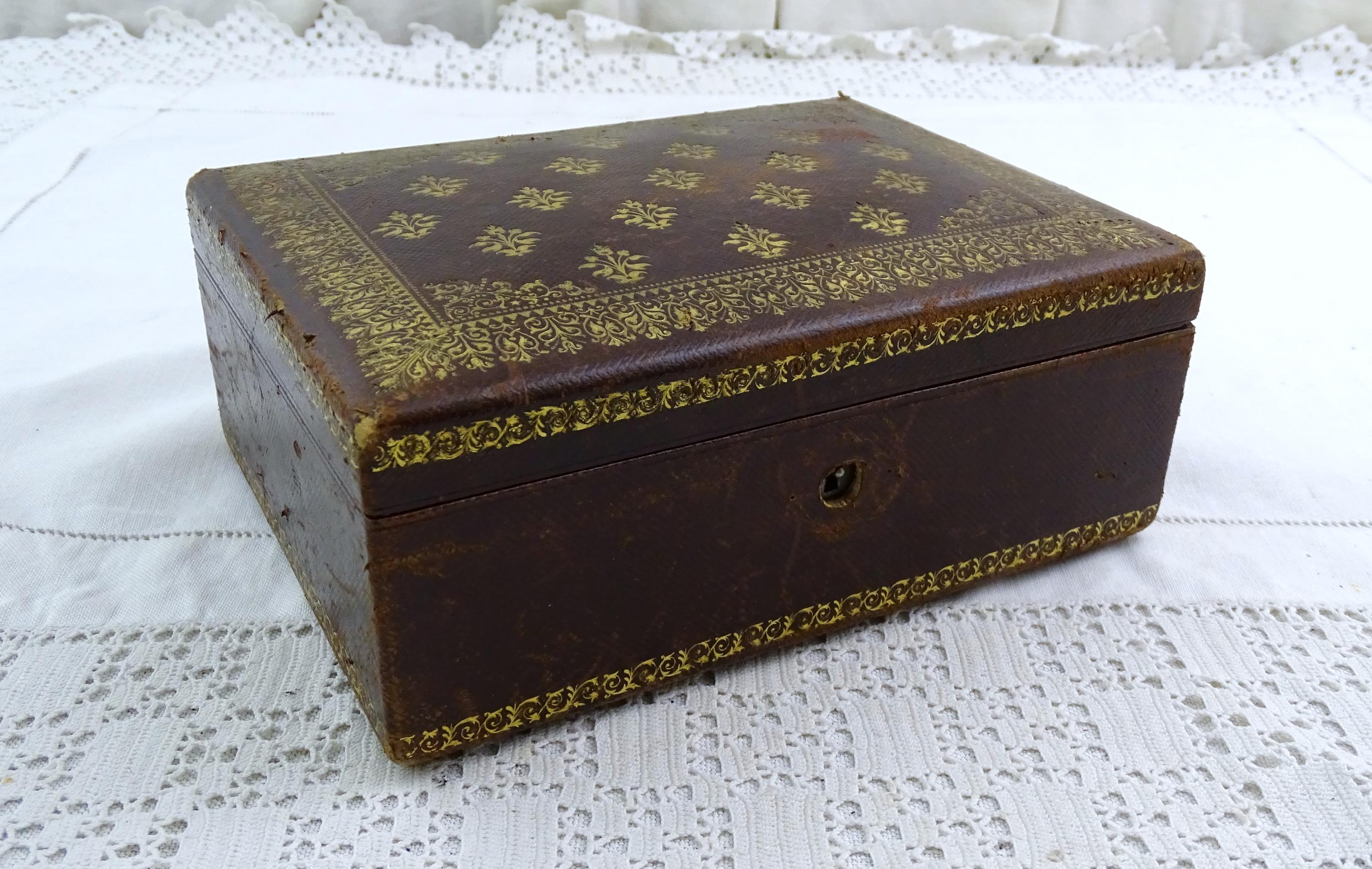 Antique French gilded leather jewelry box with removable interior compartment. Made of maroon leather with gold pattern on the lid the interior red velvet and satin. Ca 1800s.