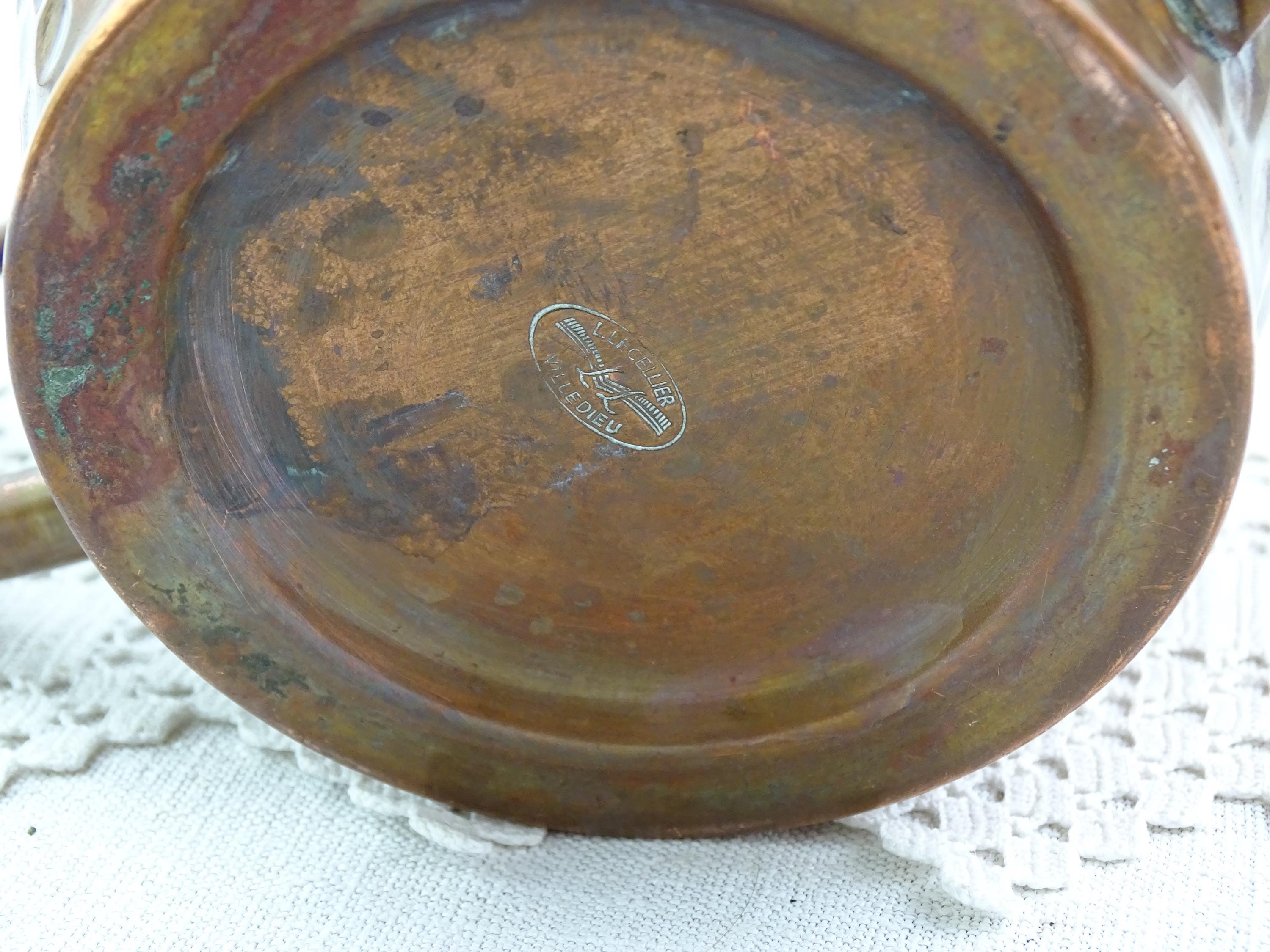 • In antique pre used condition, marks and faint stains that could be polished out with copper polish, few small dents on the rim.