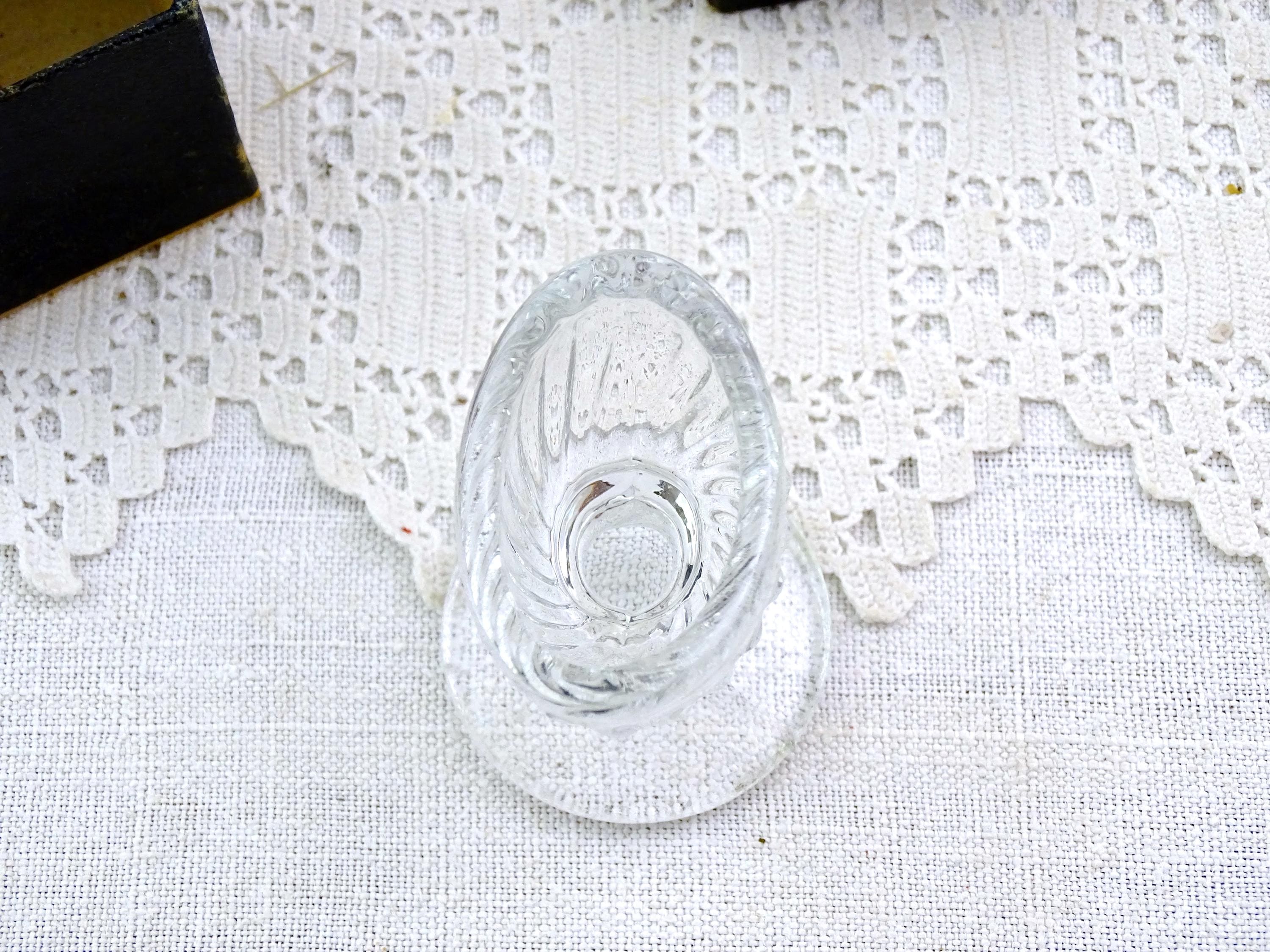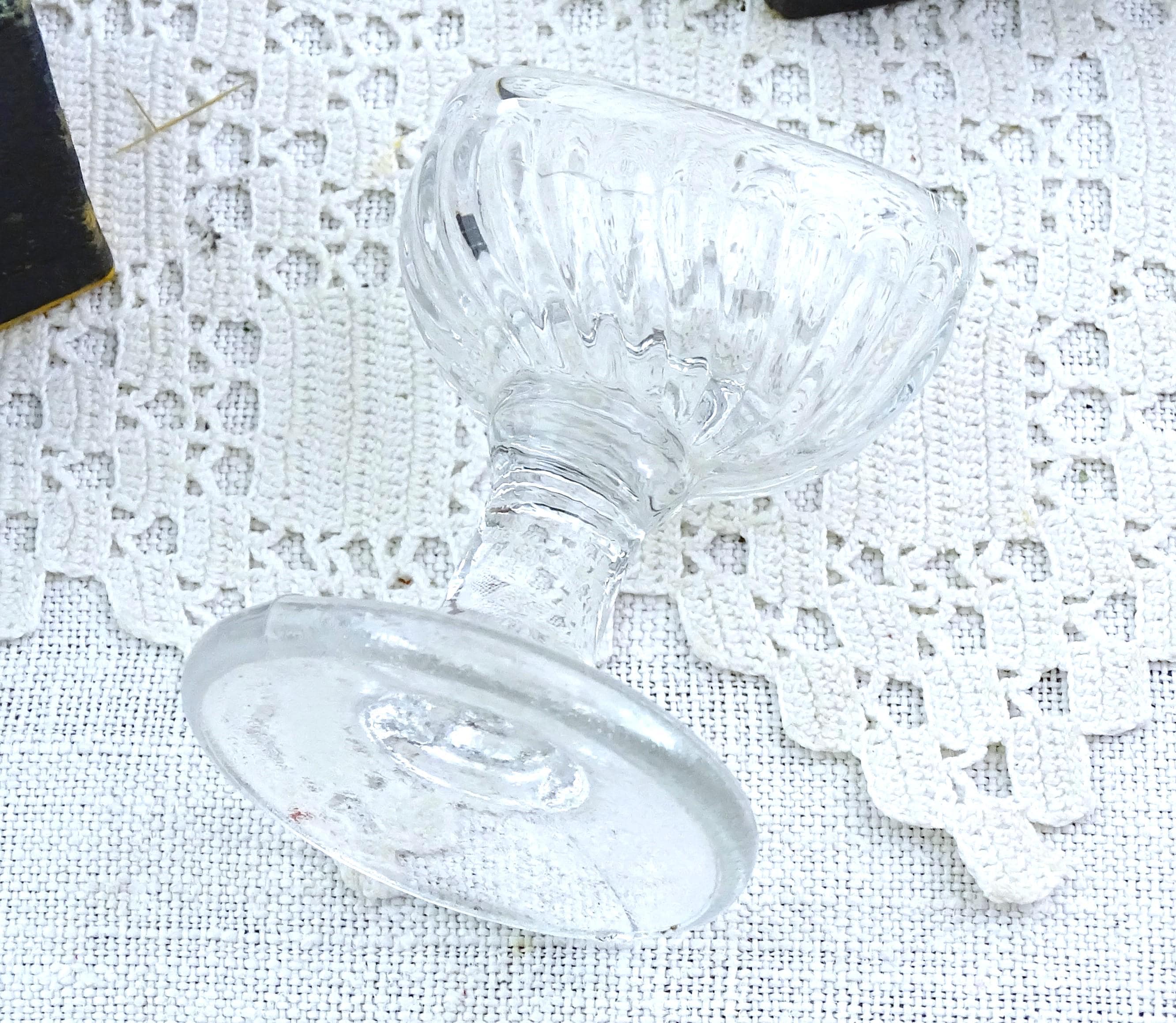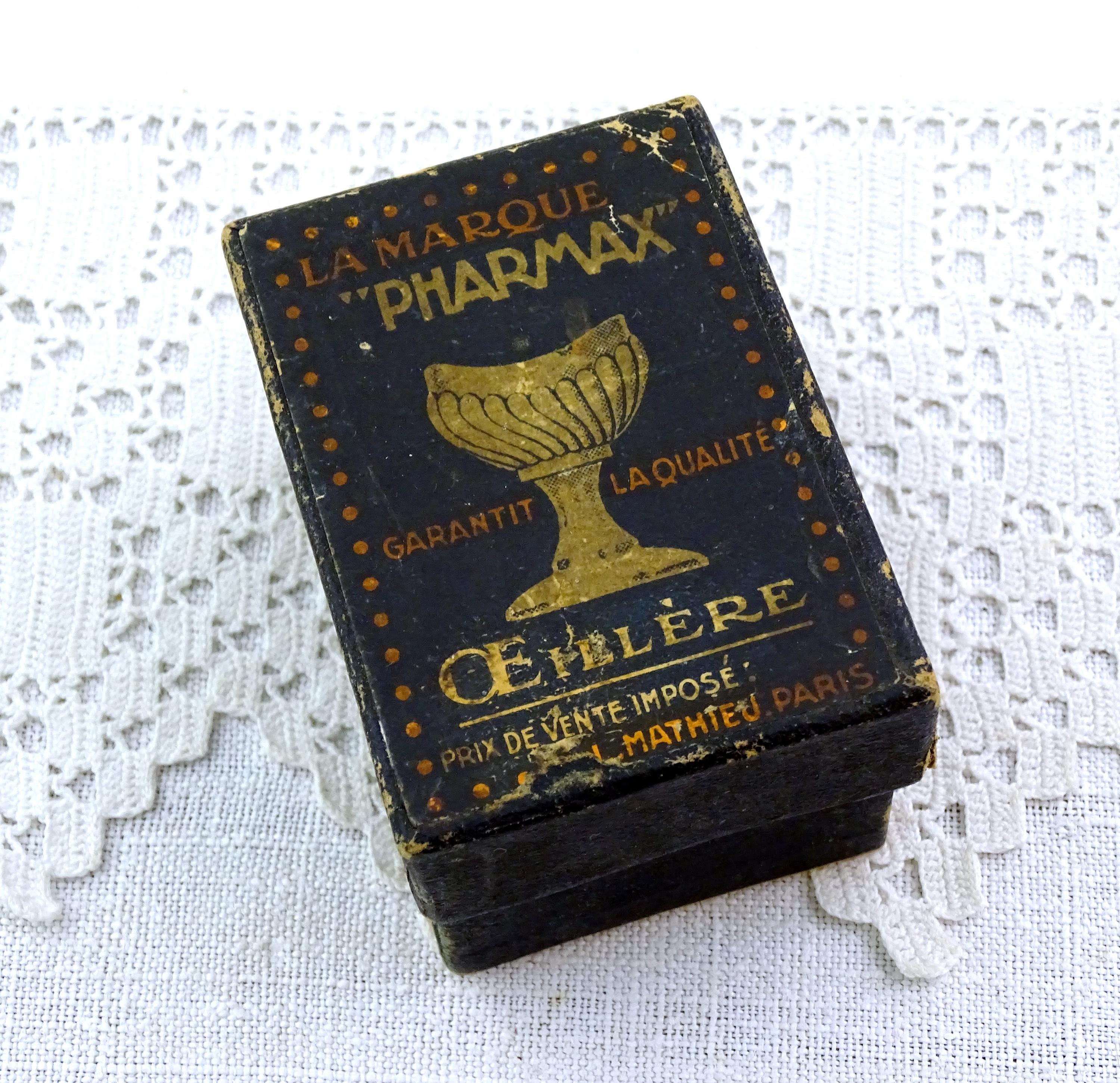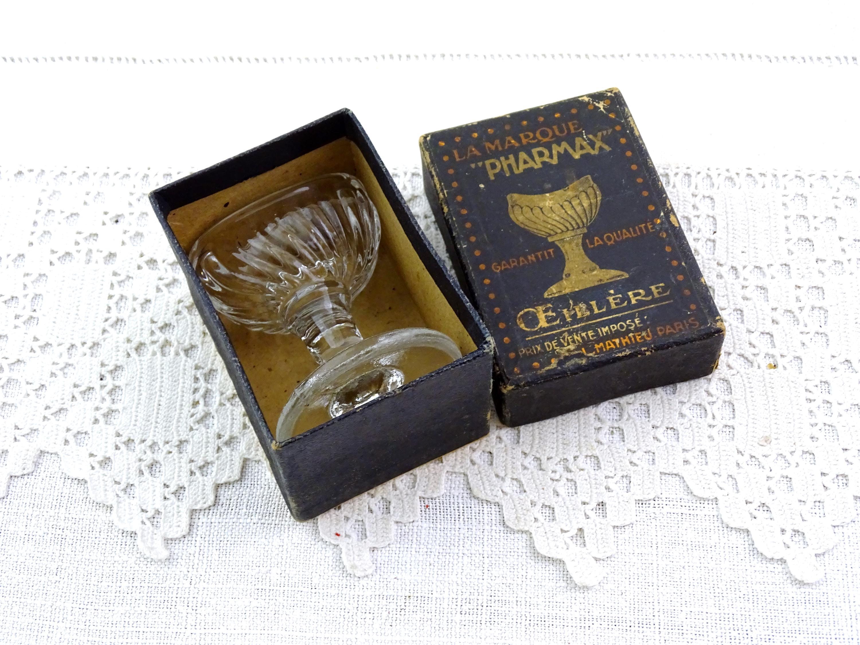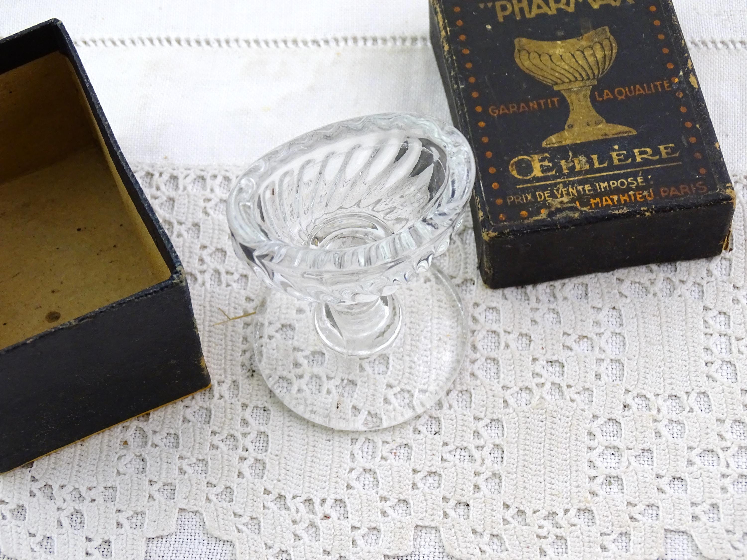 Antique French footed glass eye bath with original box by Pharmax. Made of molded clear glass with card box. Ca late 1800s.