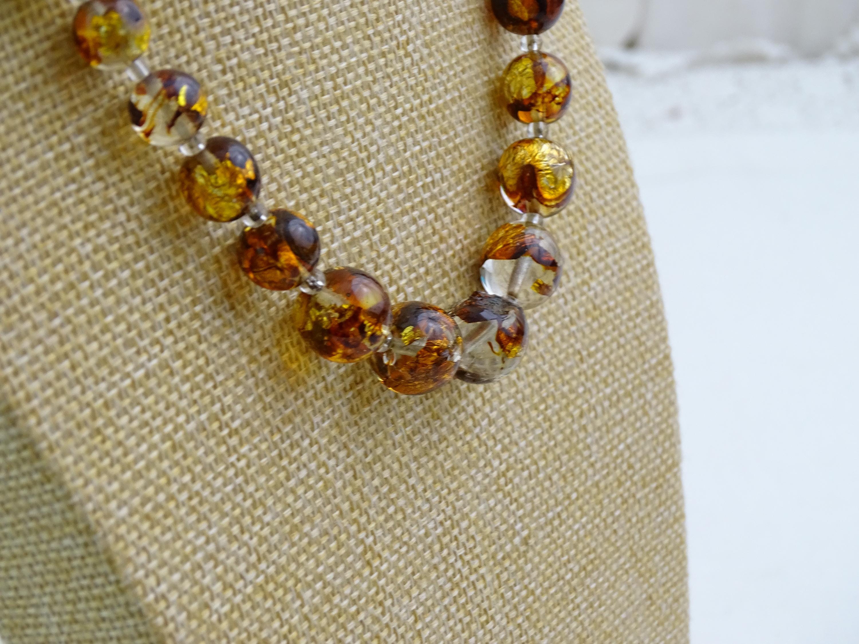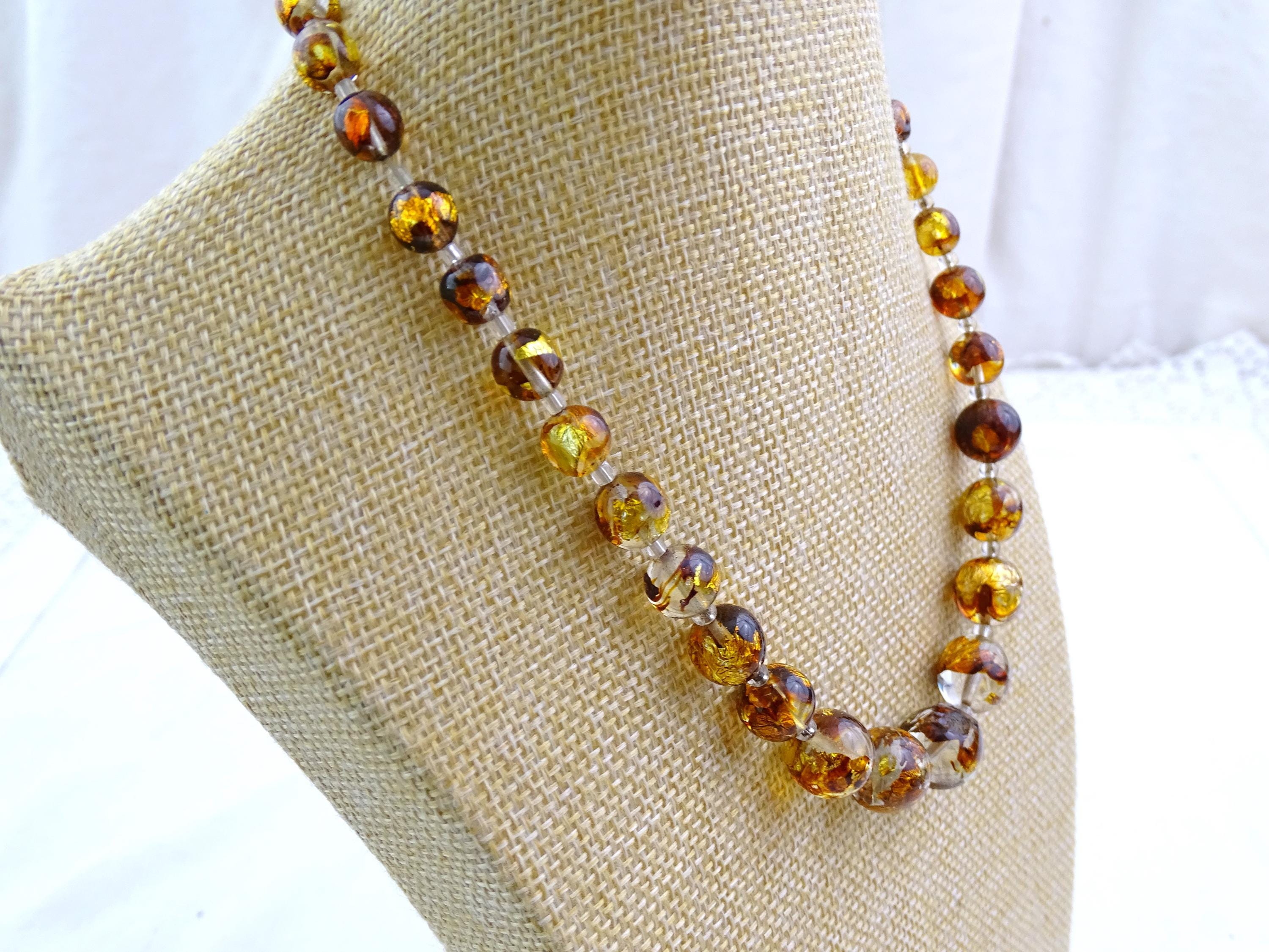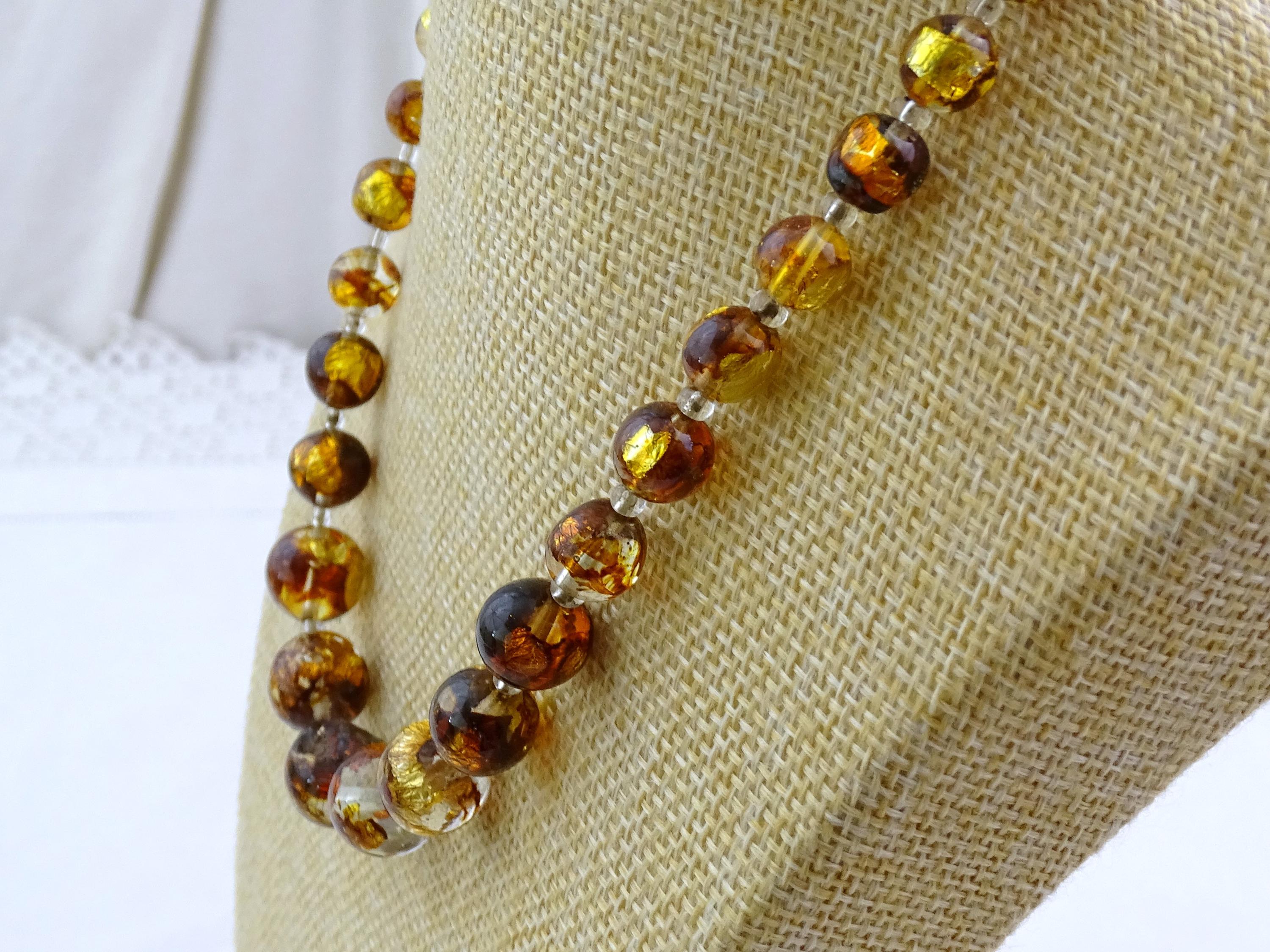 Vintage Venetian gold foil bead necklace. Made of clear and amber glass with gold foil inclusions. Ca mid 1900s.