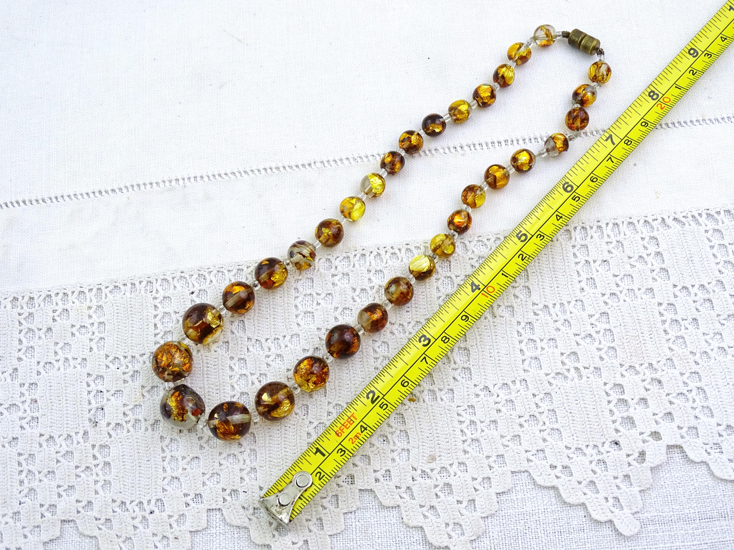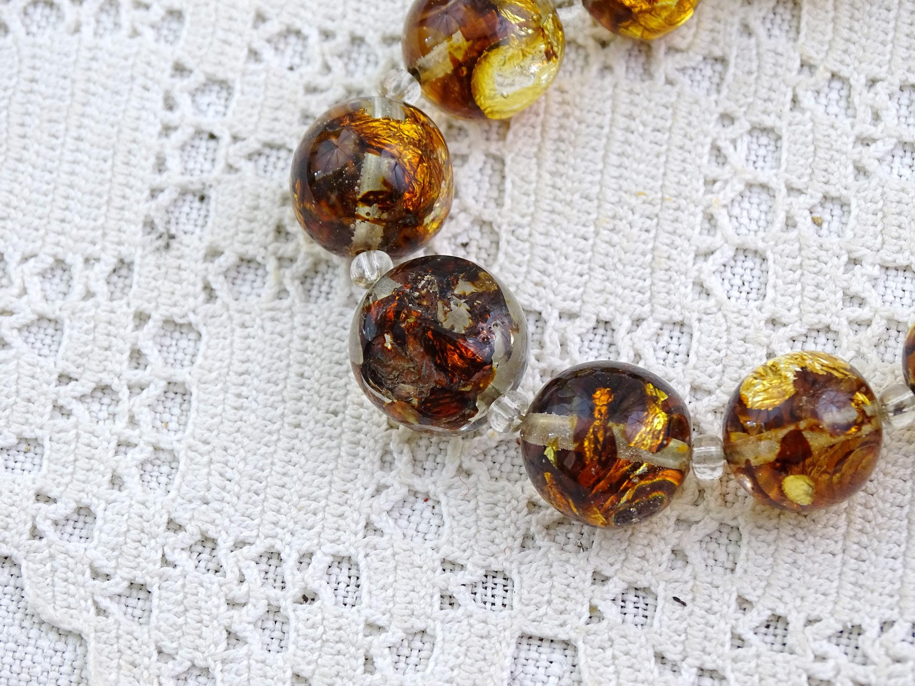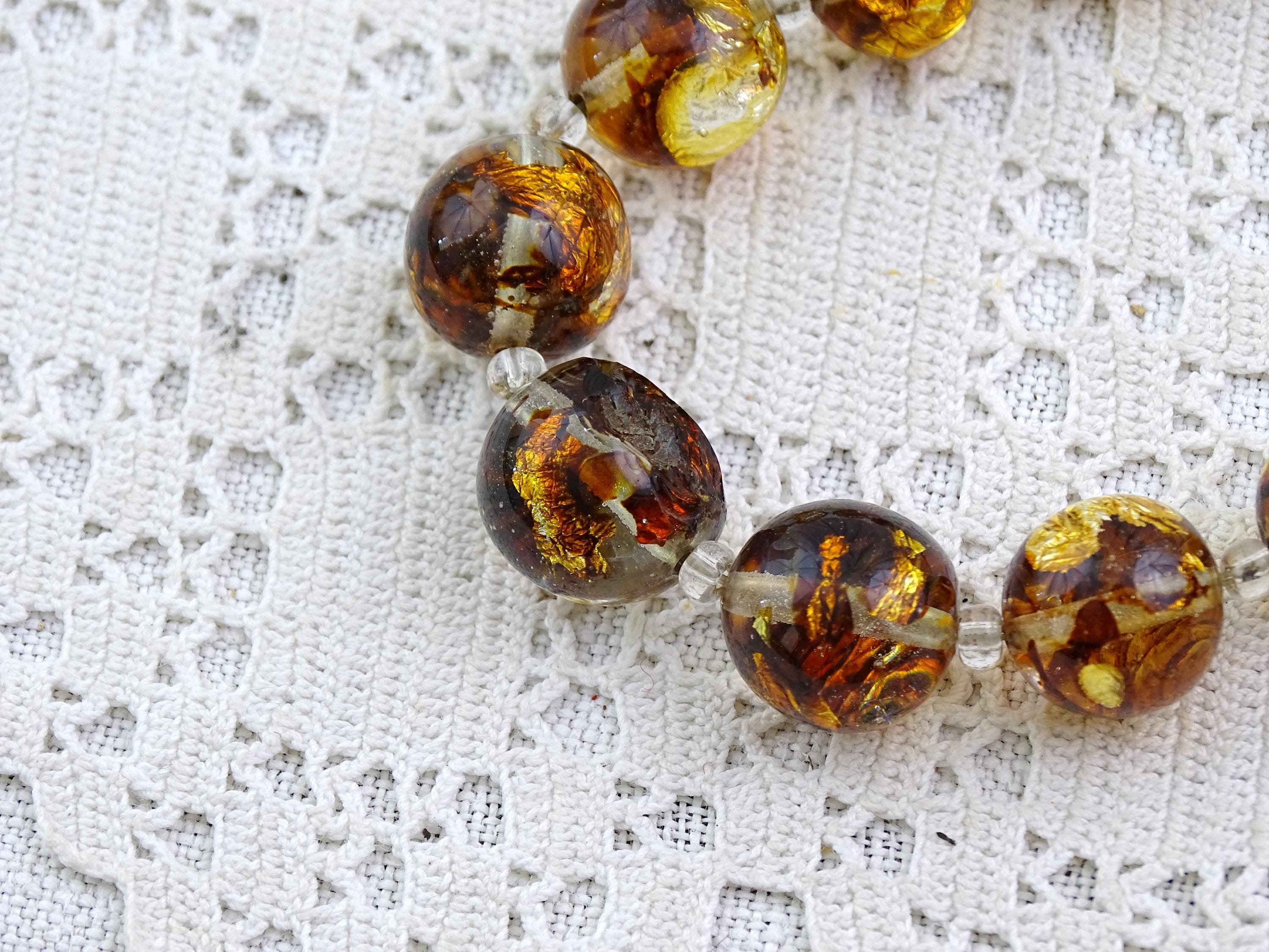 Vintage Venetian gold foil bead necklace. Made of clear and amber glass with gold foil inclusions. Ca mid 1900s.