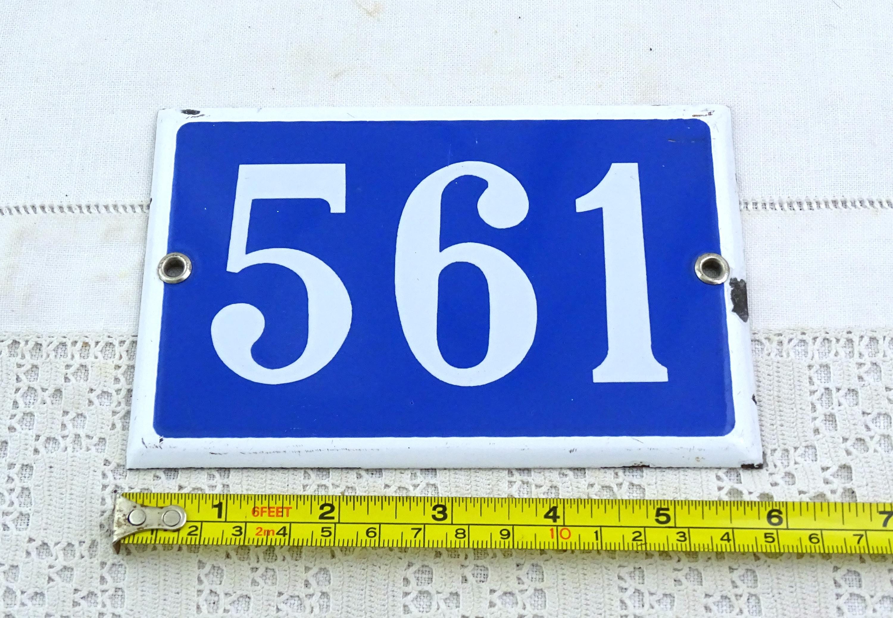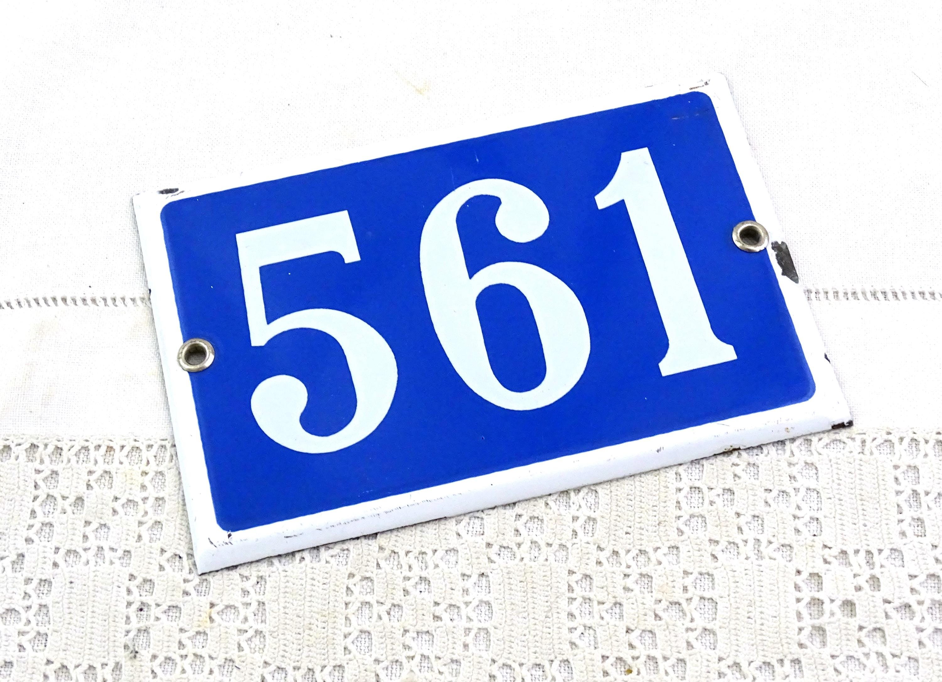 Vintage traditional French enamel house number 561. Made of enameled metal in blue with white number. Ca 1960s.