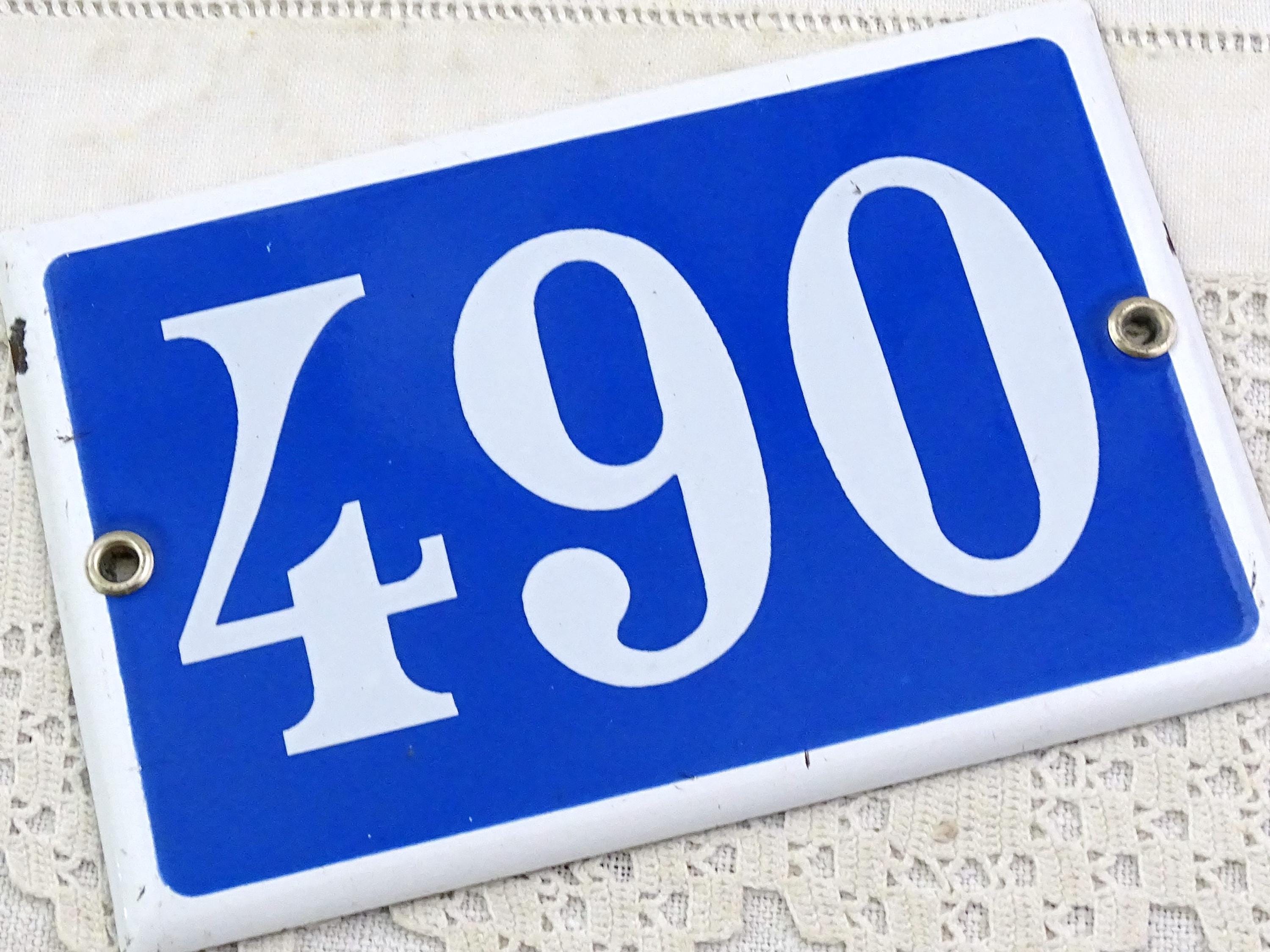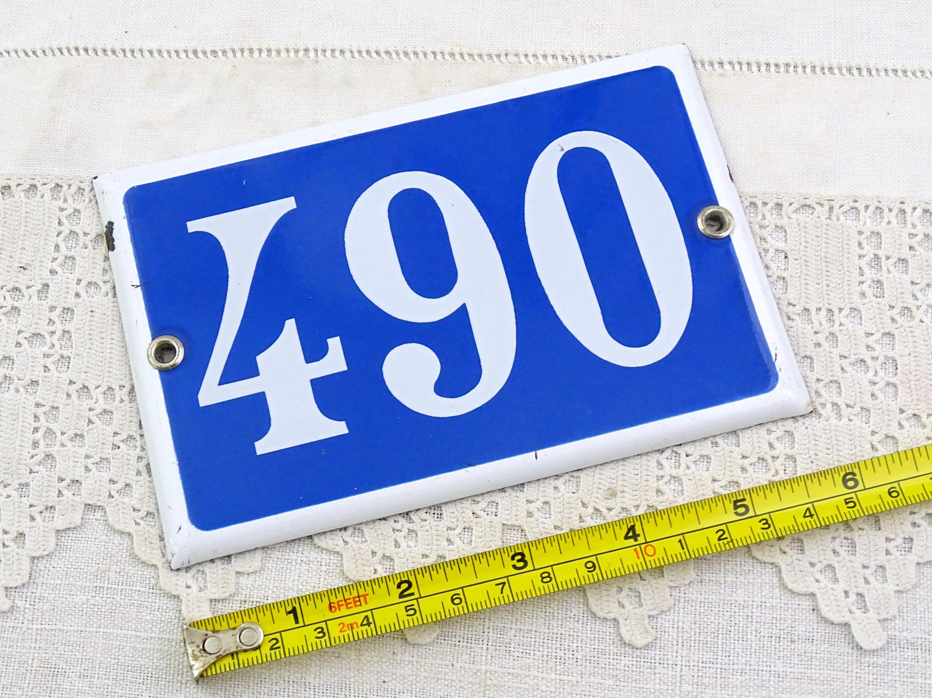 Vintage traditional French enamel house number 490. Made of enameled metal in blue with white number. Ca 1950s.