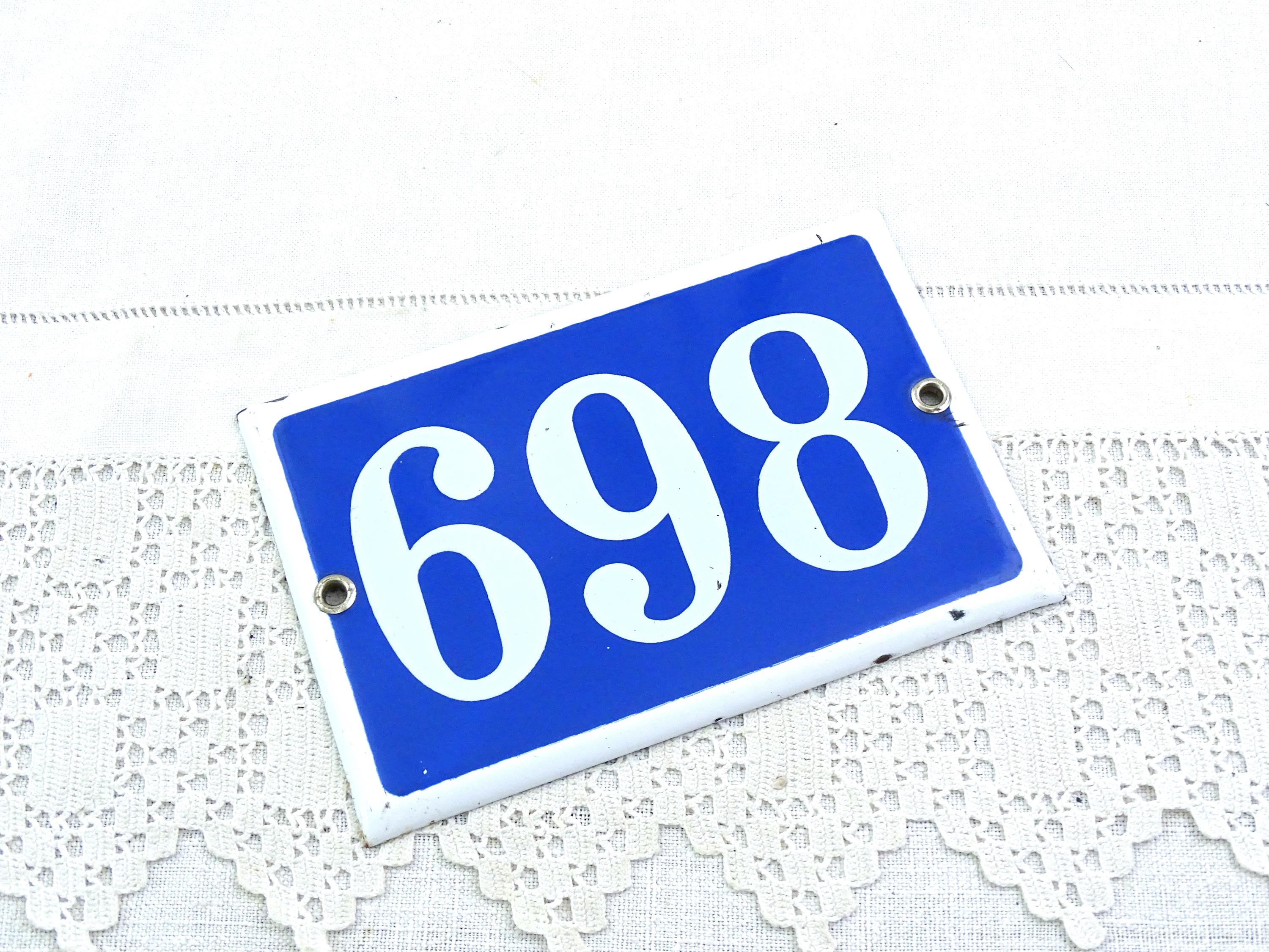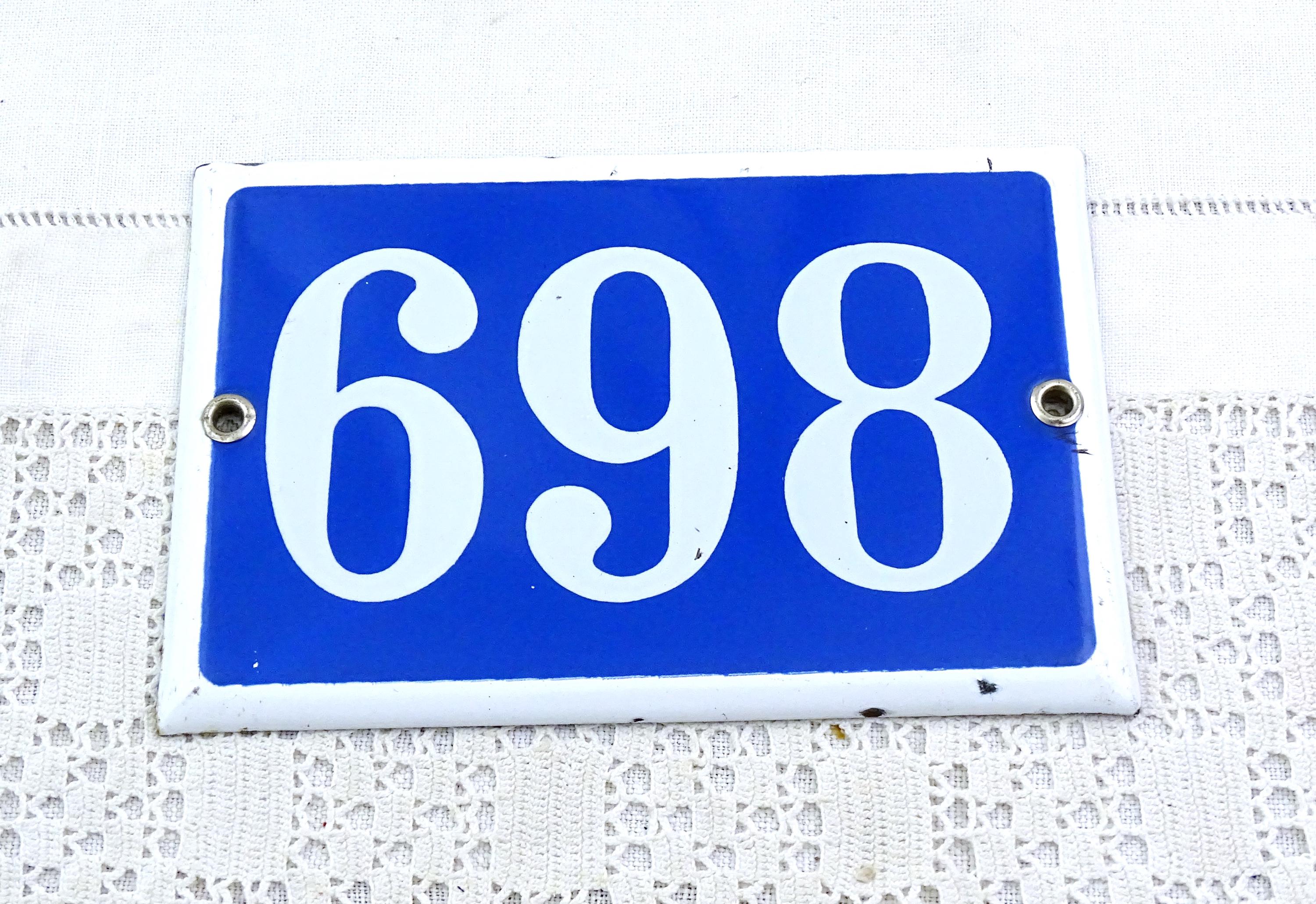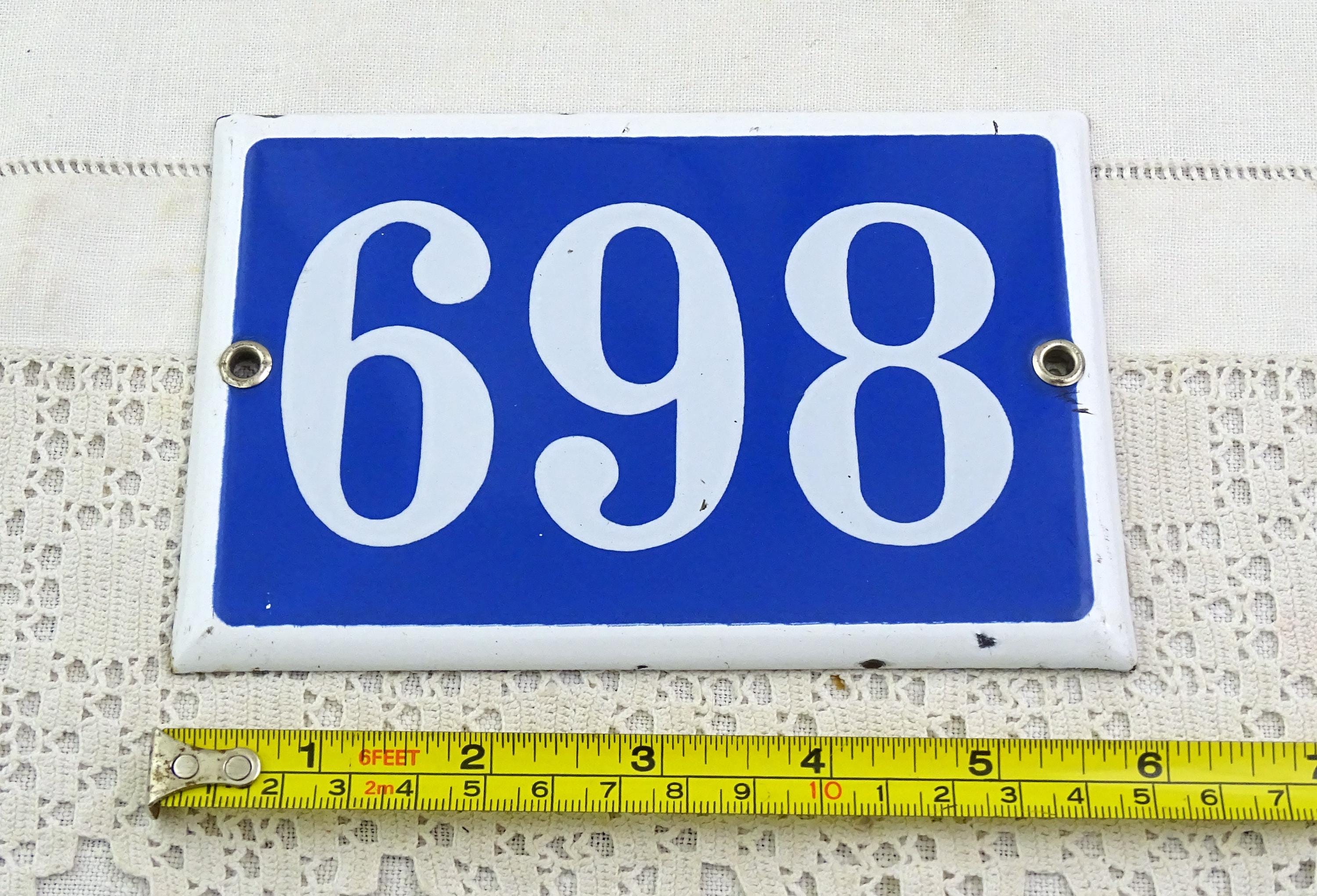 Vintage traditional French enamel house number 869 / 698. Made of enameled metal in blue with white number. Ca 1960s.