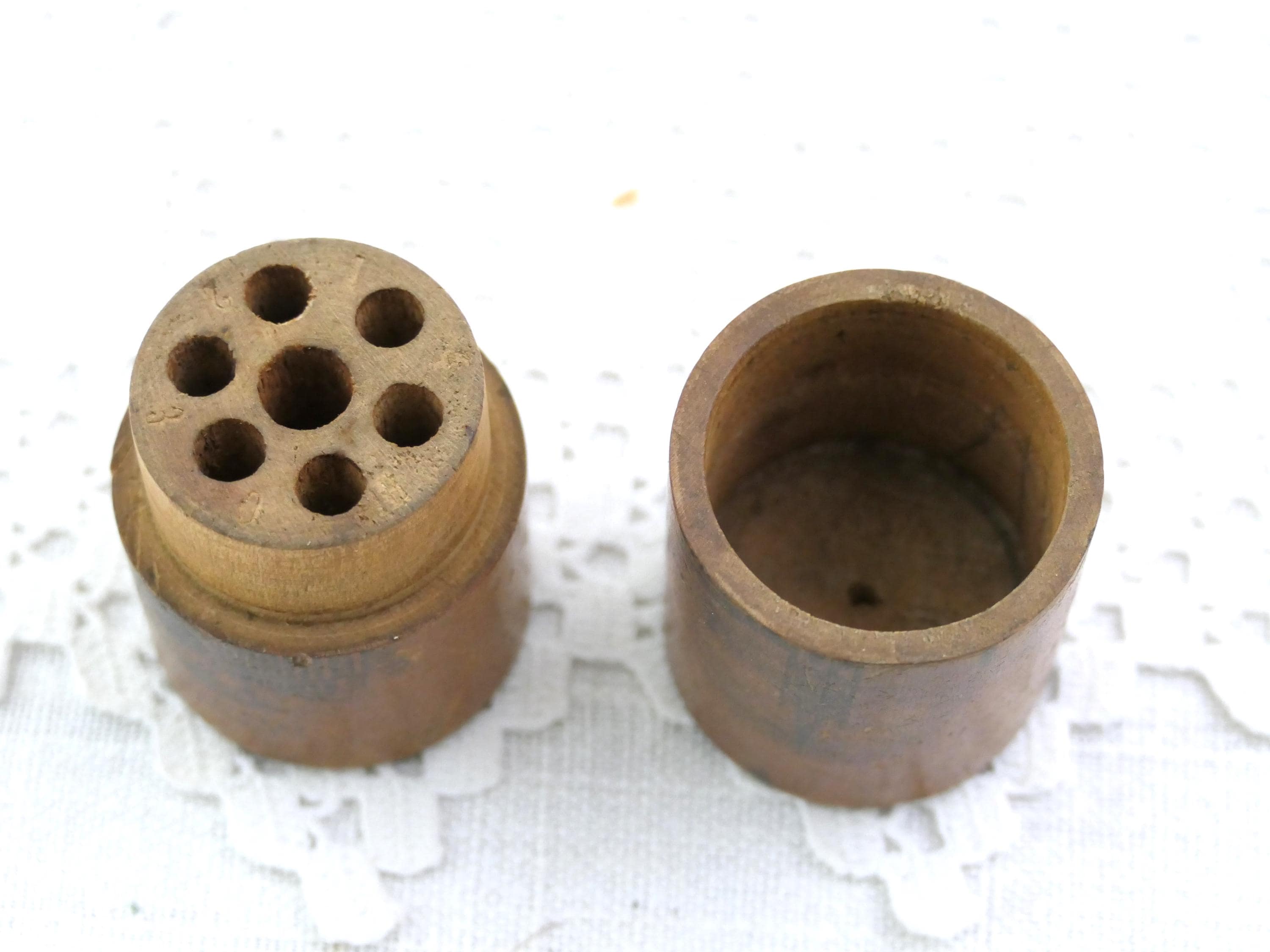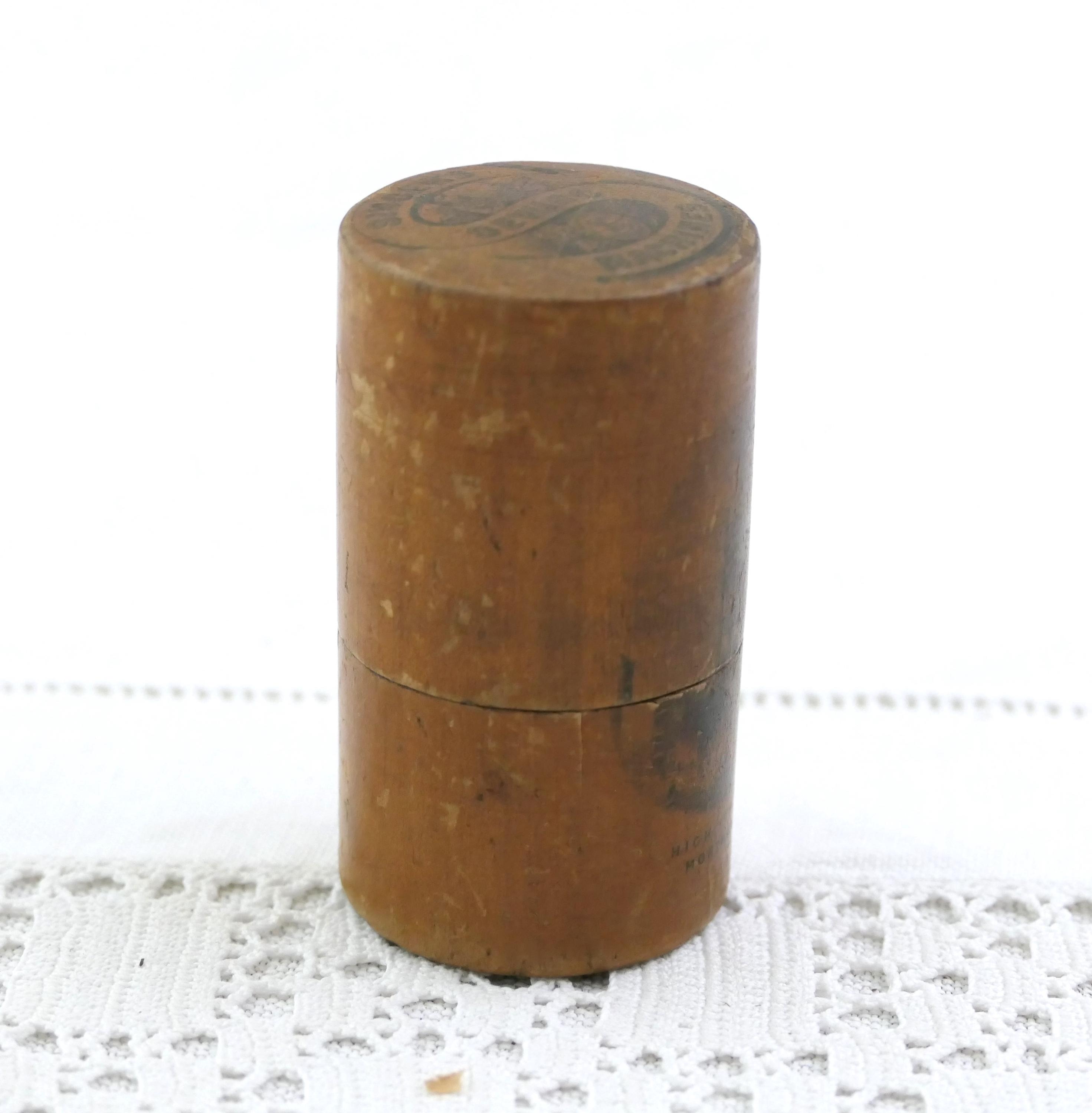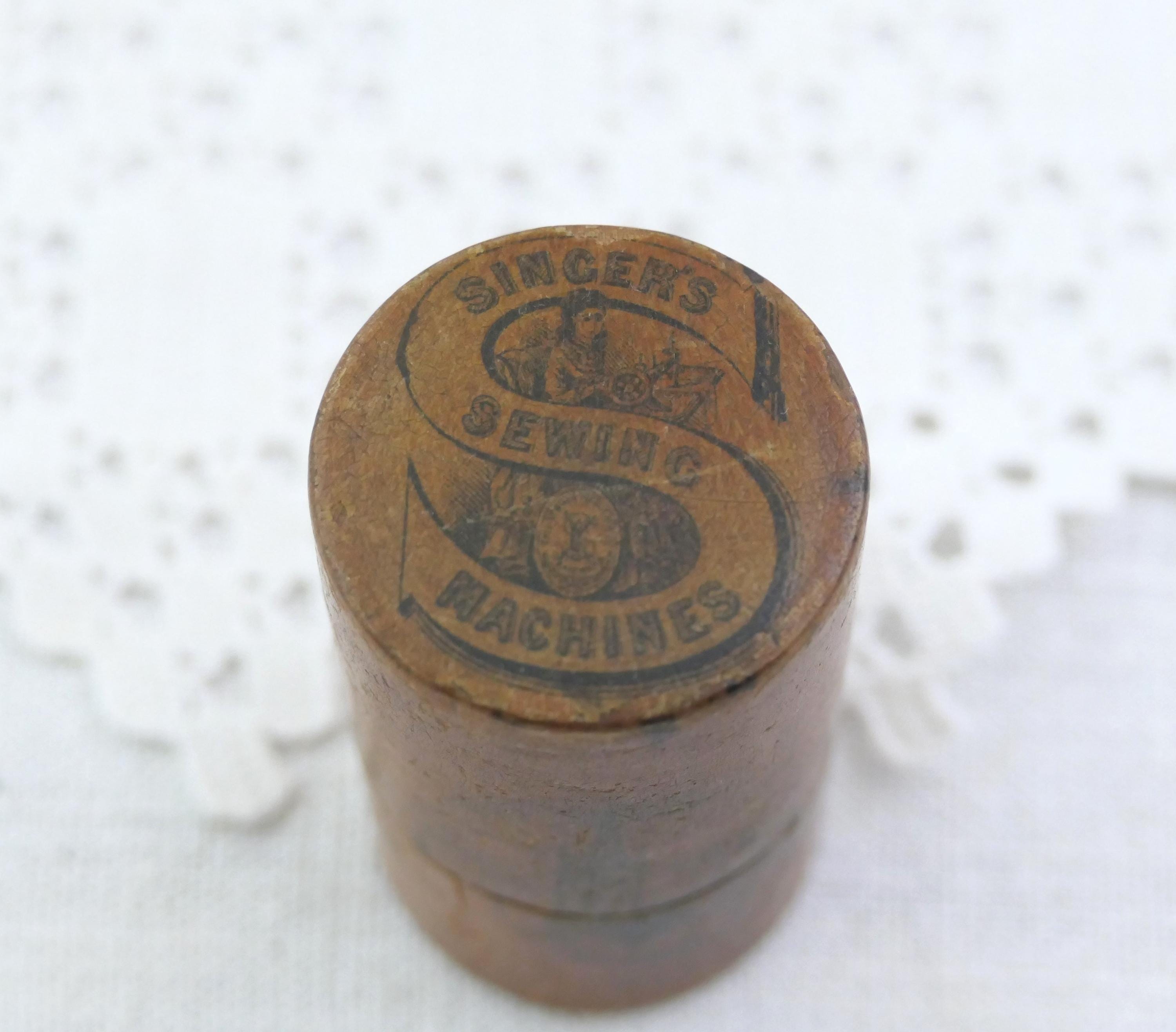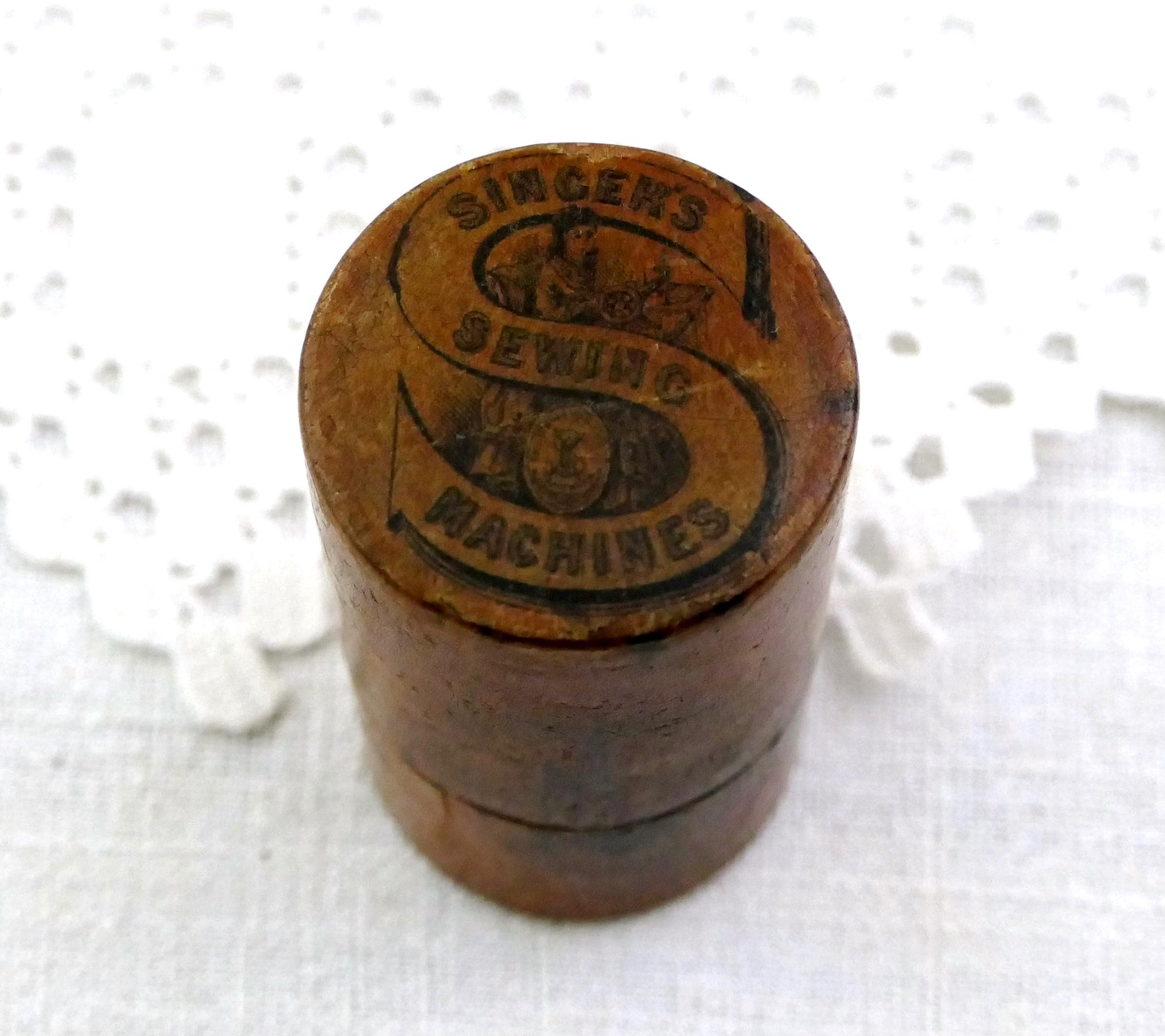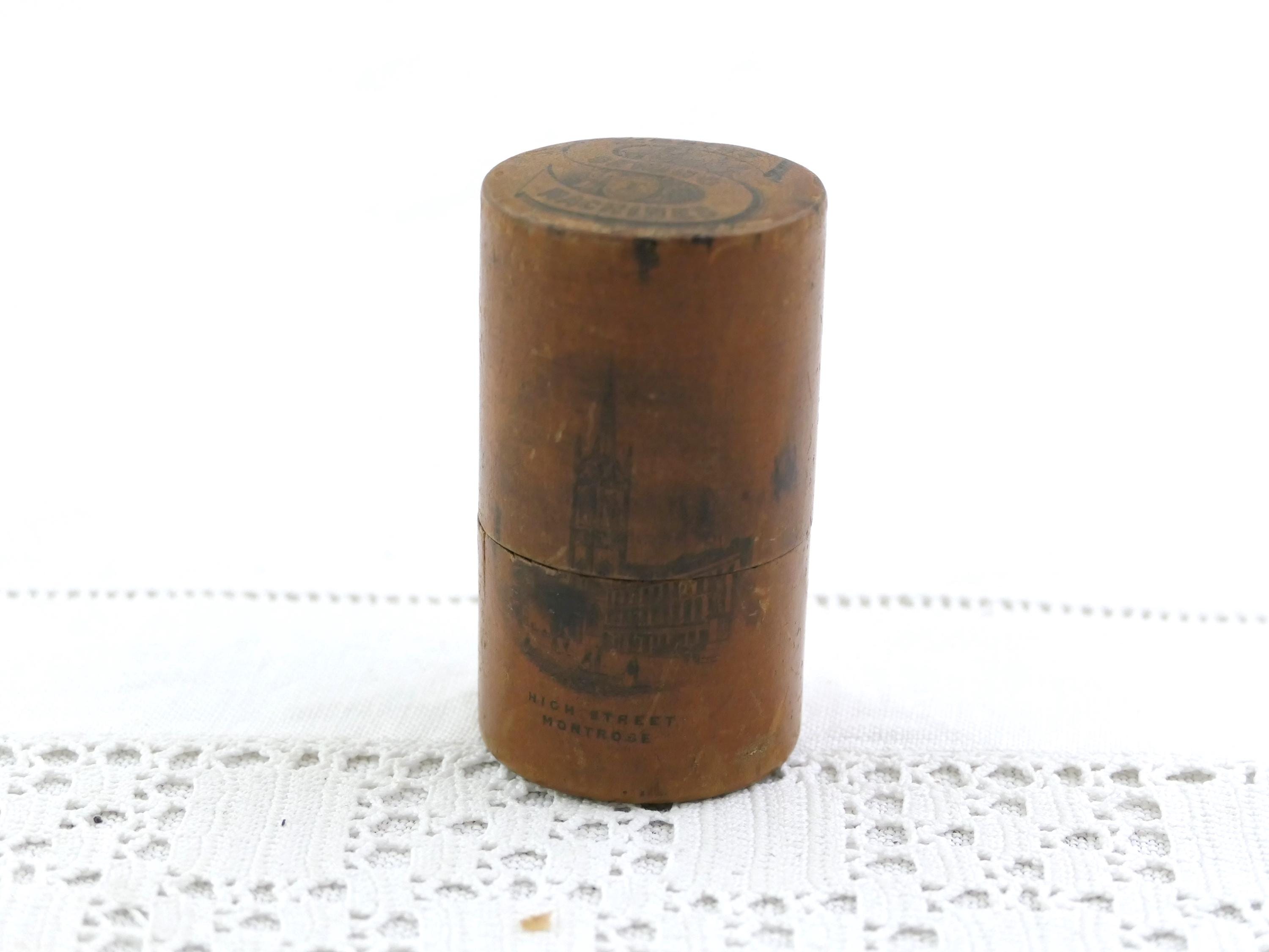 Antique Mauchlineware Singer sewing machine needle box with image of the high street in Montrose, Scotland. Made of wood. Ca 1800s.