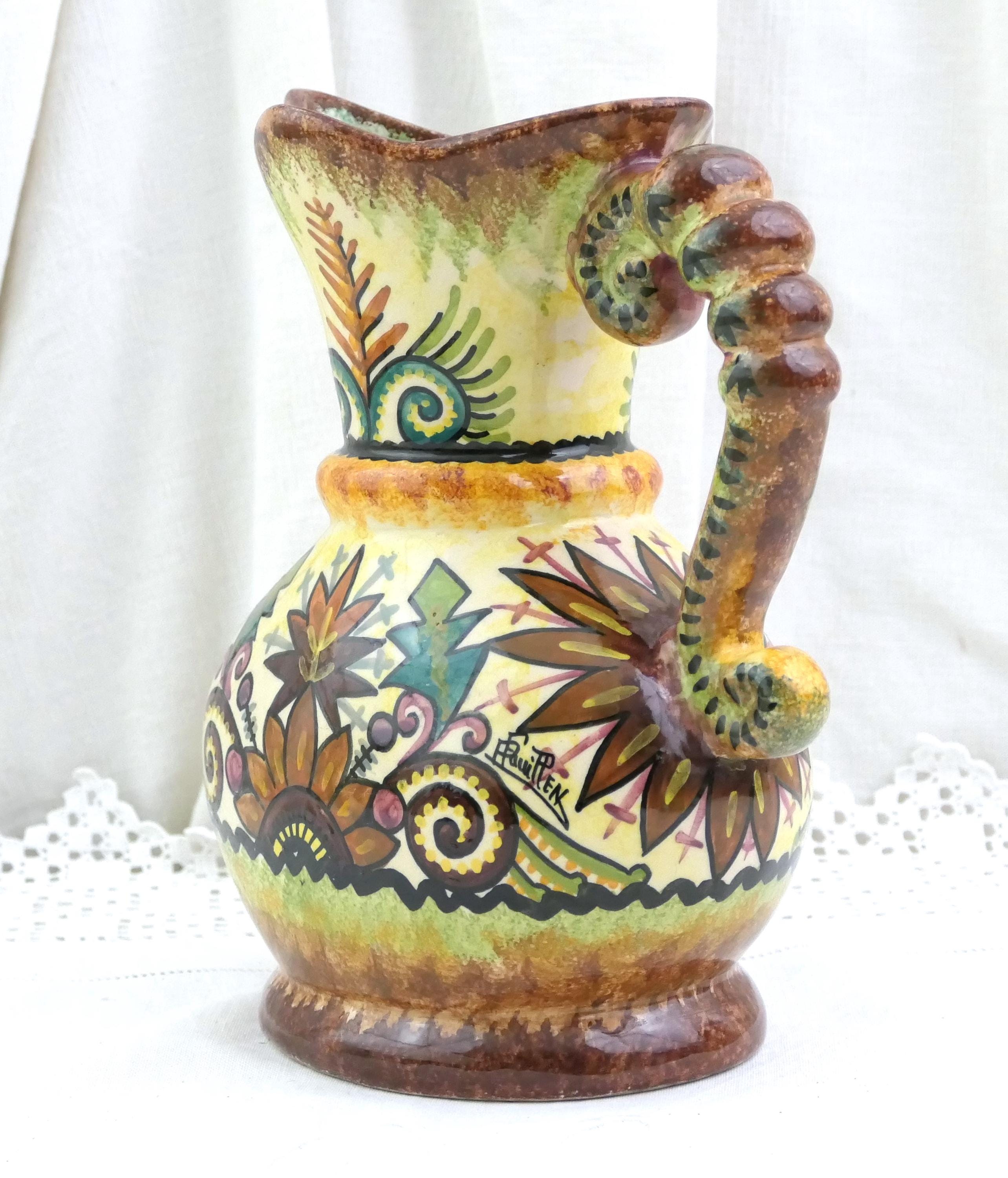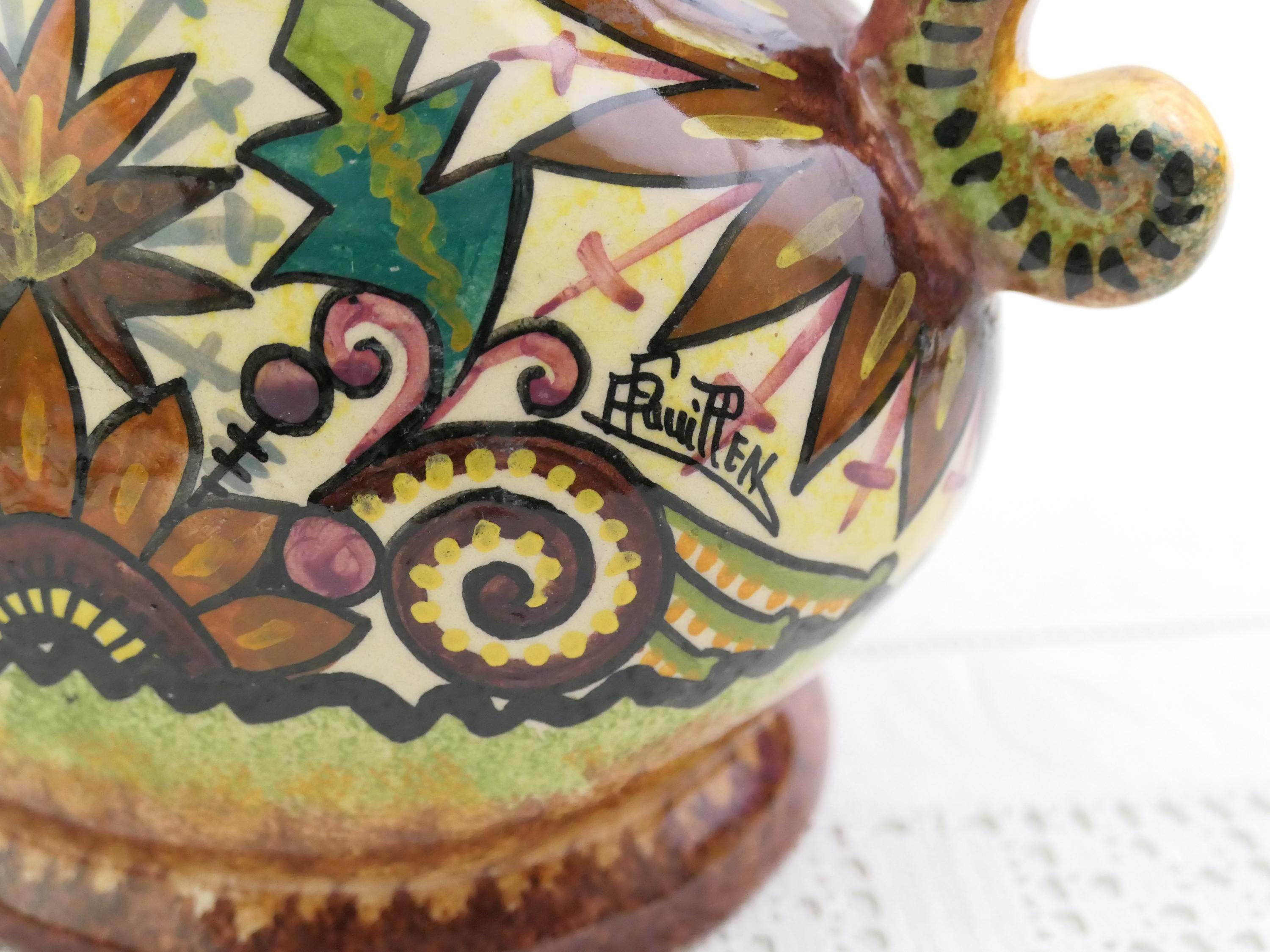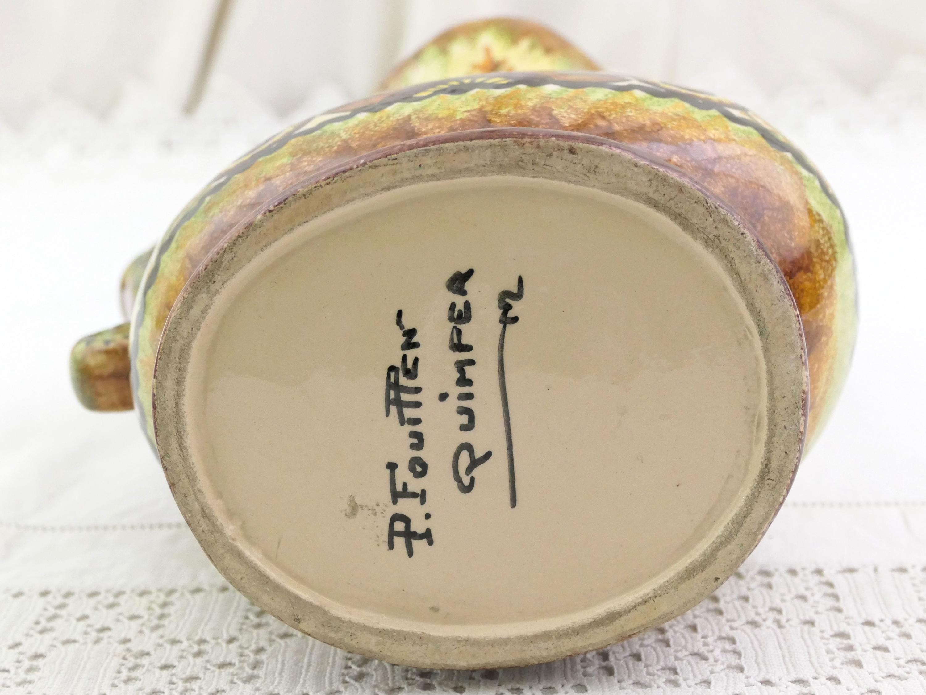 Vintage French handpainted decorative pitcher signed by P Fouillen Quimper with Celtic pattern. Made in Brittany of glazed pottery. Ca mid 1900s.