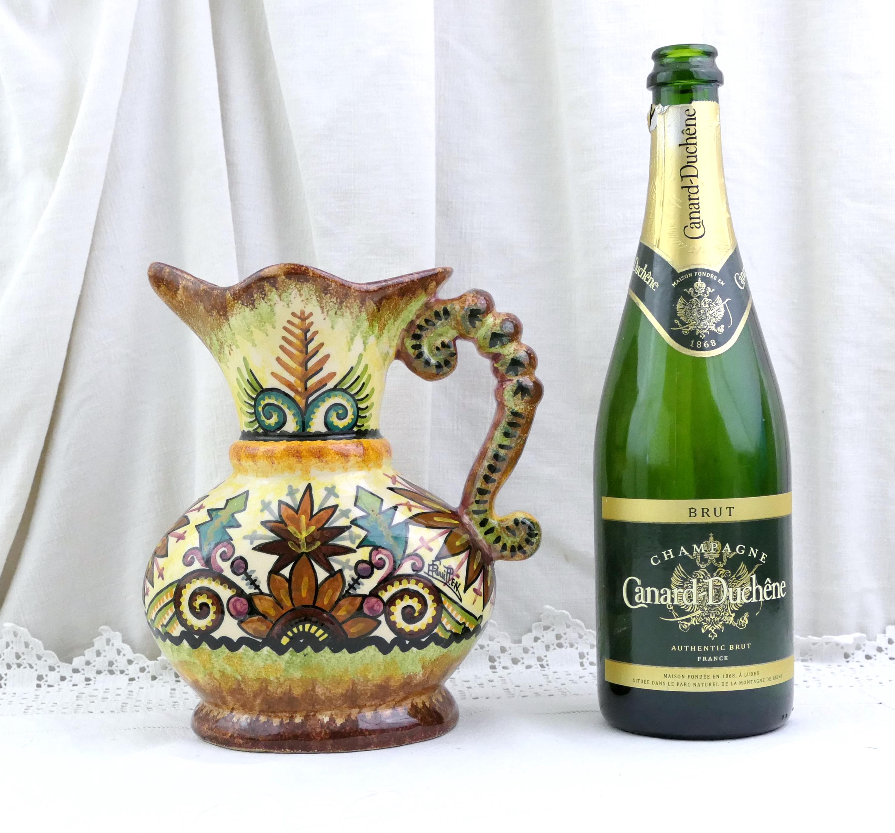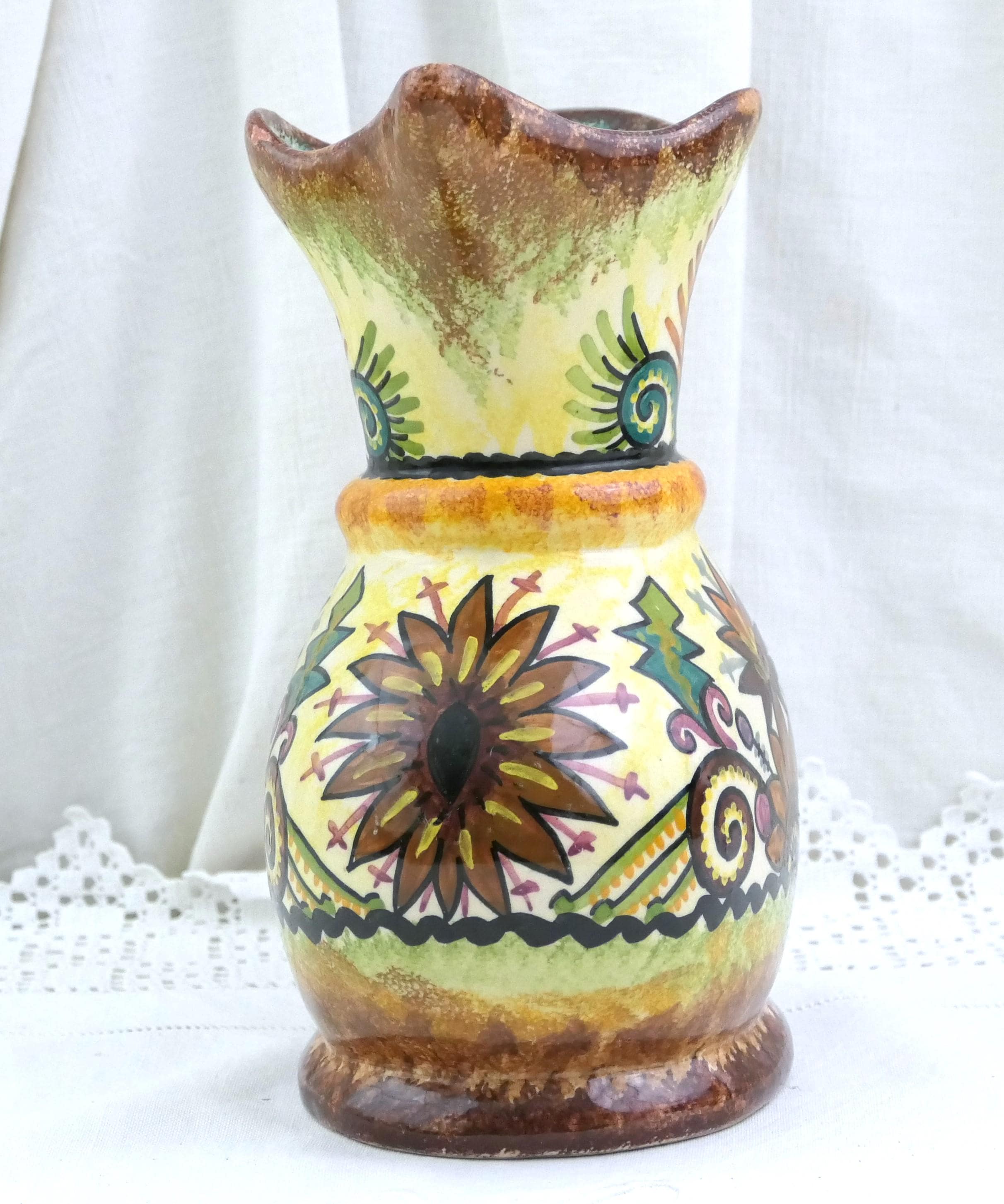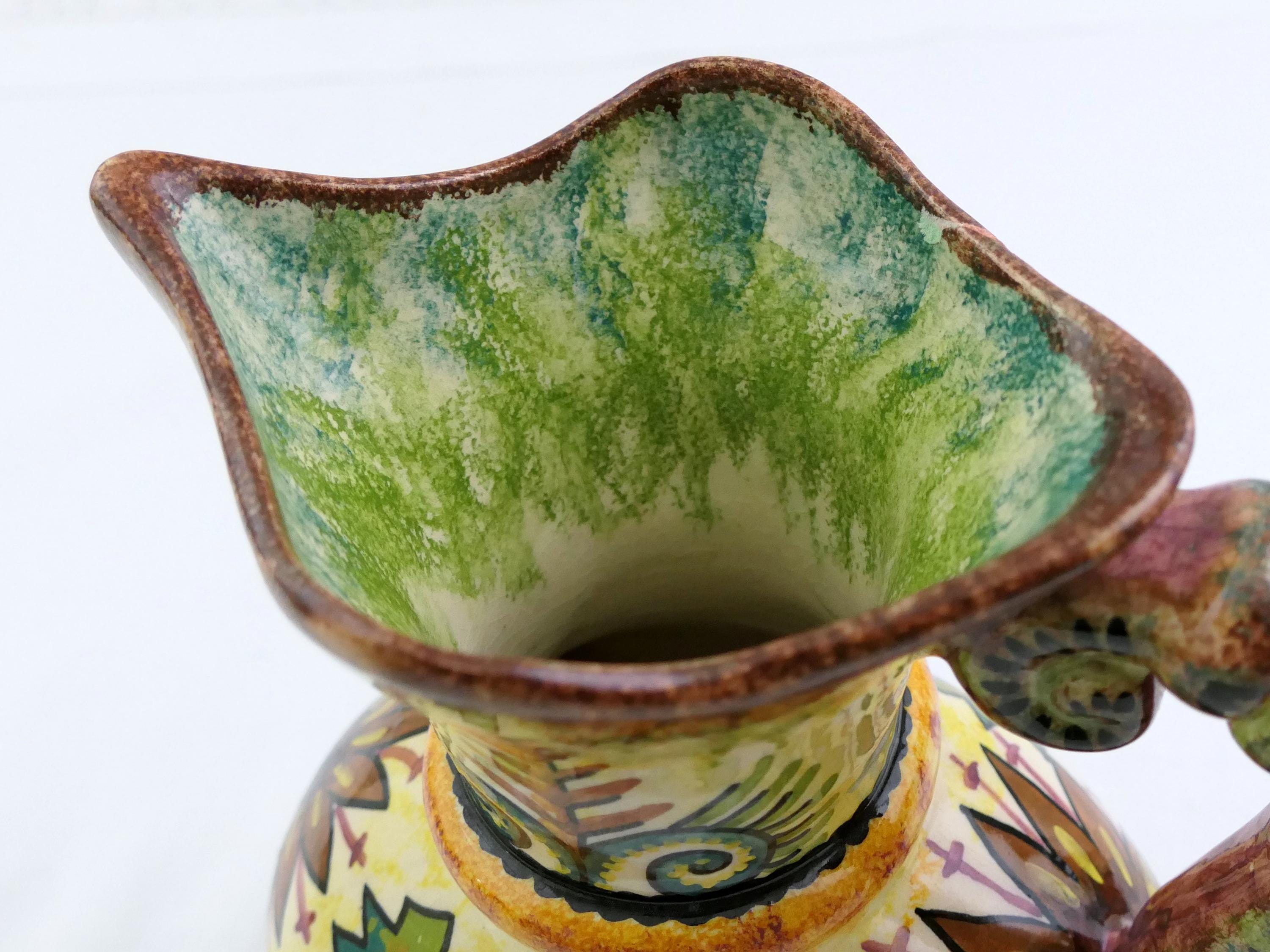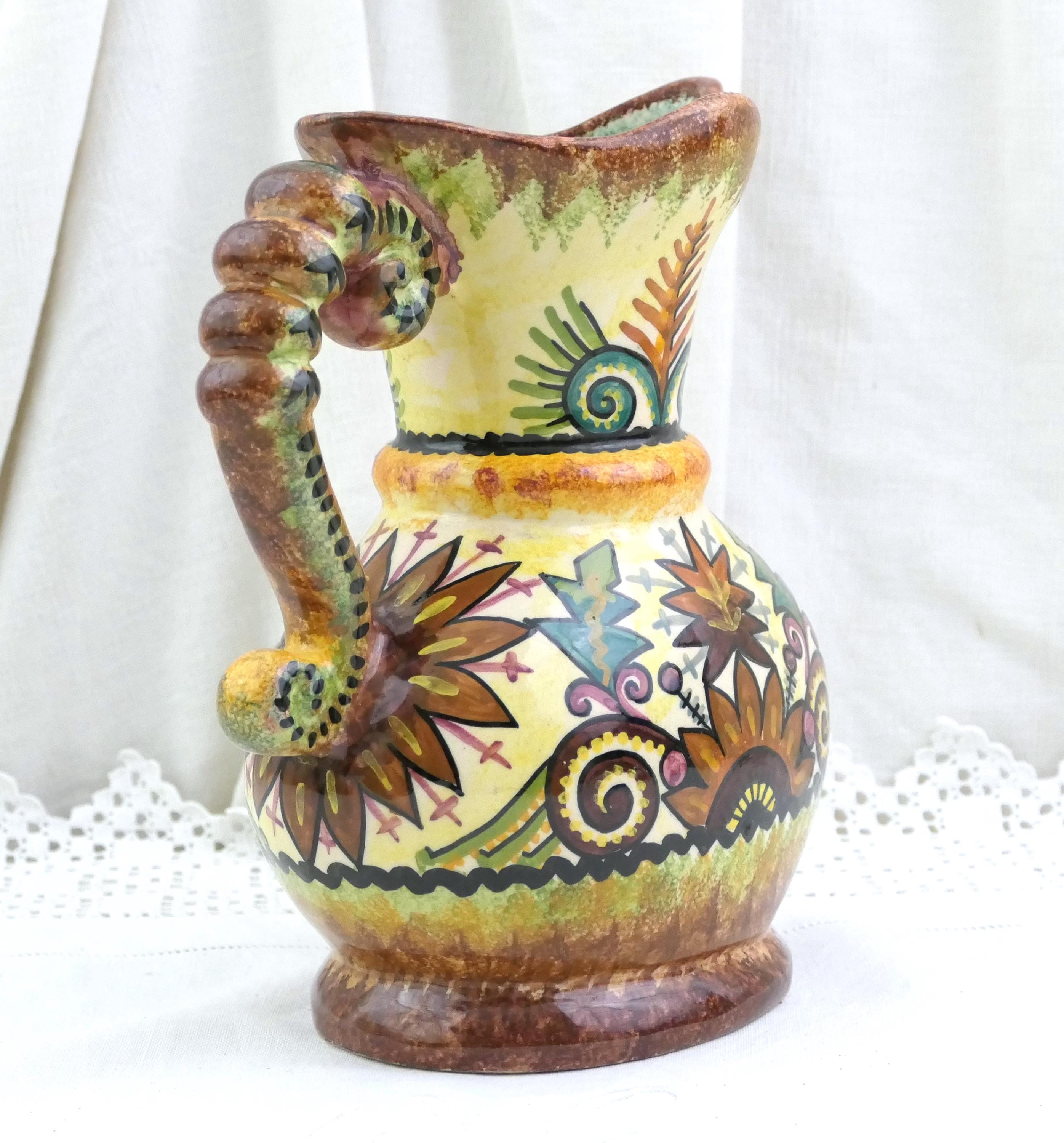 Vintage French handpainted decorative pitcher signed by P Fouillen Quimper with Celtic pattern. Made in Brittany of glazed pottery. Ca mid 1900s.