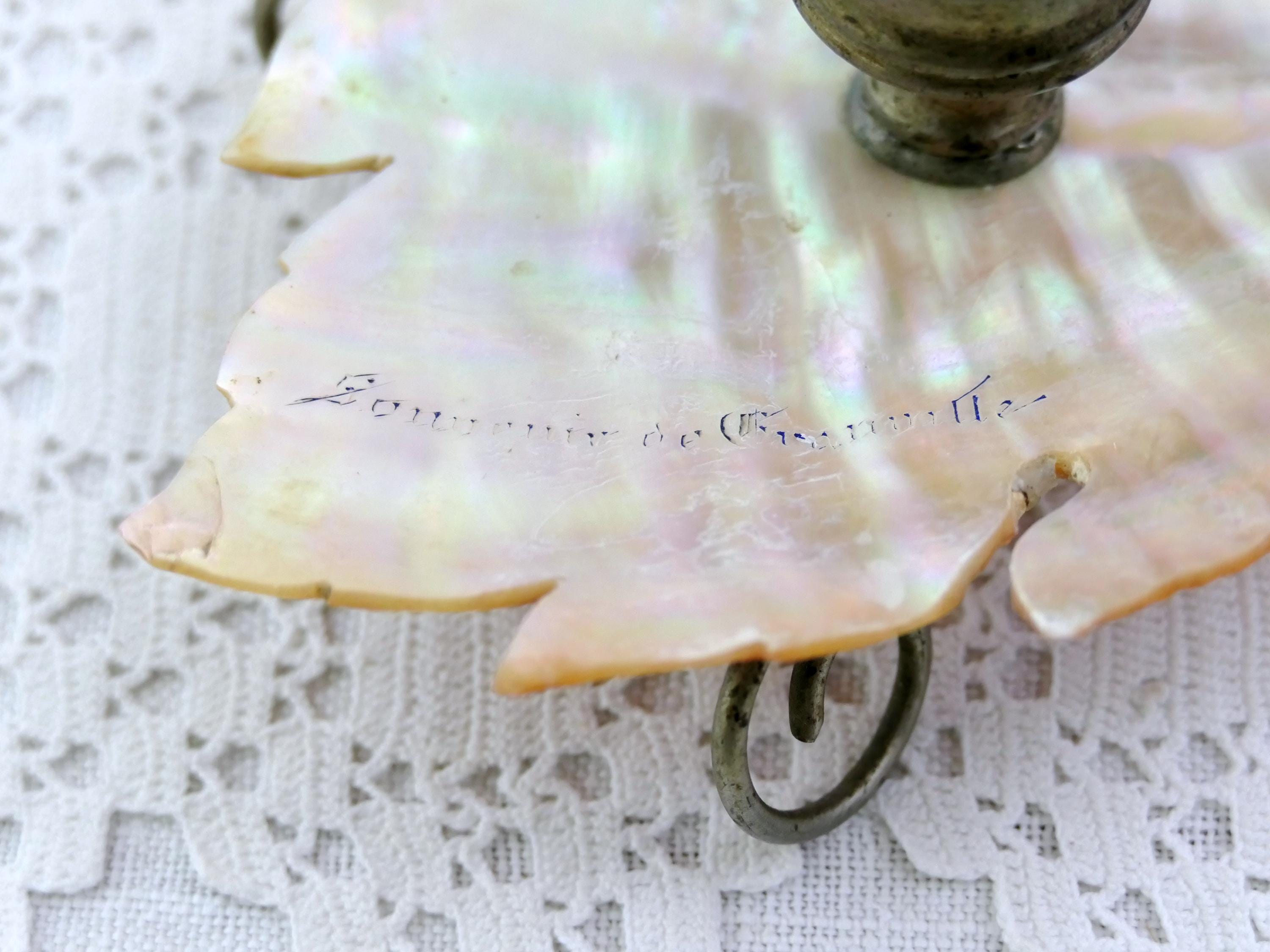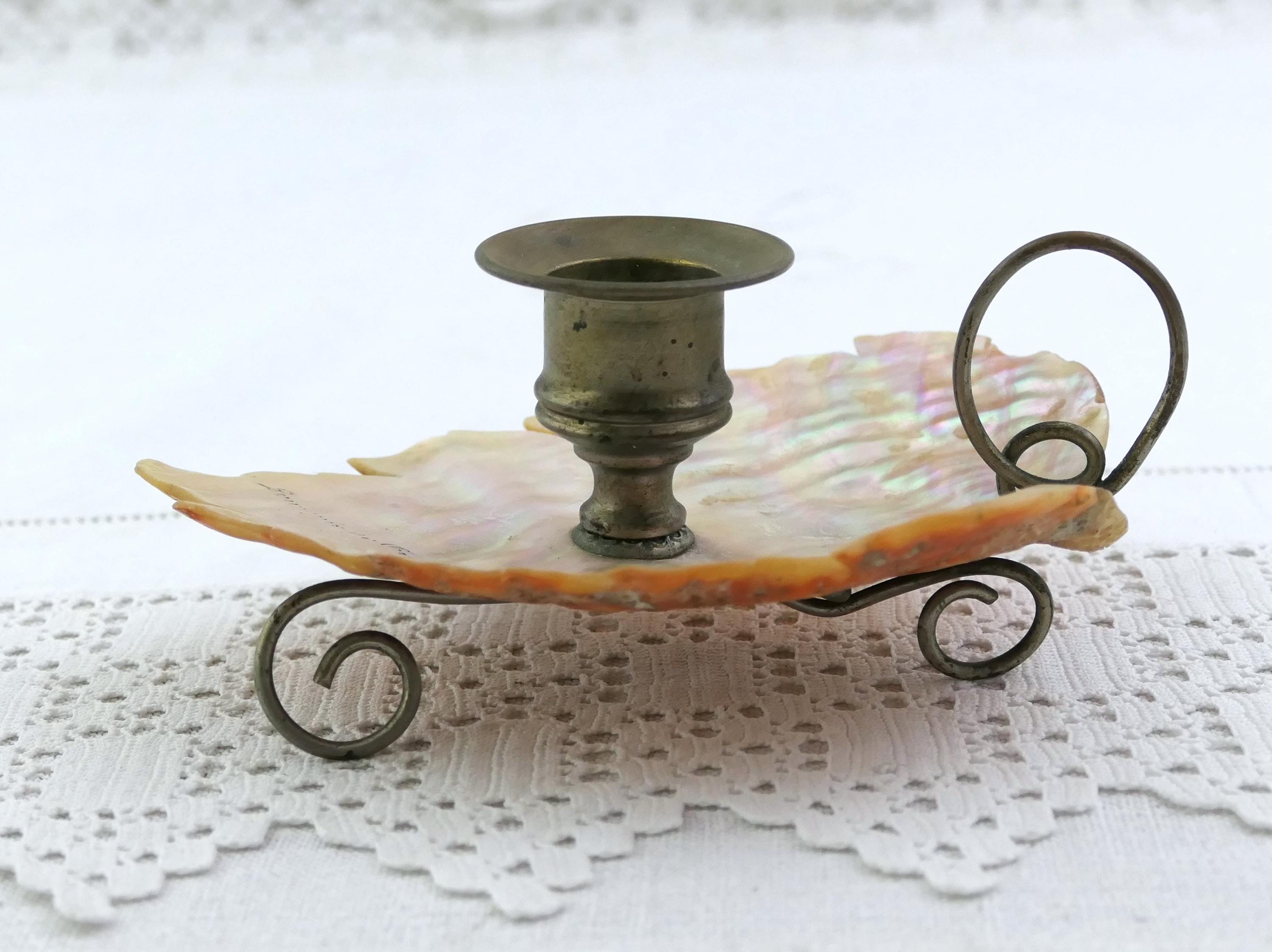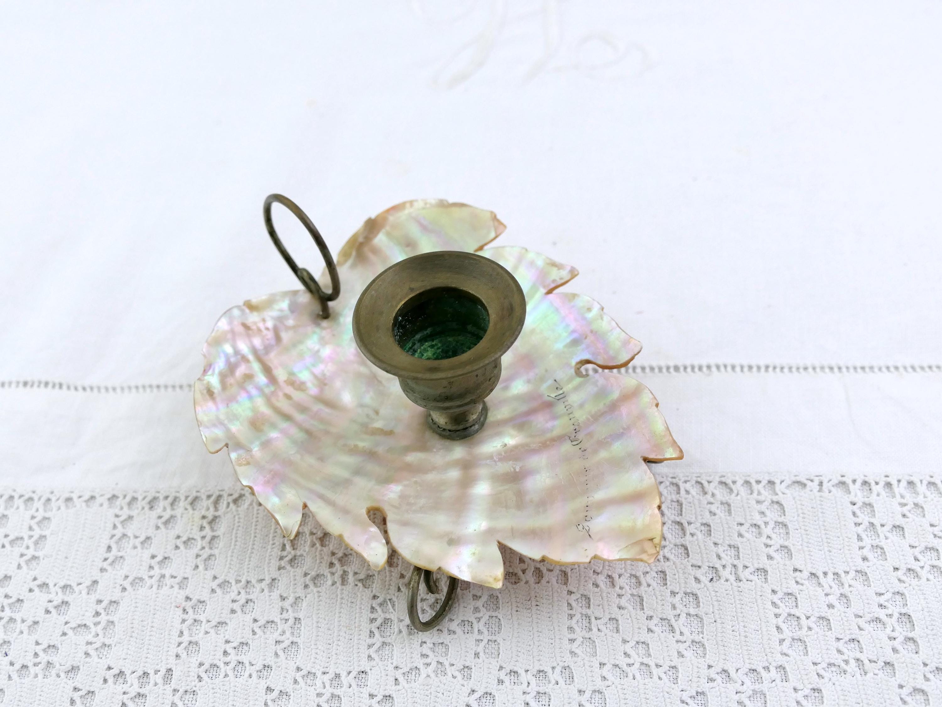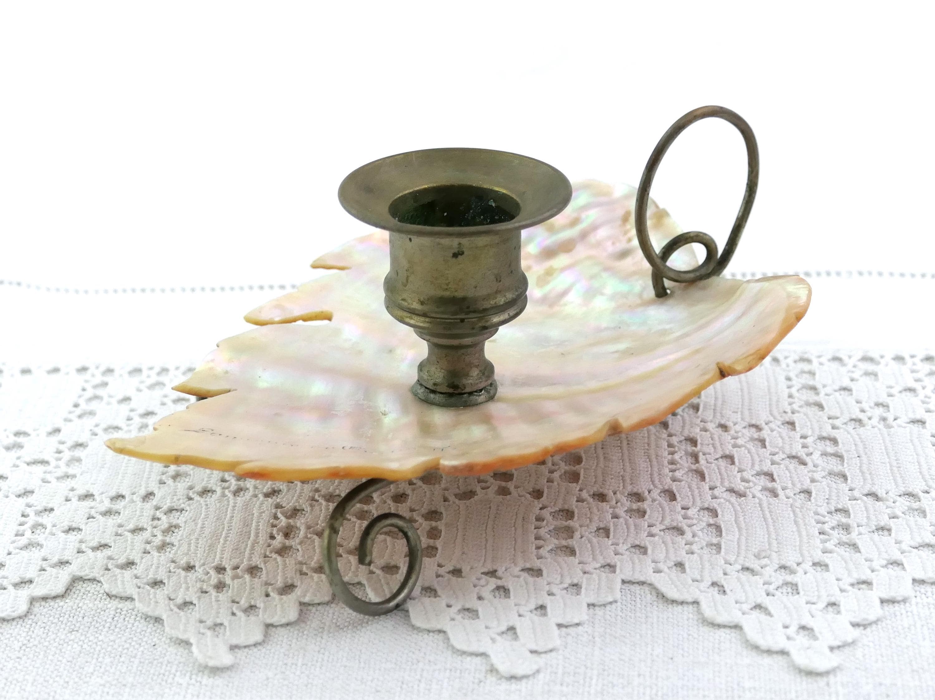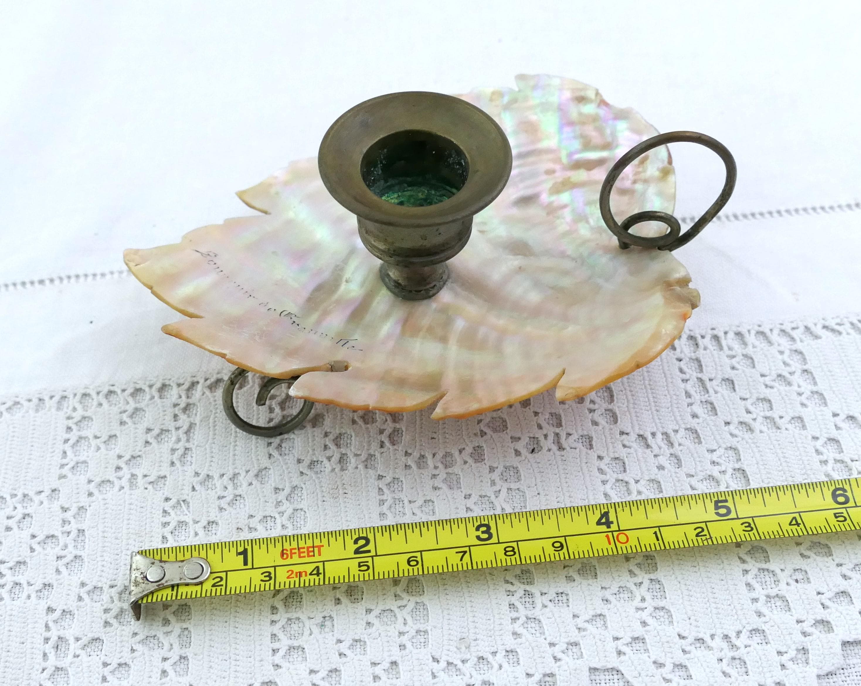 Antique French Victorian tourist souvenir candle stick holder from Granville in Normandy. Made of caved mother of pearl with brass fixtures. Ca 1800s.