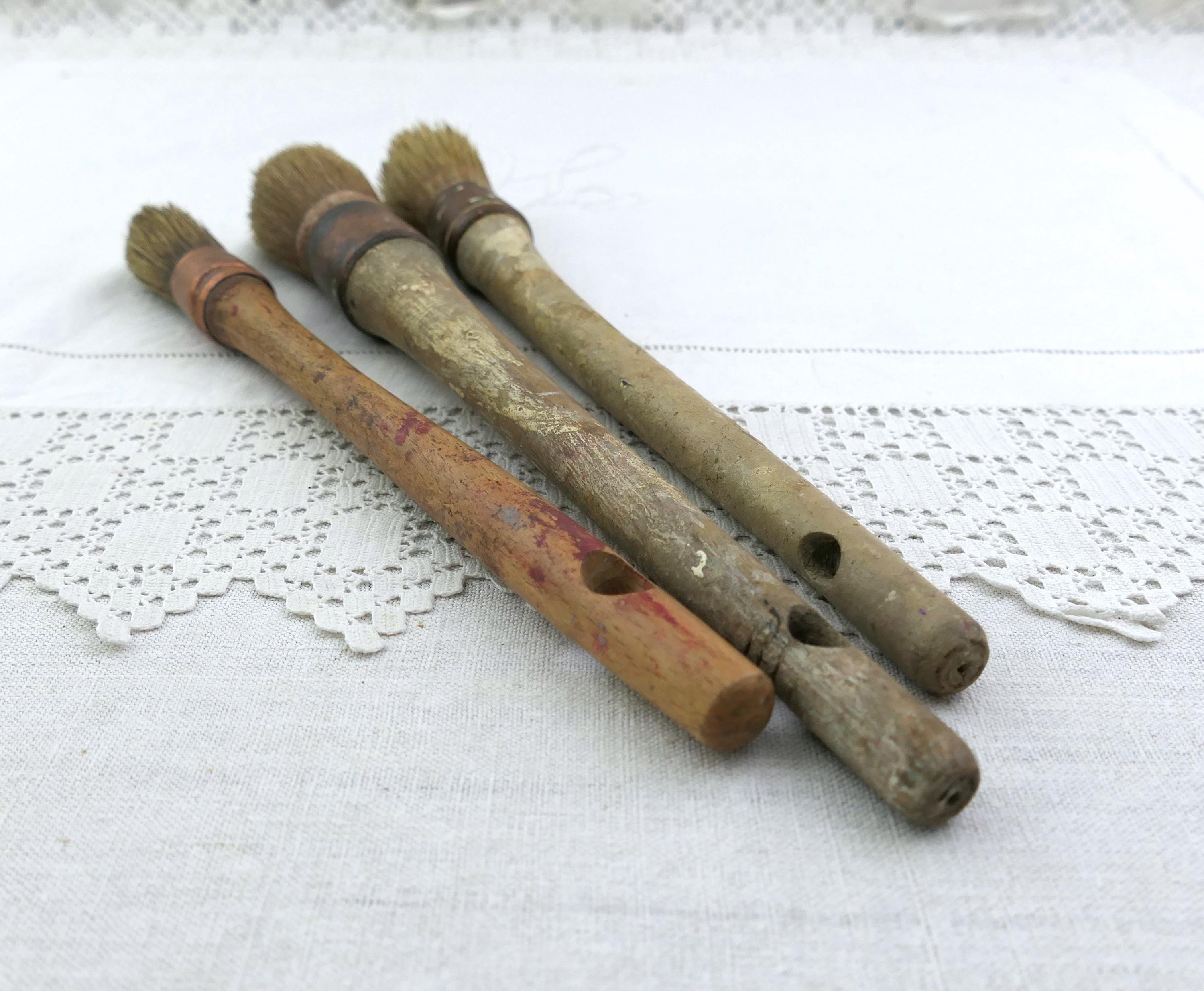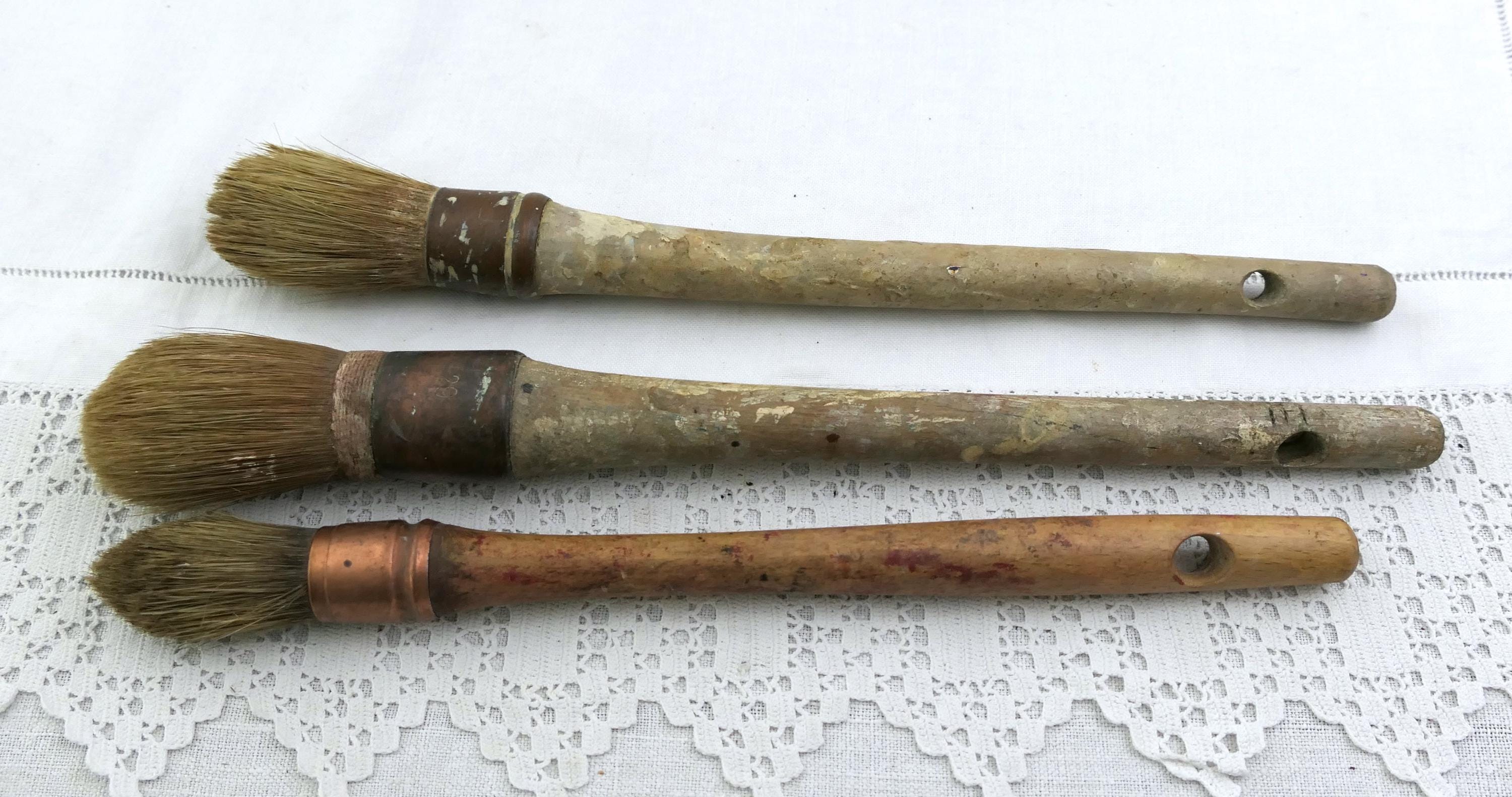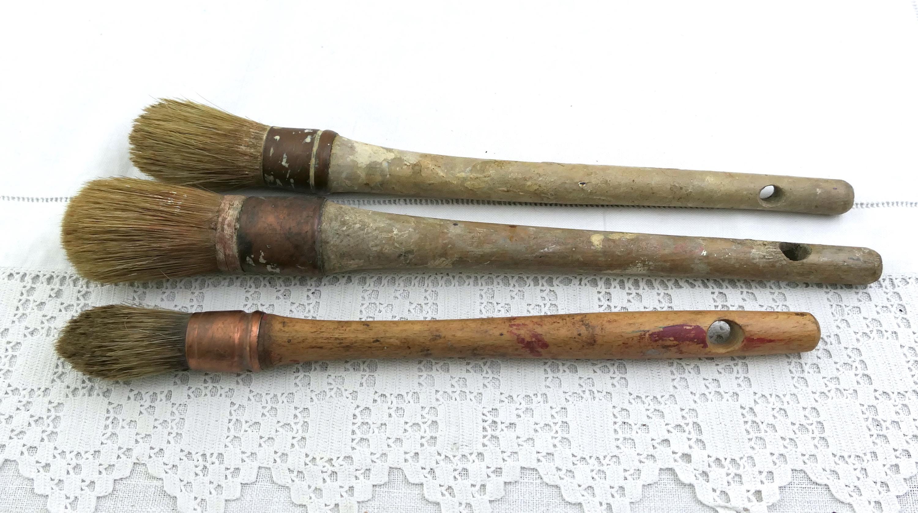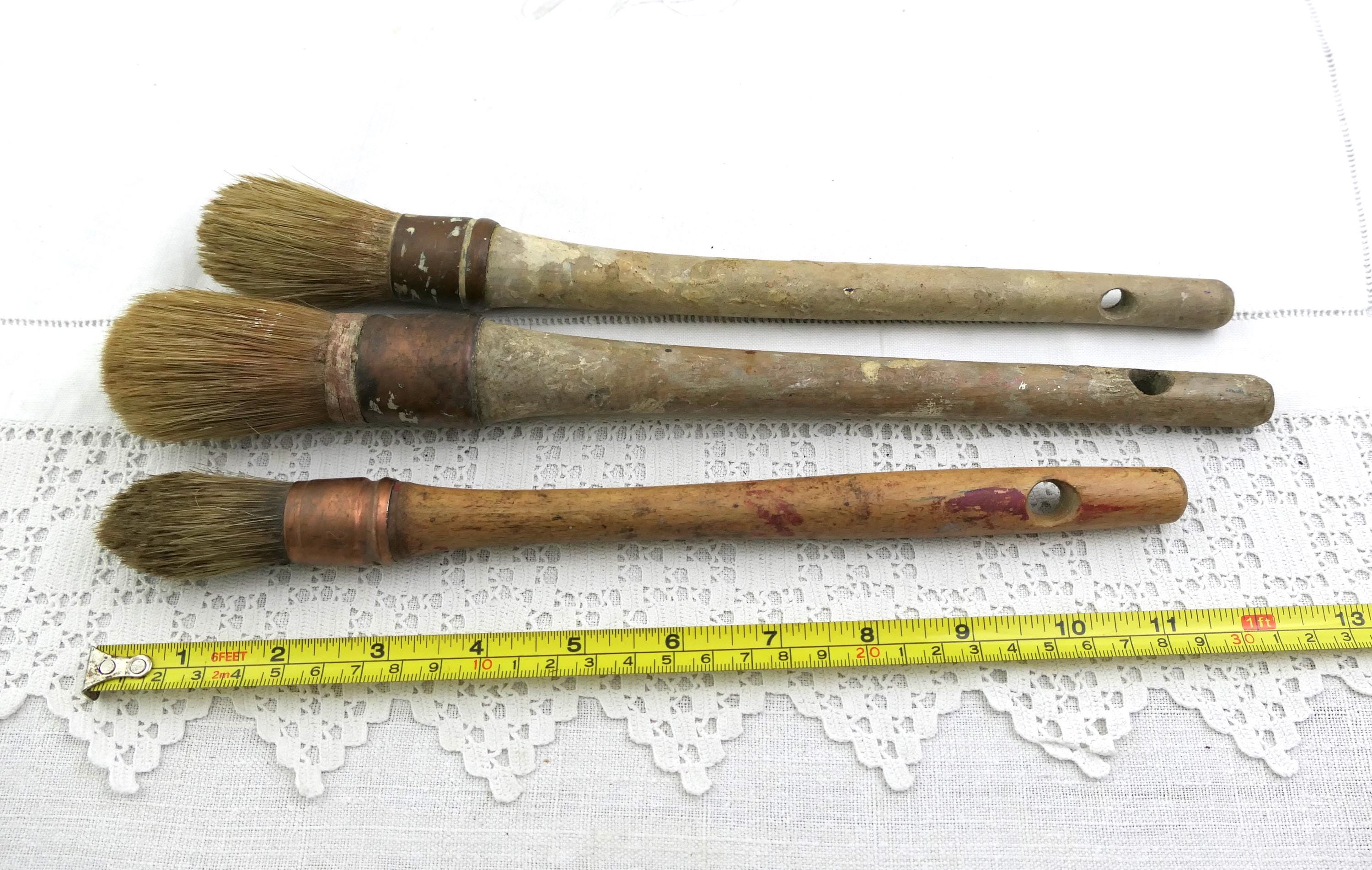 3 vintage used round paint brushes. Made of natural fibers with wooden handles and copper. Ca early to mid 1900s.