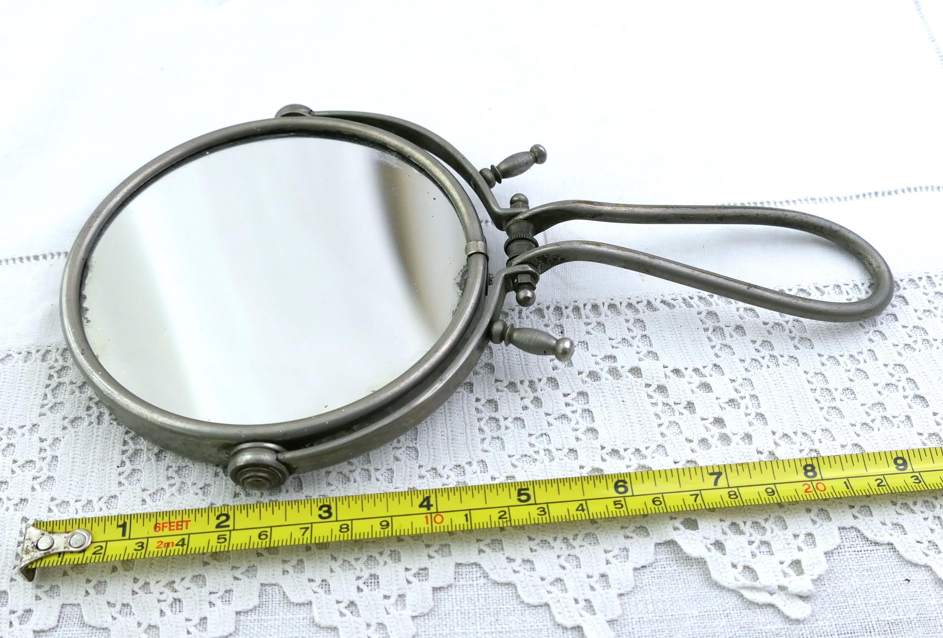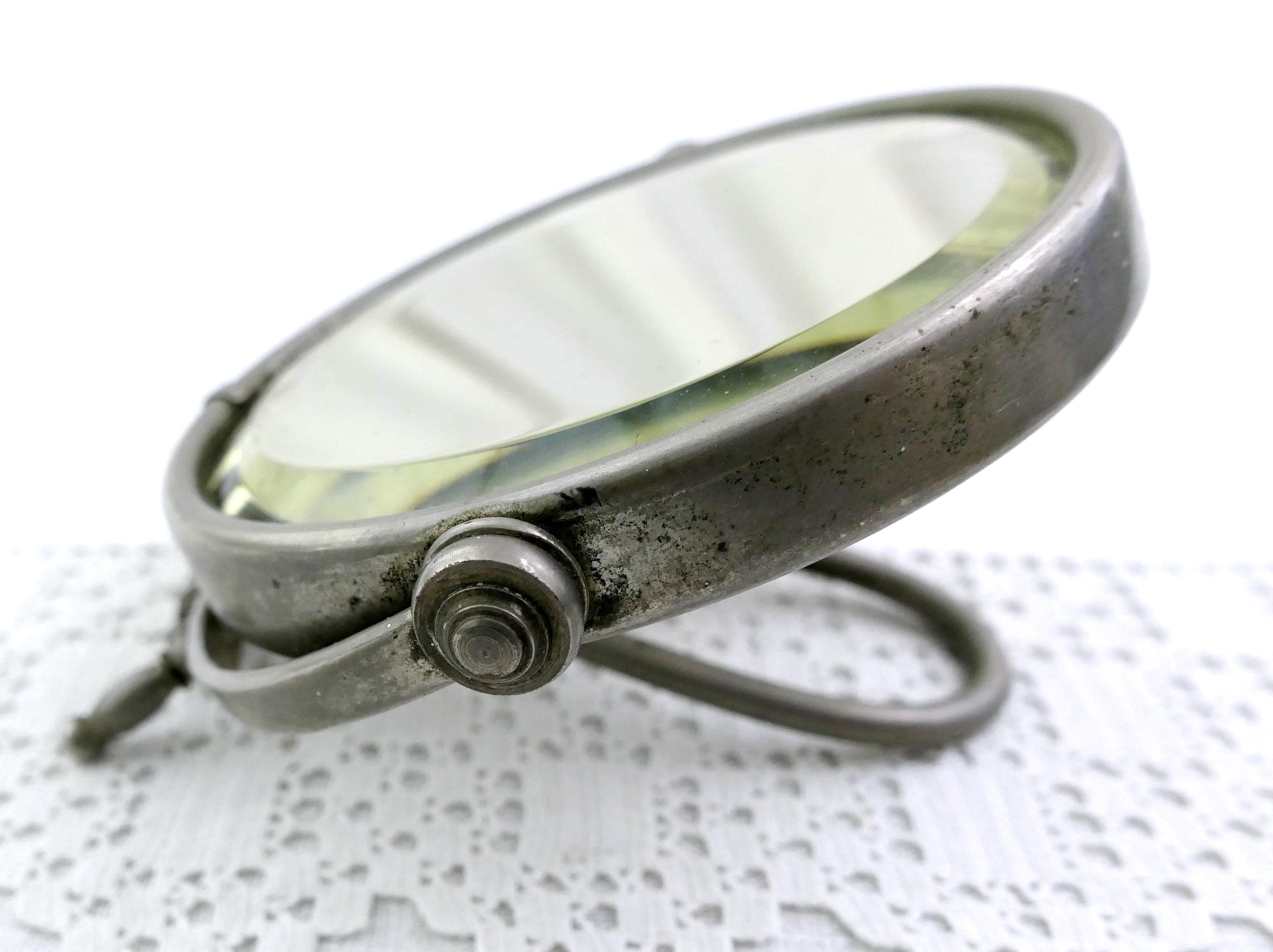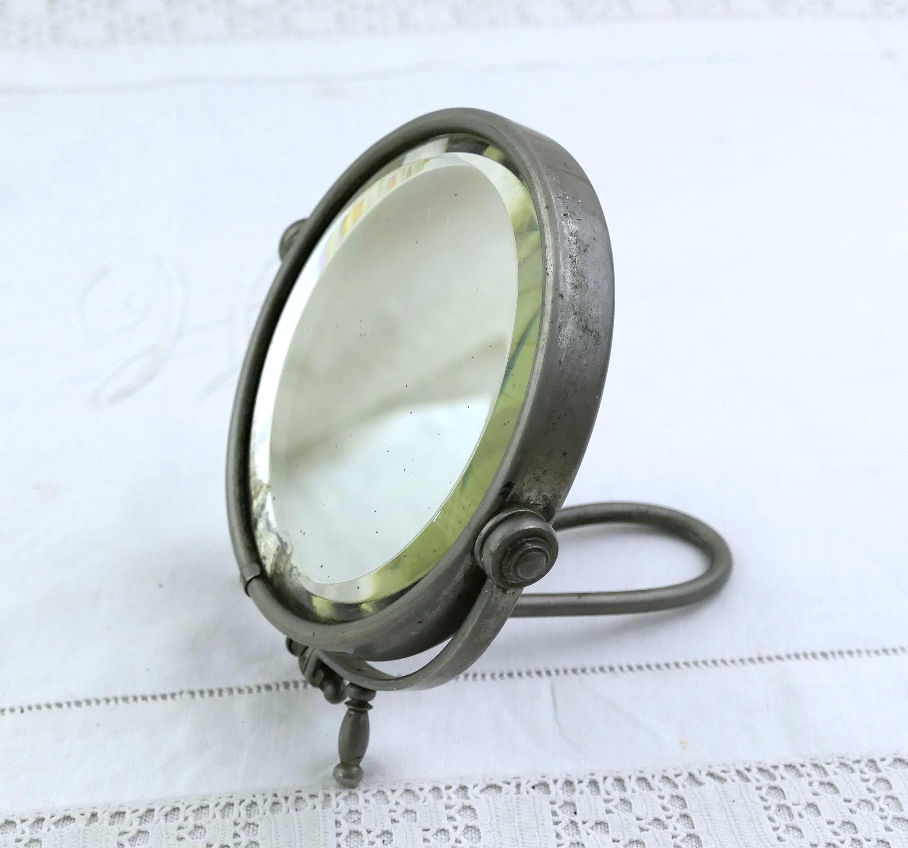 Vintage French round barber's mirror. Chrome frame with thick beveled glass magnifing mirror and on the reverse normal mirror. Can be used as hand held, wall hanging or free standing. Circa 1920s.