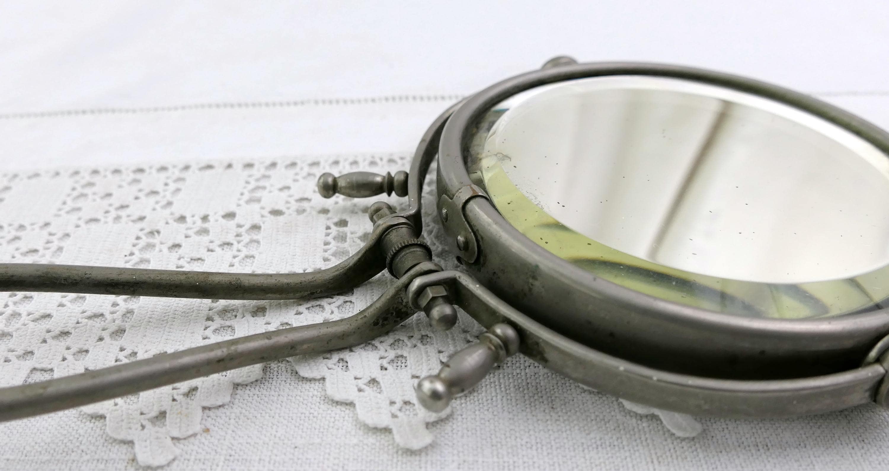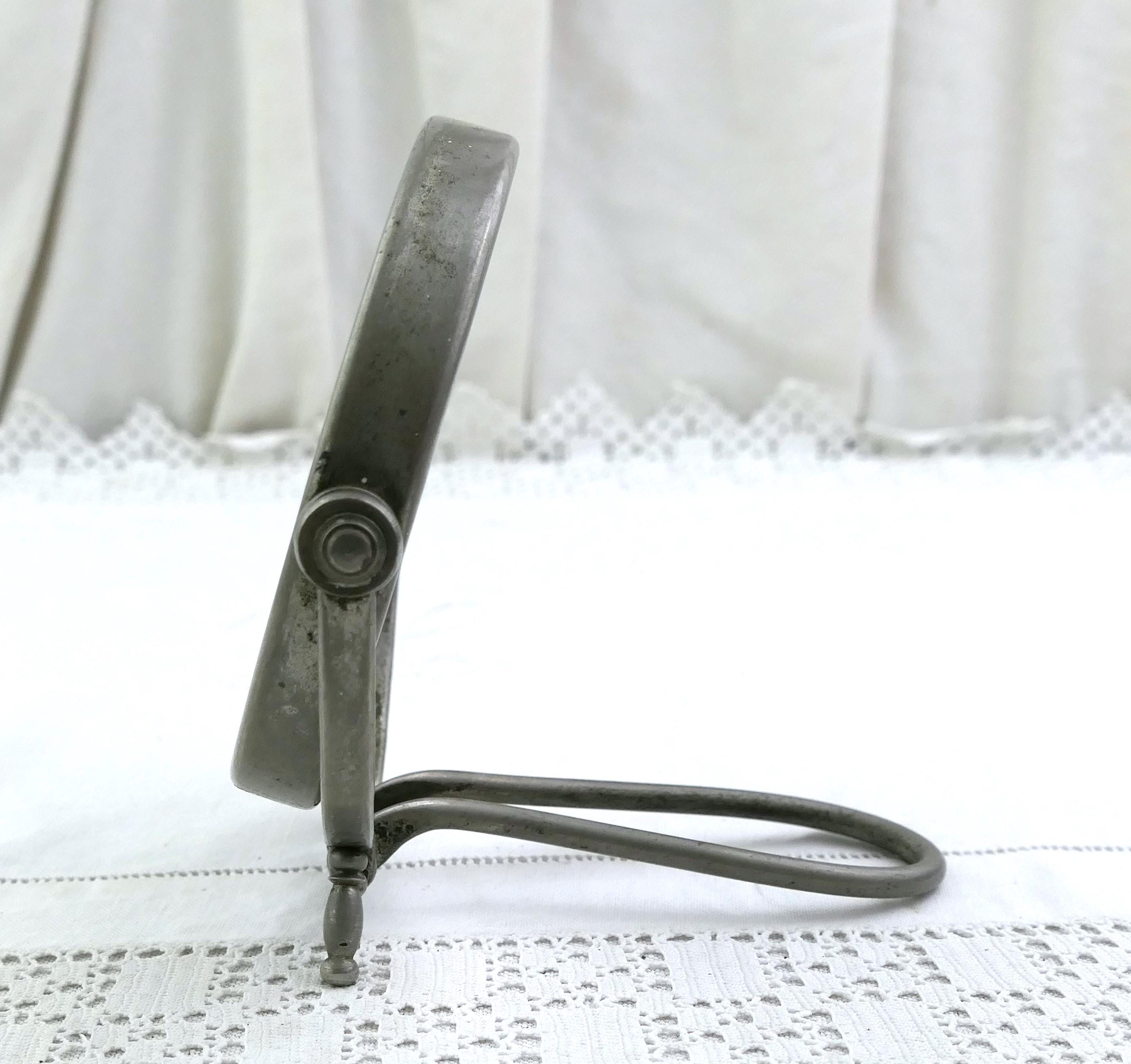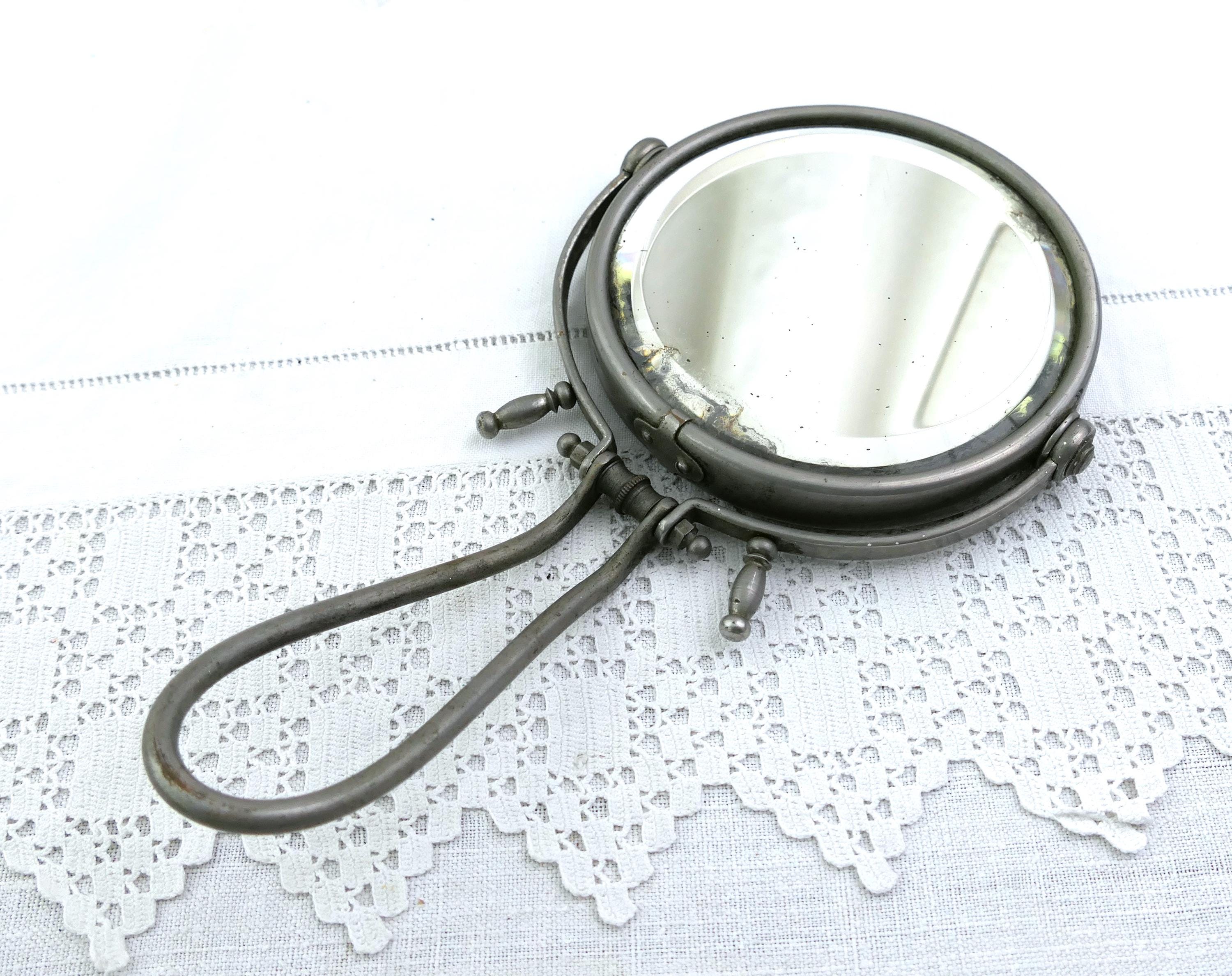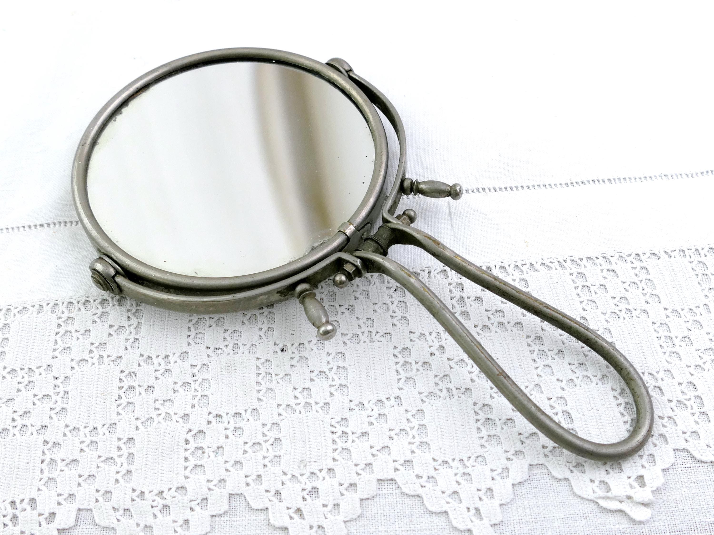 Vintage French round barber's mirror. Chrome frame with thick beveled glass magnifing mirror and on the reverse normal mirror. Can be used as hand held, wall hanging or free standing. Circa 1920s.