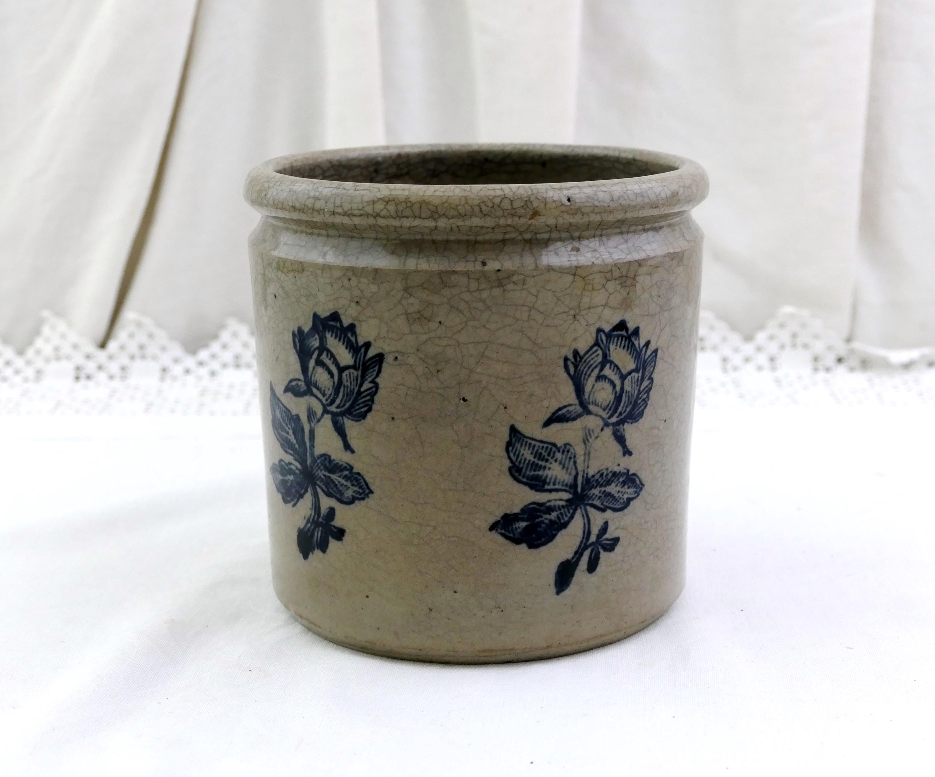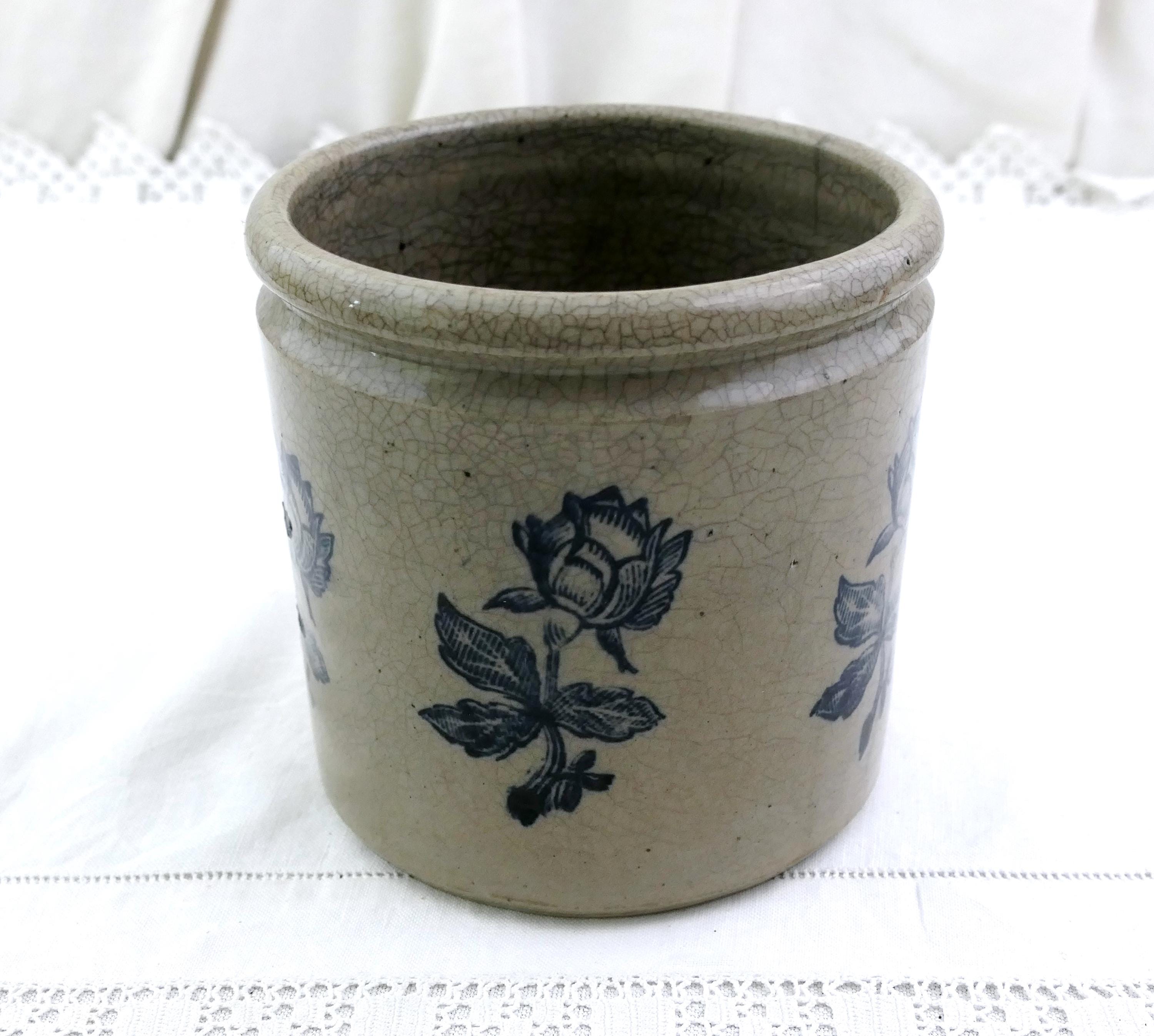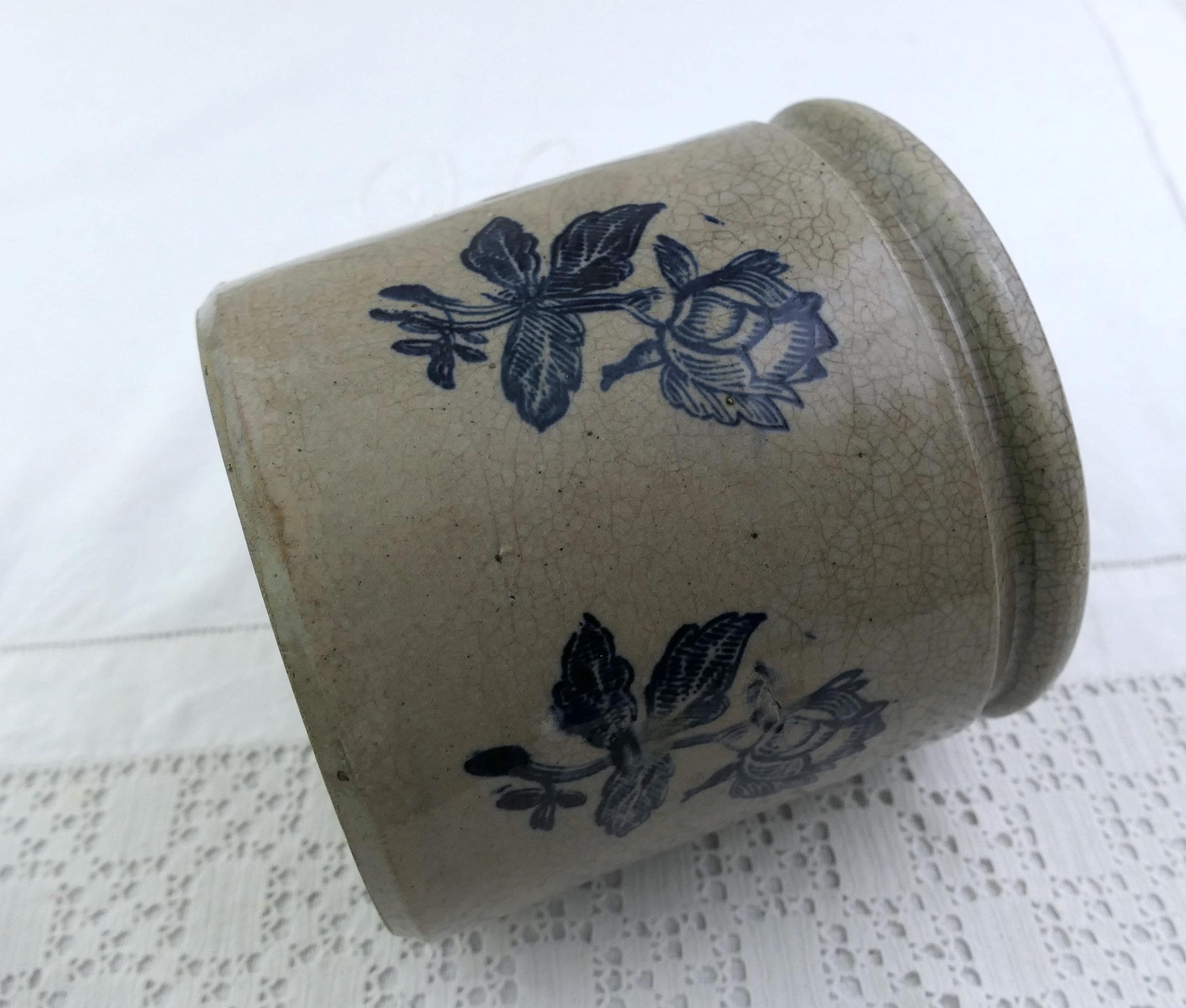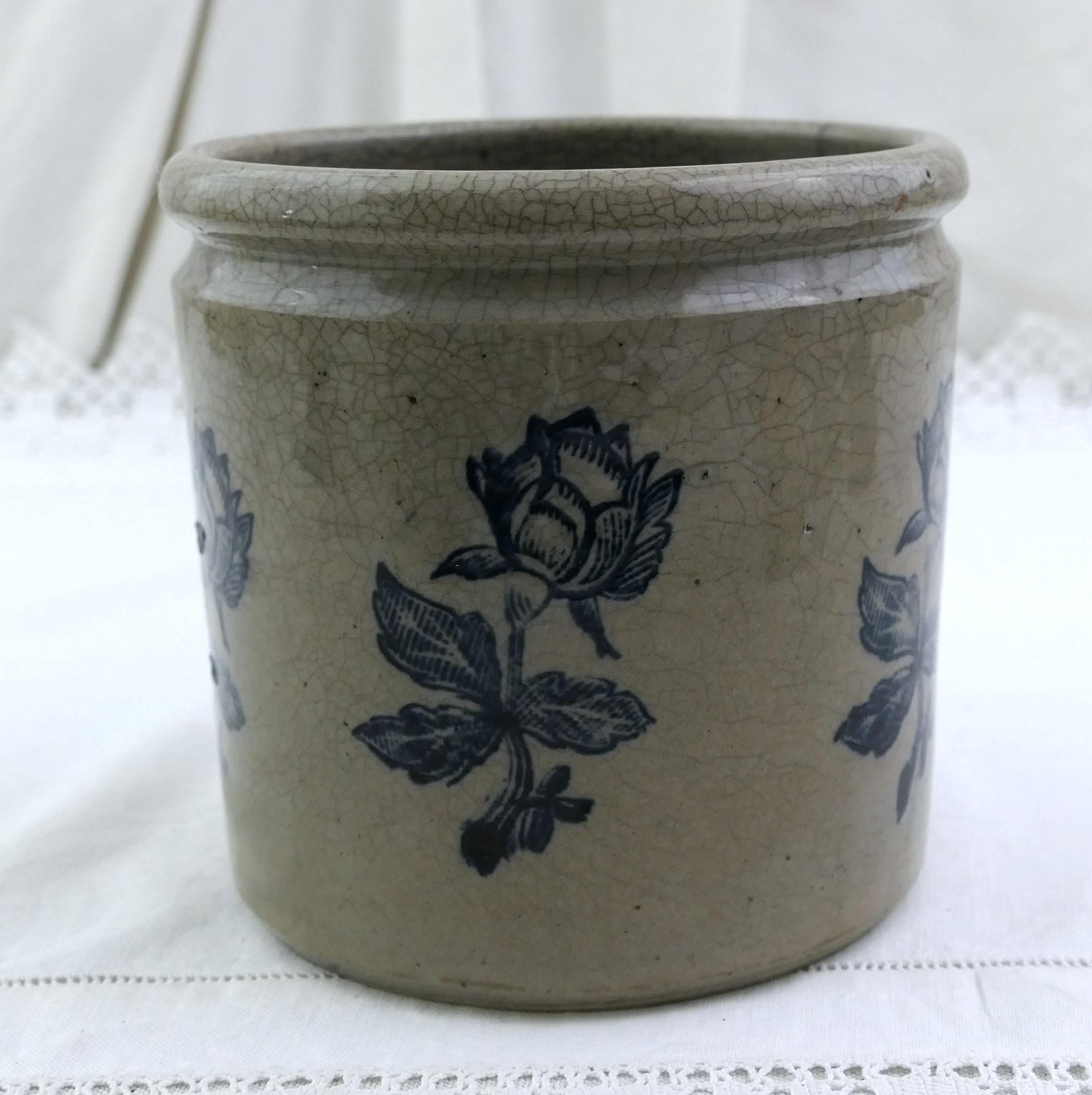 Vintage French gray crock pot with blue flower pattern. Made of salt glazed earthenware pottery. Ca 1920s.