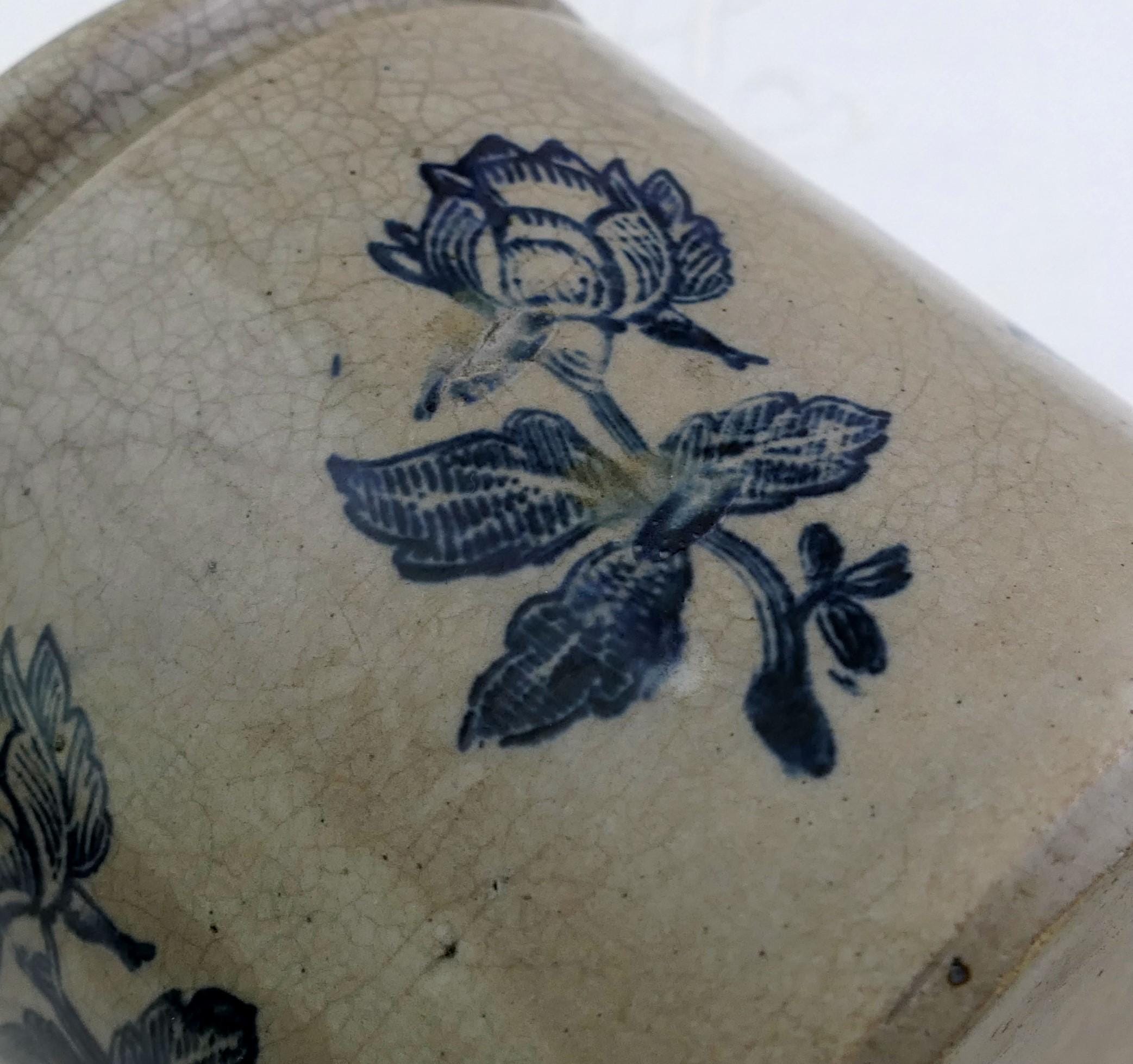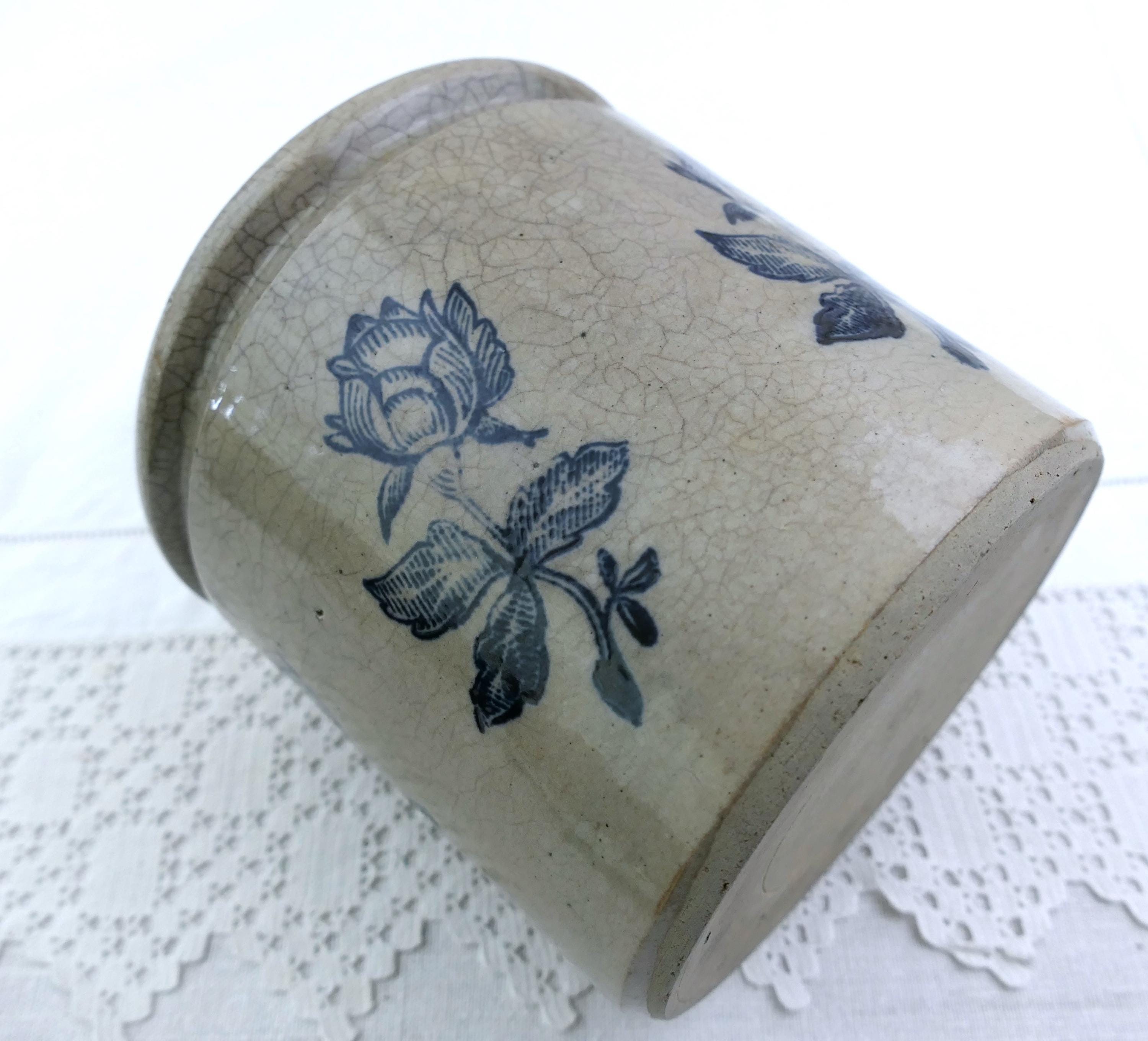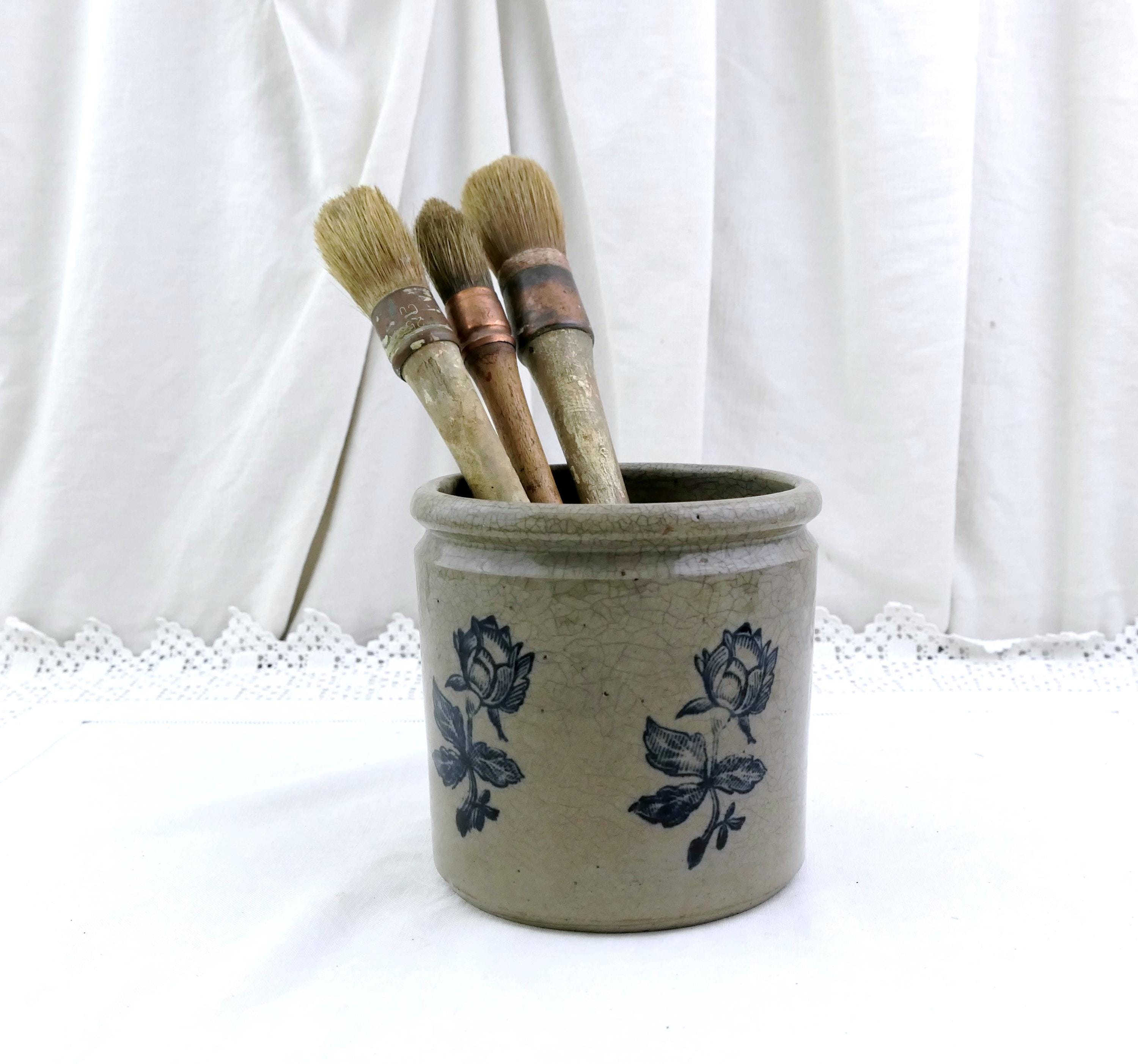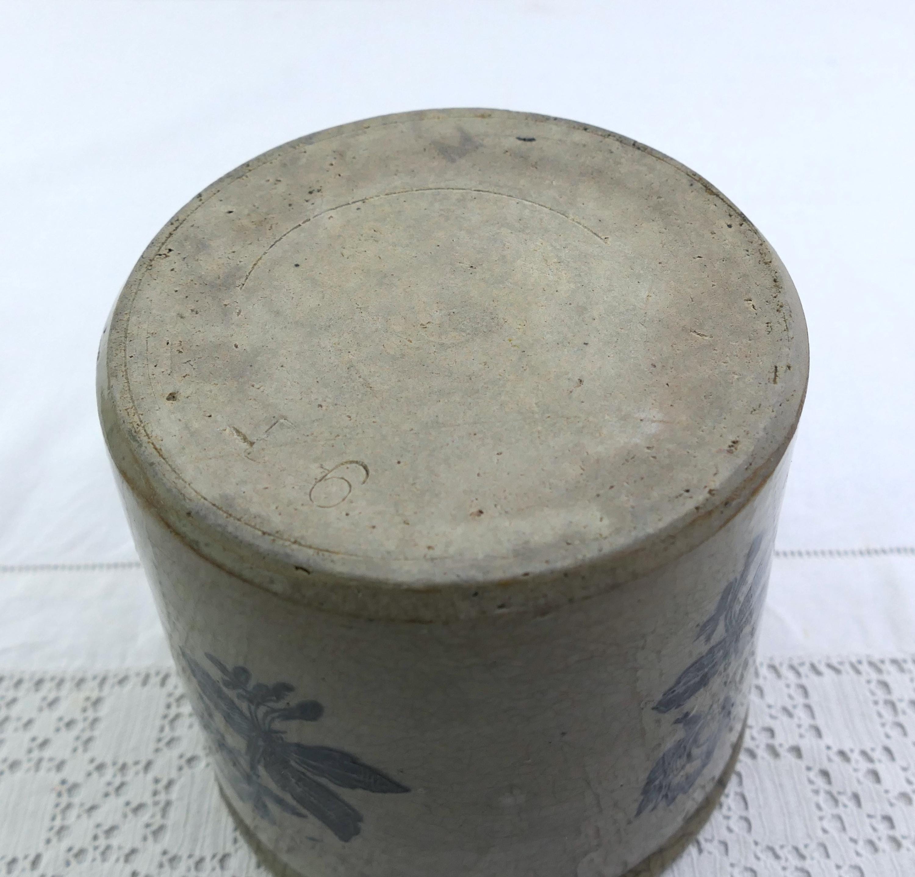 Vintage French gray crock pot with blue flower pattern. Made of salt glazed earthenware pottery. Ca 1920s.