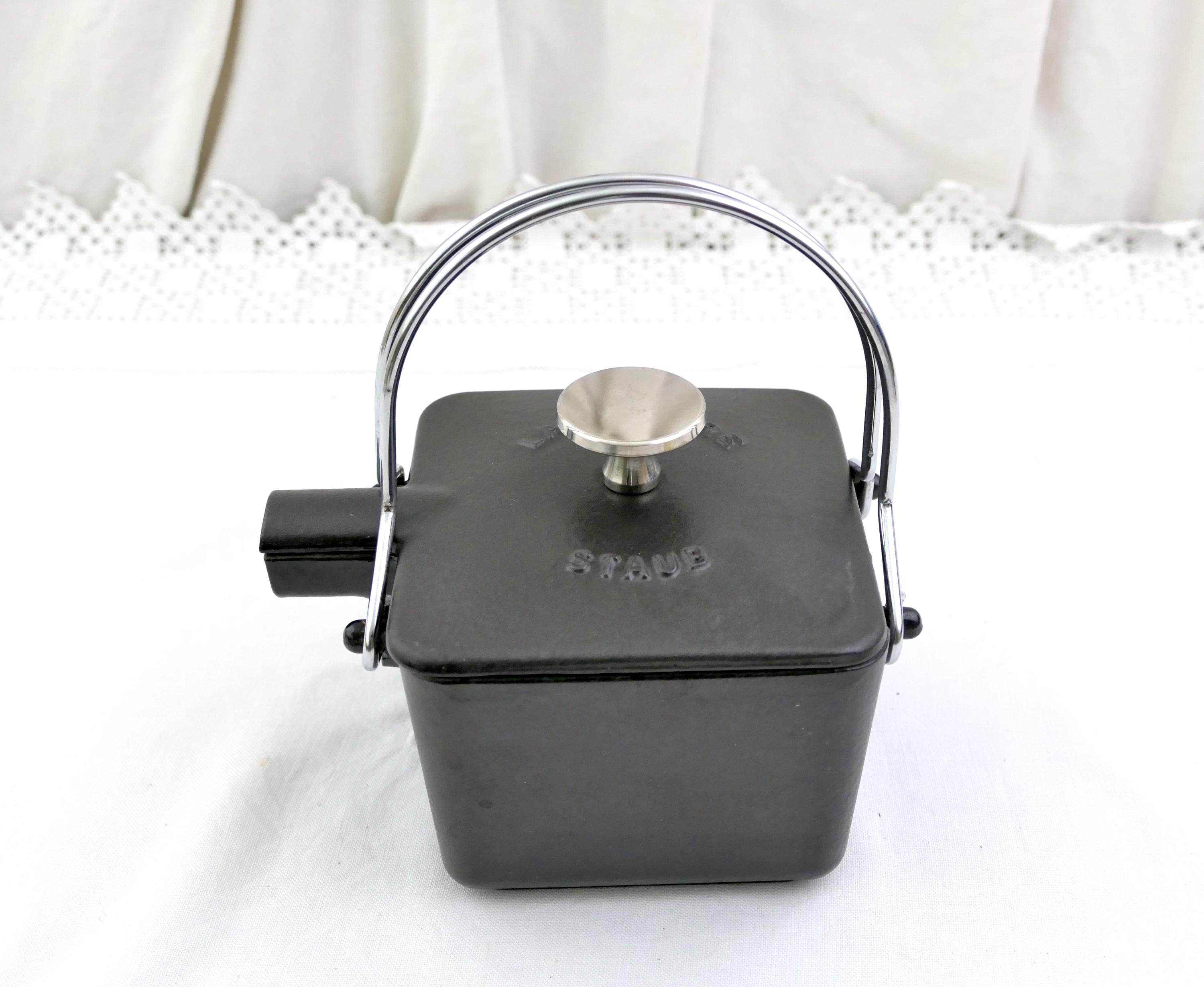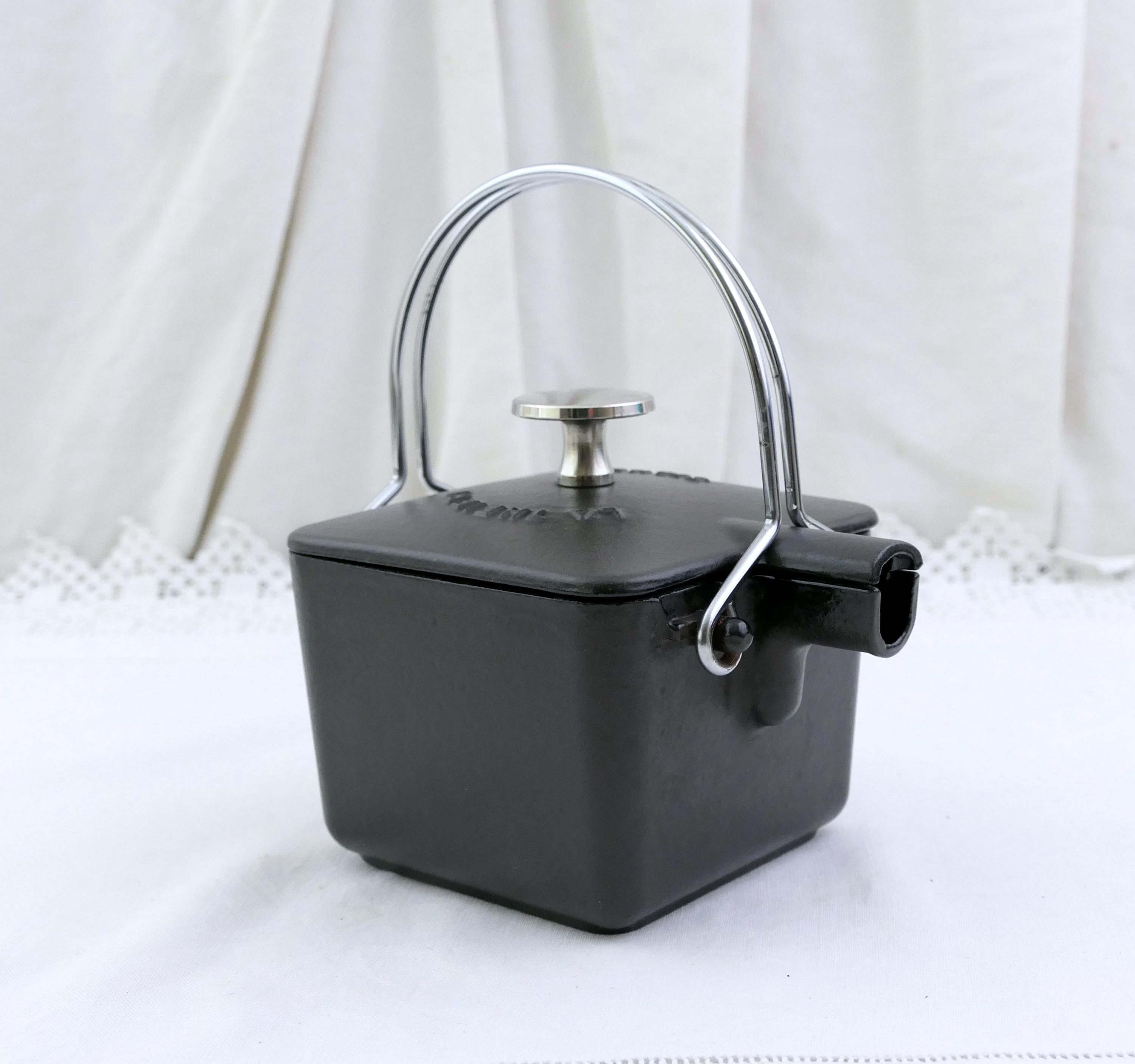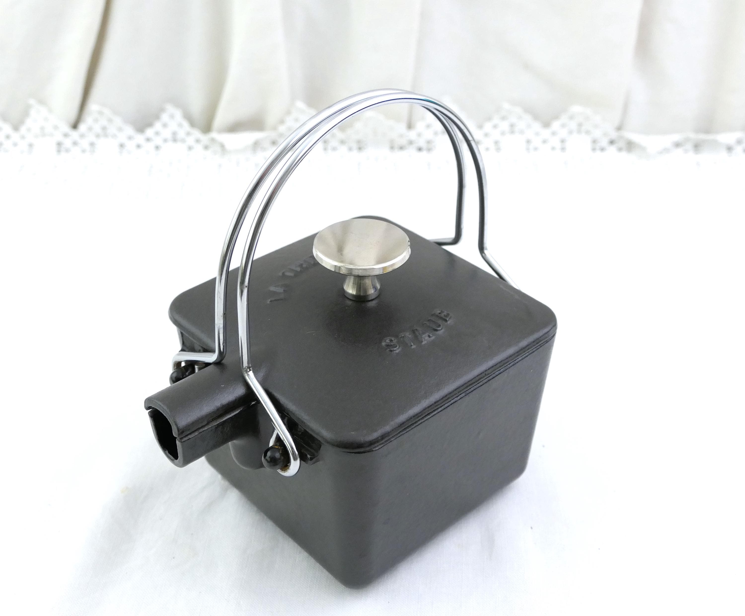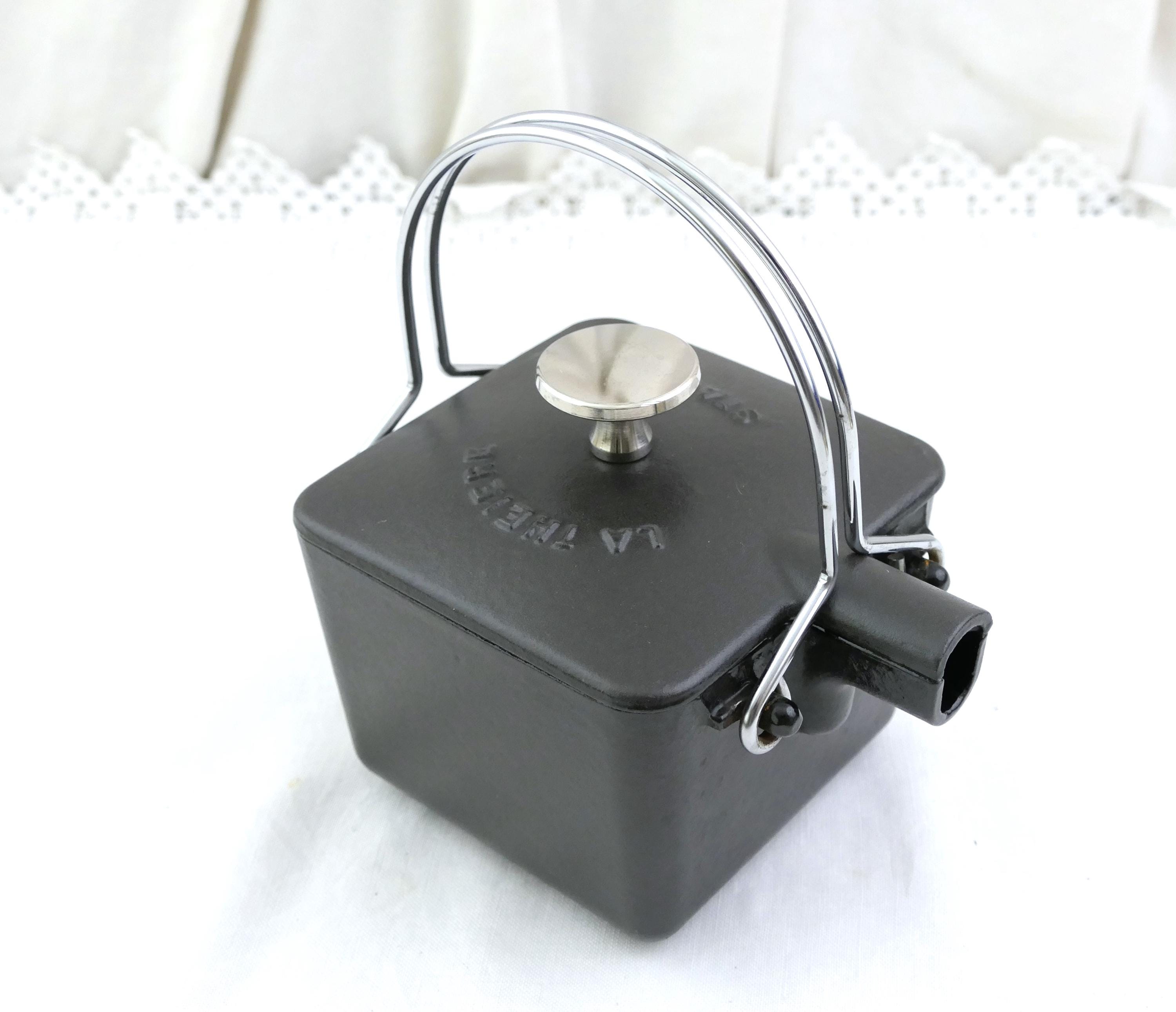 Vintage French black square teapot. Made in France by Staub of black enameled cast iron. Ca late 1900s.