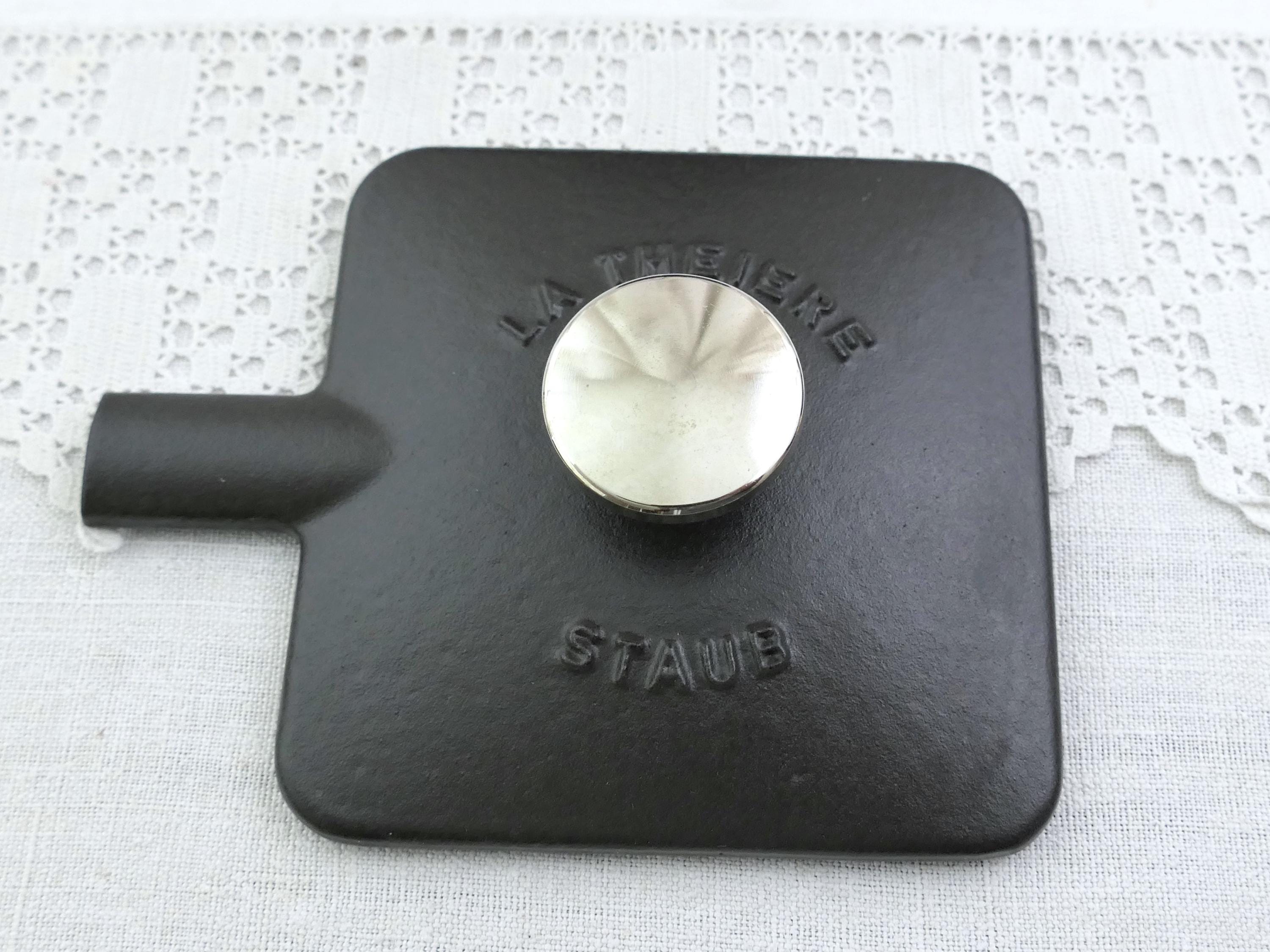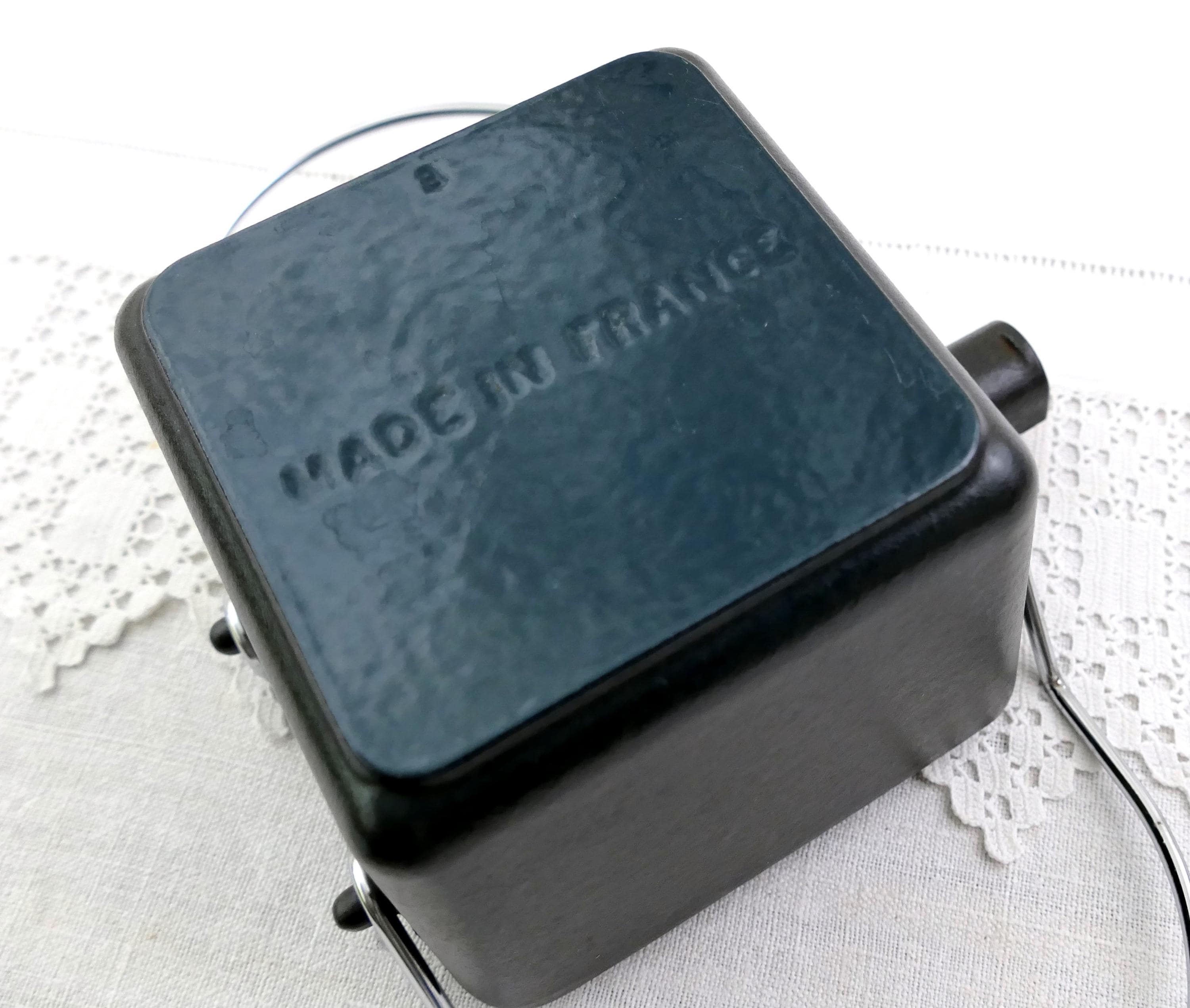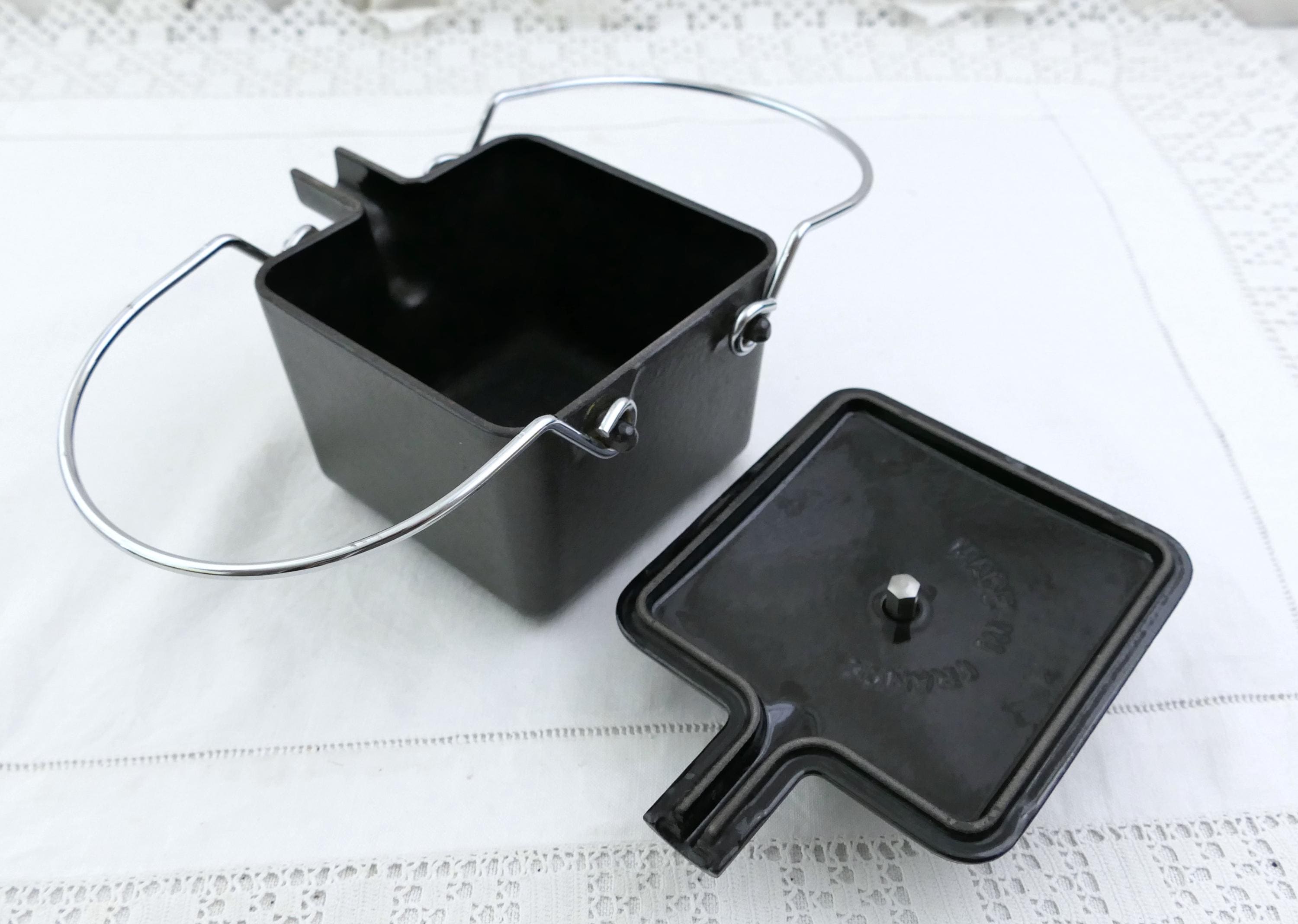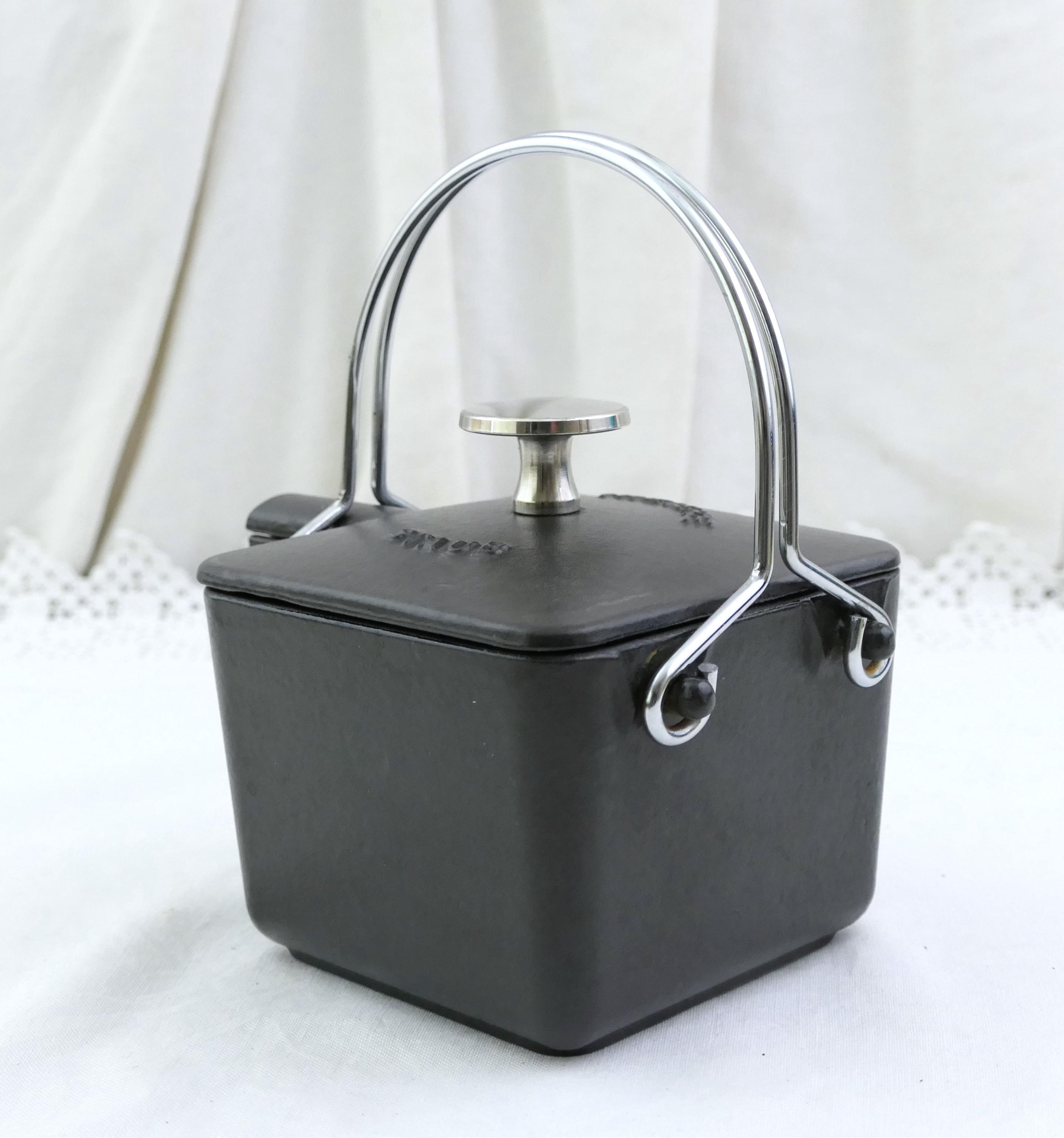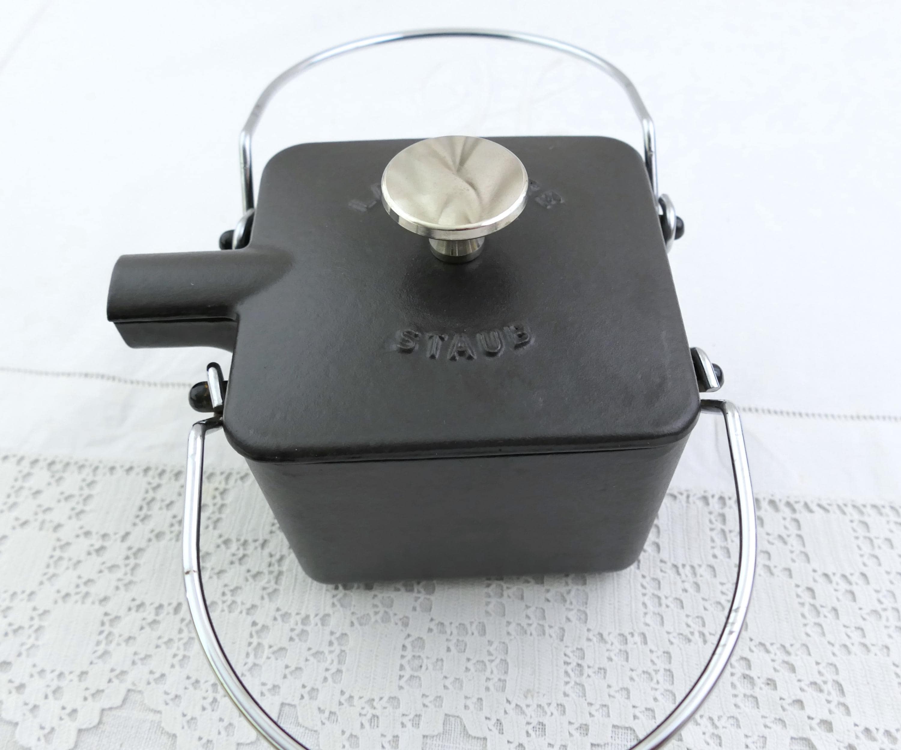 Vintage French black square teapot. Made in France by Staub of black enameled cast iron. Ca late 1900s.