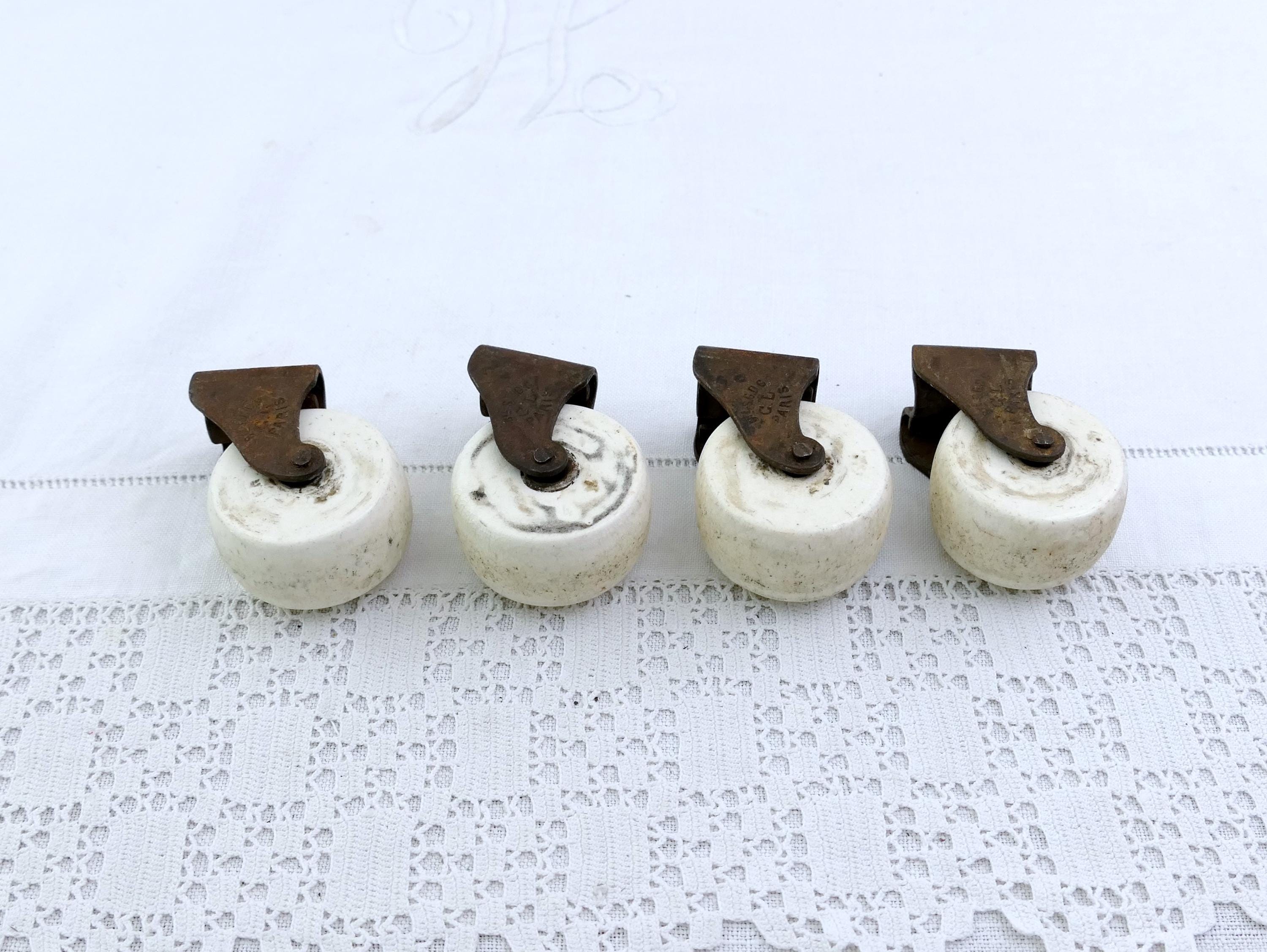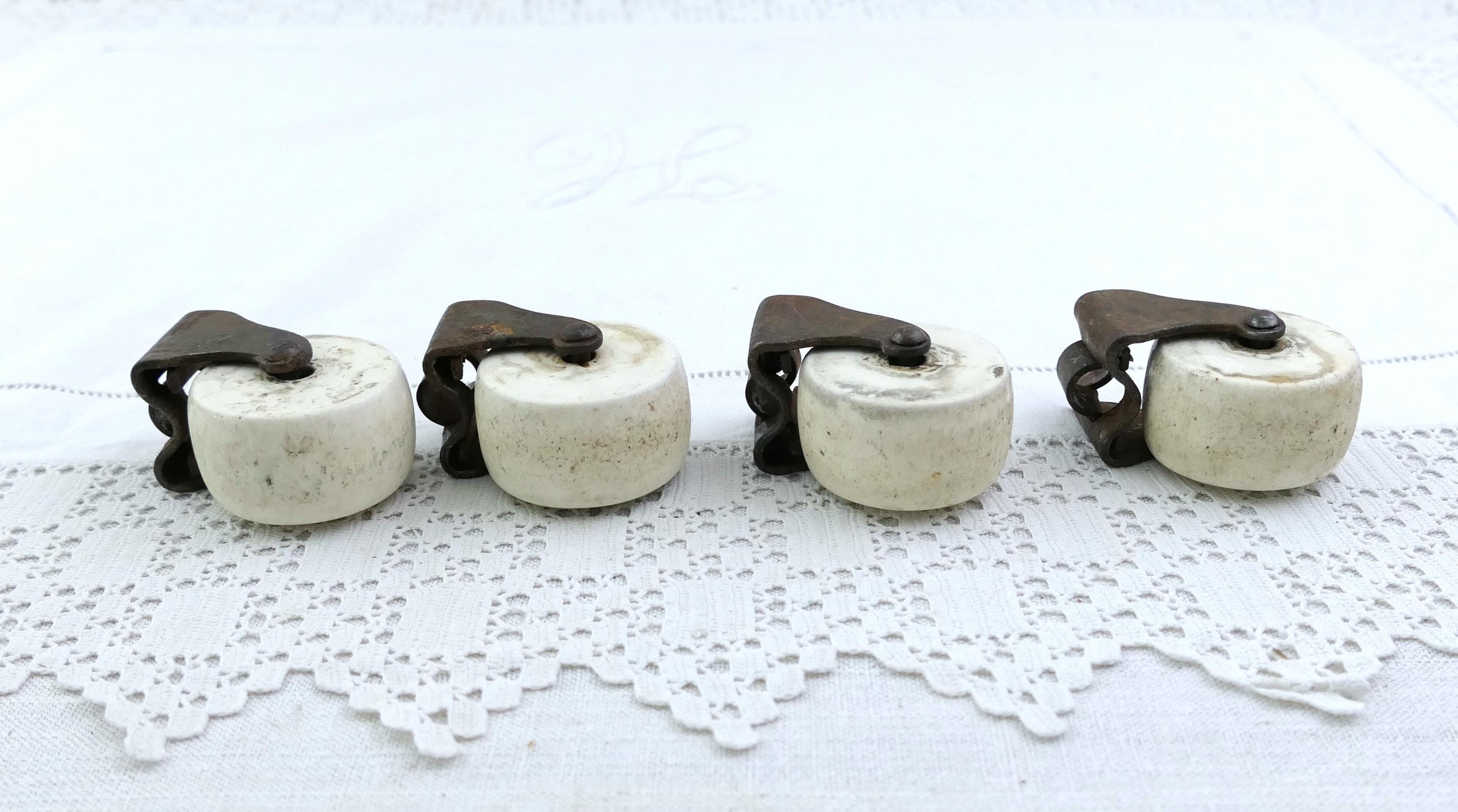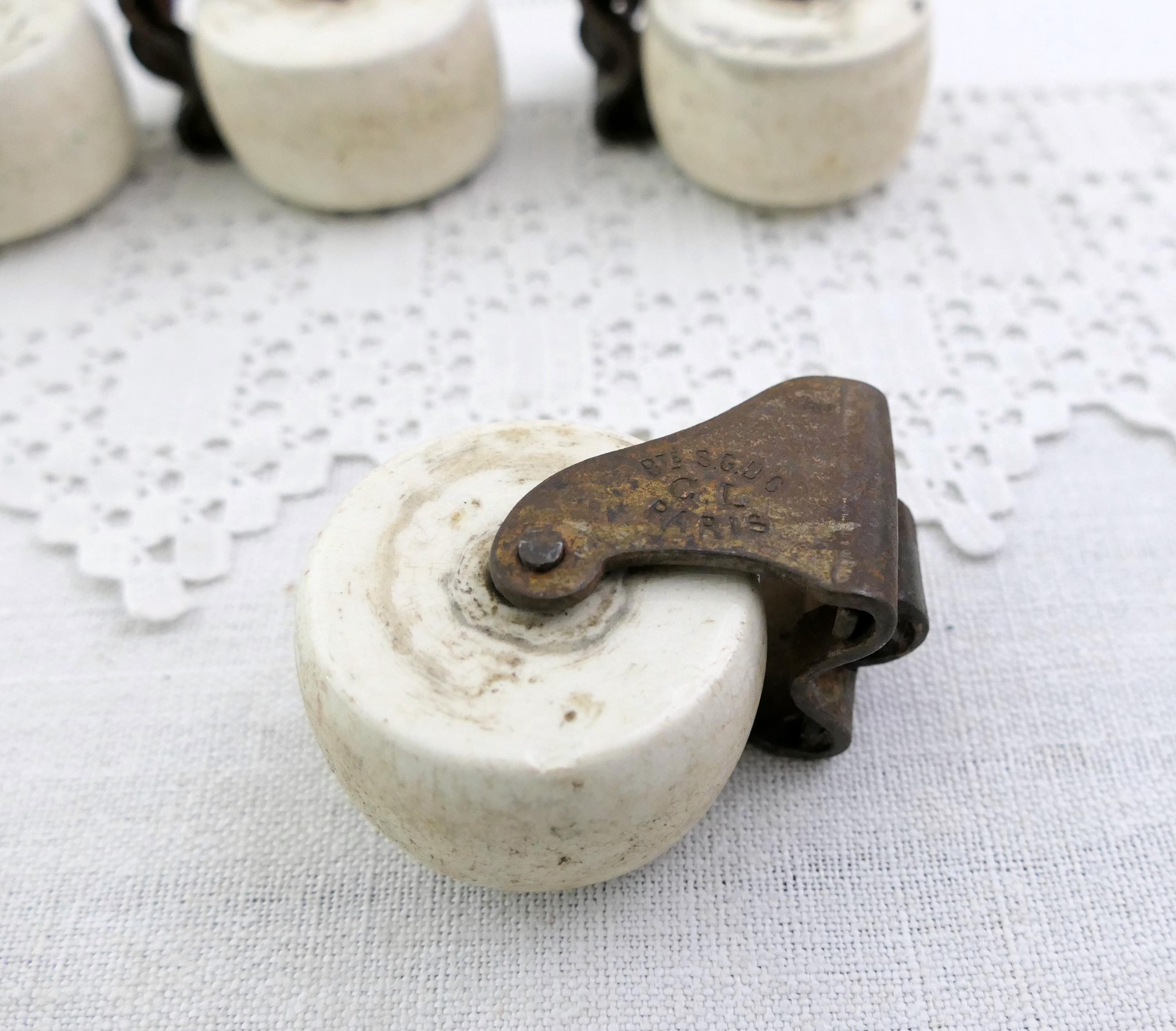 Set of 4 antique French furniture casters. Made in Paris by CL of white porcelain china with metal. Ca 1800s.