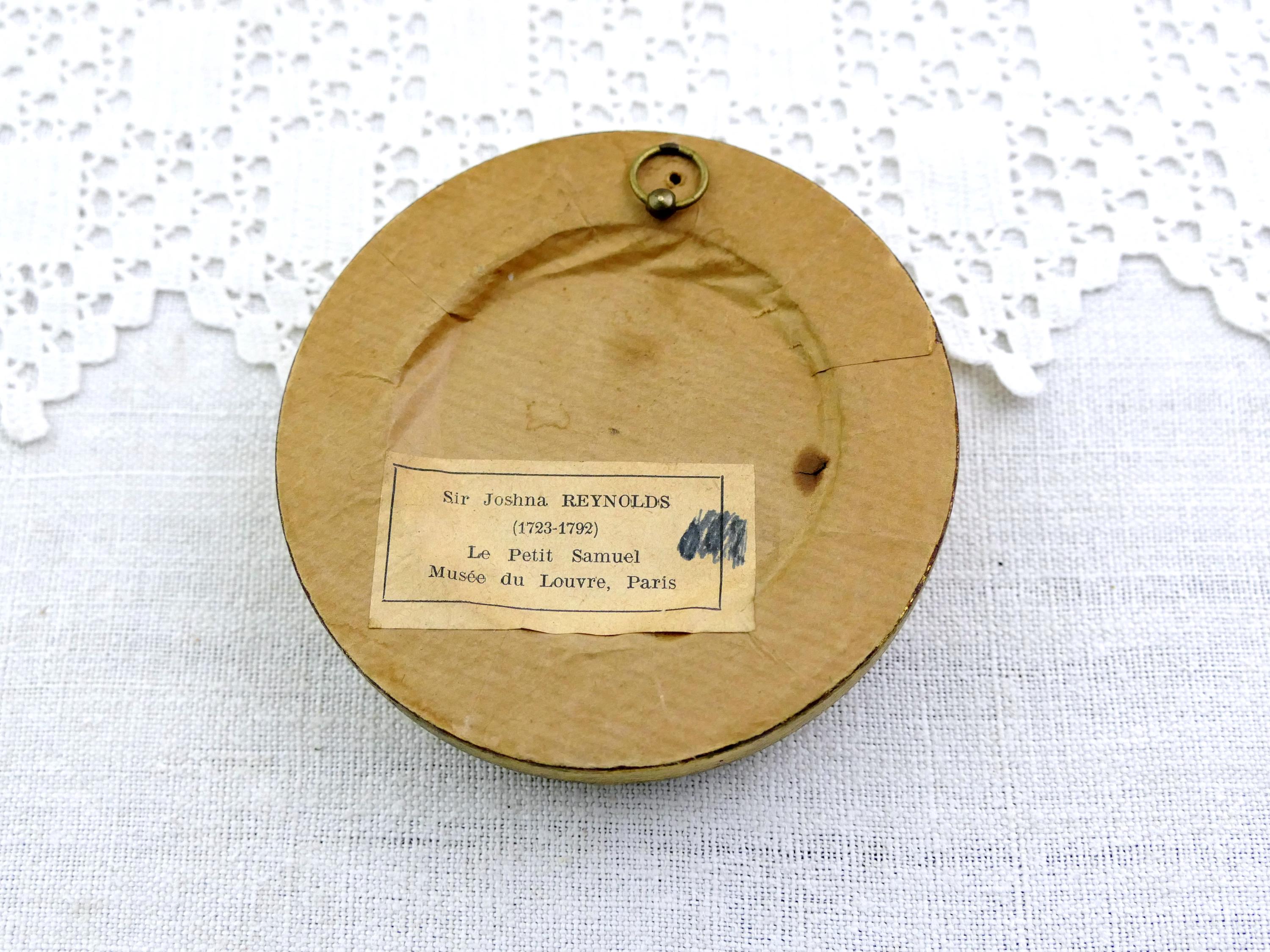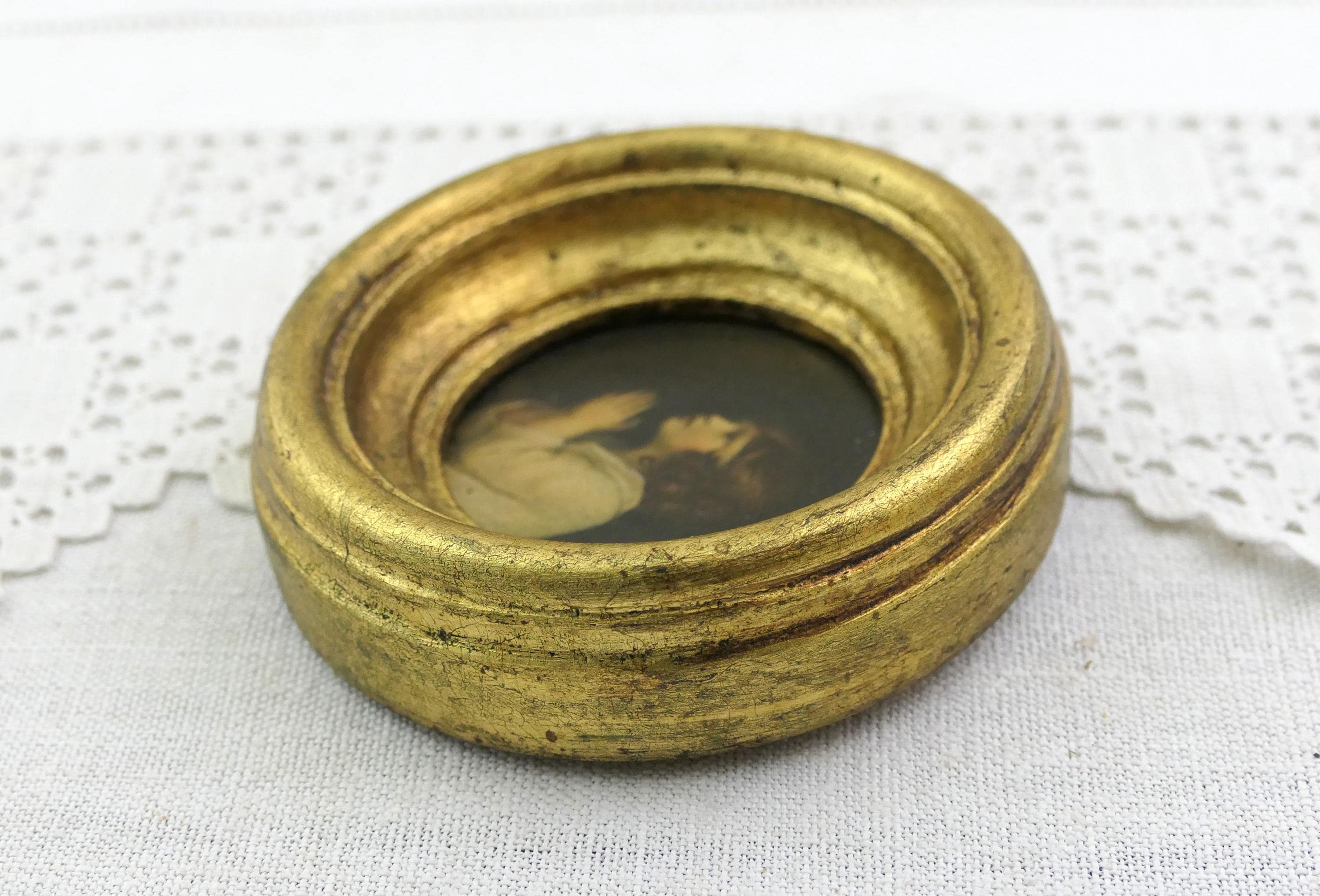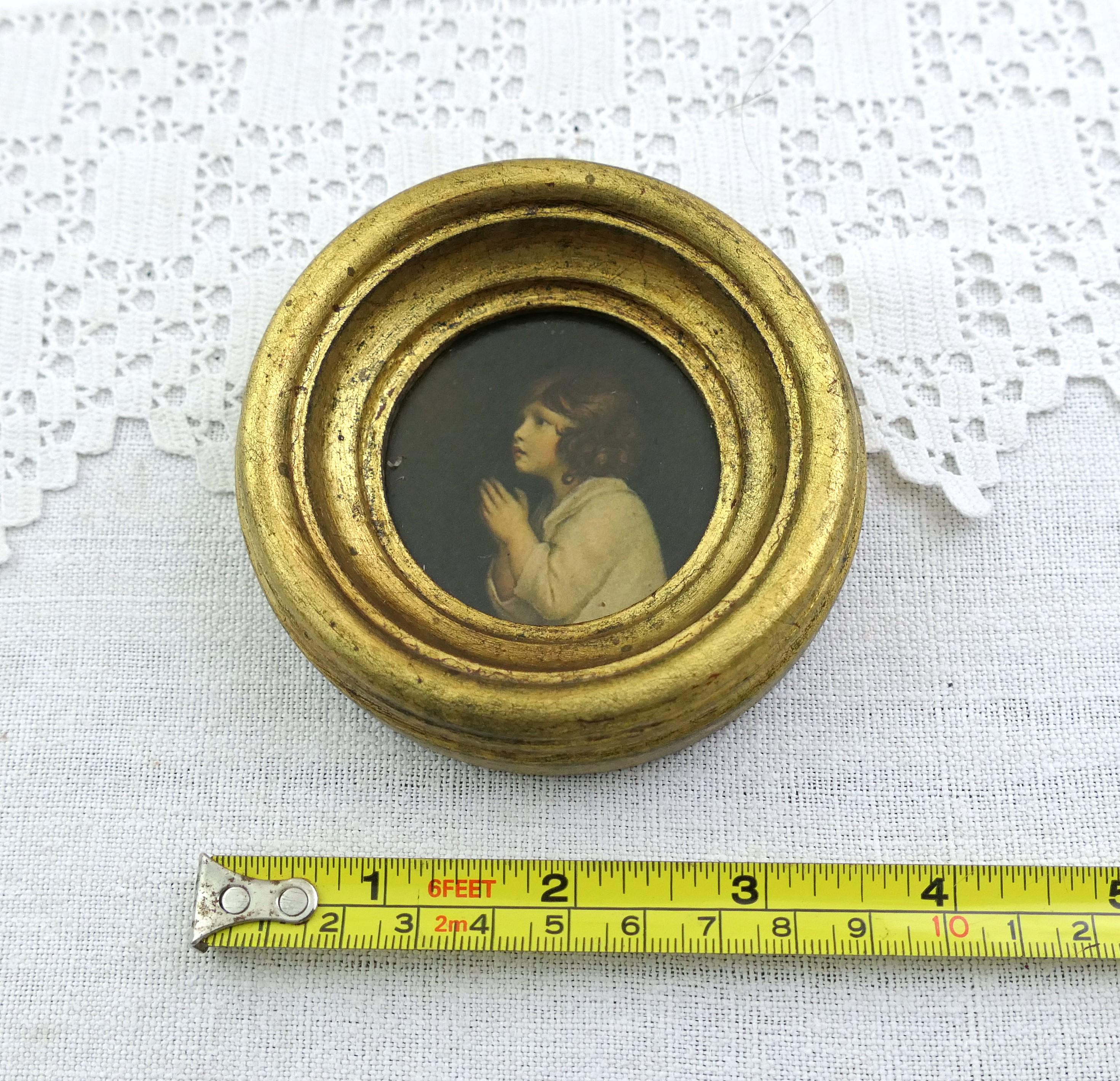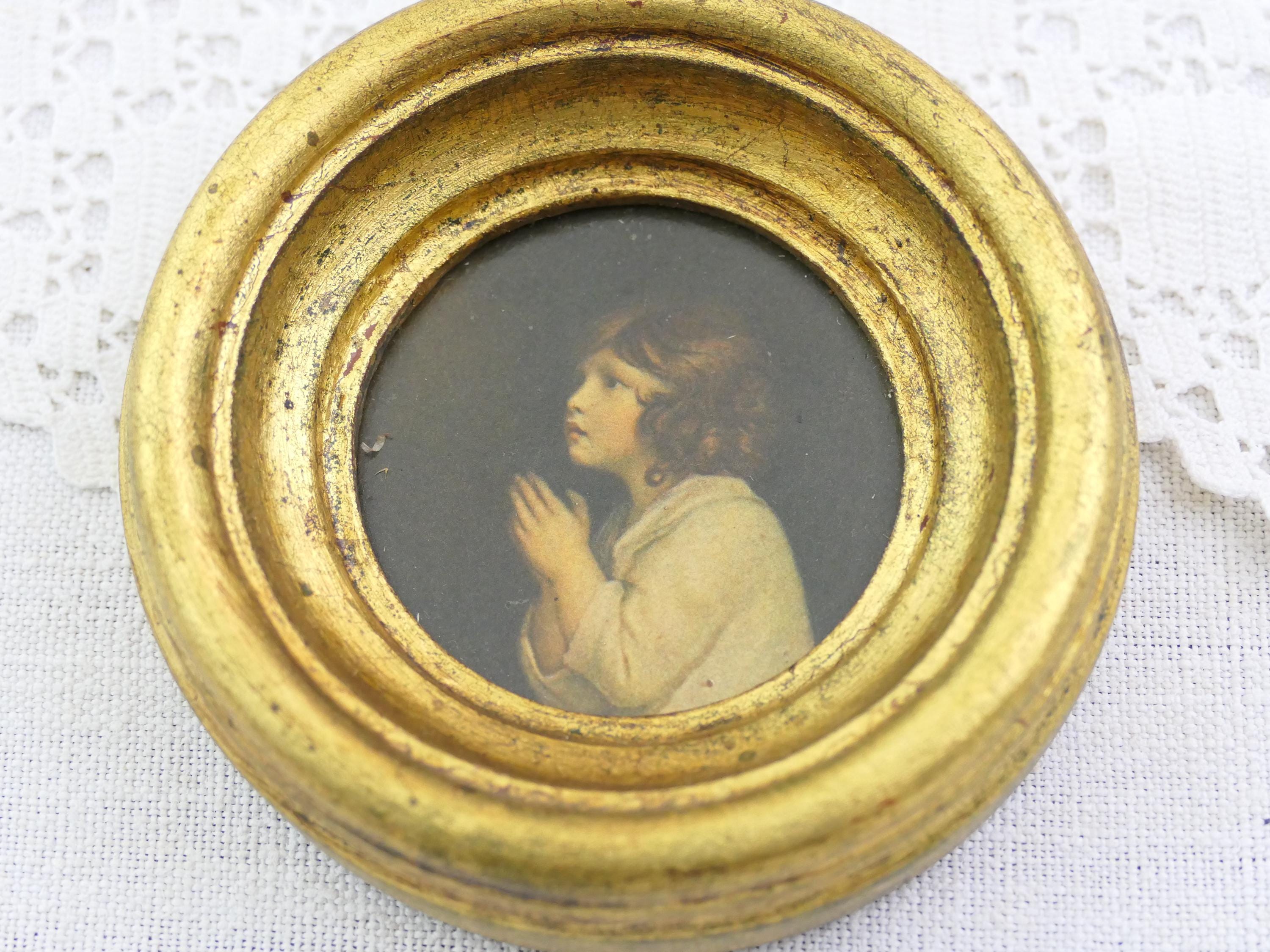 Small round vintage gold gilded frame with print of The Infant Samuel by Sir Joshua Reynolds, the original is hanging in Louvres Paris. Ca 1950s.