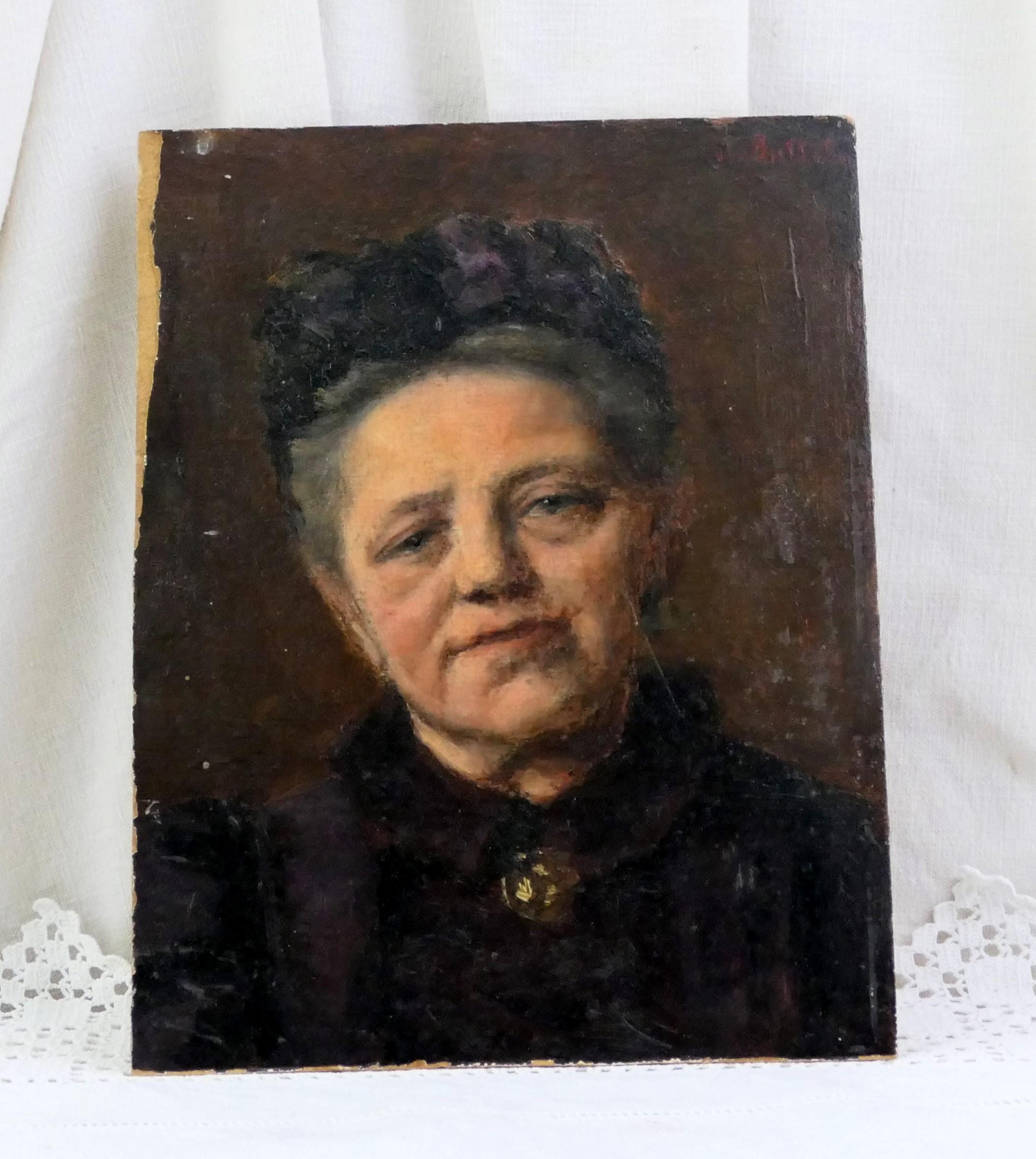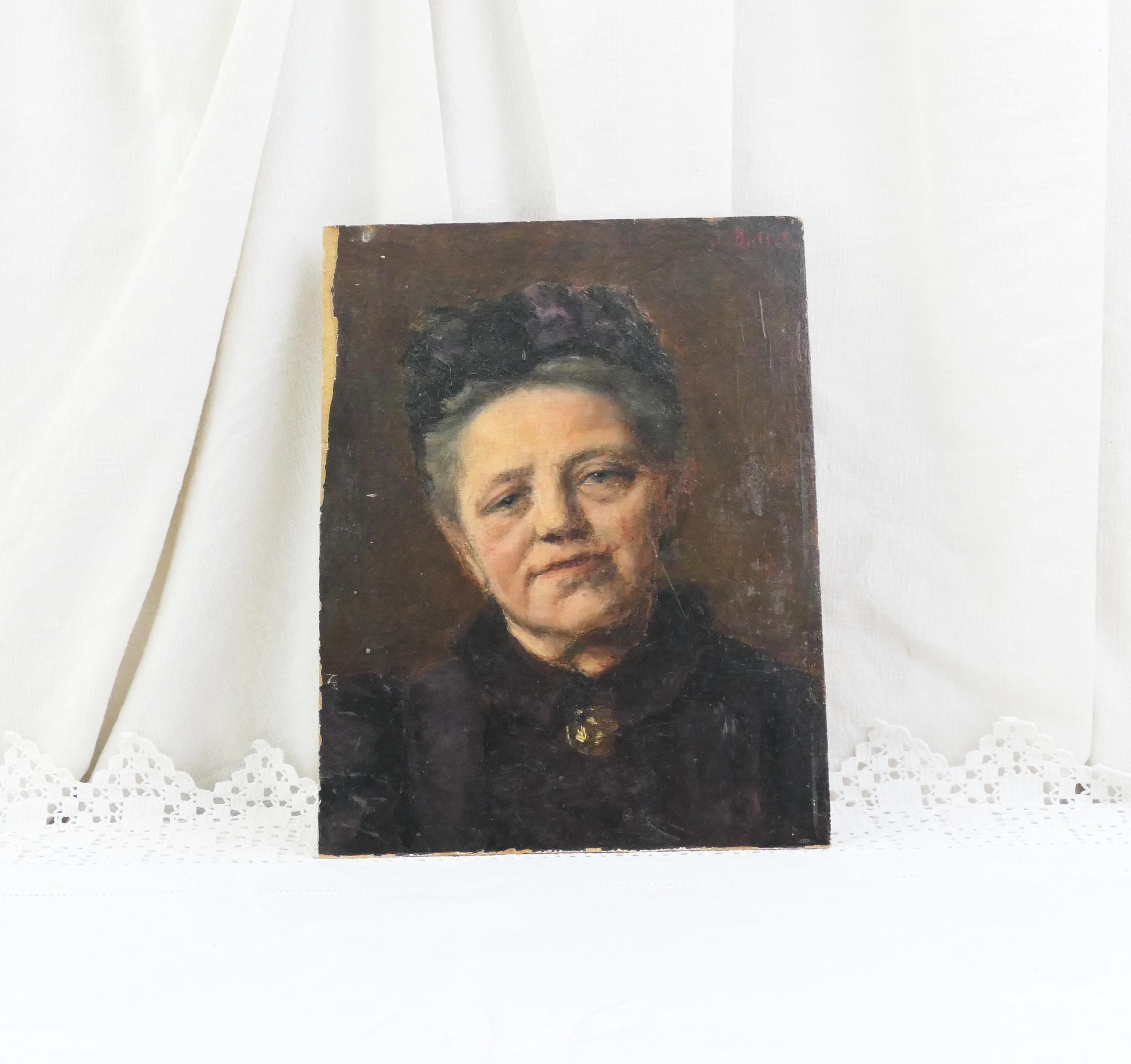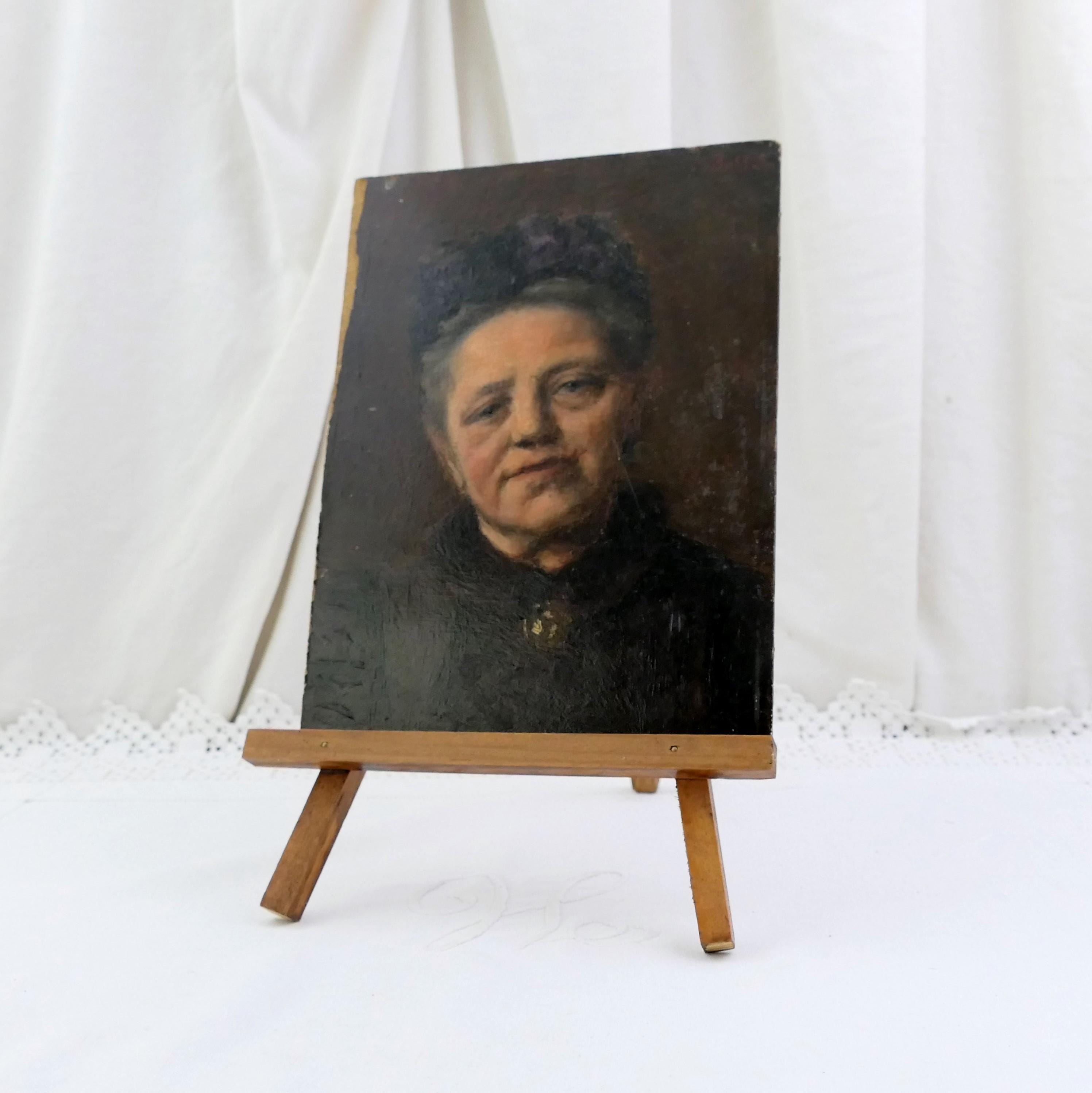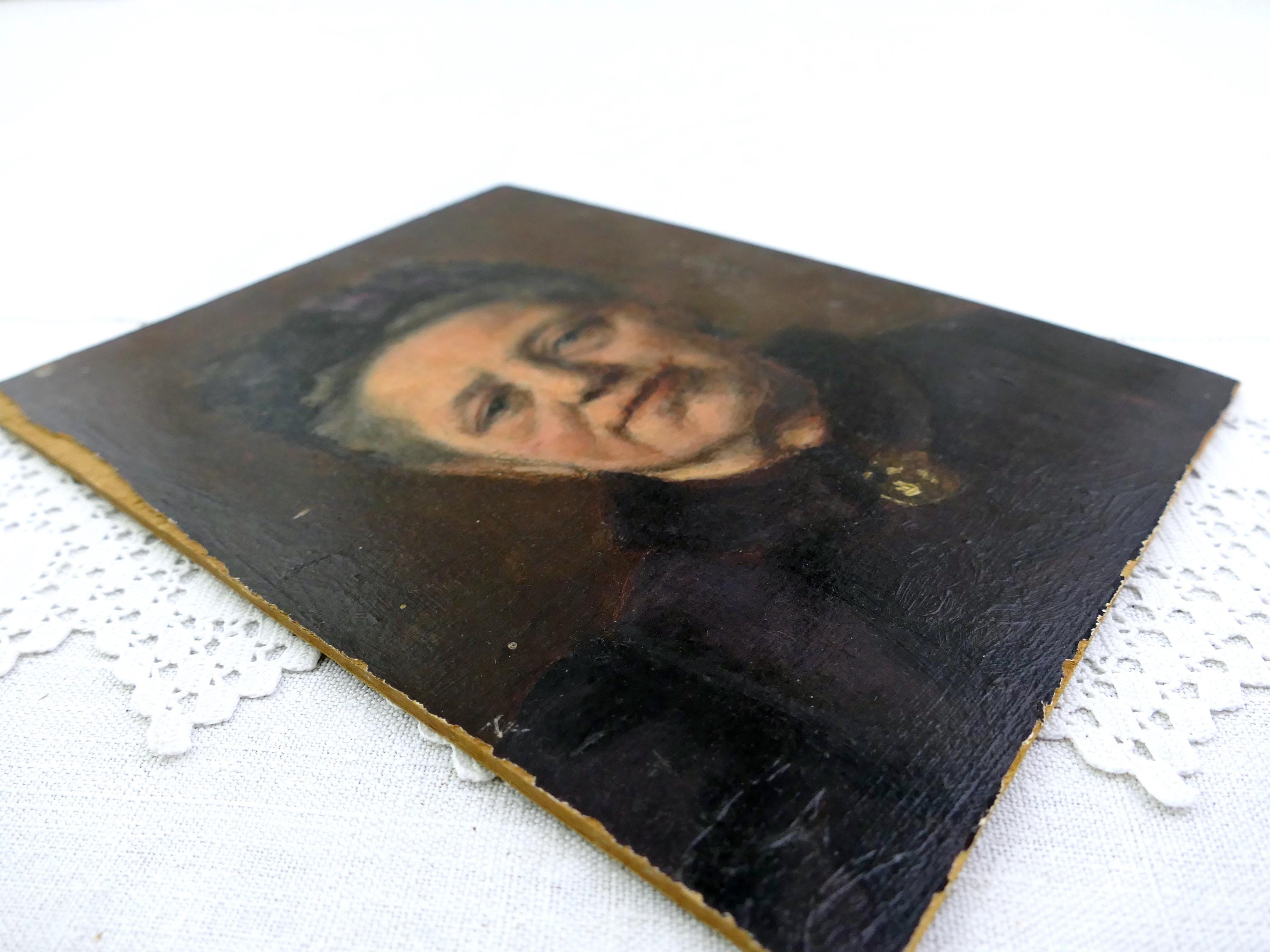 Antique French oil painting of old woman, signed by the artist. Made of oil paint on art board. Ca 1800s.