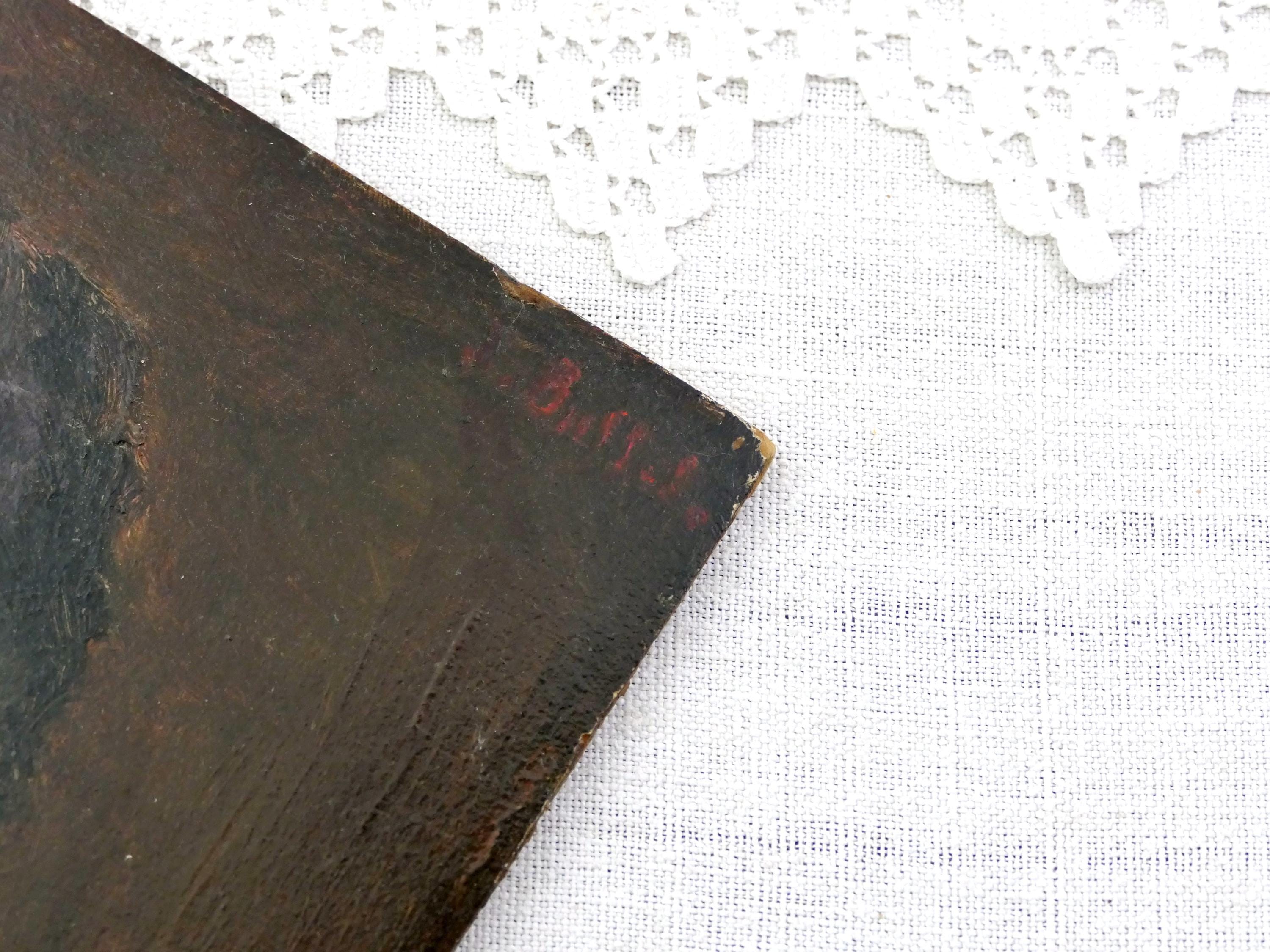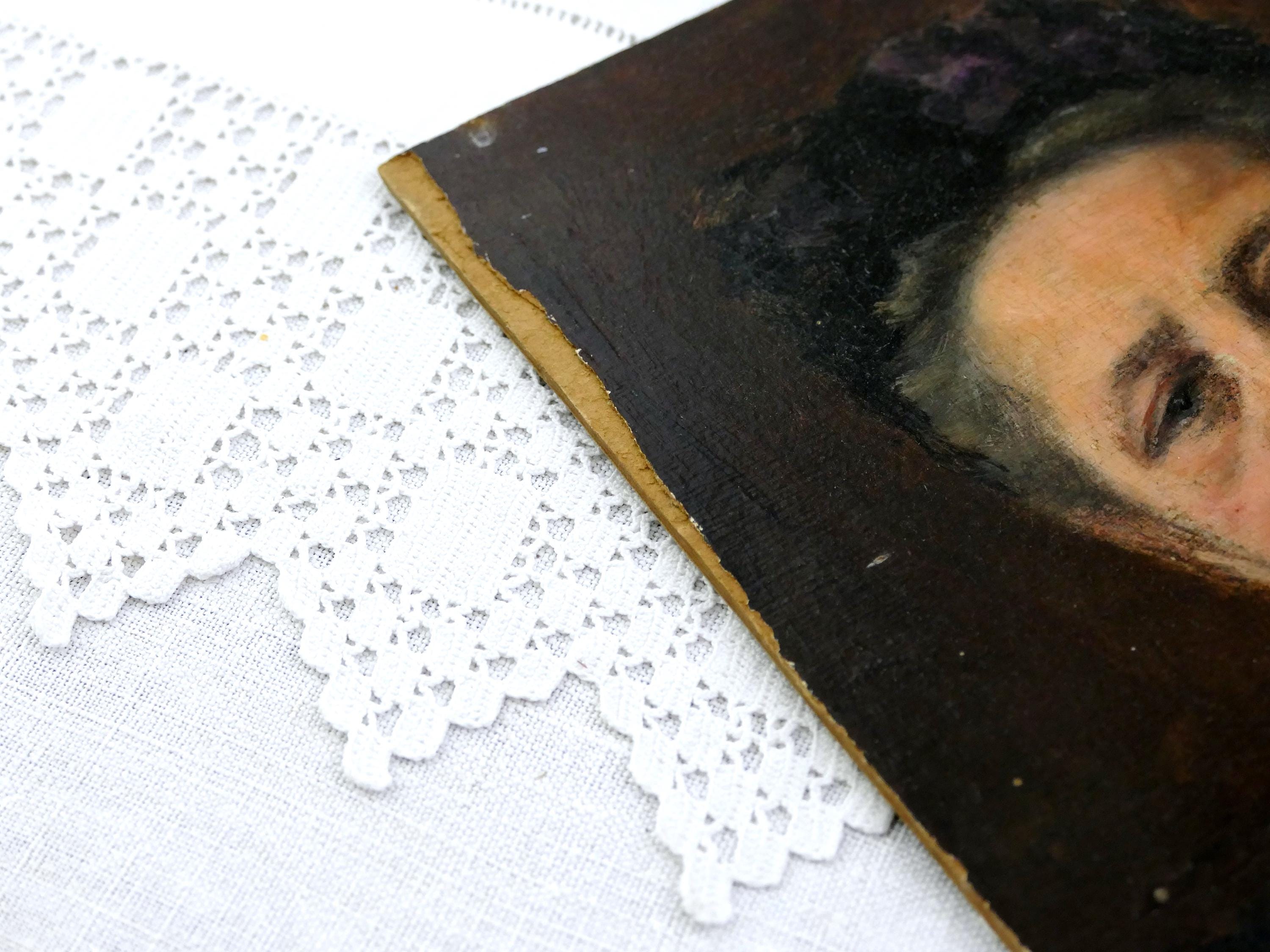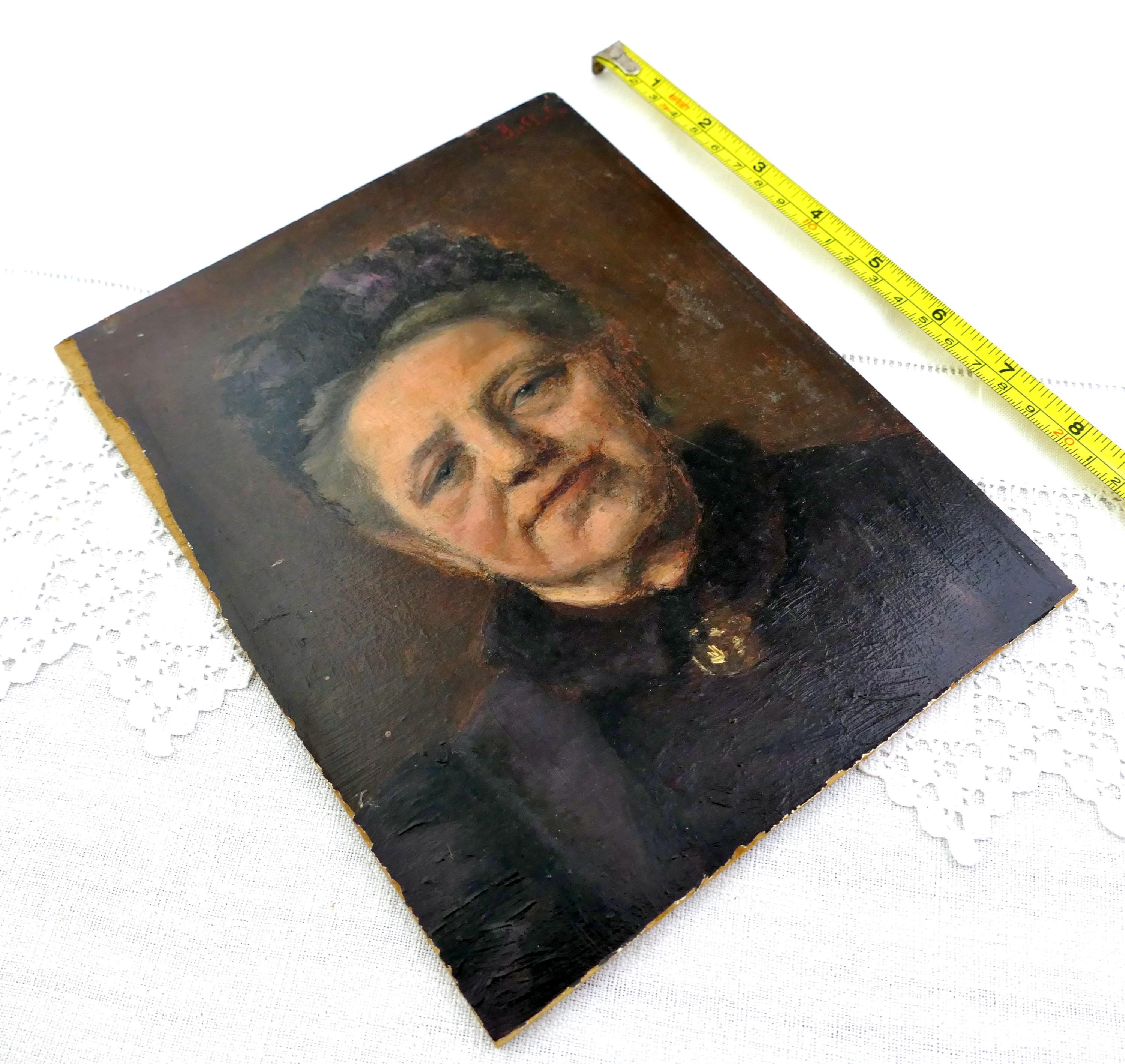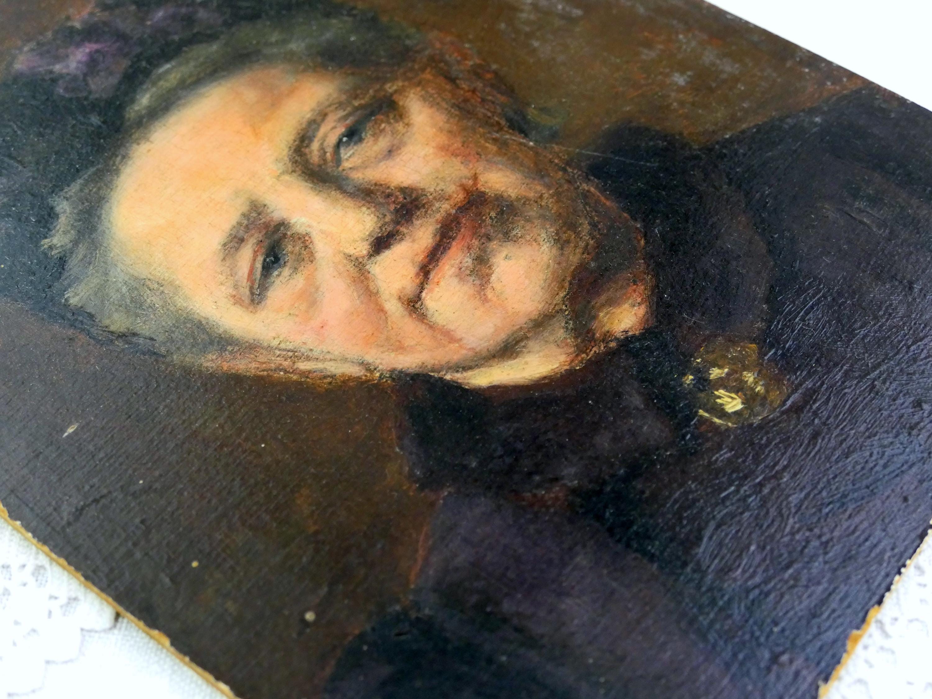 Antique French oil painting of old woman, signed by the artist. Made of oil paint on art board. Ca 1800s.