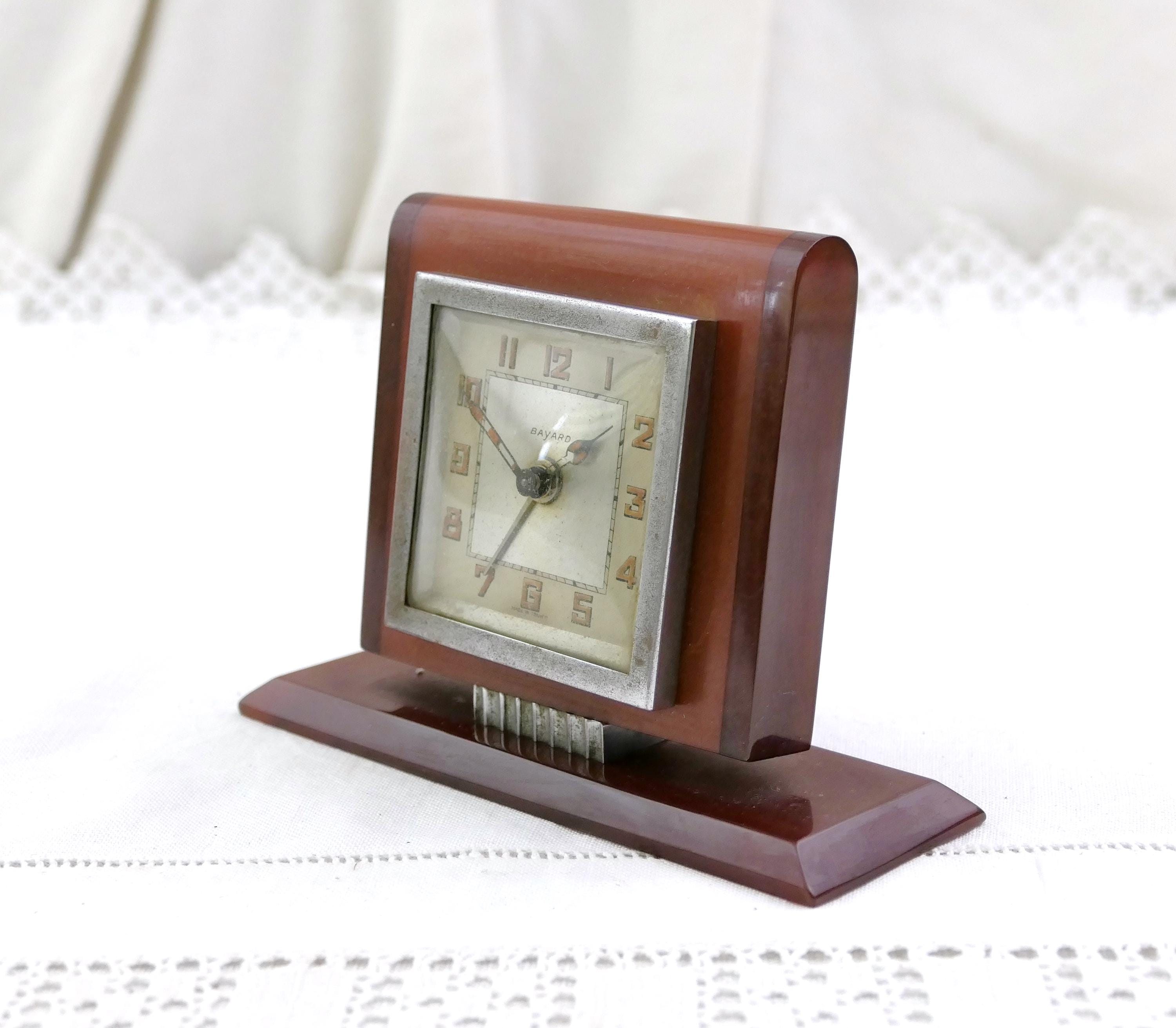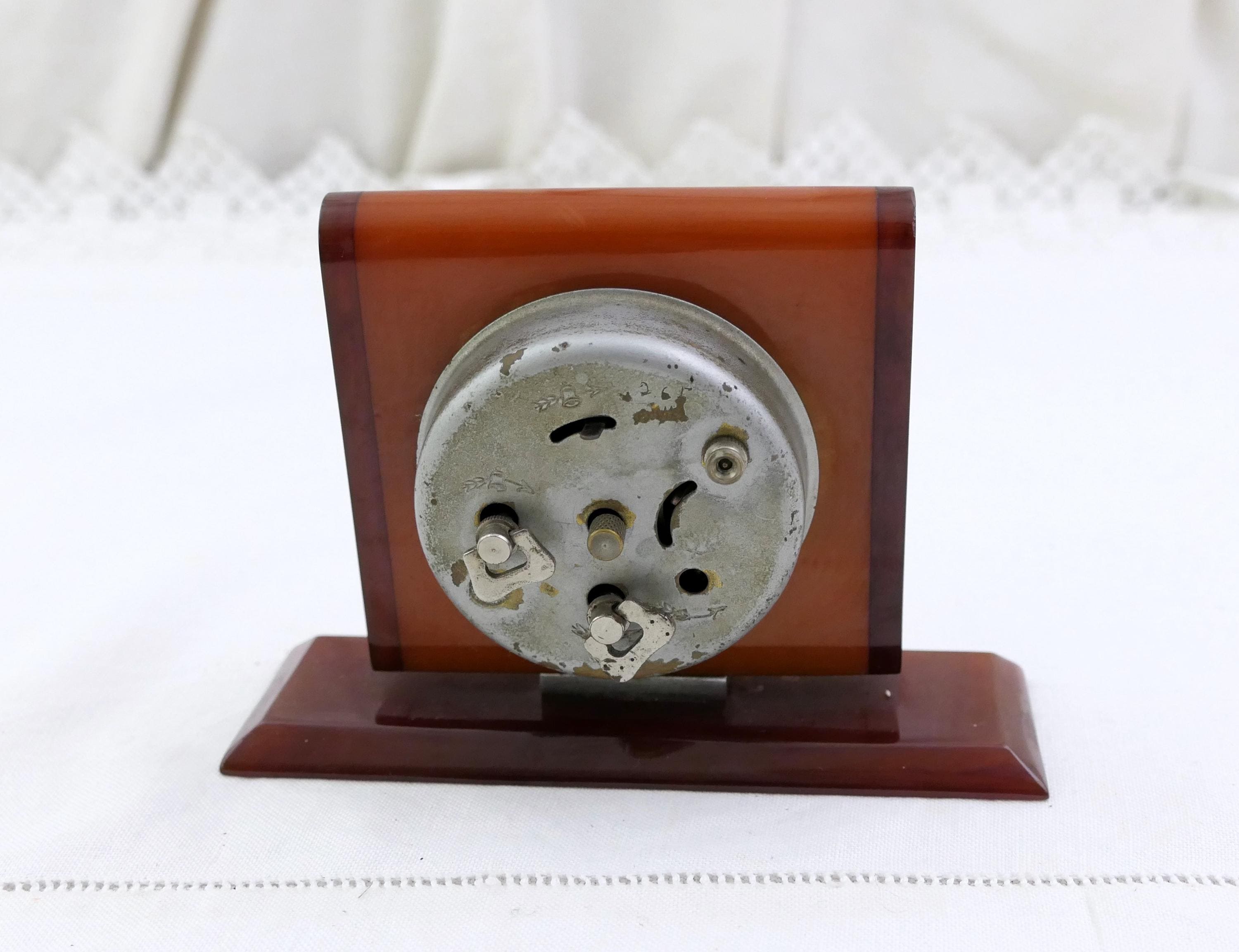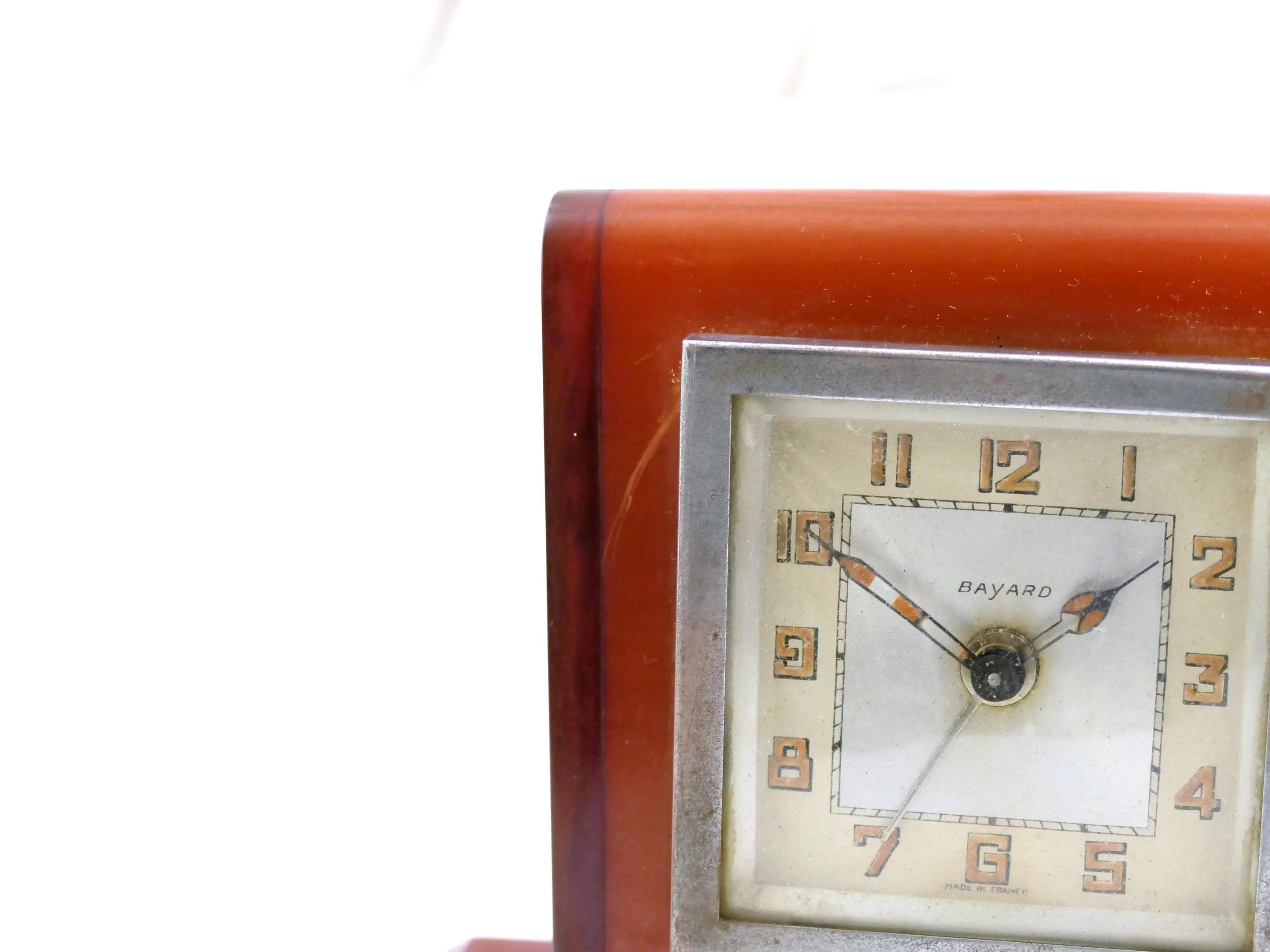Antique Art Deco apple juice and root beer Bakelite alarm clock. Made by Bayard of Bakelite with metal clock.