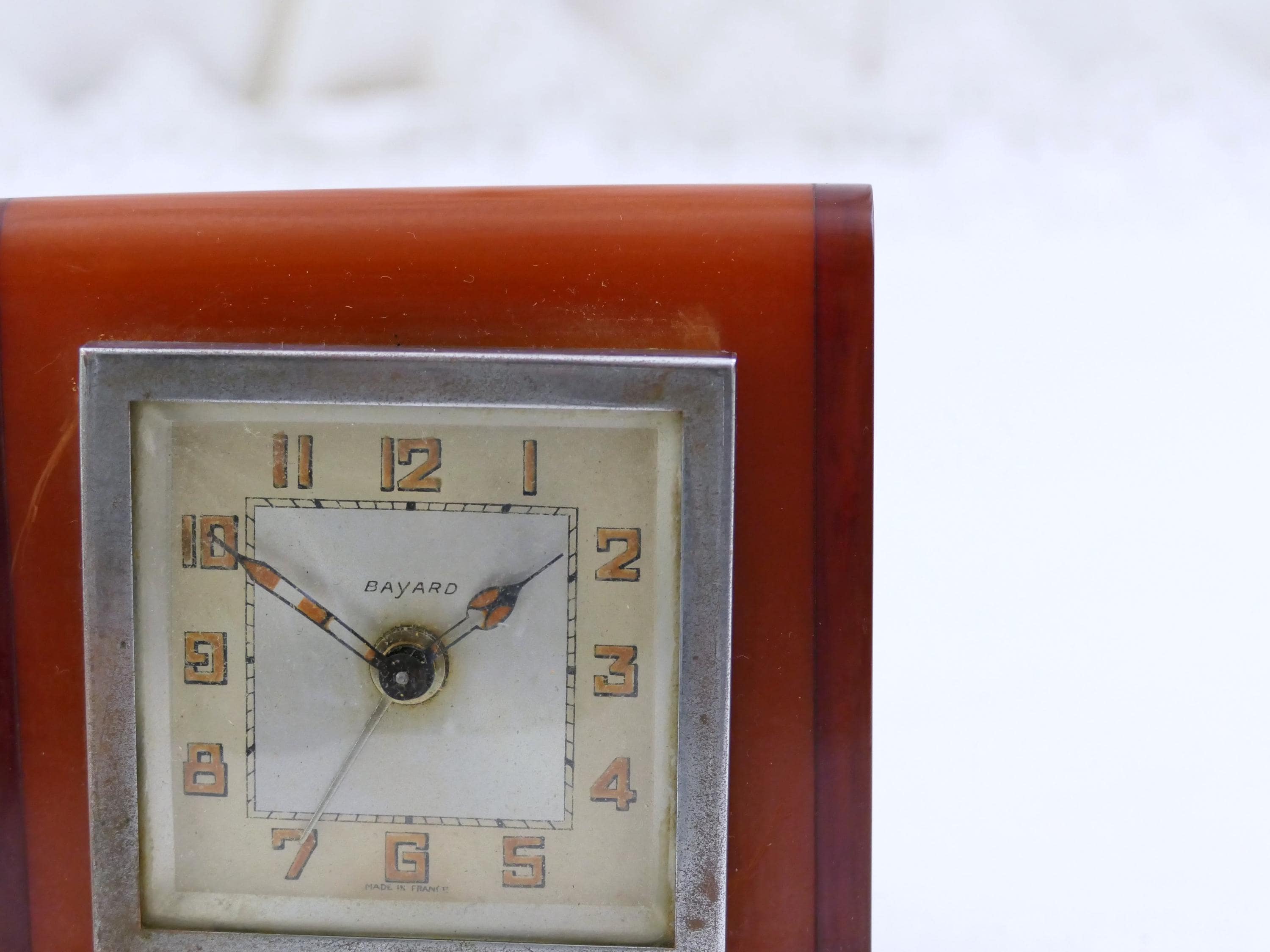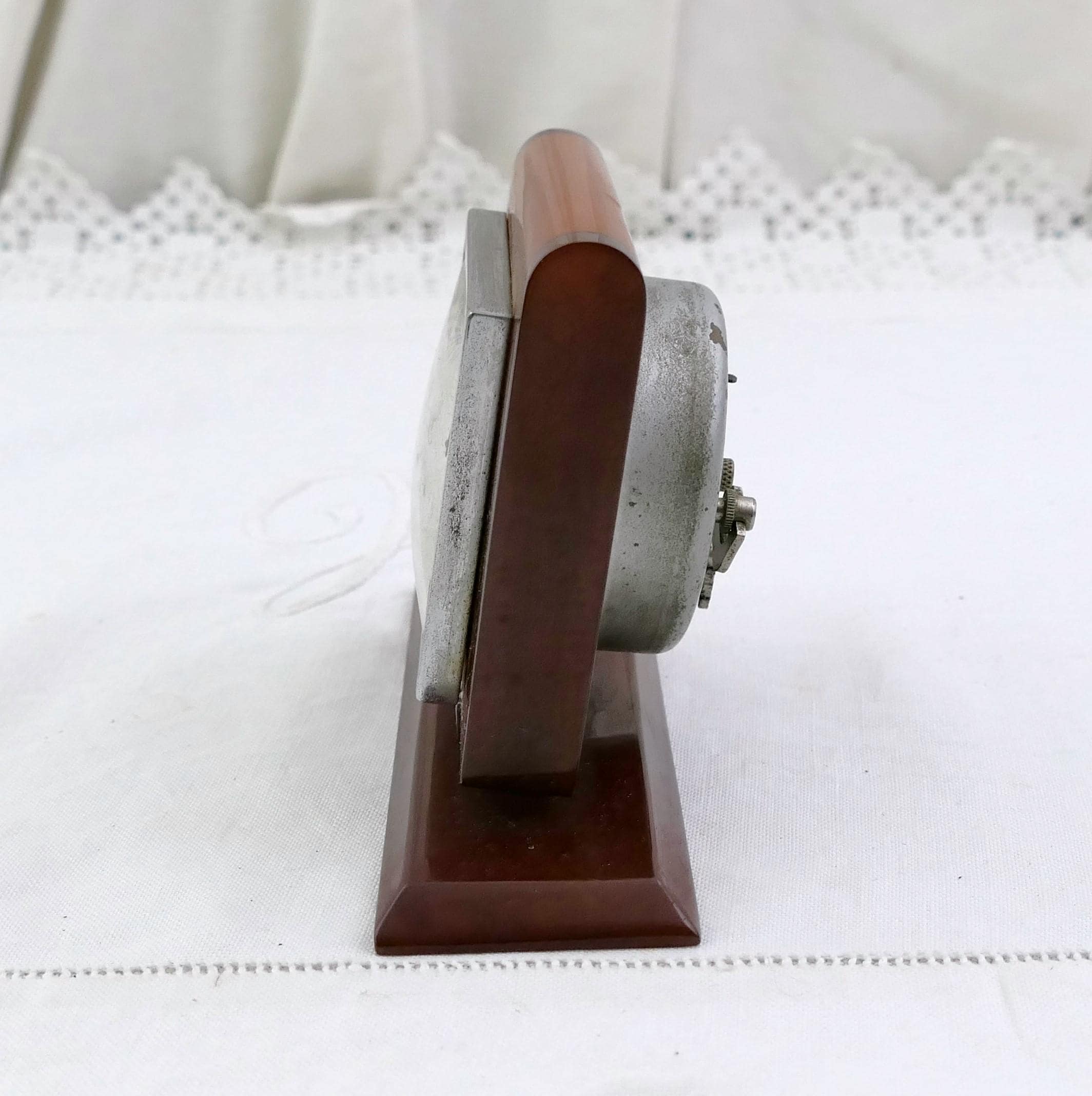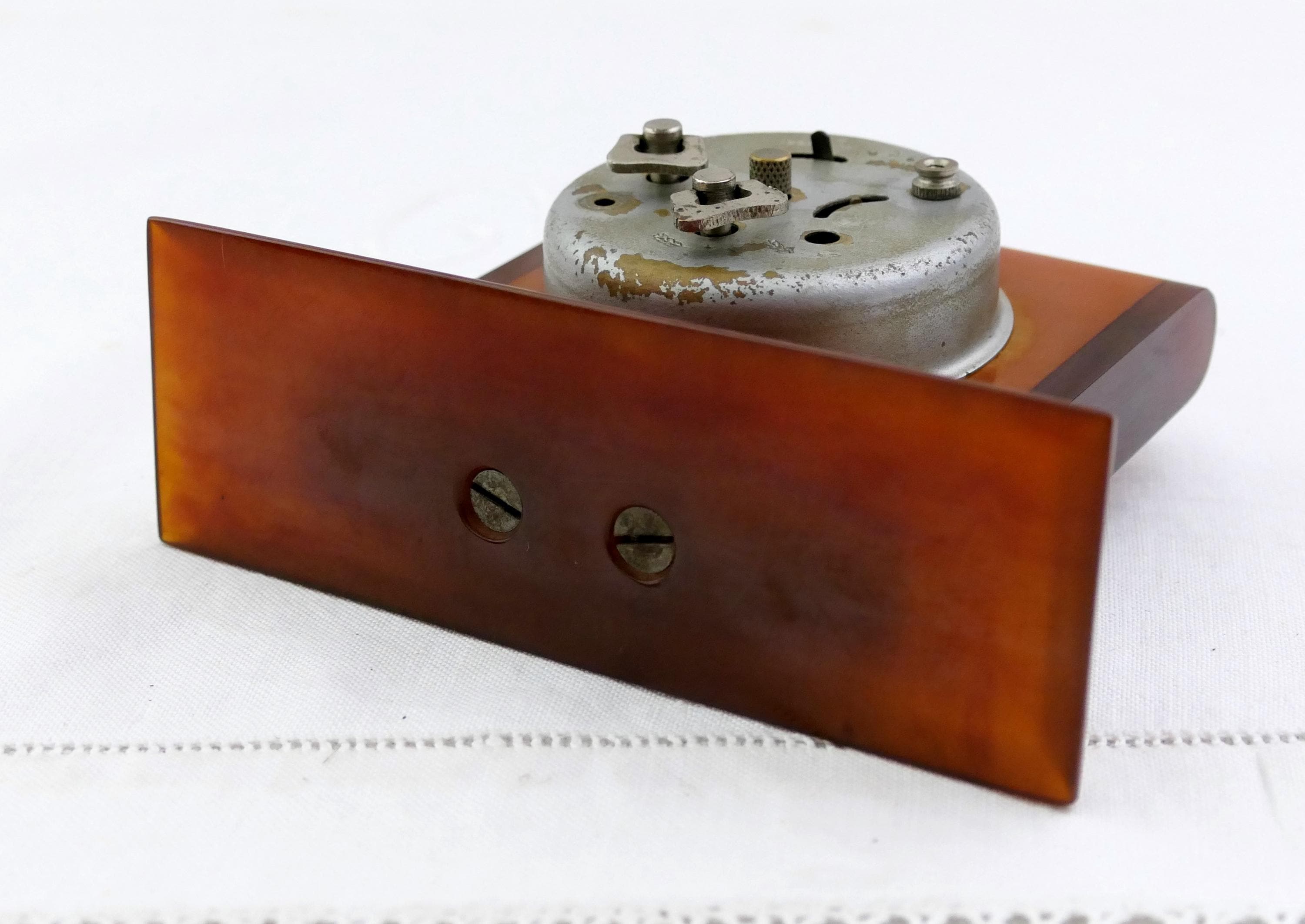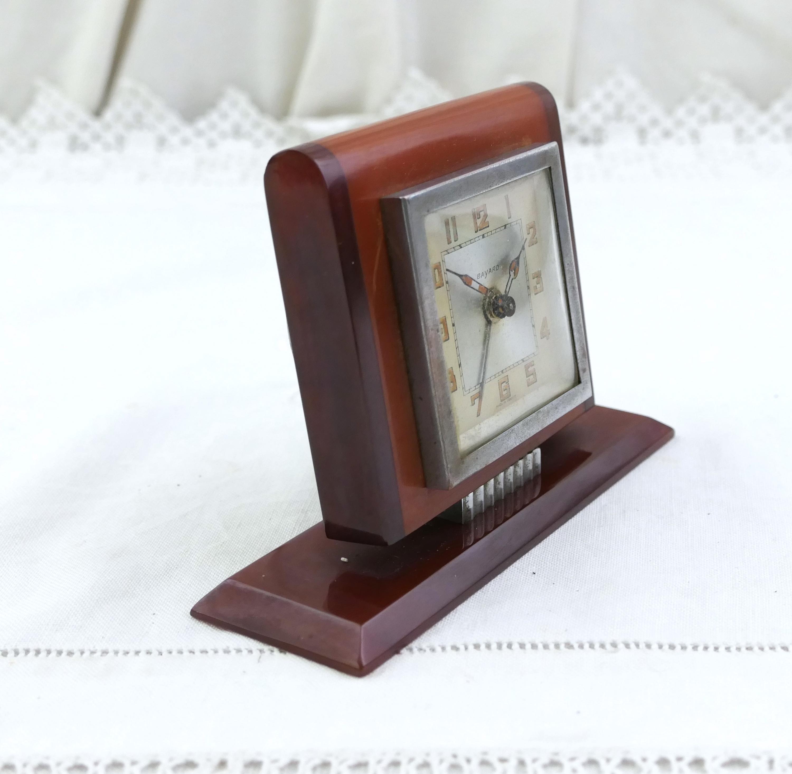 Antique Art Deco apple juice and root beer Bakelite alarm clock. Made by Bayard of Bakelite with metal clock.