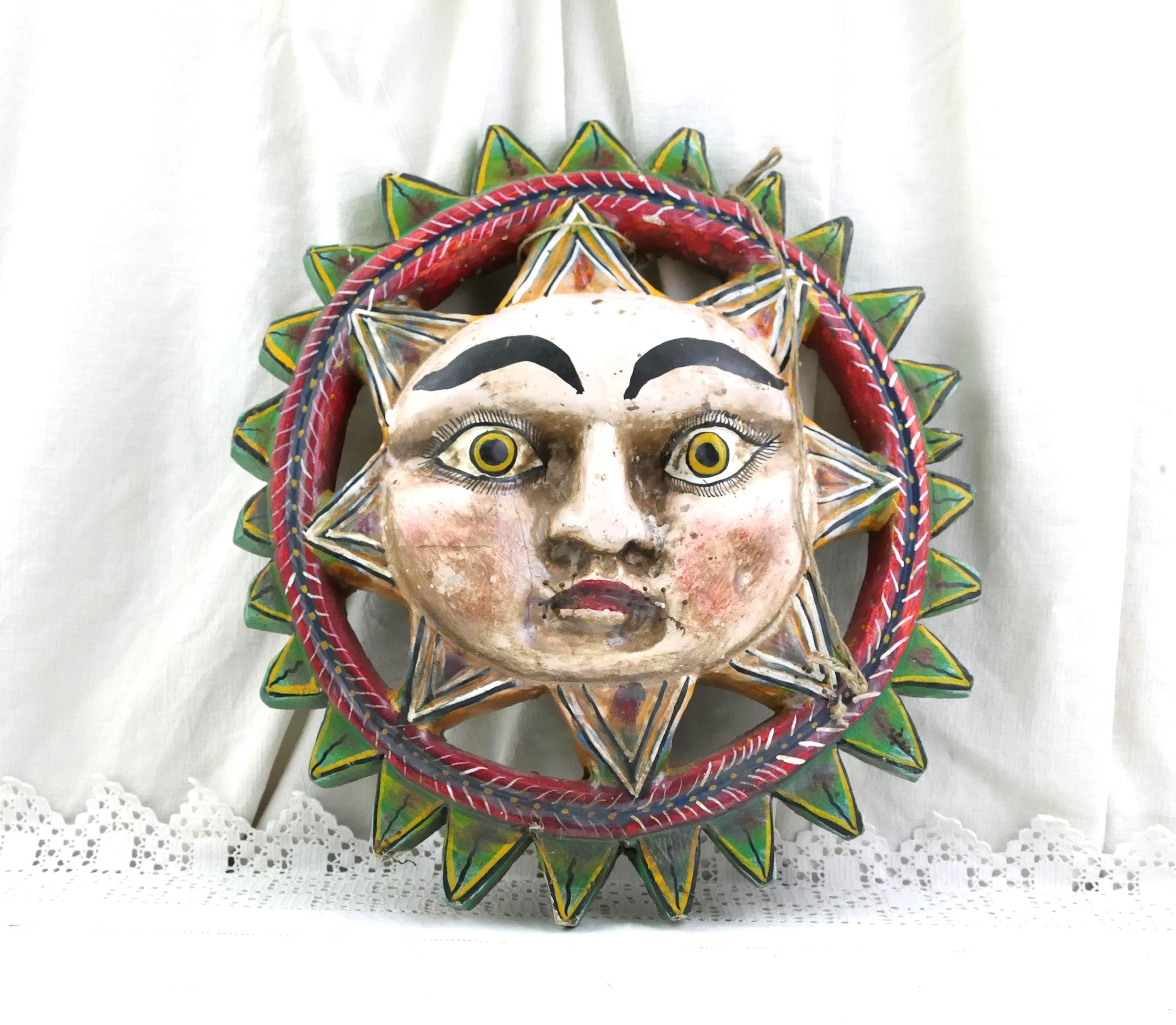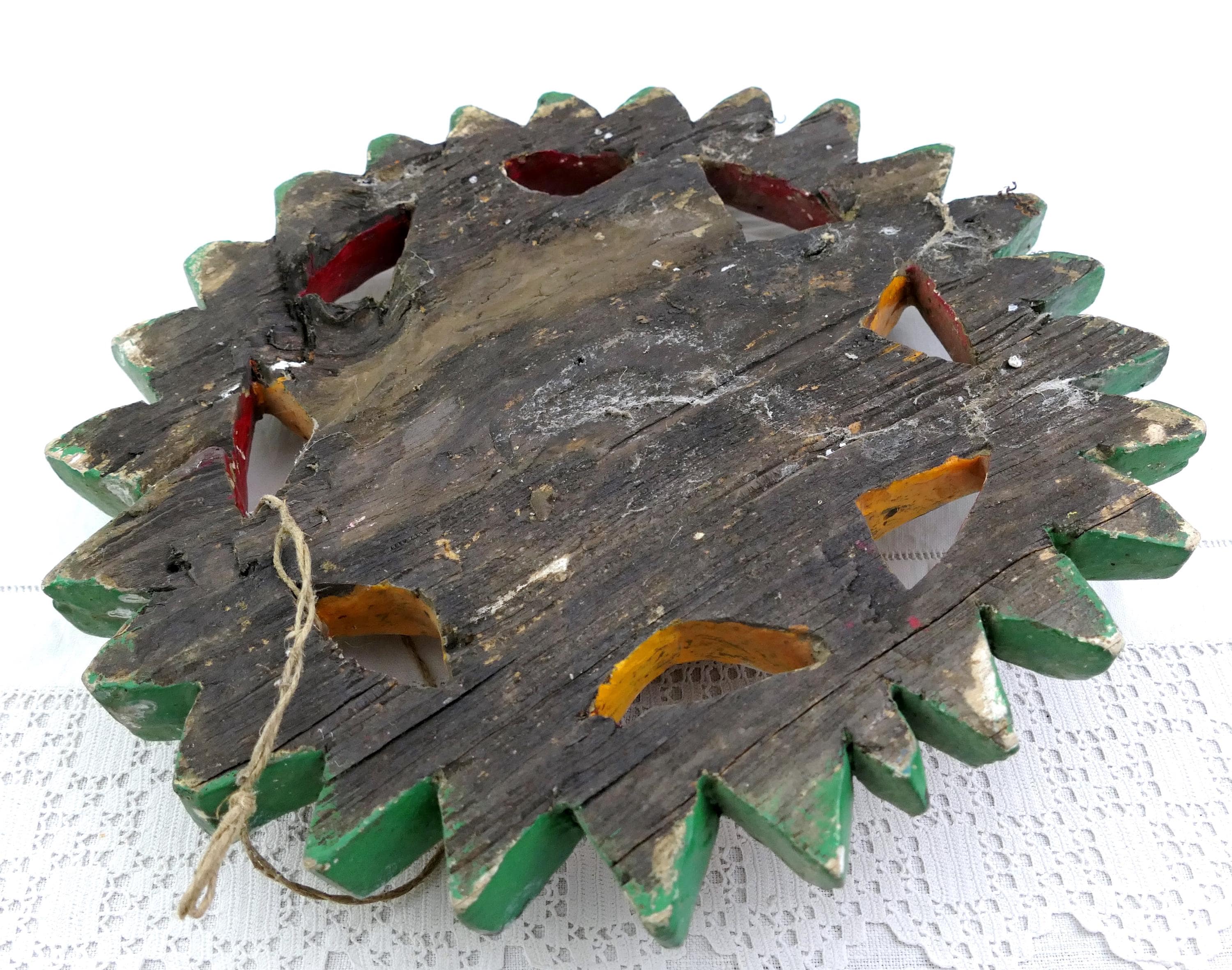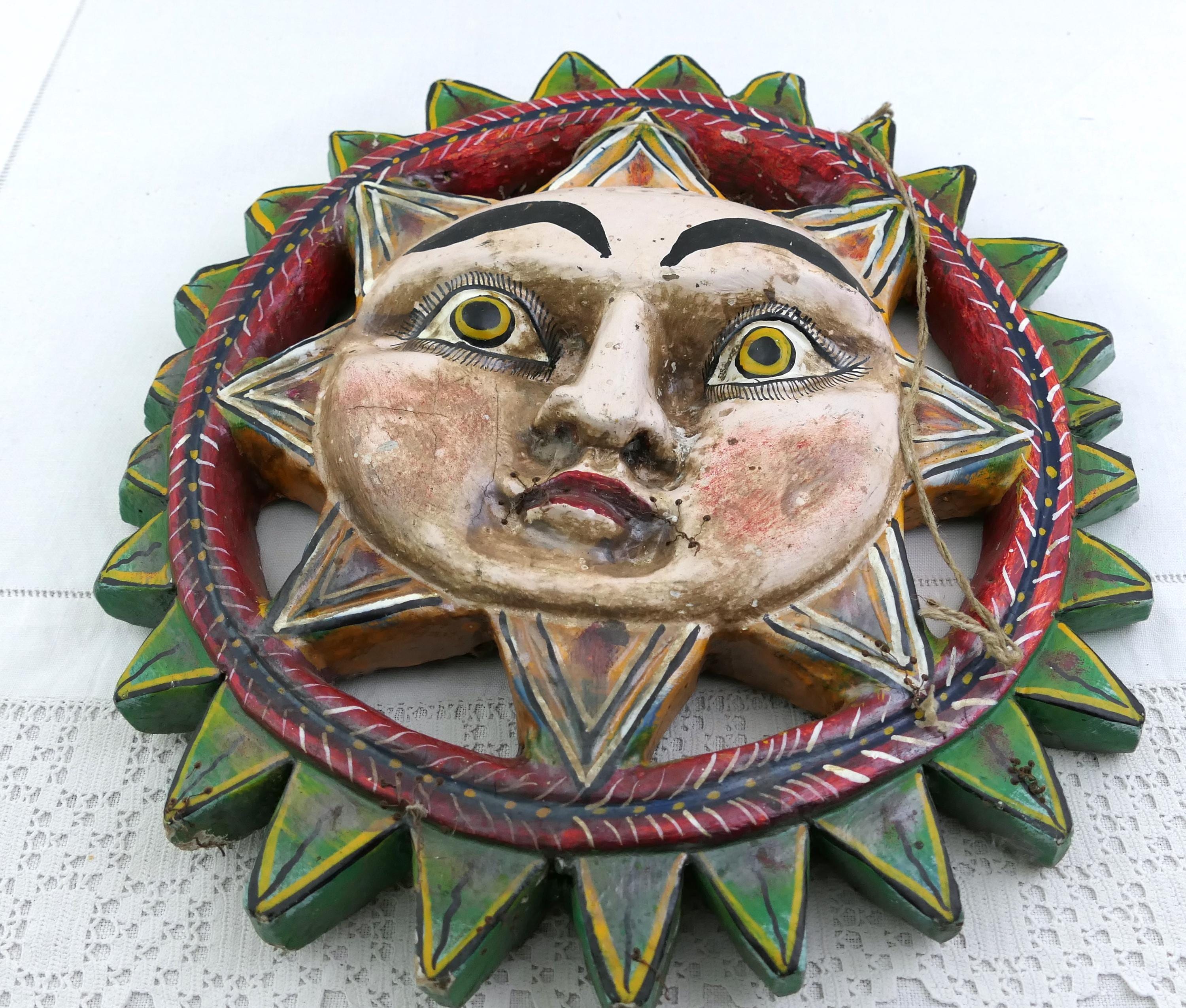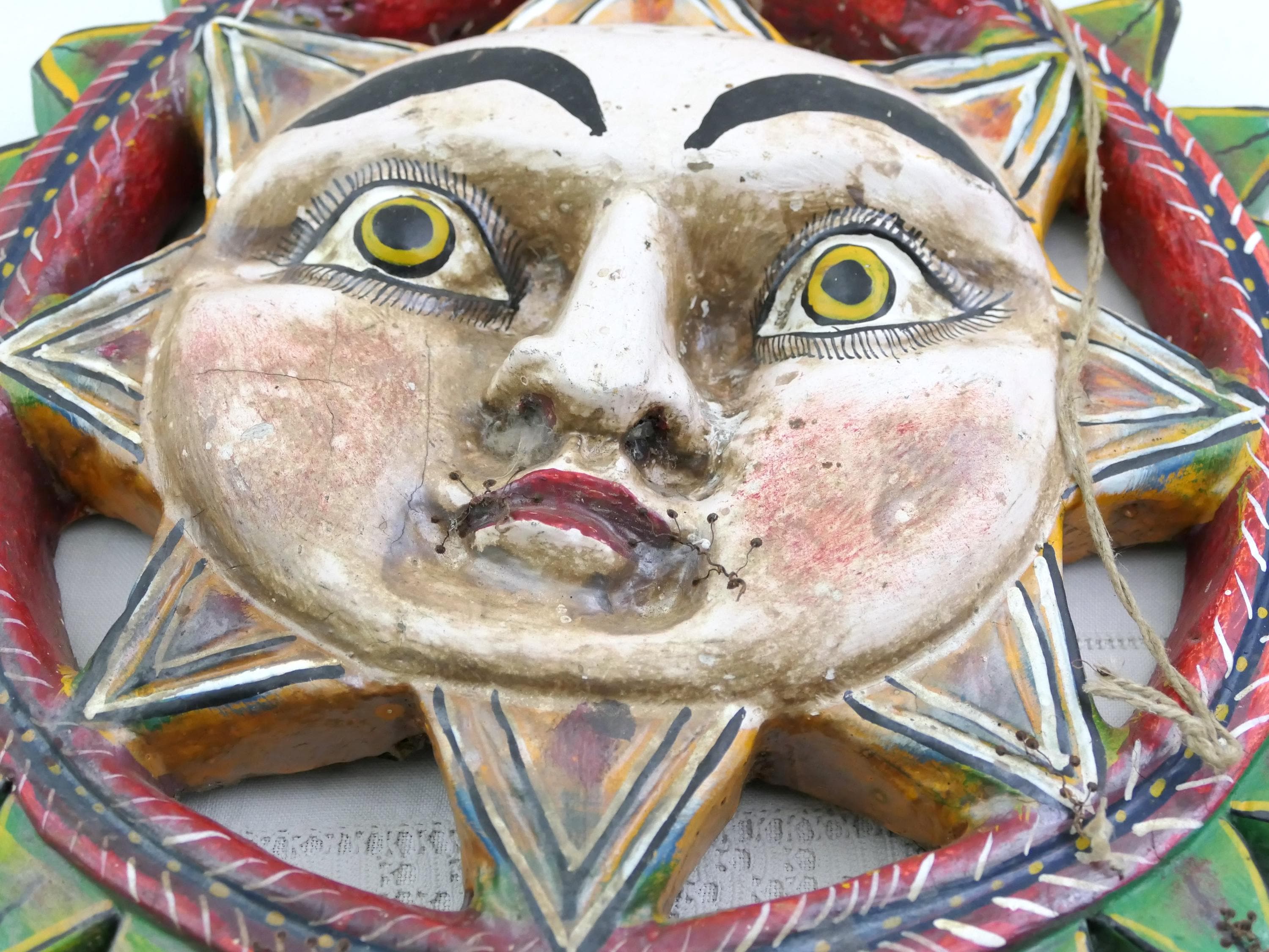 Vintage Mexican sun mask. Made of colorful lacquered hand carved wood. Ca 1900s.