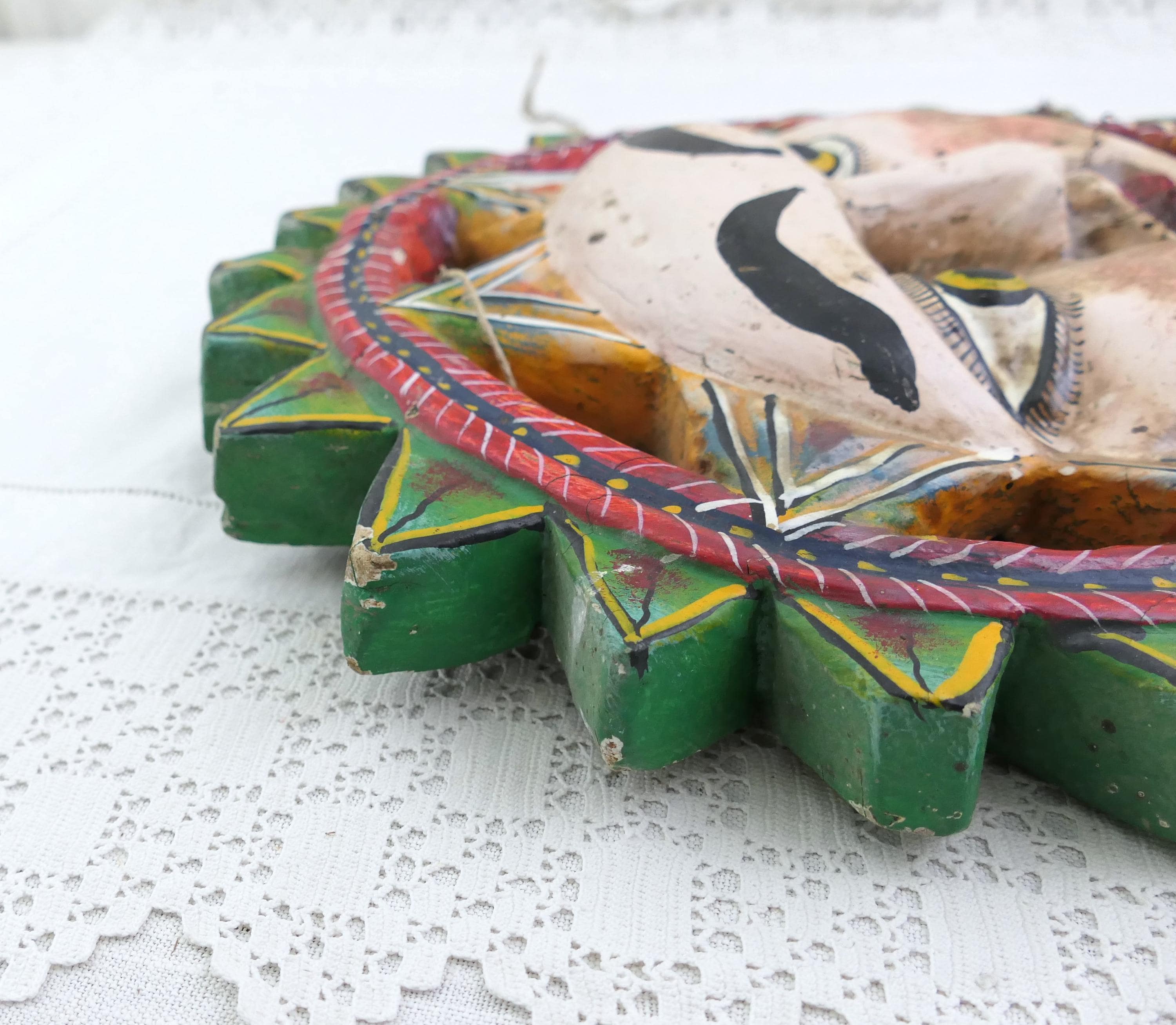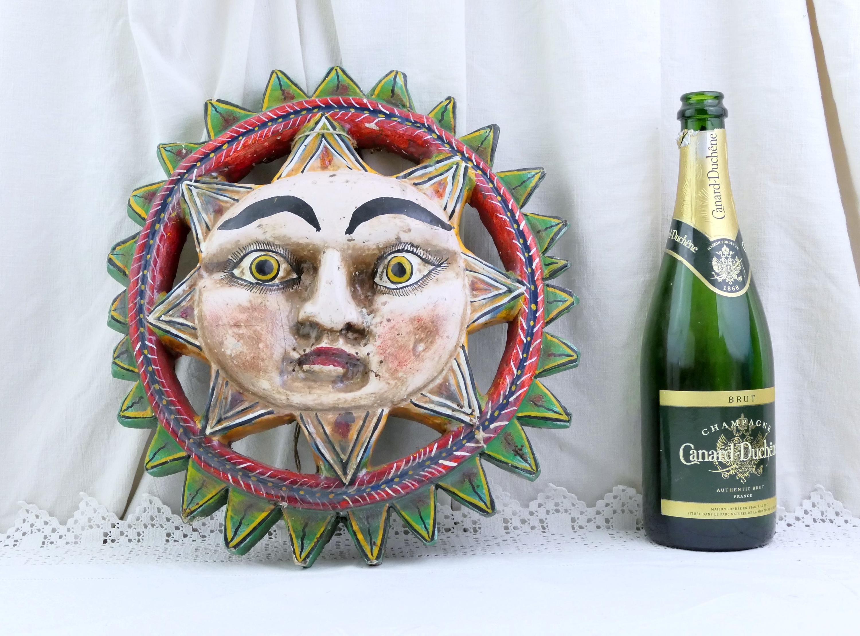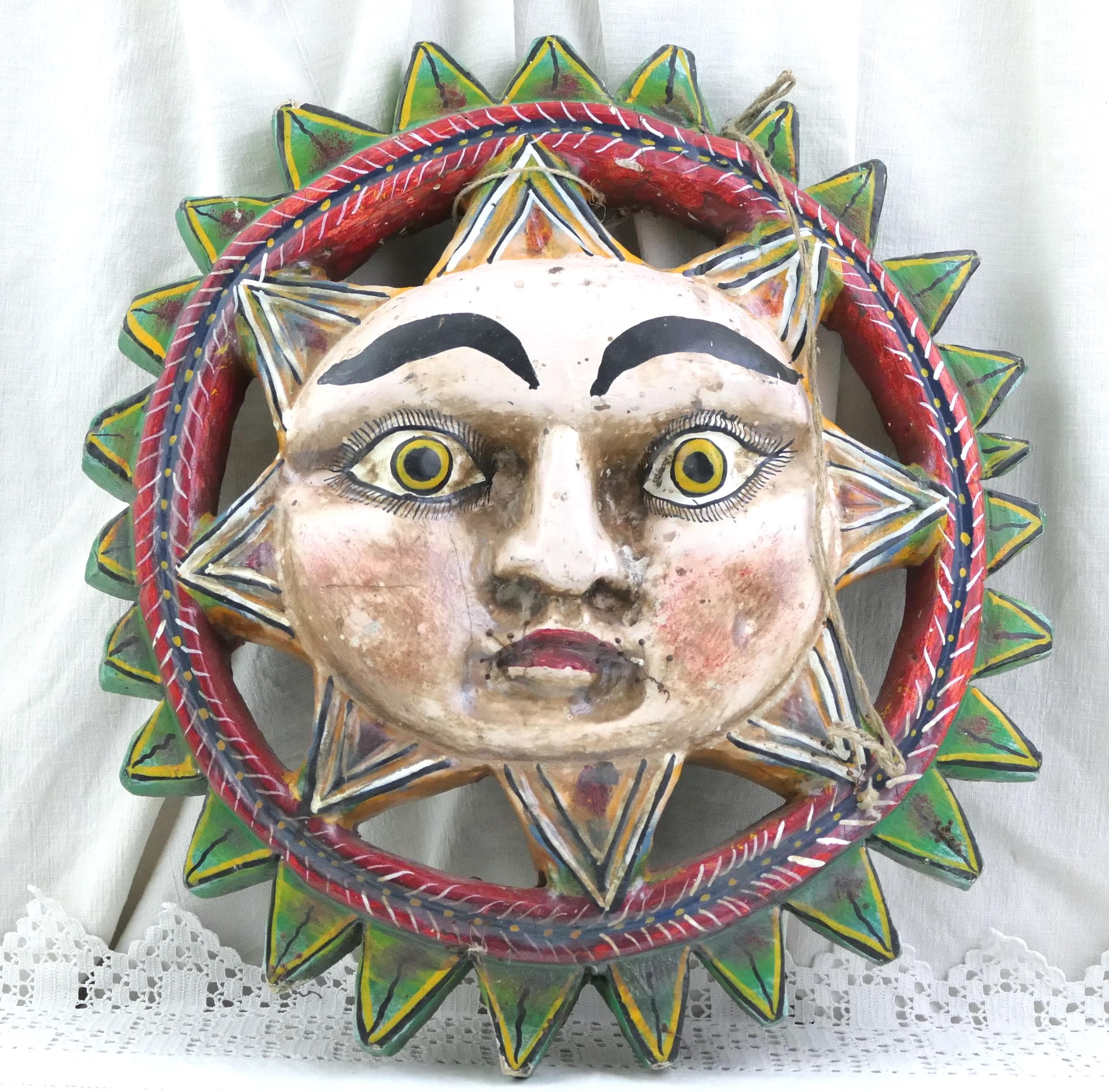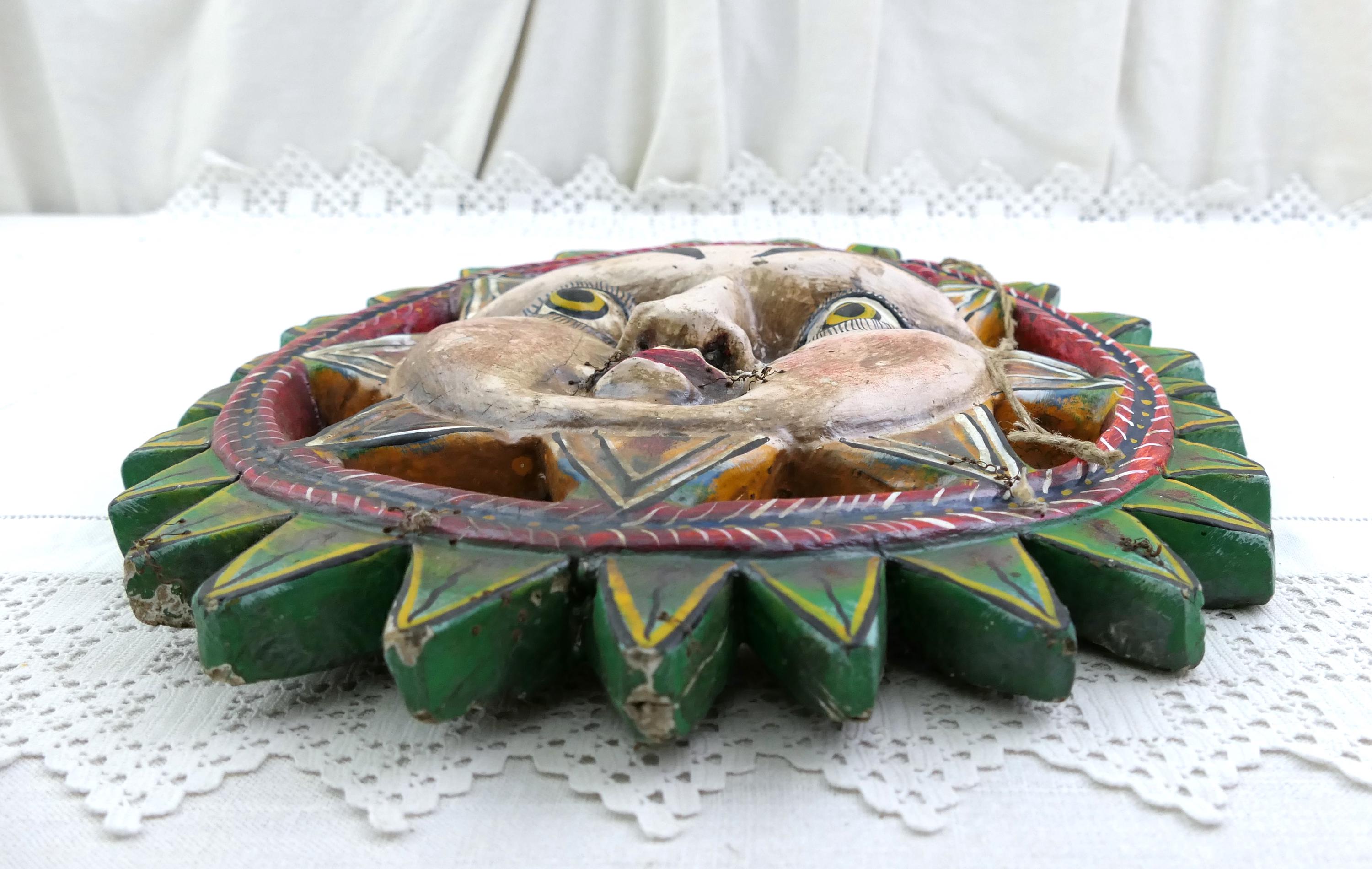 Vintage Mexican sun mask. Made of colorful lacquered hand carved wood. Ca 1900s.