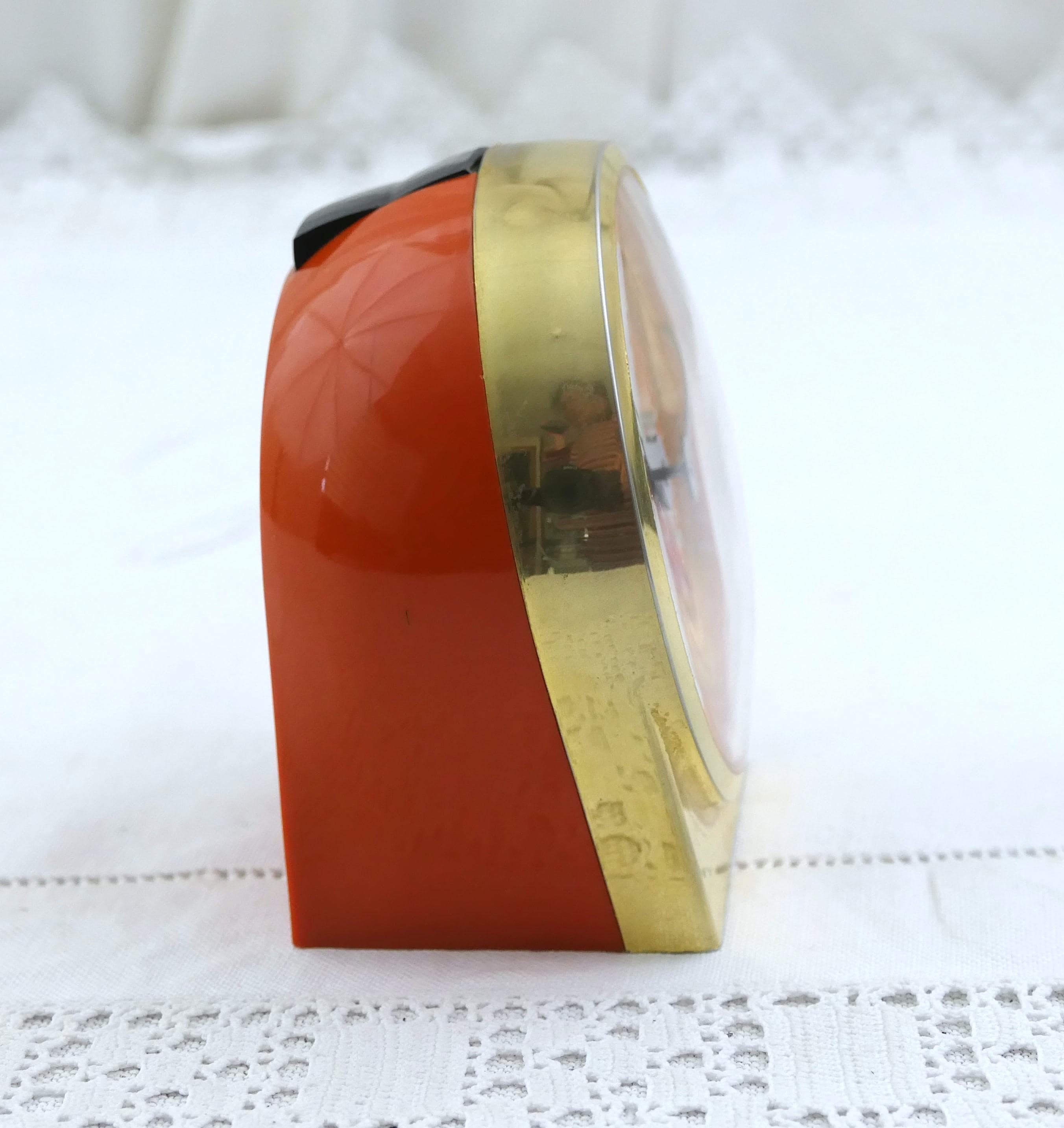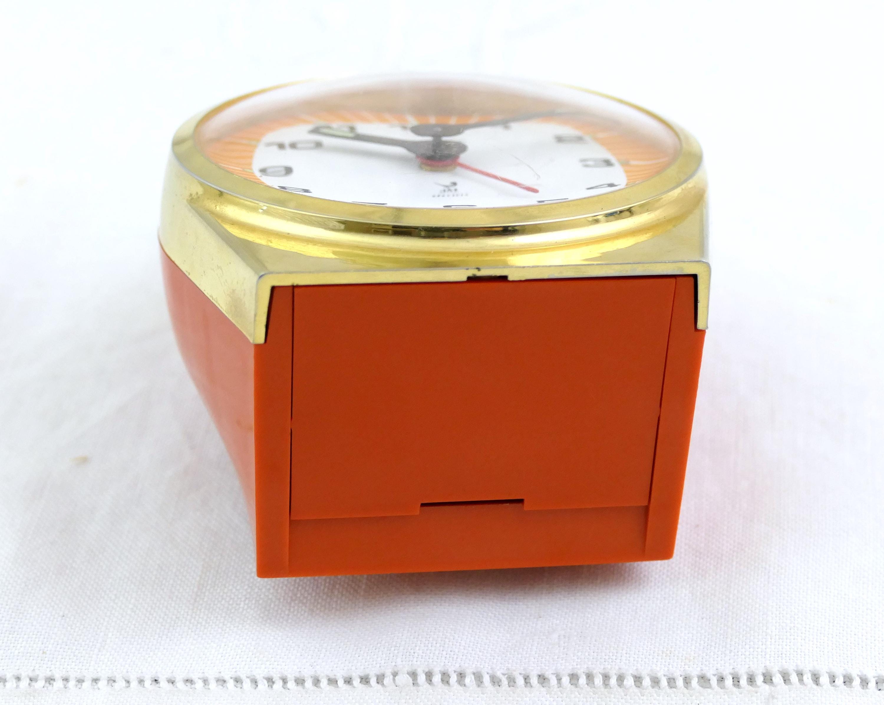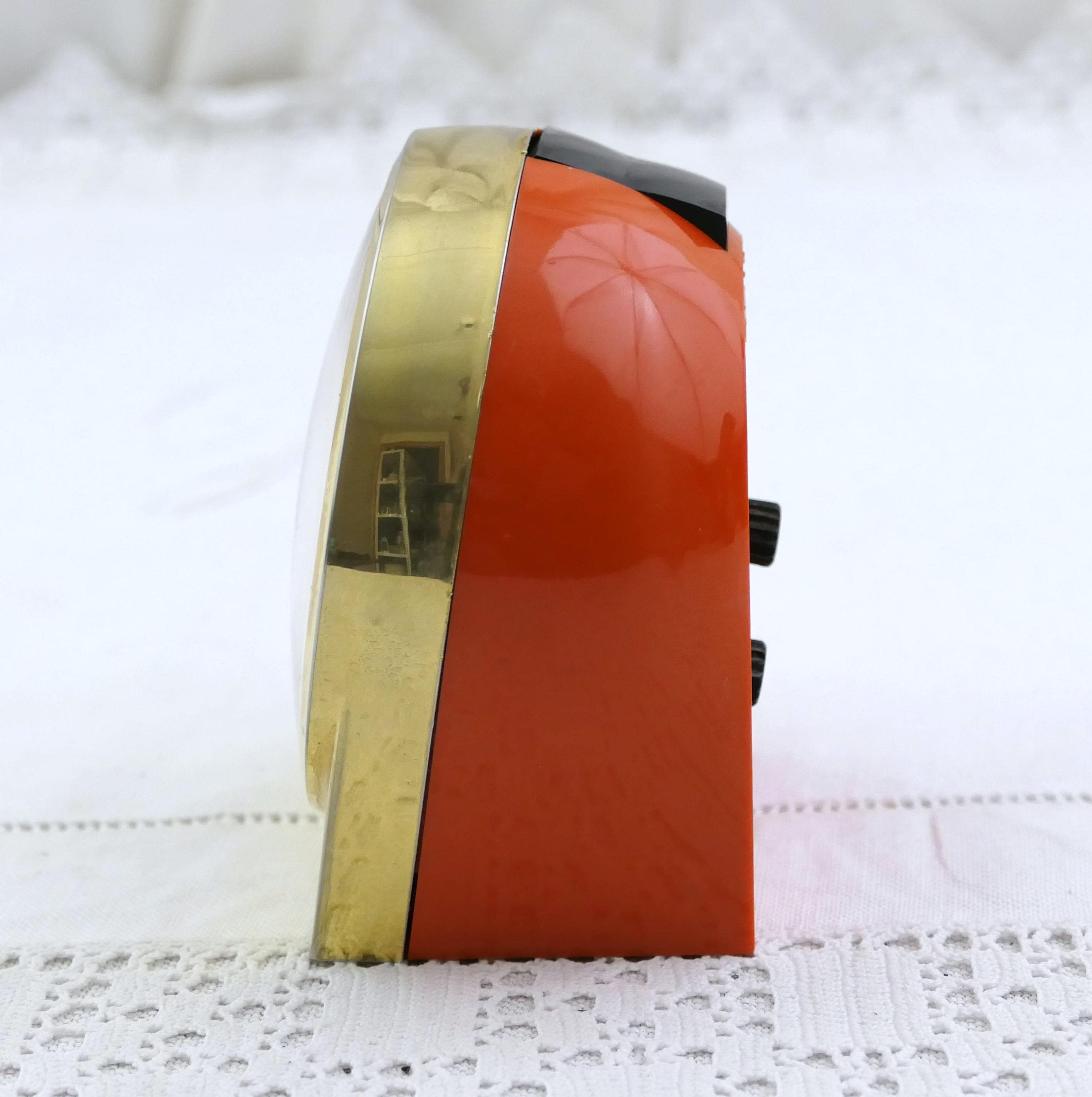 Vintage Mid Century French battery alarm clock clock. Made in France by Jaz of bright orange and gold plastics Ca 1960s.