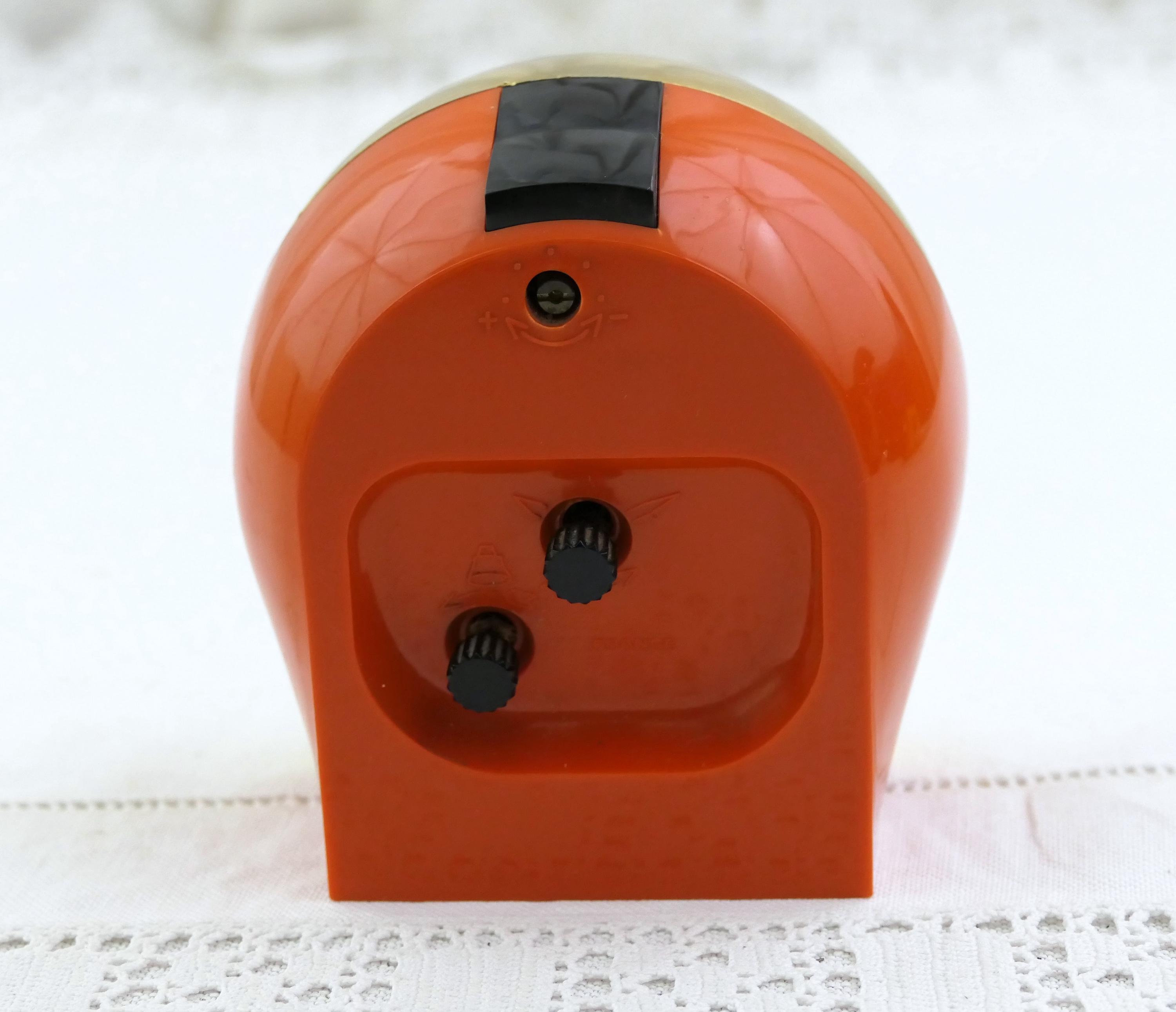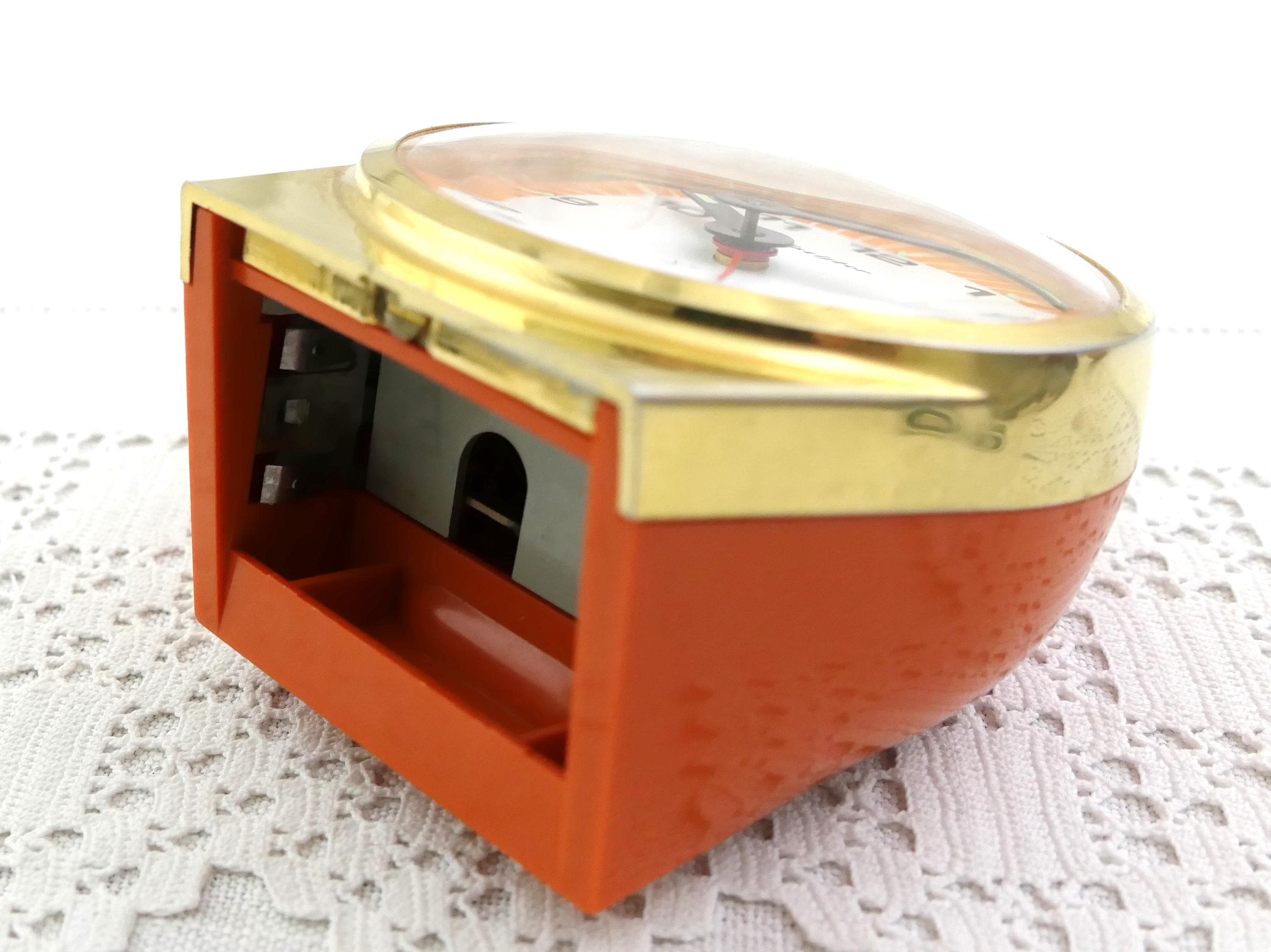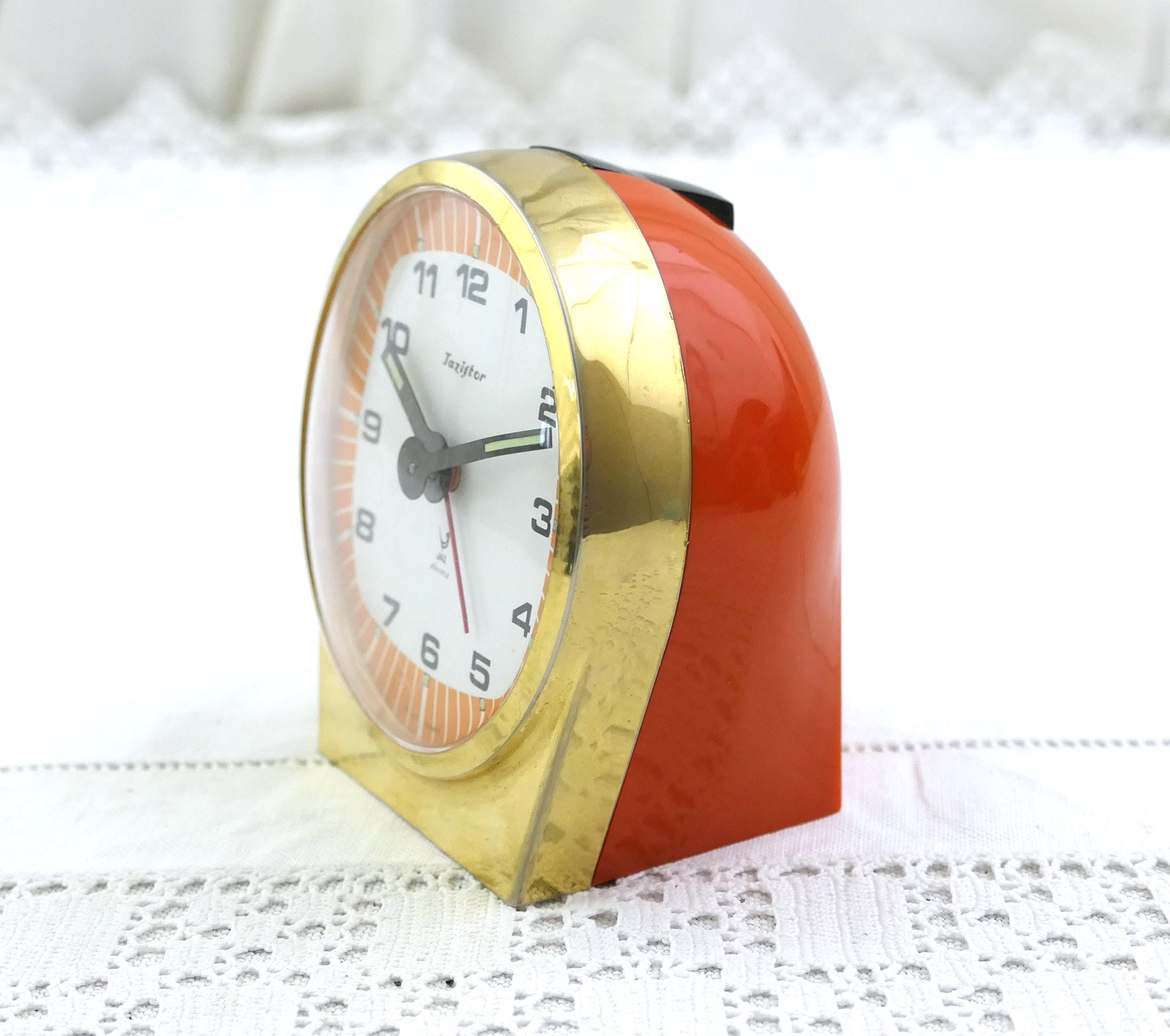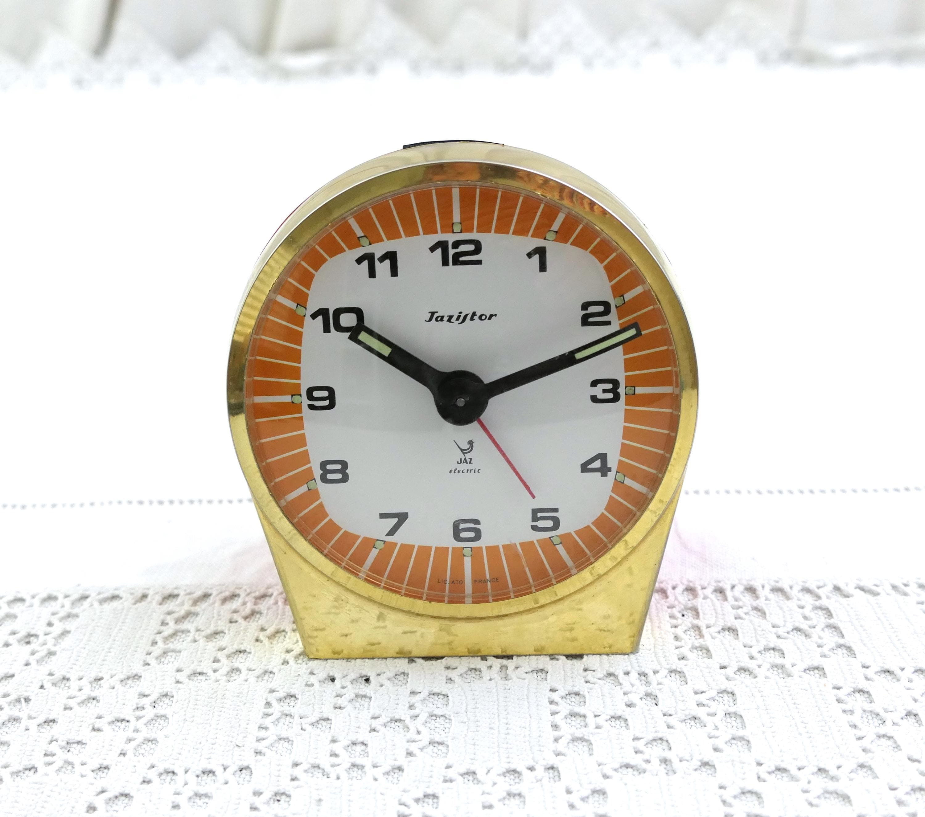 Vintage Mid Century French battery alarm clock clock. Made in France by Jaz of bright orange and gold plastics Ca 1960s.
