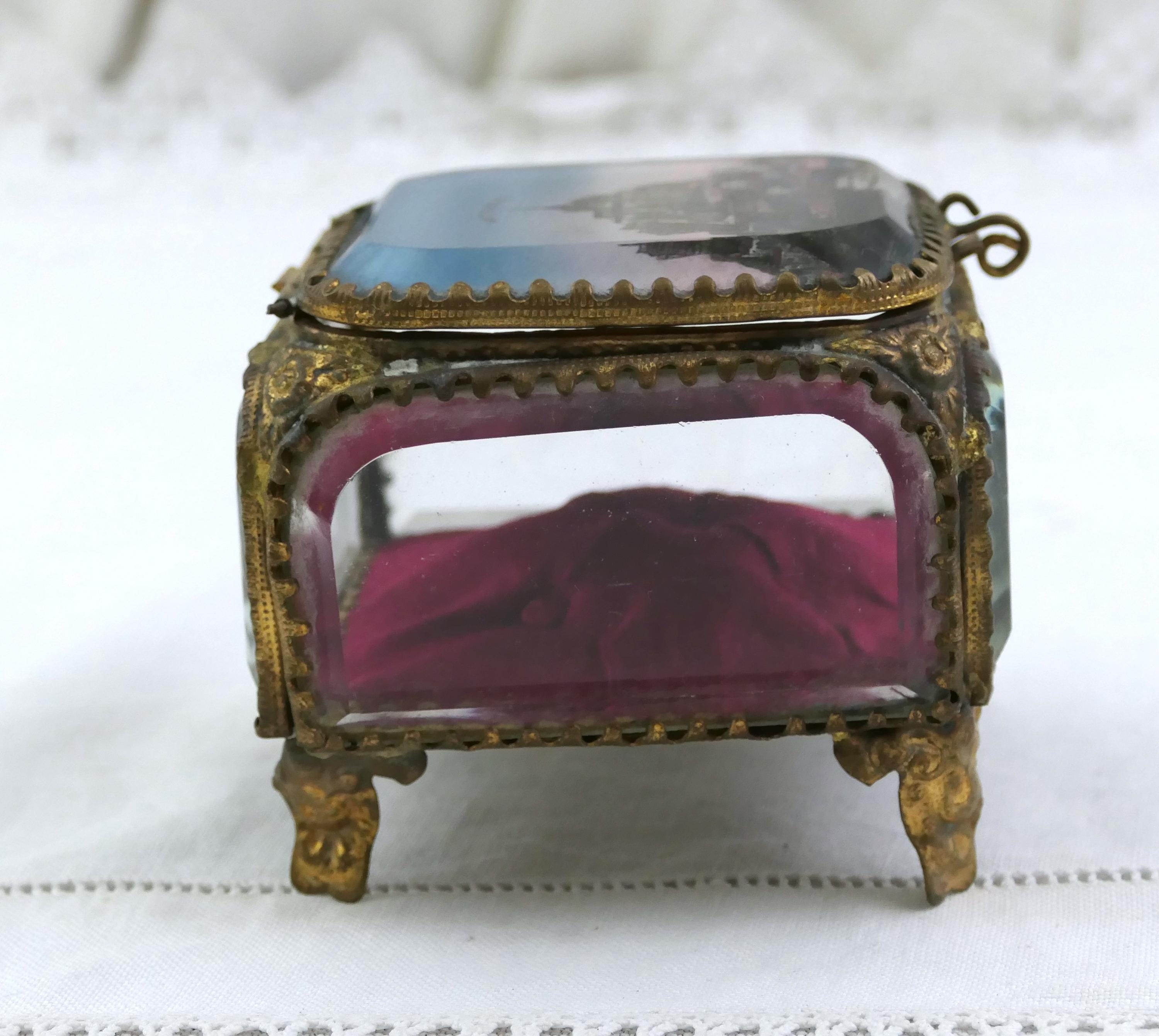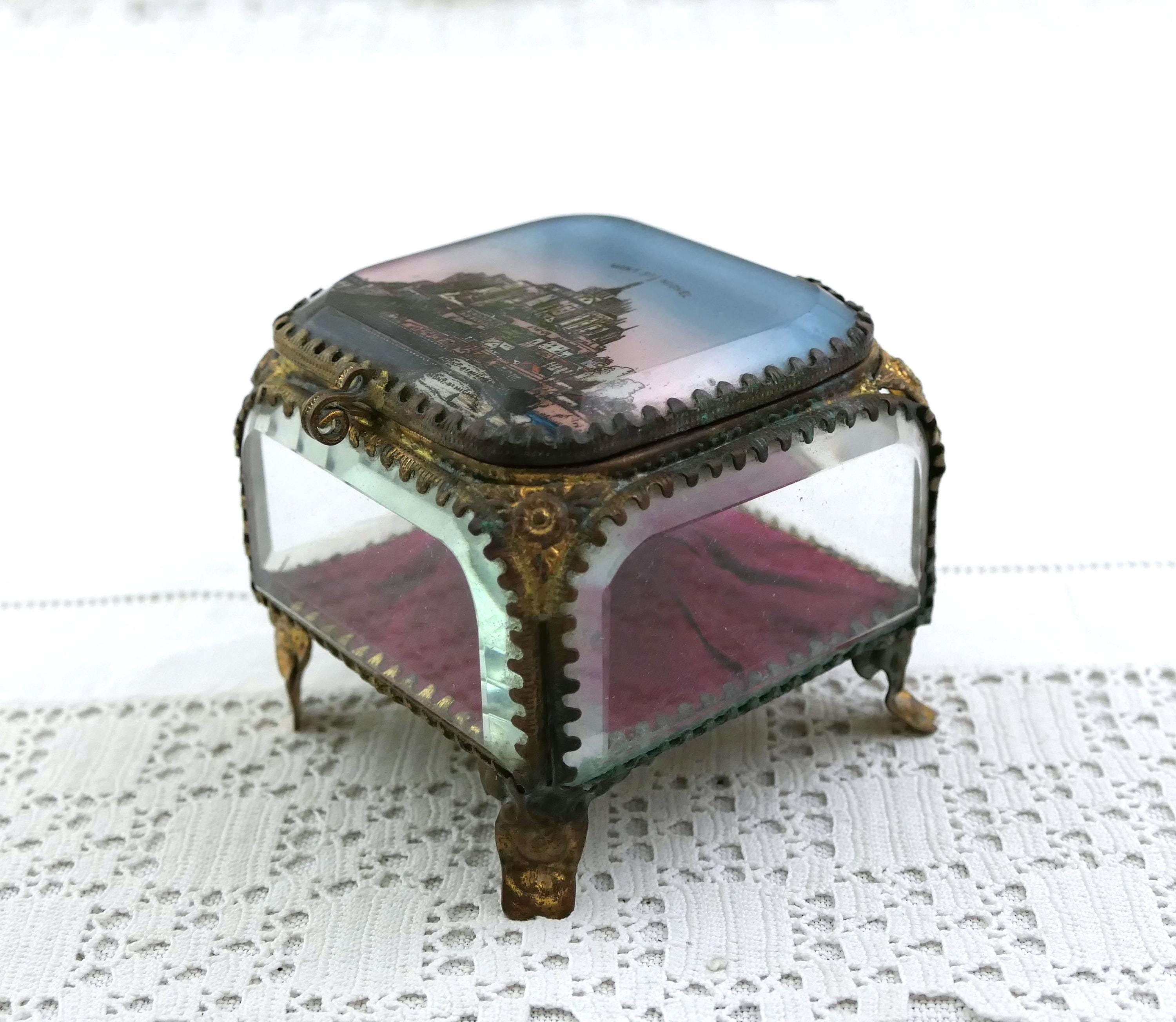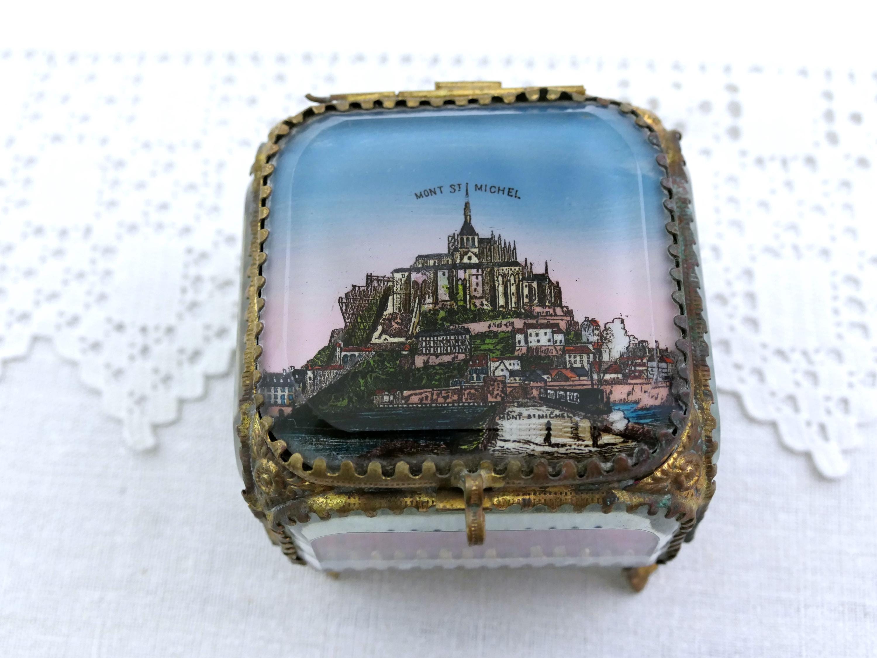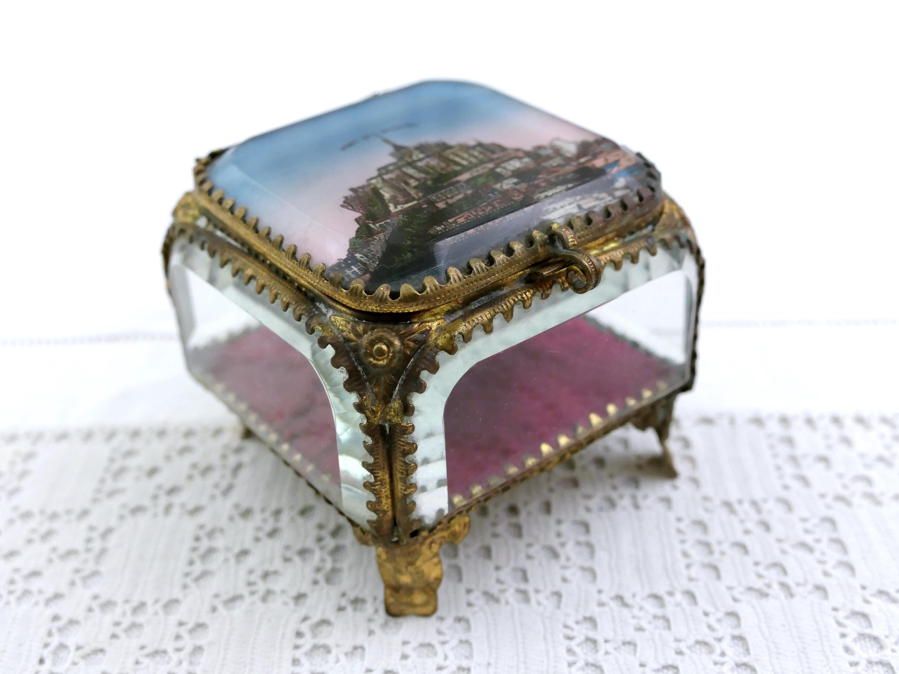 Antique souvenir jewelry box from the Mont Saint Michel. On the lid is a colored image of the Mont Sai nt Michel in Normandy. Made of beveled glass with red satin padded lining and gilded brass mounts. Ca mid to late 1800s.