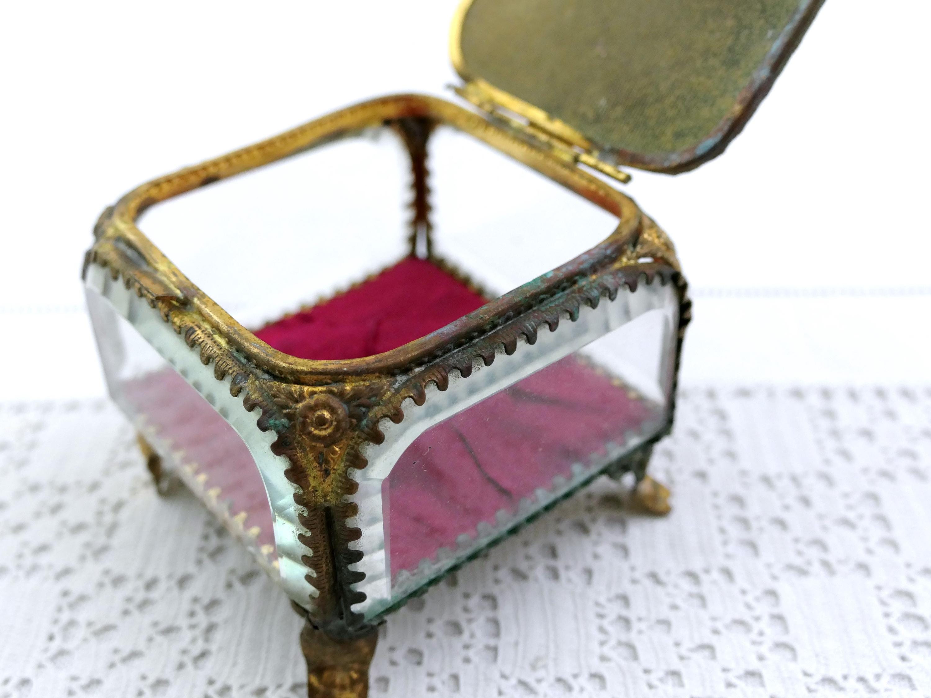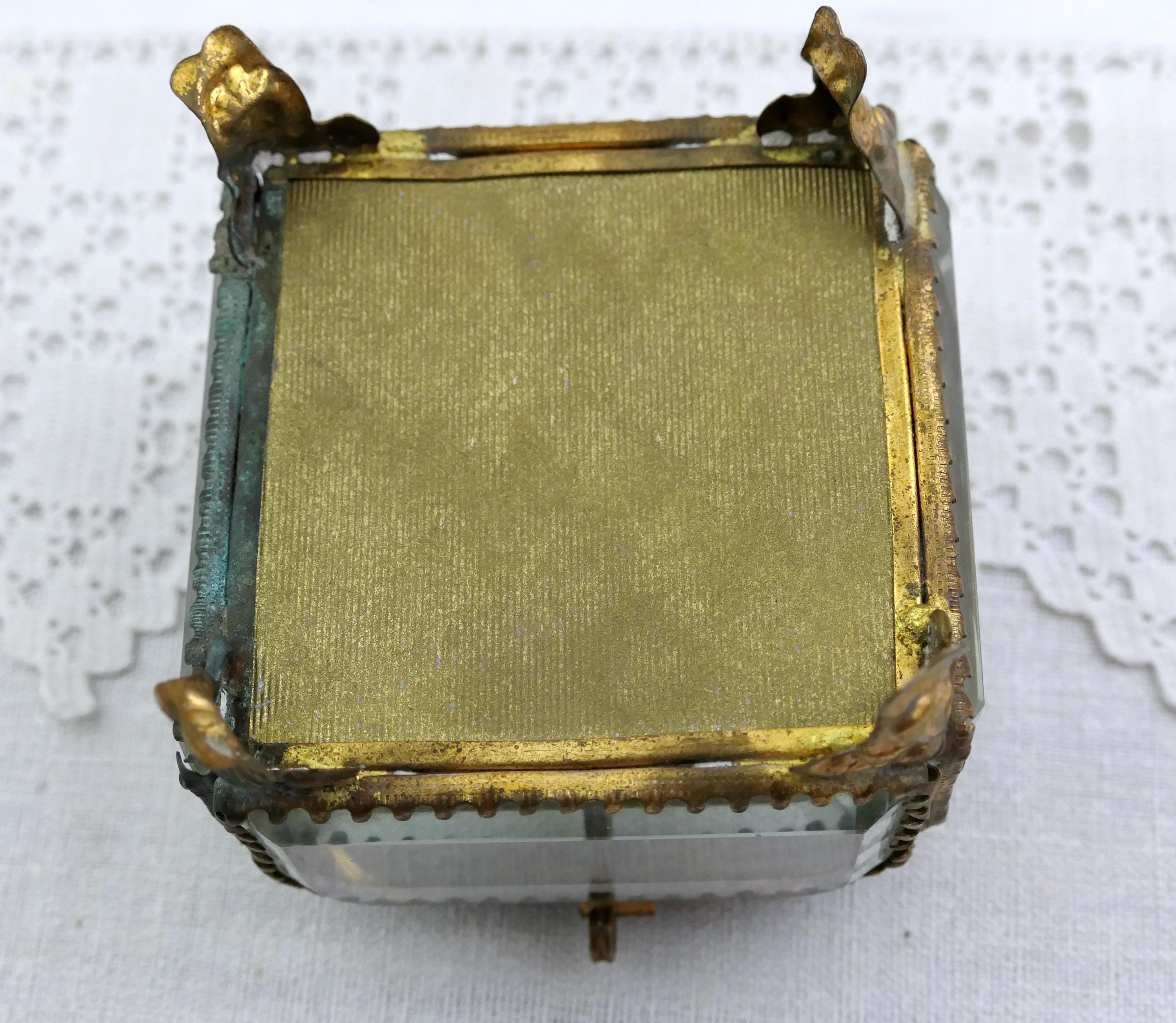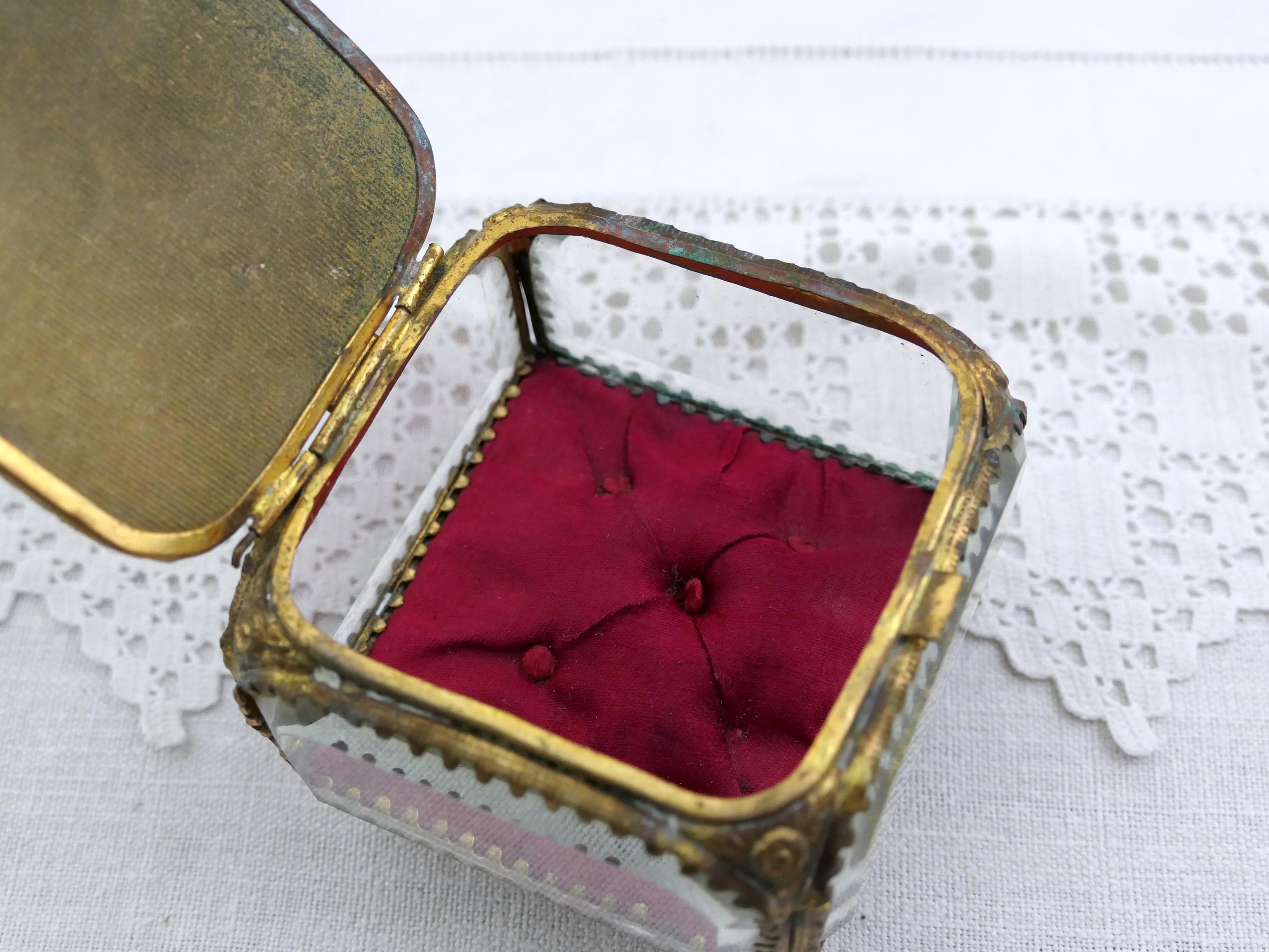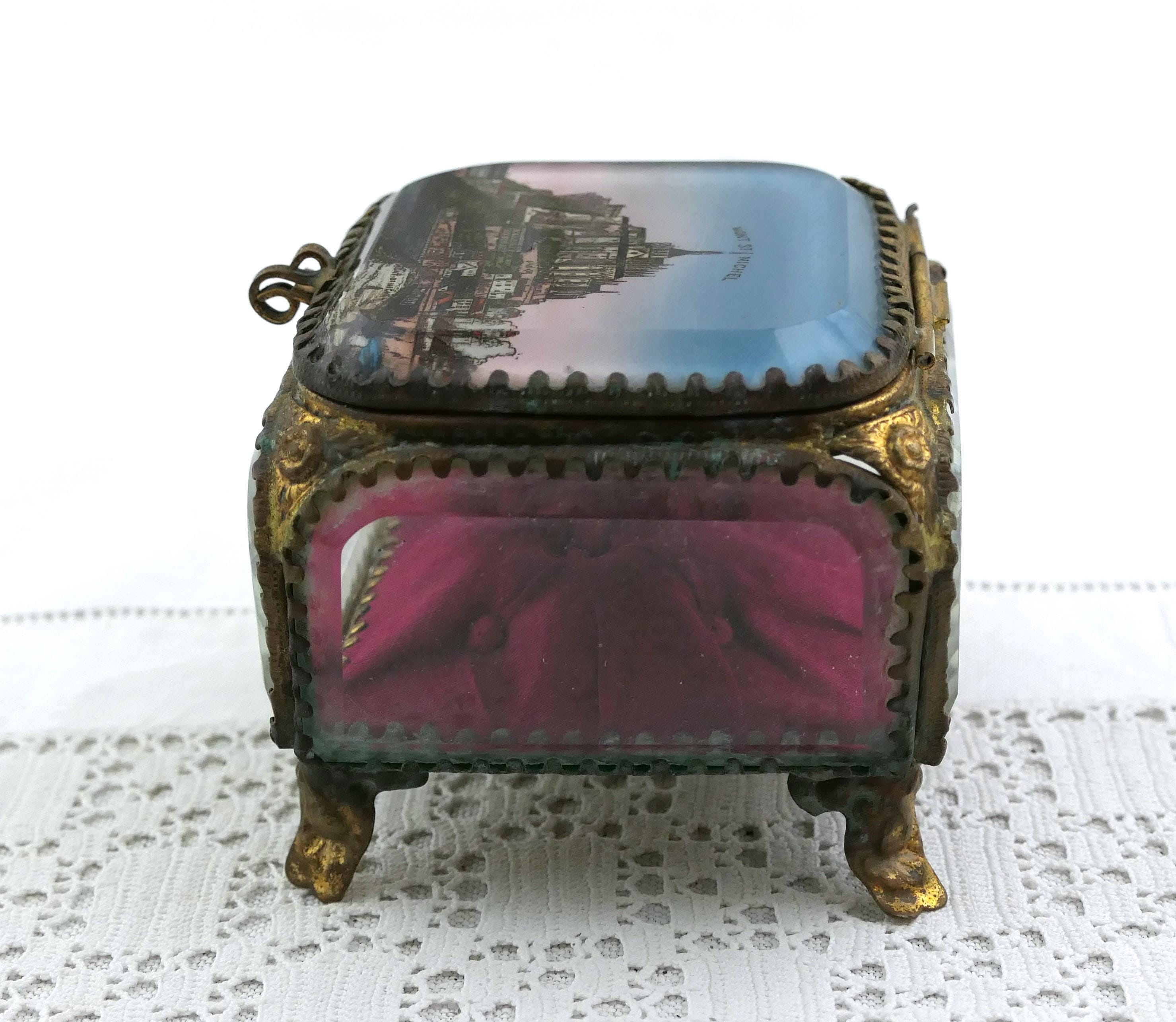 Antique souvenir jewelry box from the Mont Saint Michel. On the lid is a colored image of the Mont Sai nt Michel in Normandy. Made of beveled glass with red satin padded lining and gilded brass mounts. Ca mid to late 1800s.
