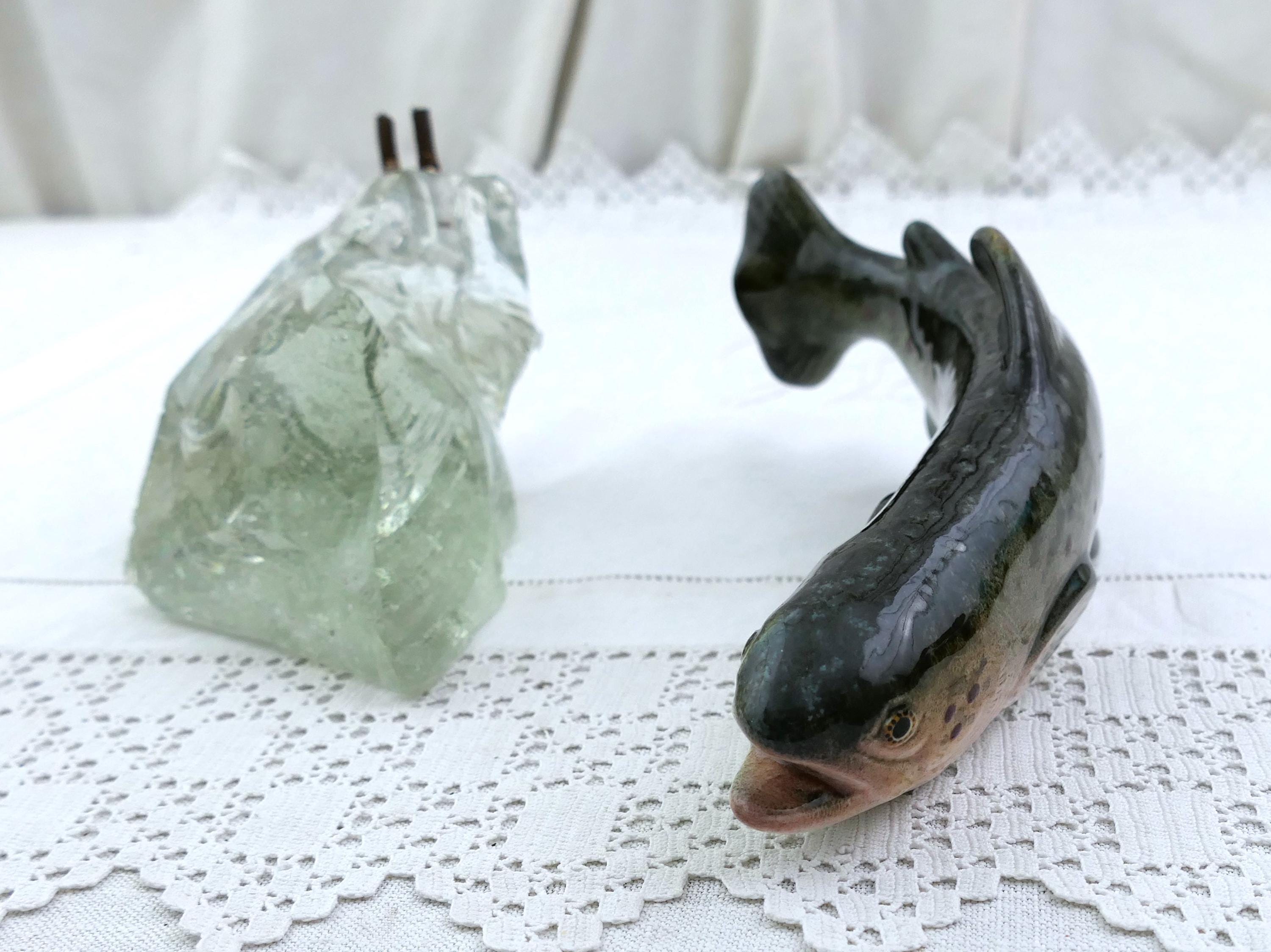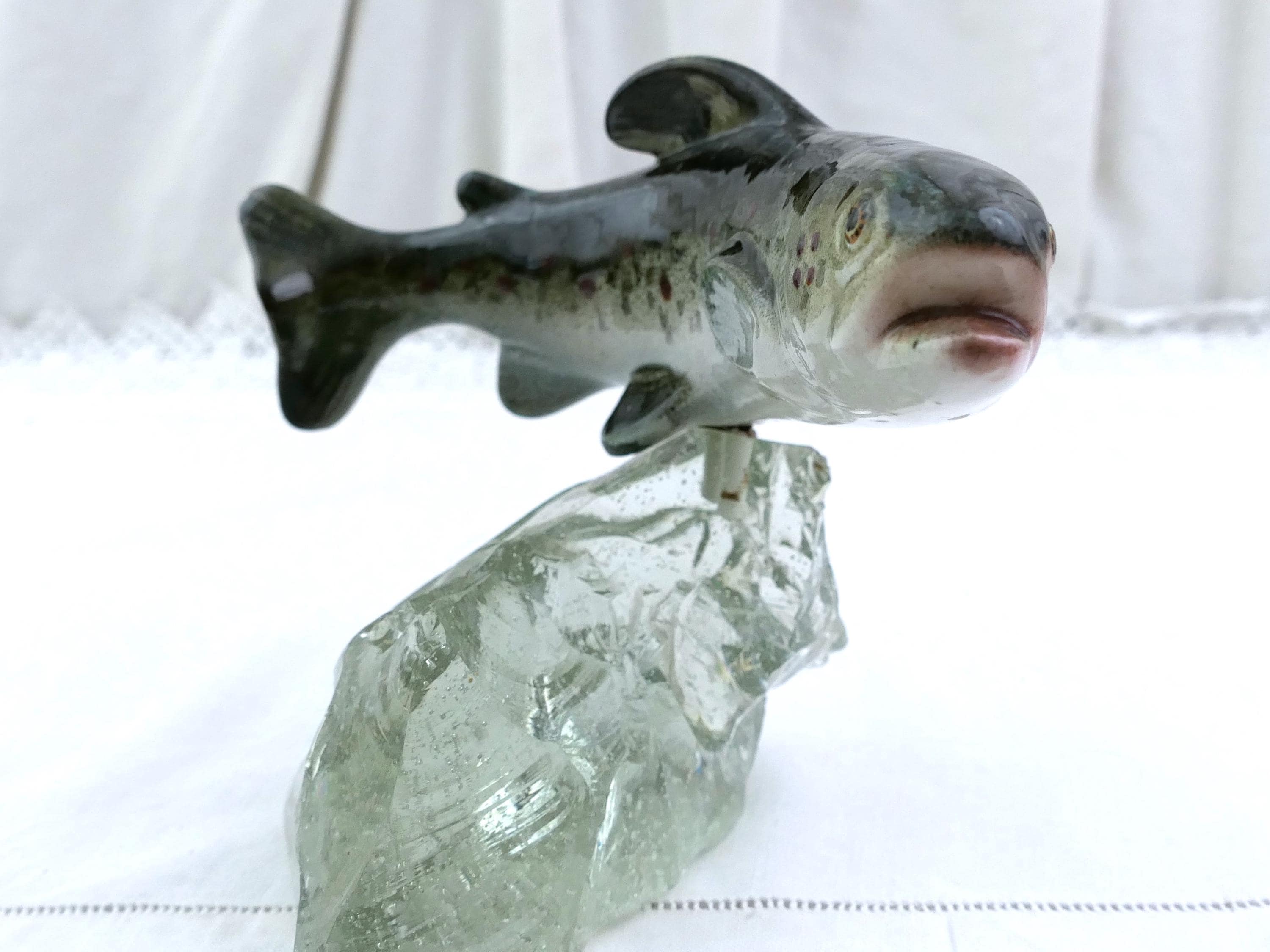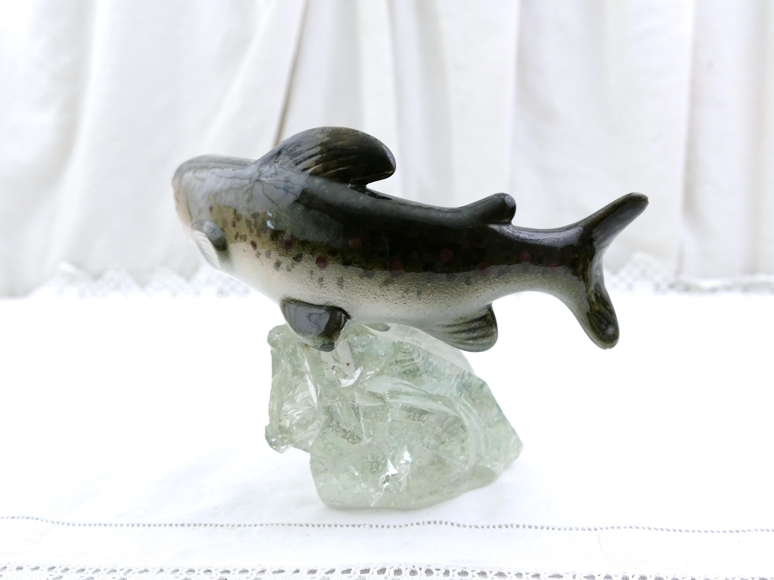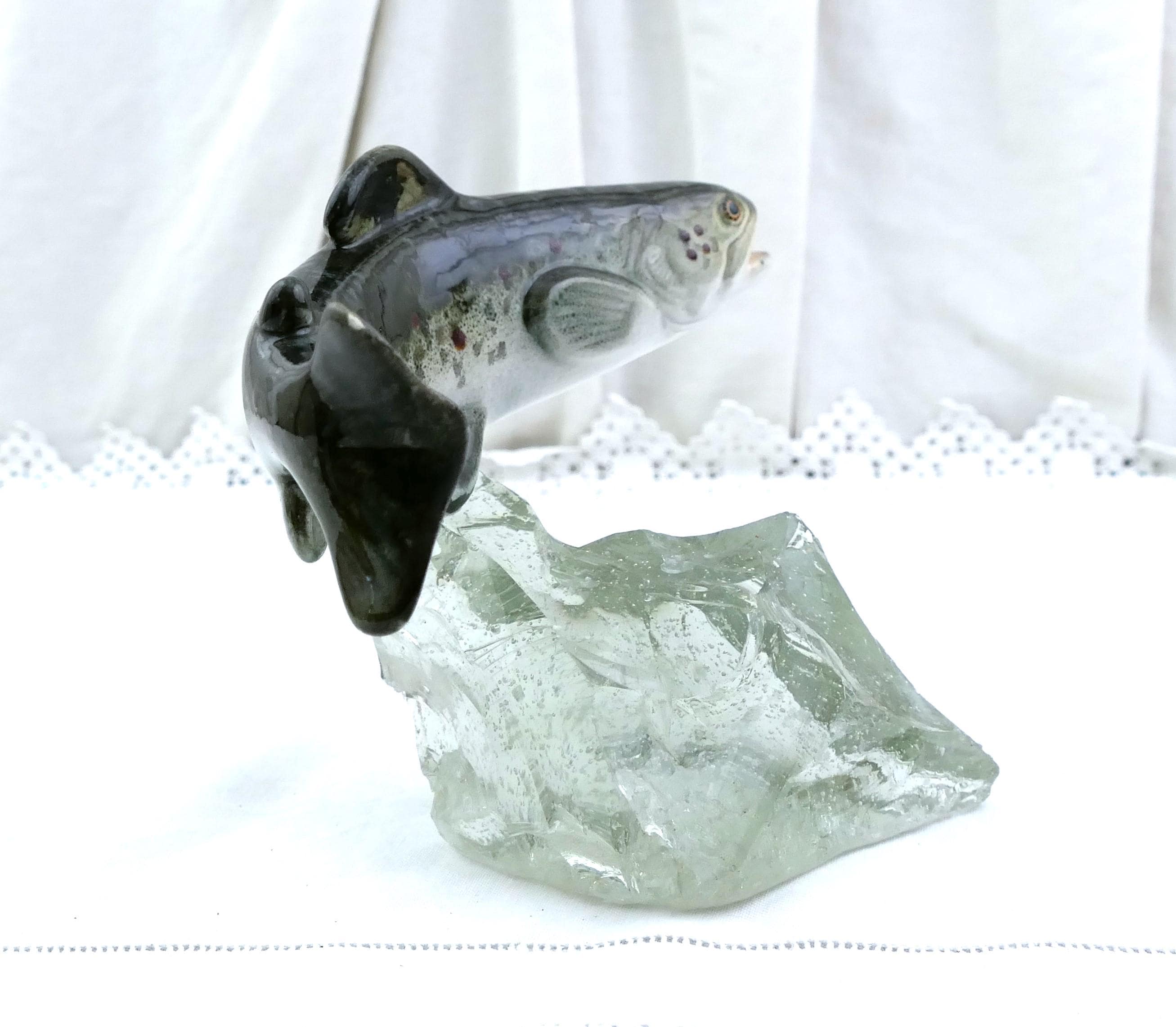 Vintage swimming trout fish figurine. Made by Raymond Gangloff of glazed ceramic and rough crystal glass. Ca mid 1900s.