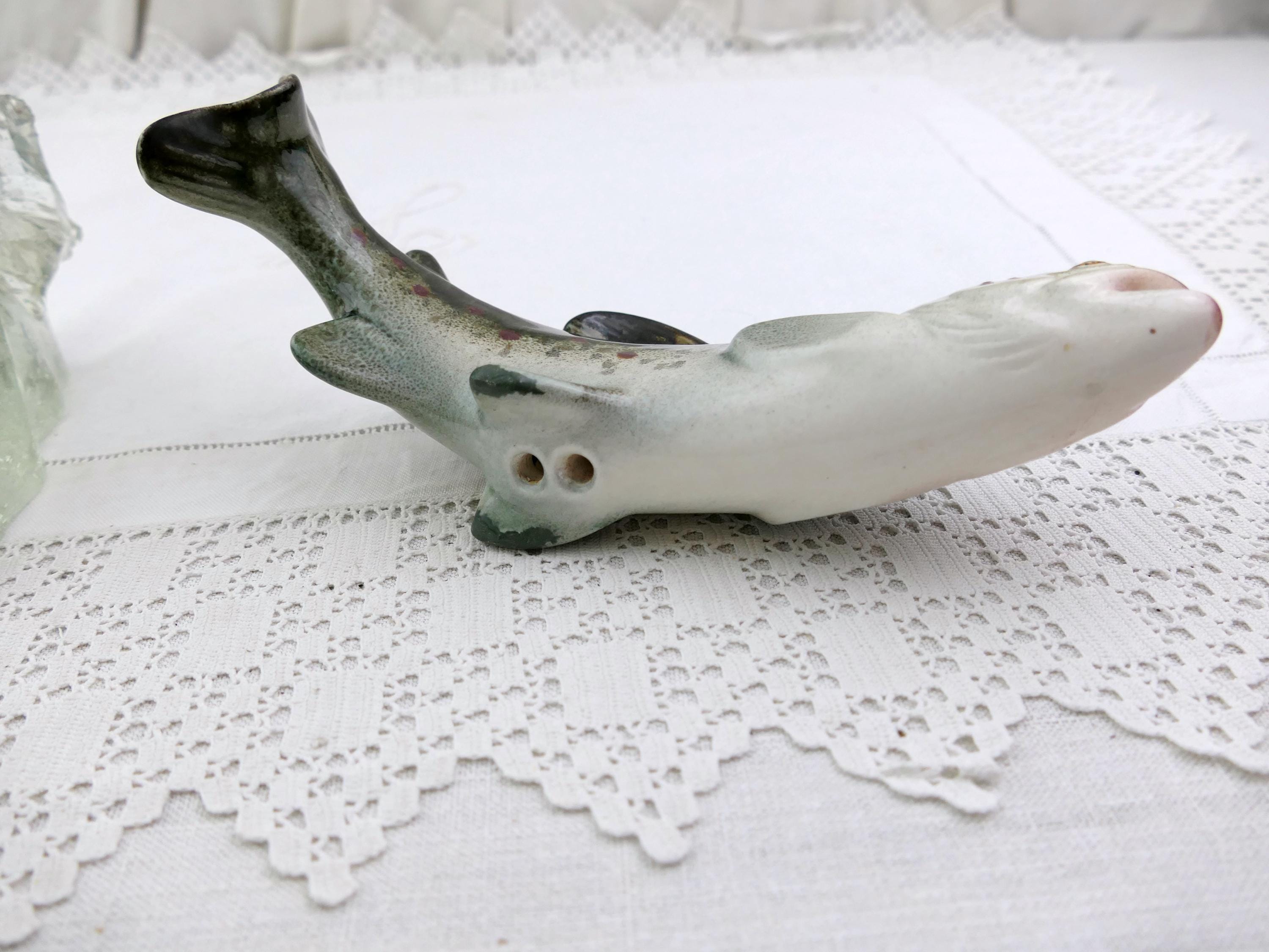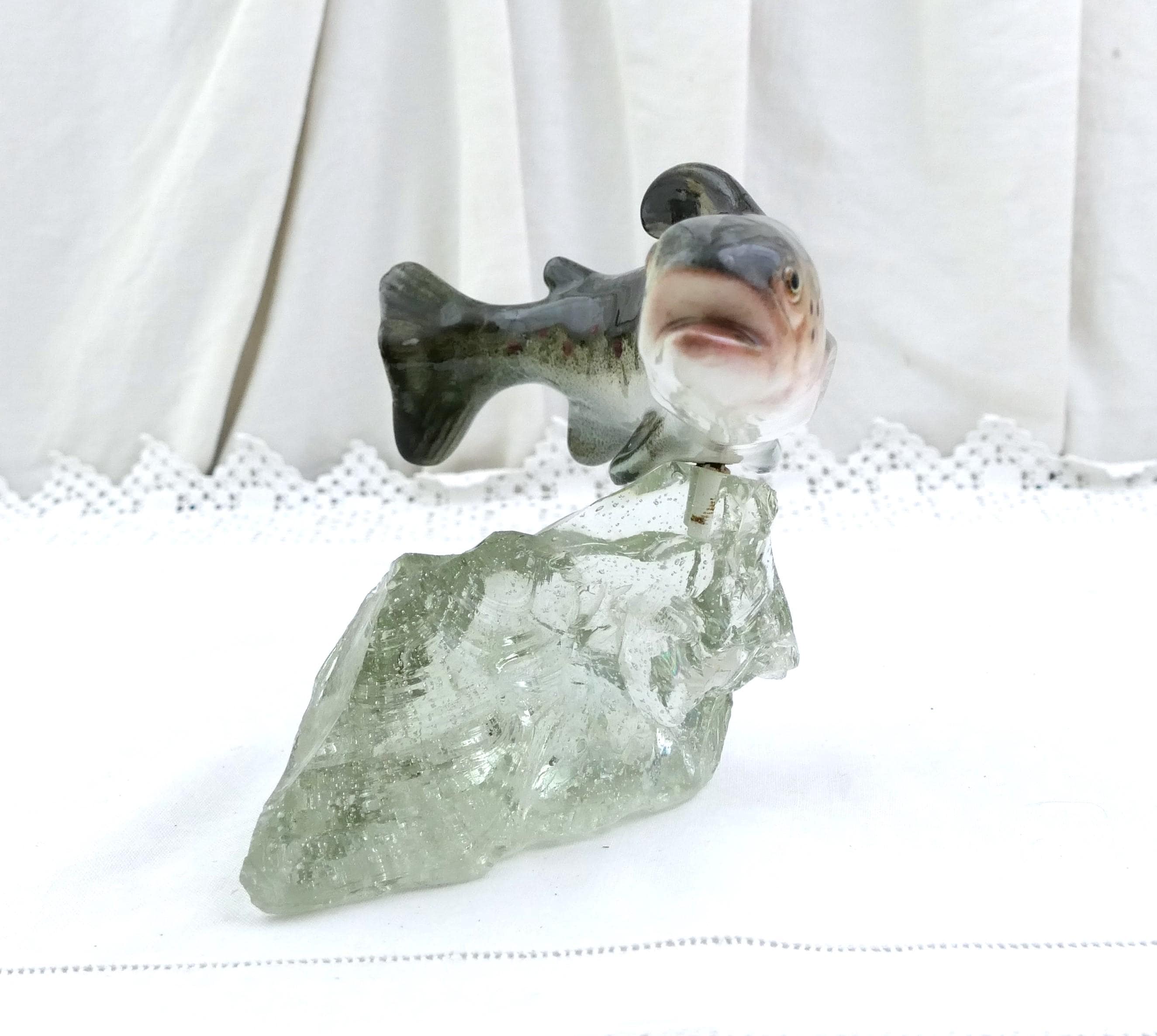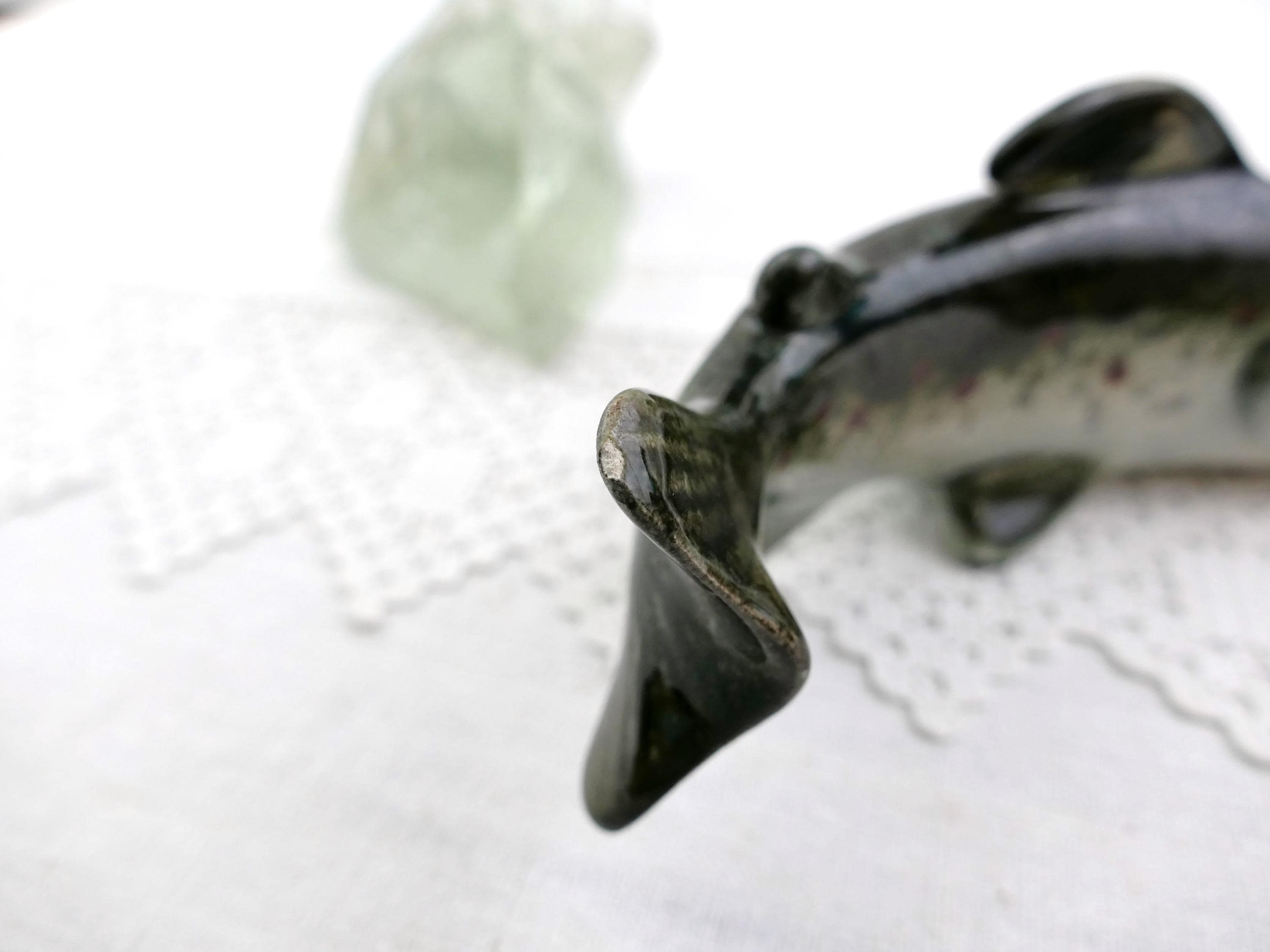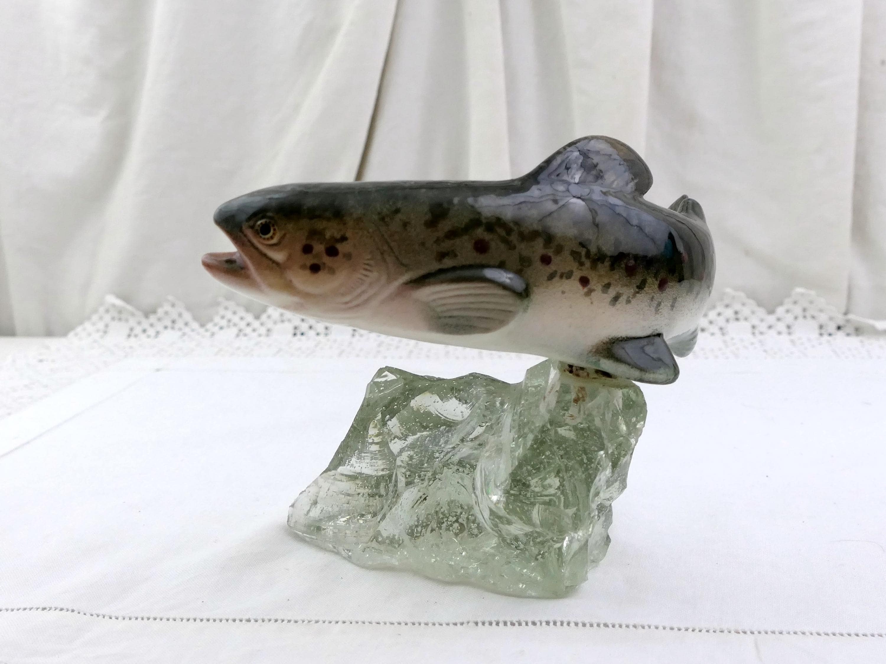 Vintage swimming trout fish figurine. Made by Raymond Gangloff of glazed ceramic and rough crystal glass. Ca mid 1900s.