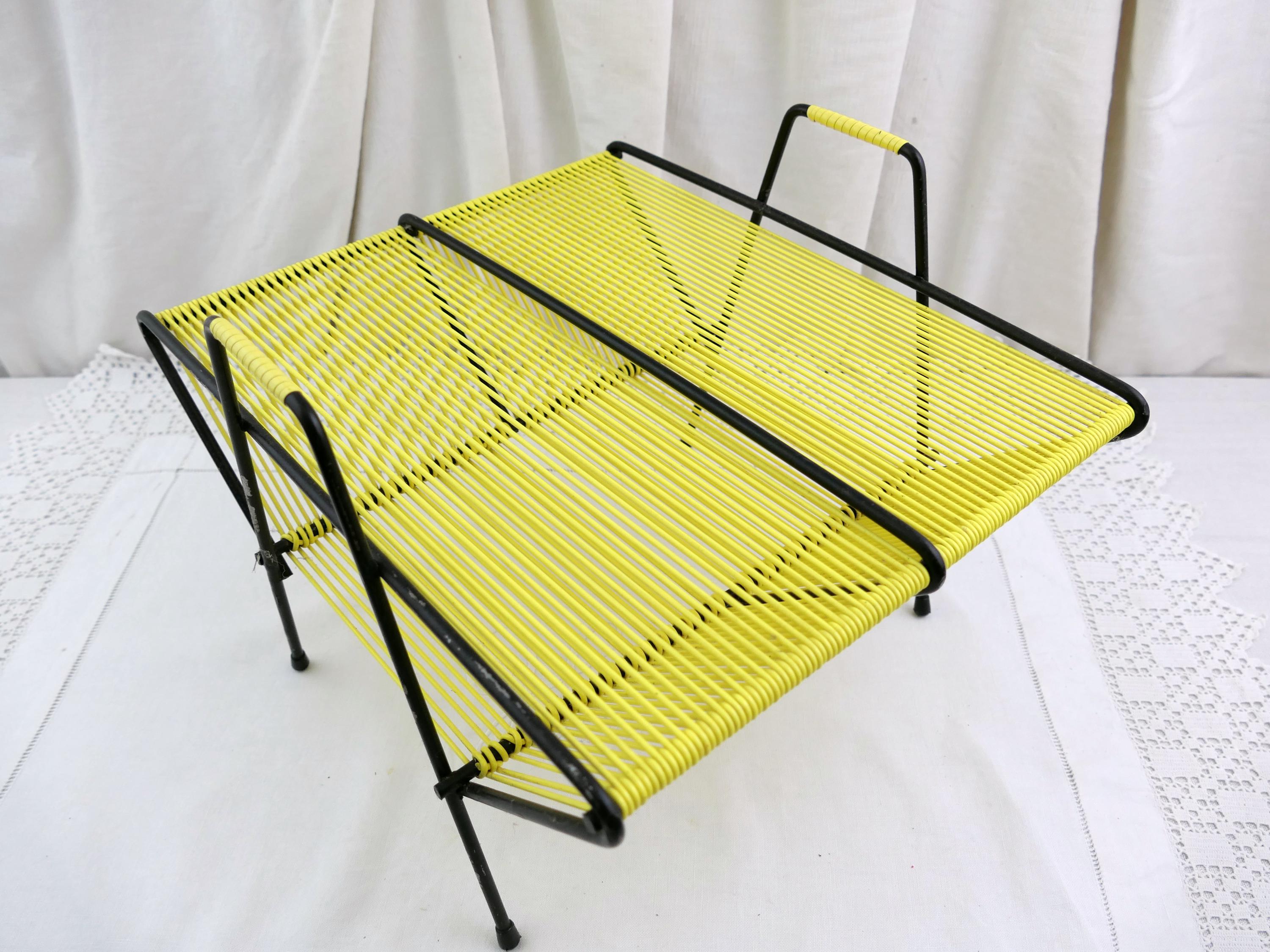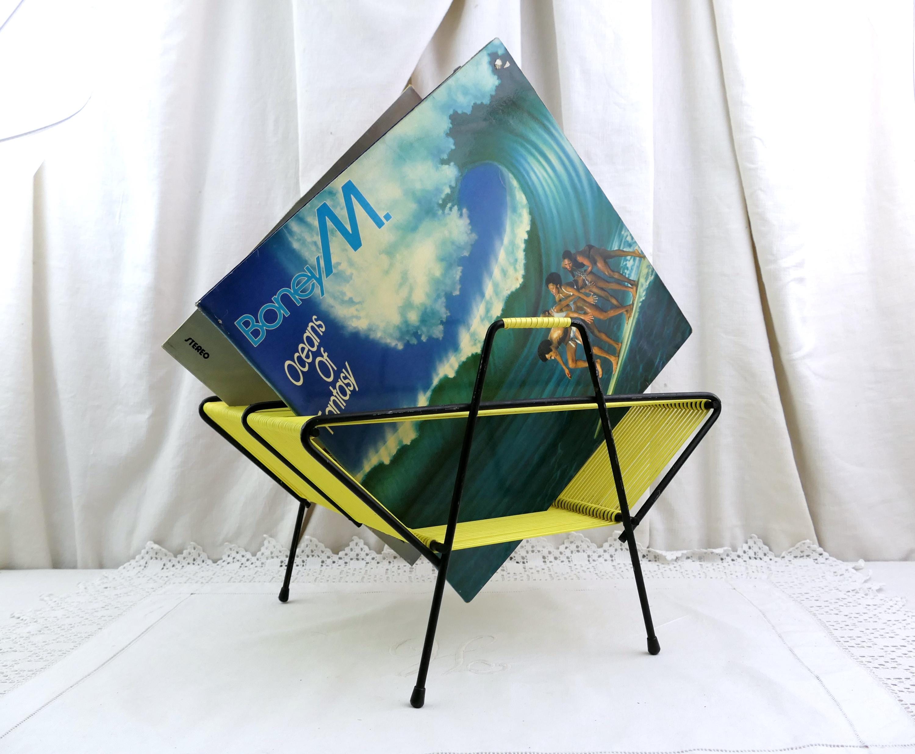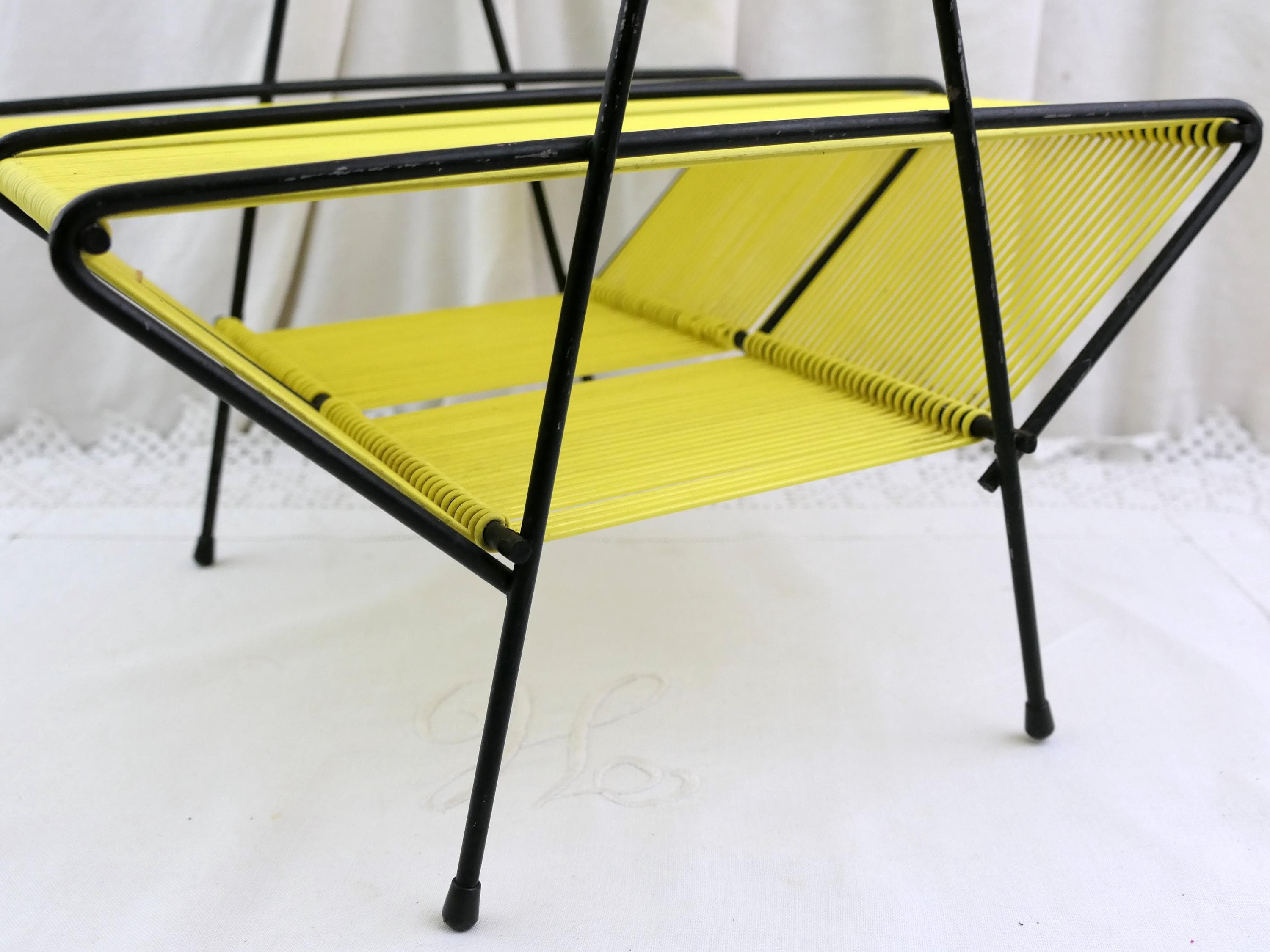 Vintage French record holder rack. Made of black lacquered metal frame with bright yellow vinyl cord. Ca 1950s- 1960s.