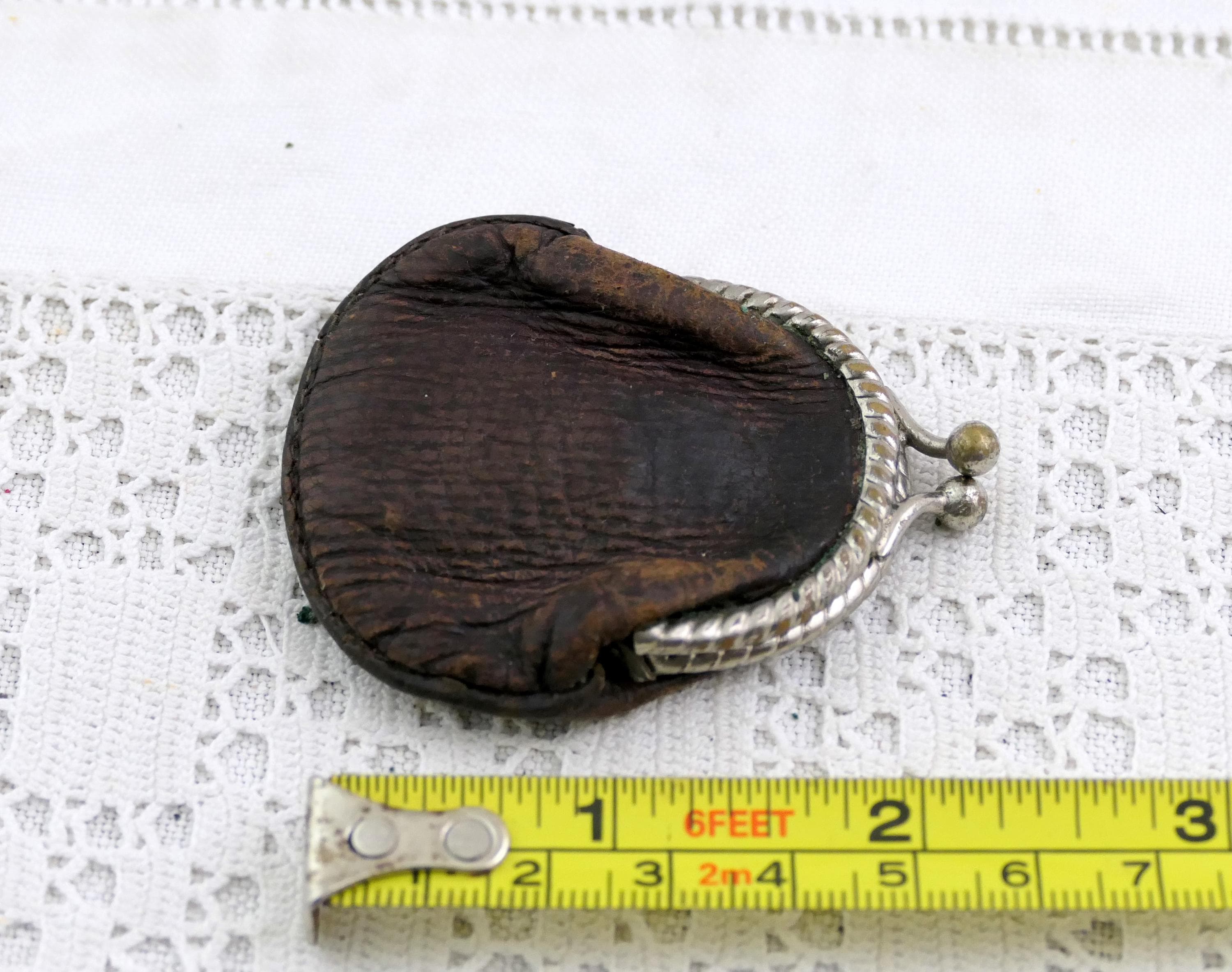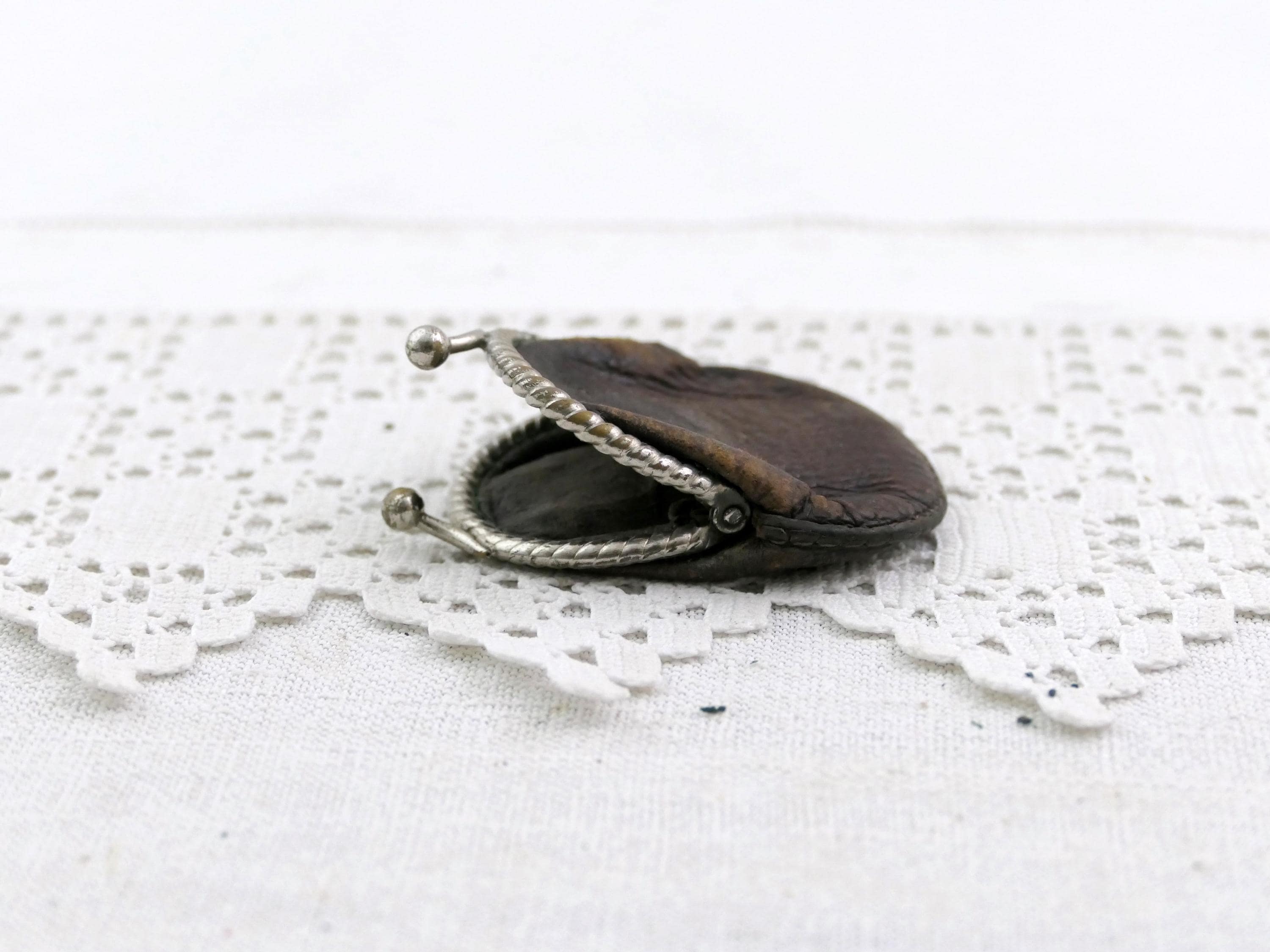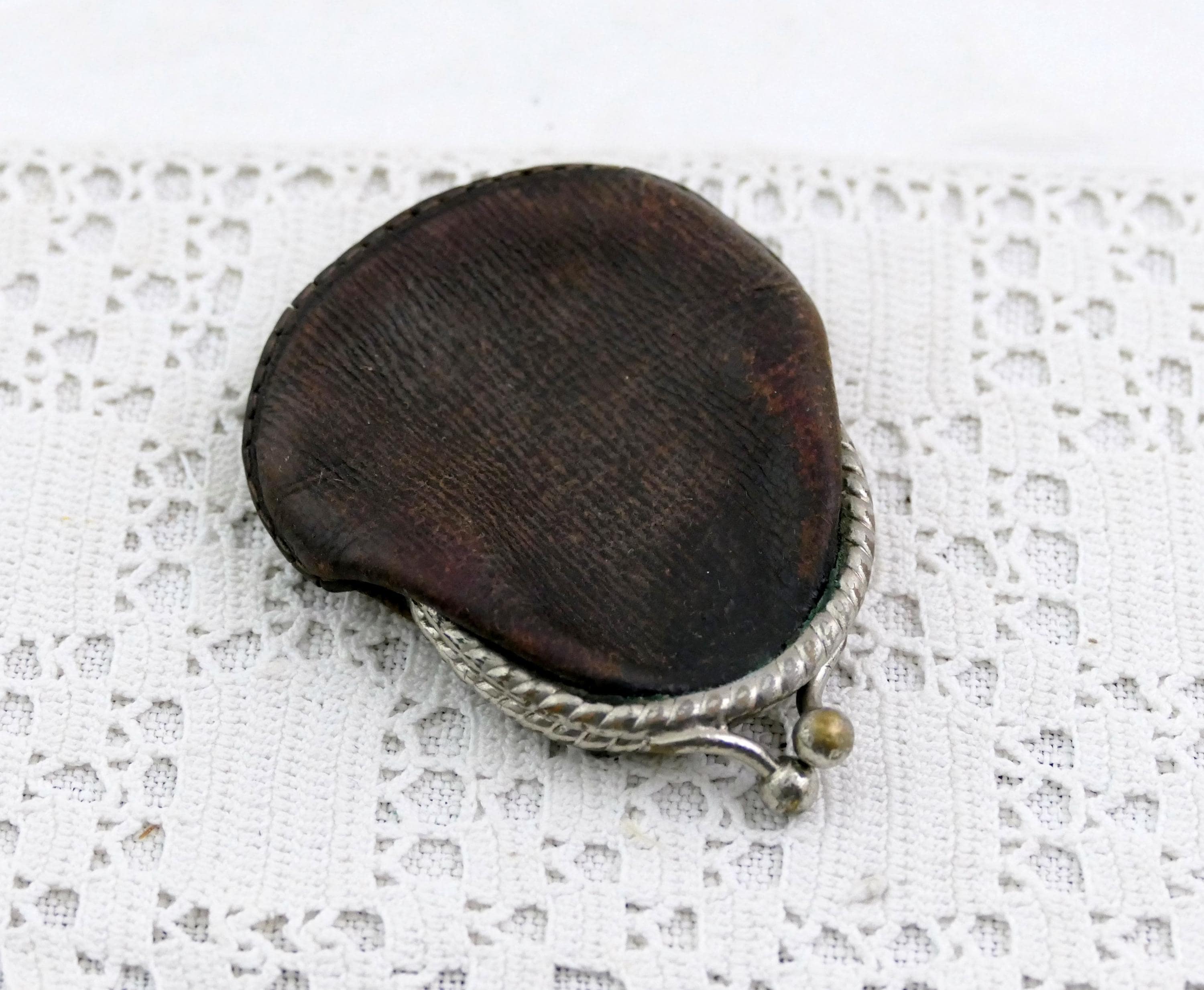 Small antique French coin purse. Made of brown leather with metal clasp closing mechanism. Ca late 1800s early 1900s.