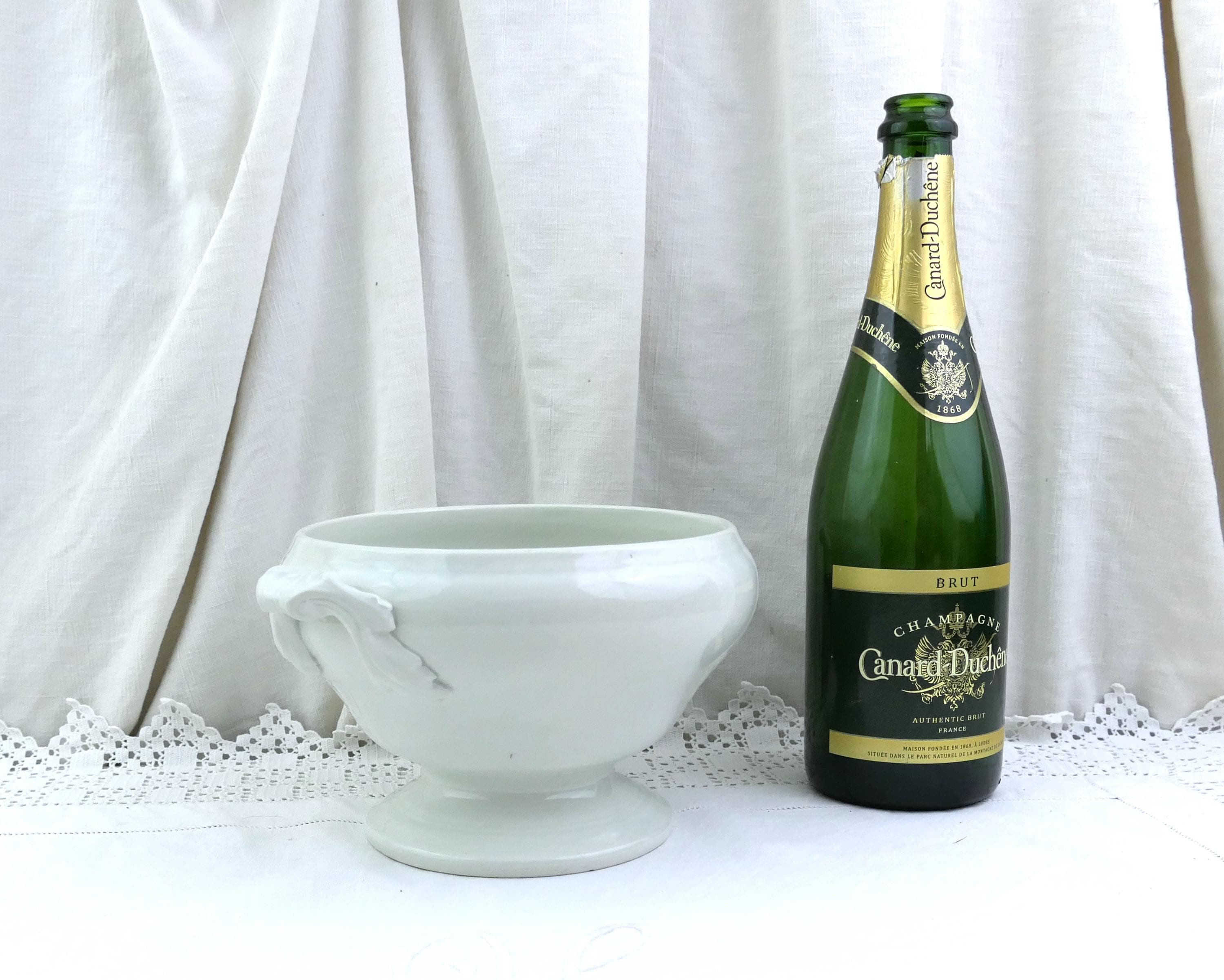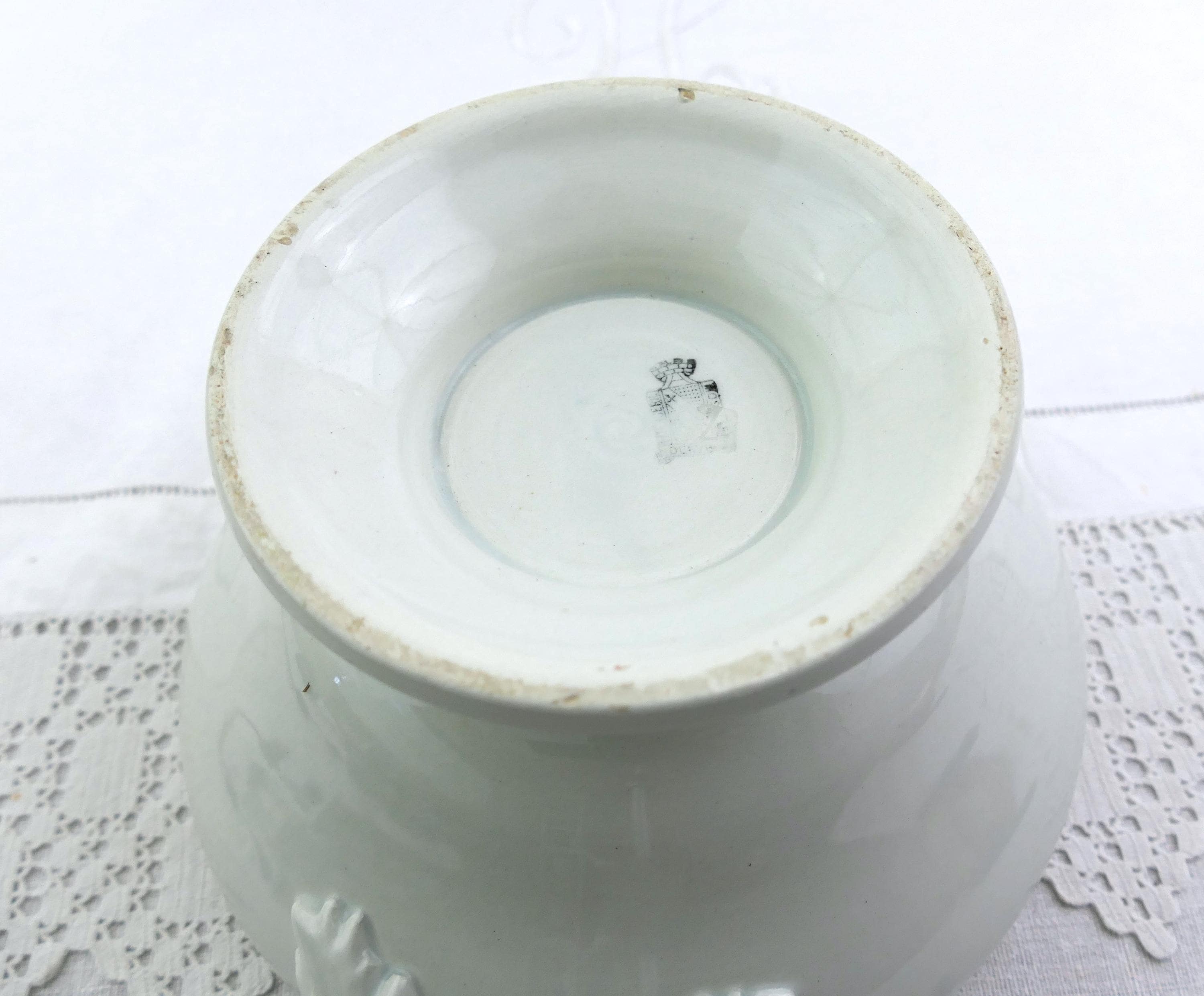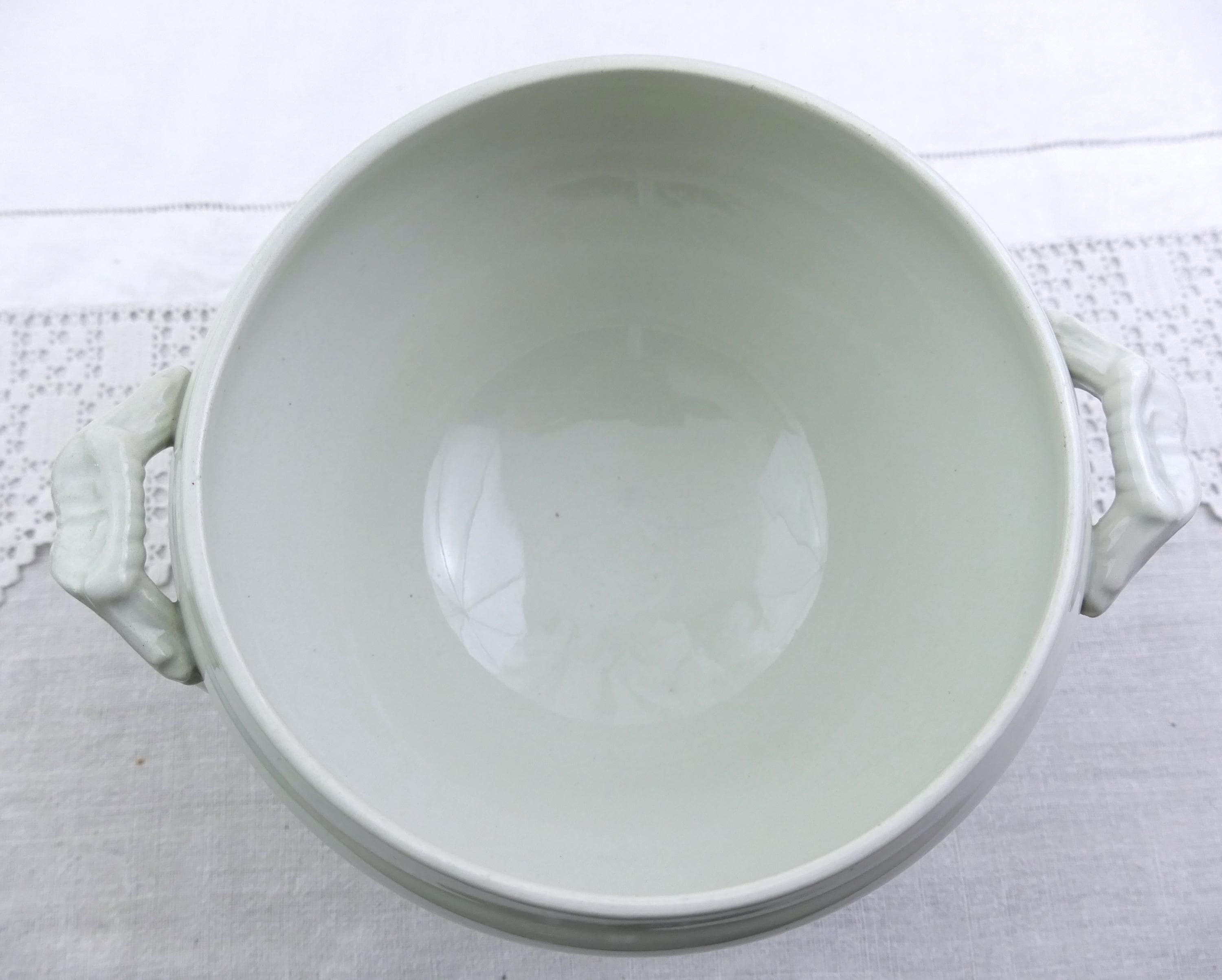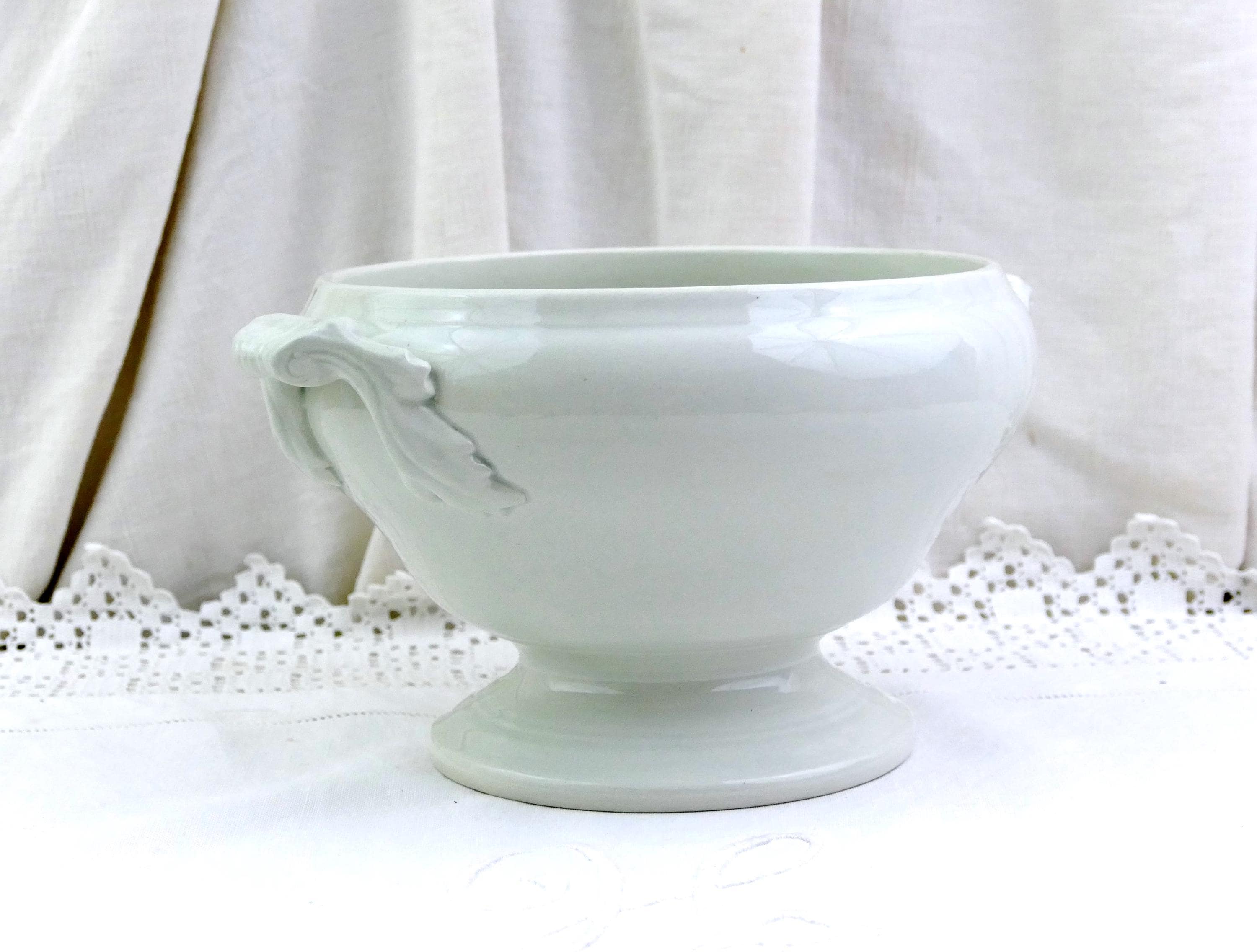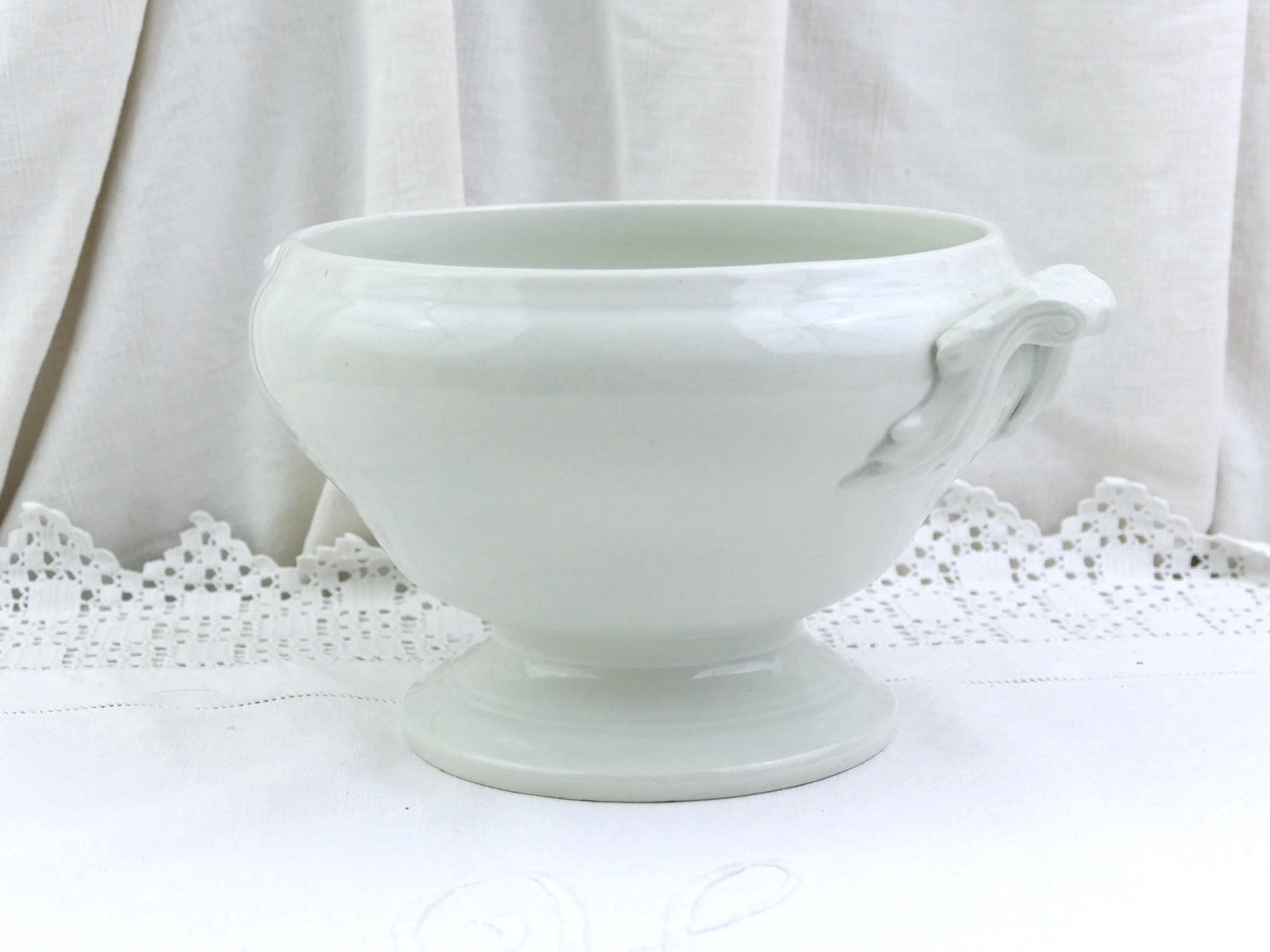 Vintage French soup serving bowl with side handles. Made by Digoin of white ironstone pottery. Ca 1800s.