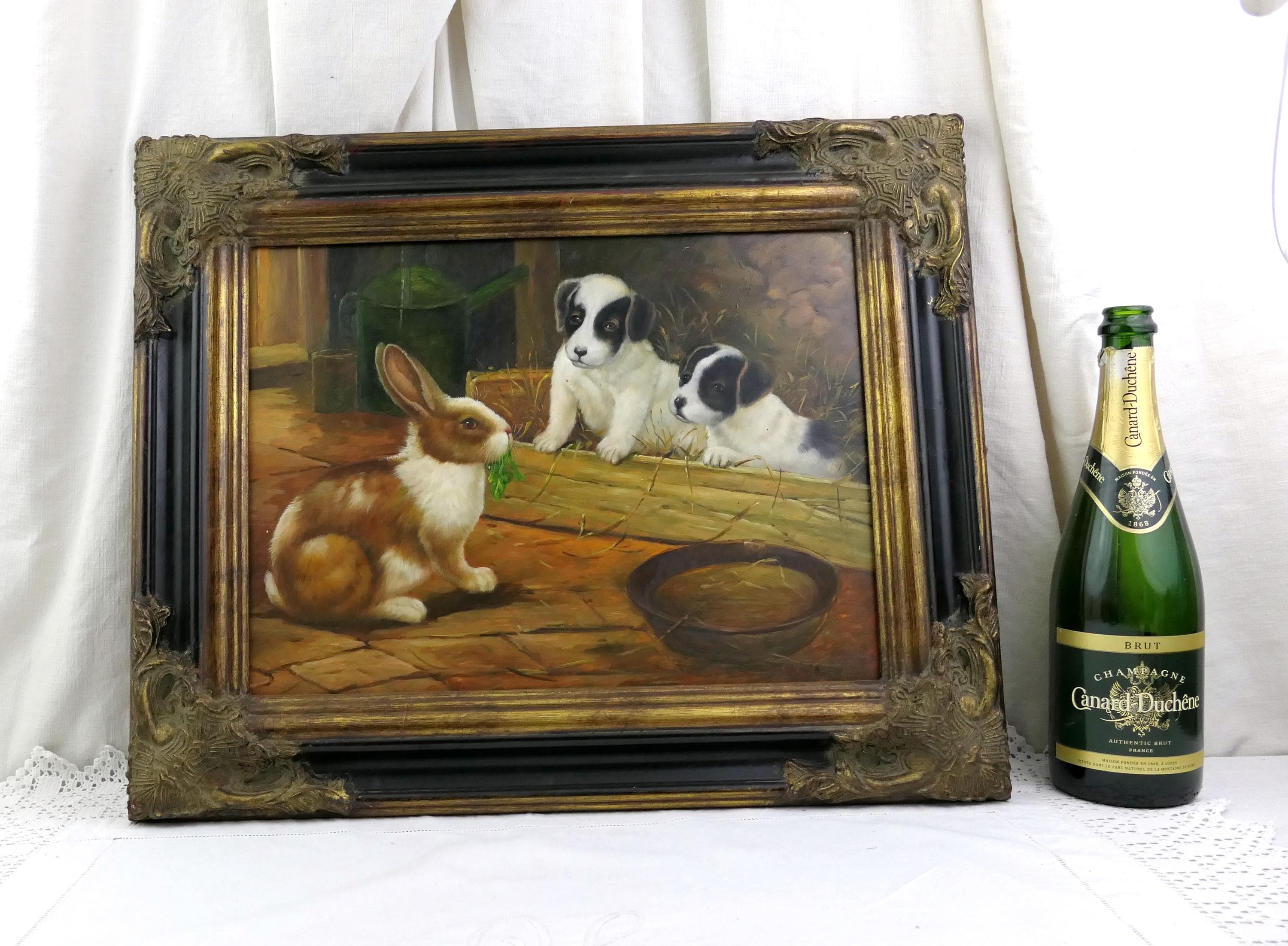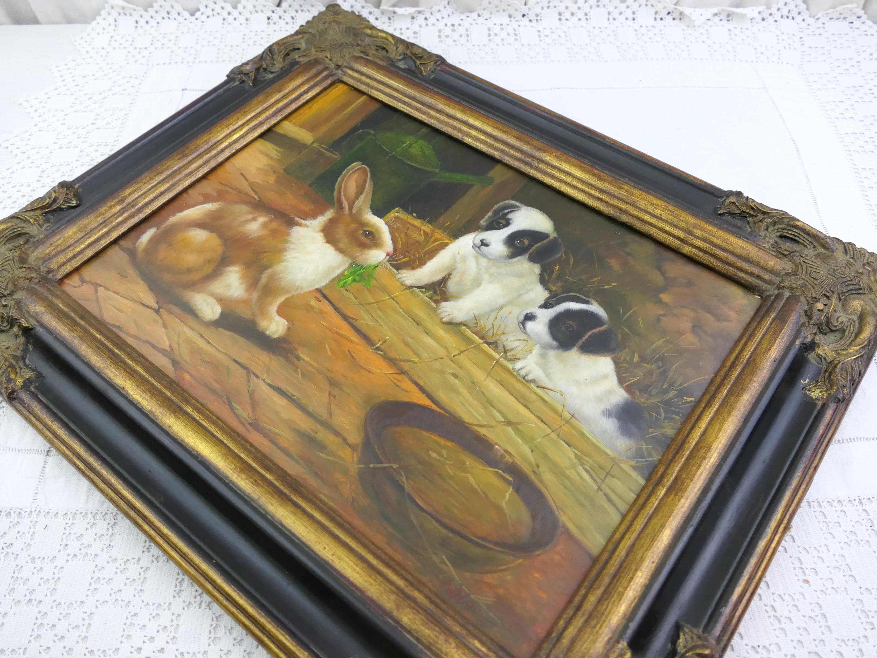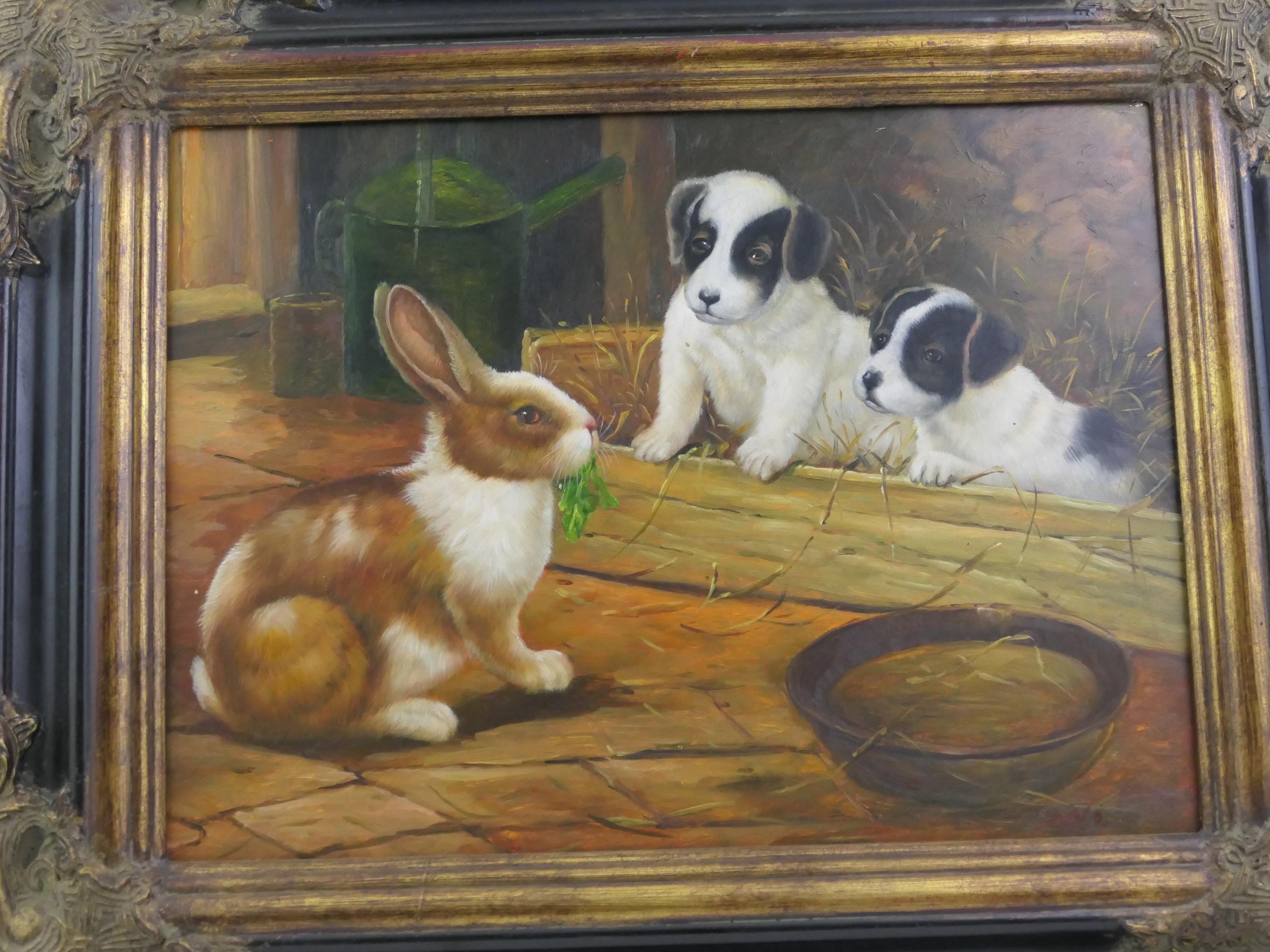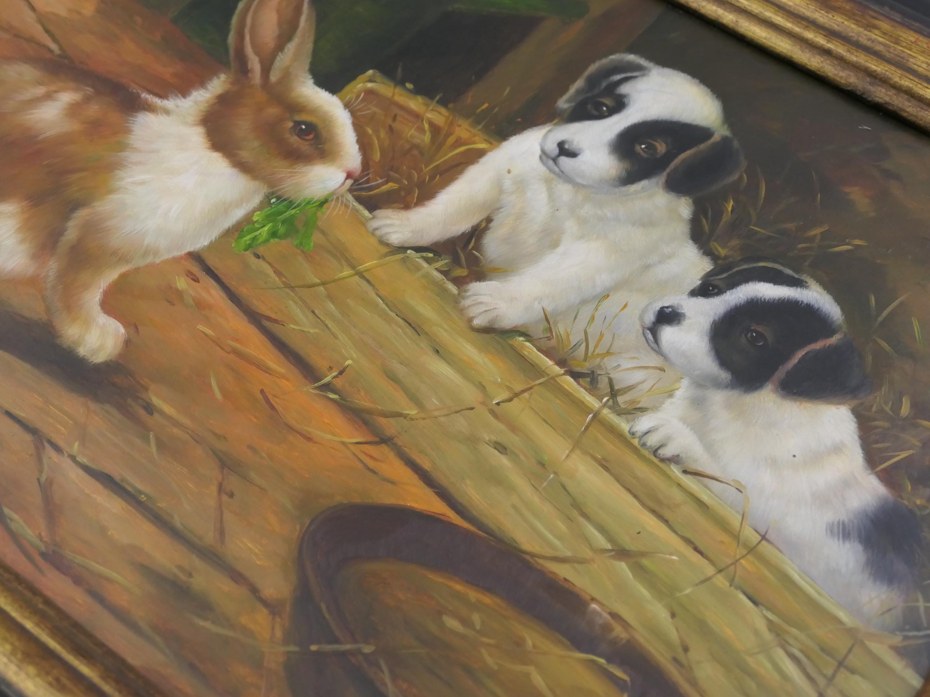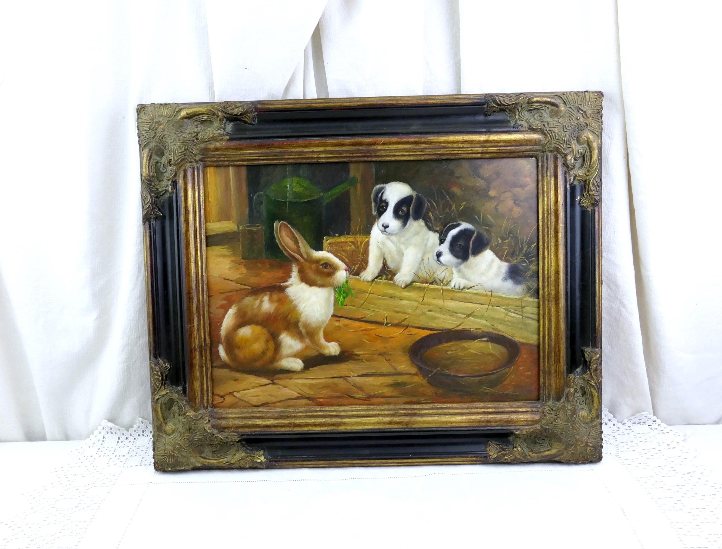 Large vintage hand painted picture of a puppies watching a bunny rabbit. Made of wood with oil painting on wooden board. Ca late 1900s.