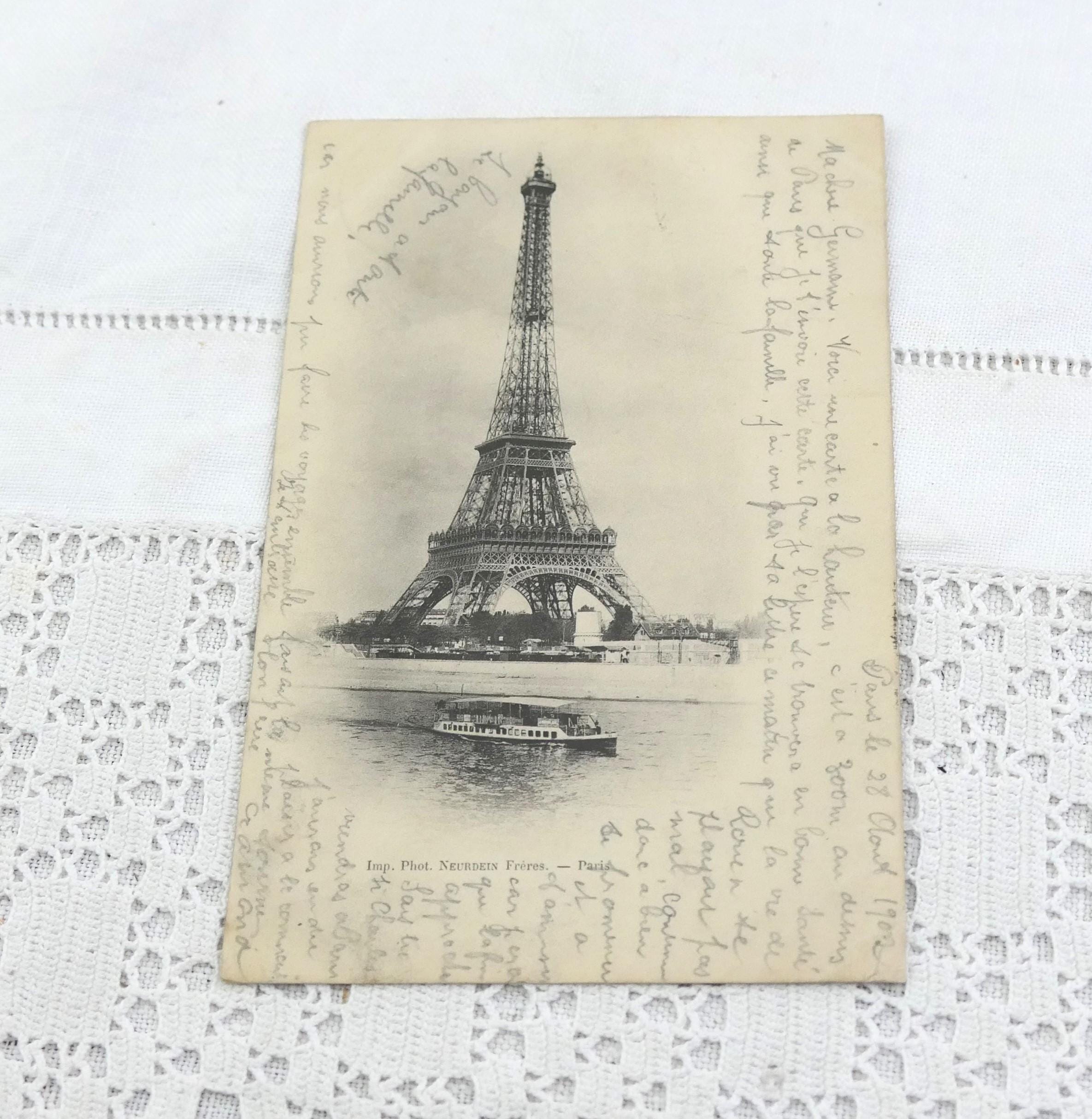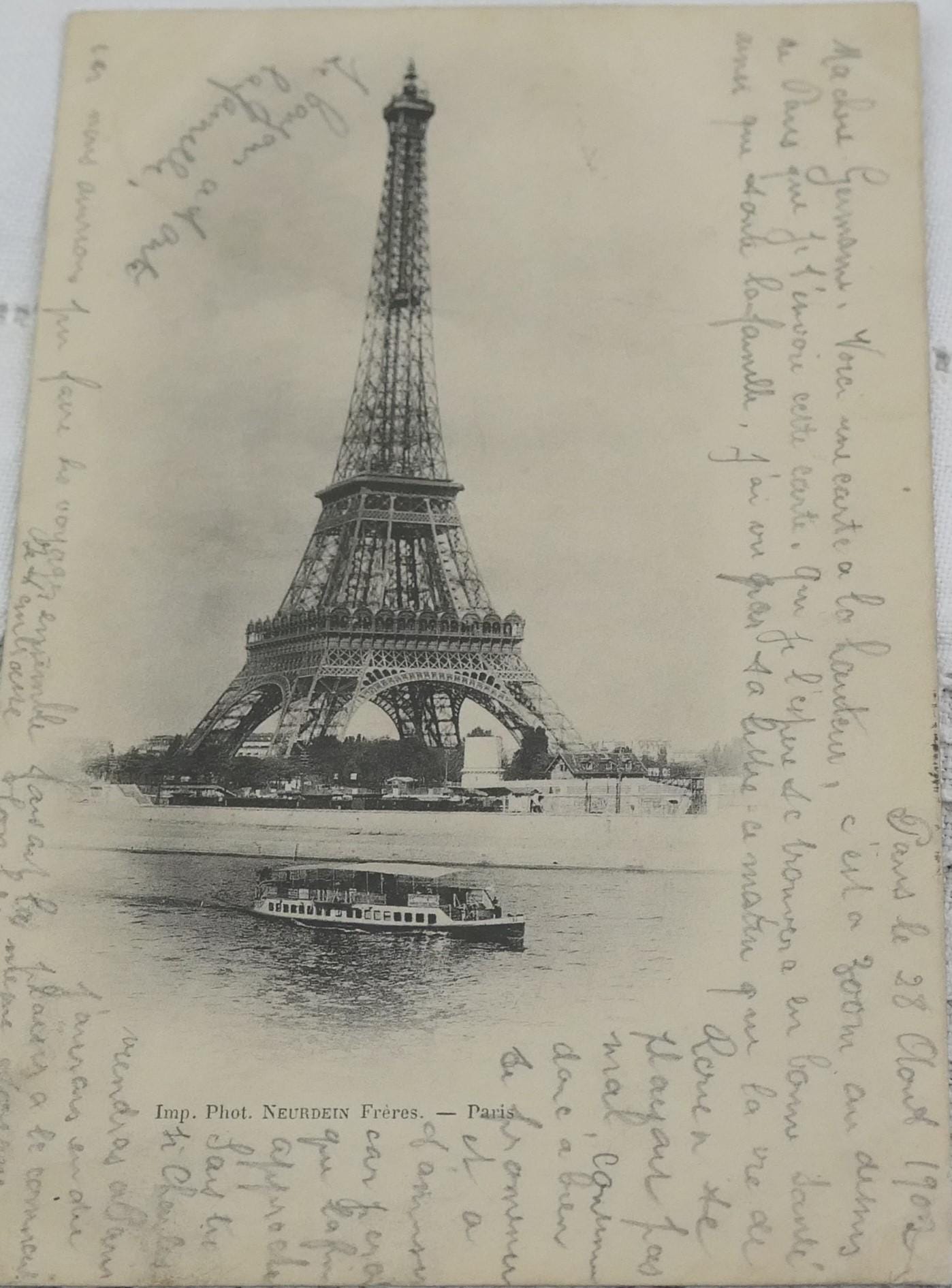 Antique French black and white postcard of the Eiffel Tower in Paris. Posted in 1909.