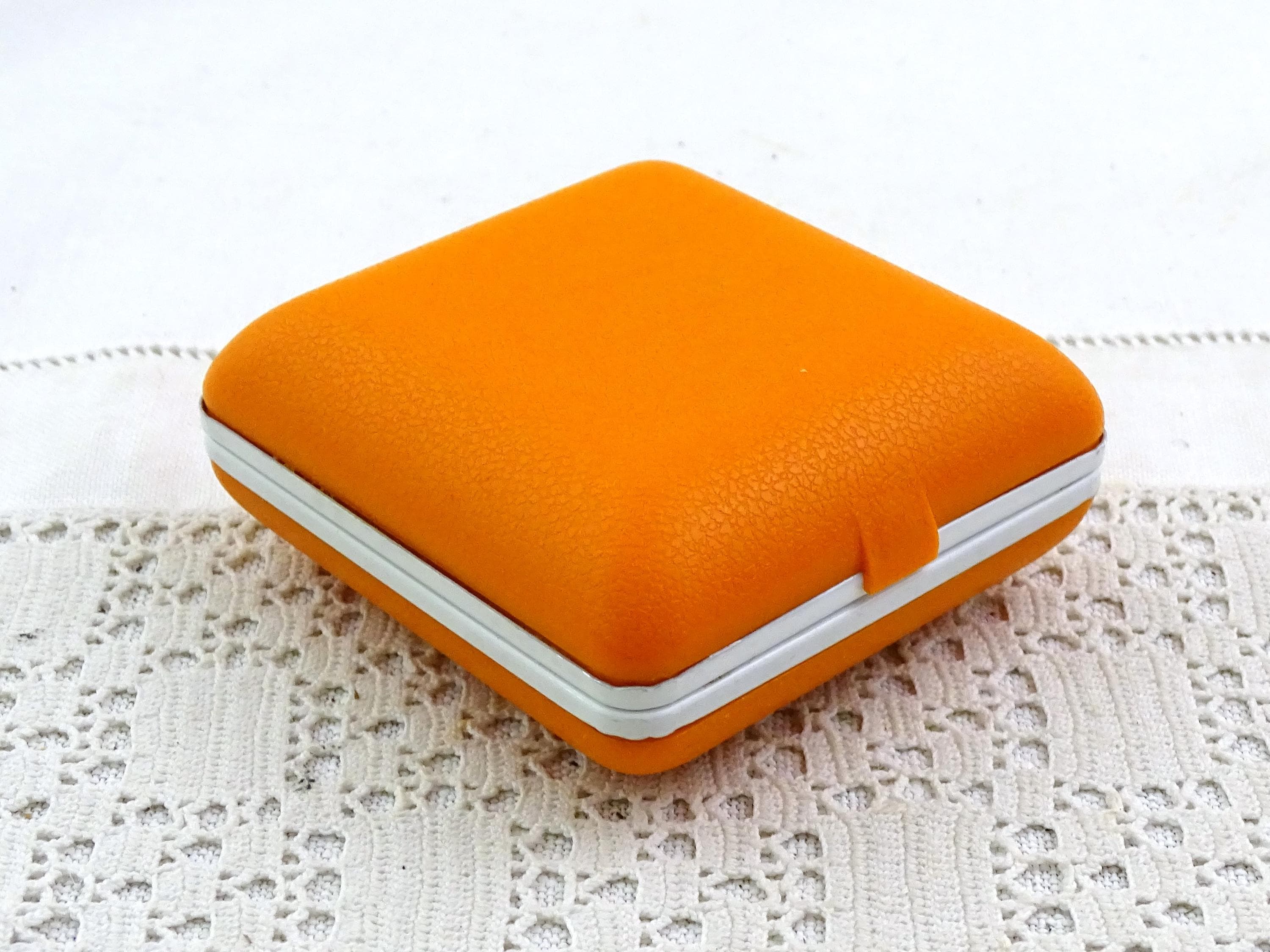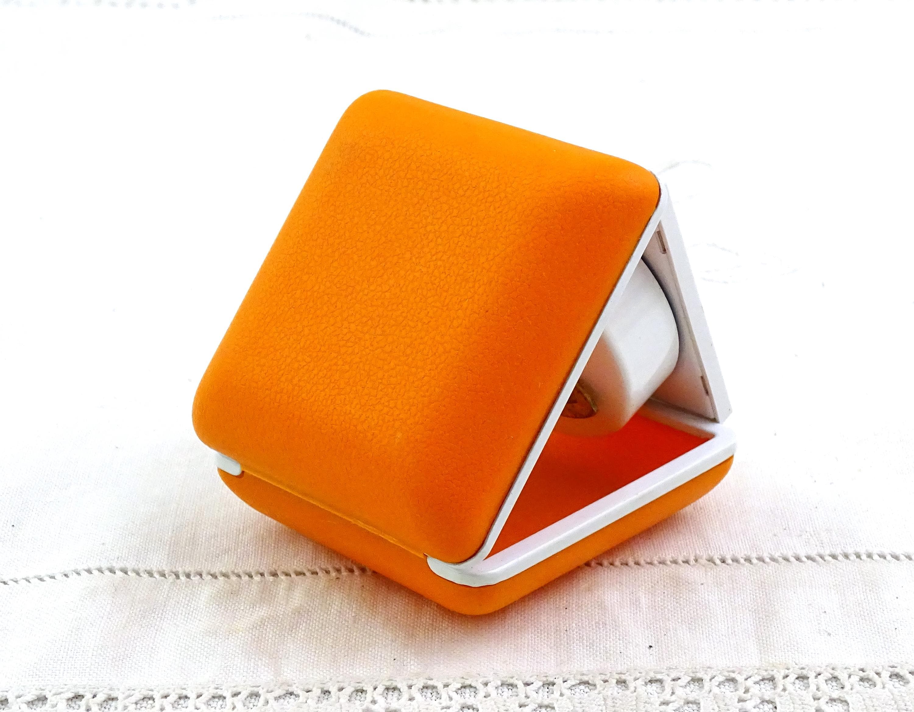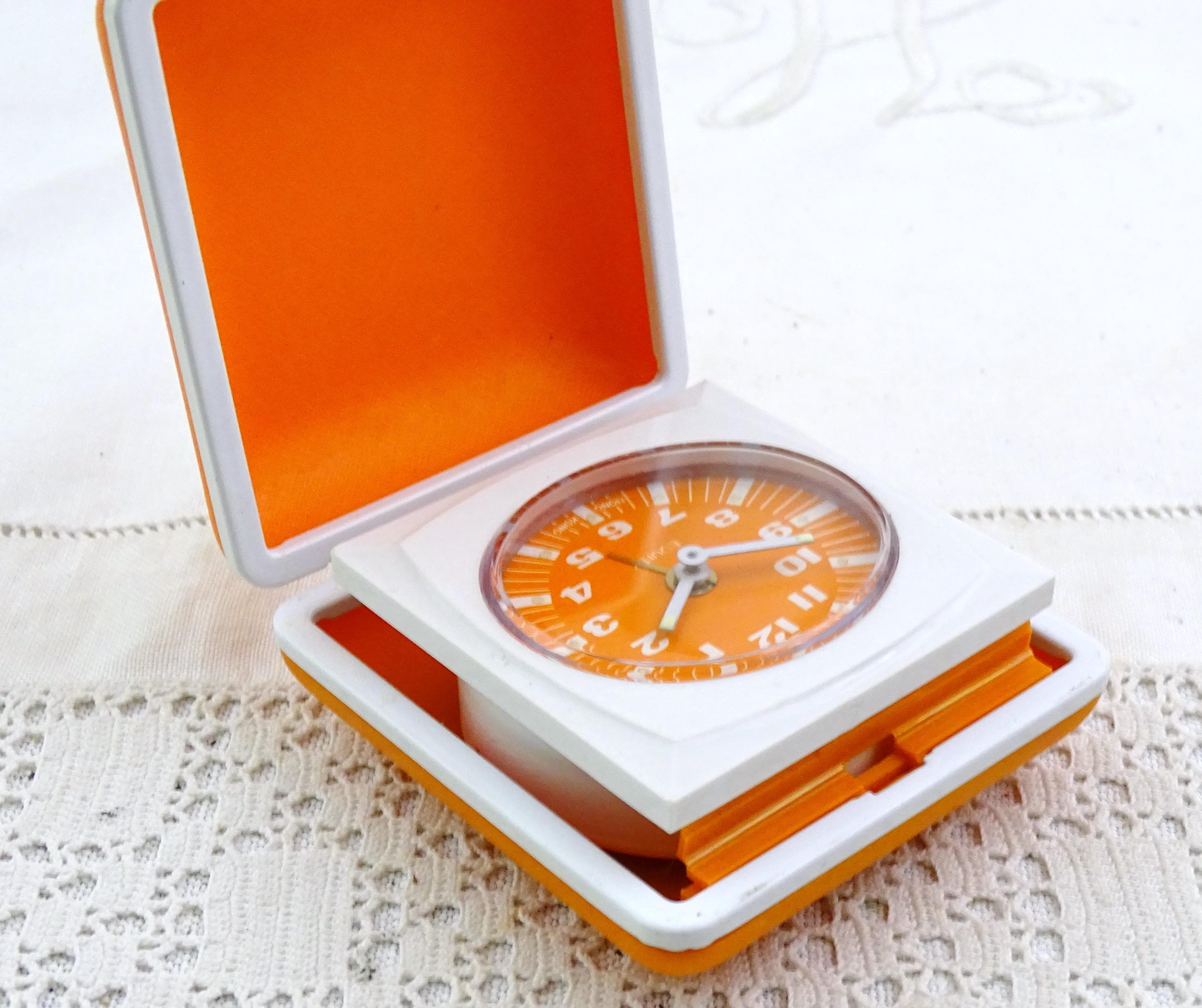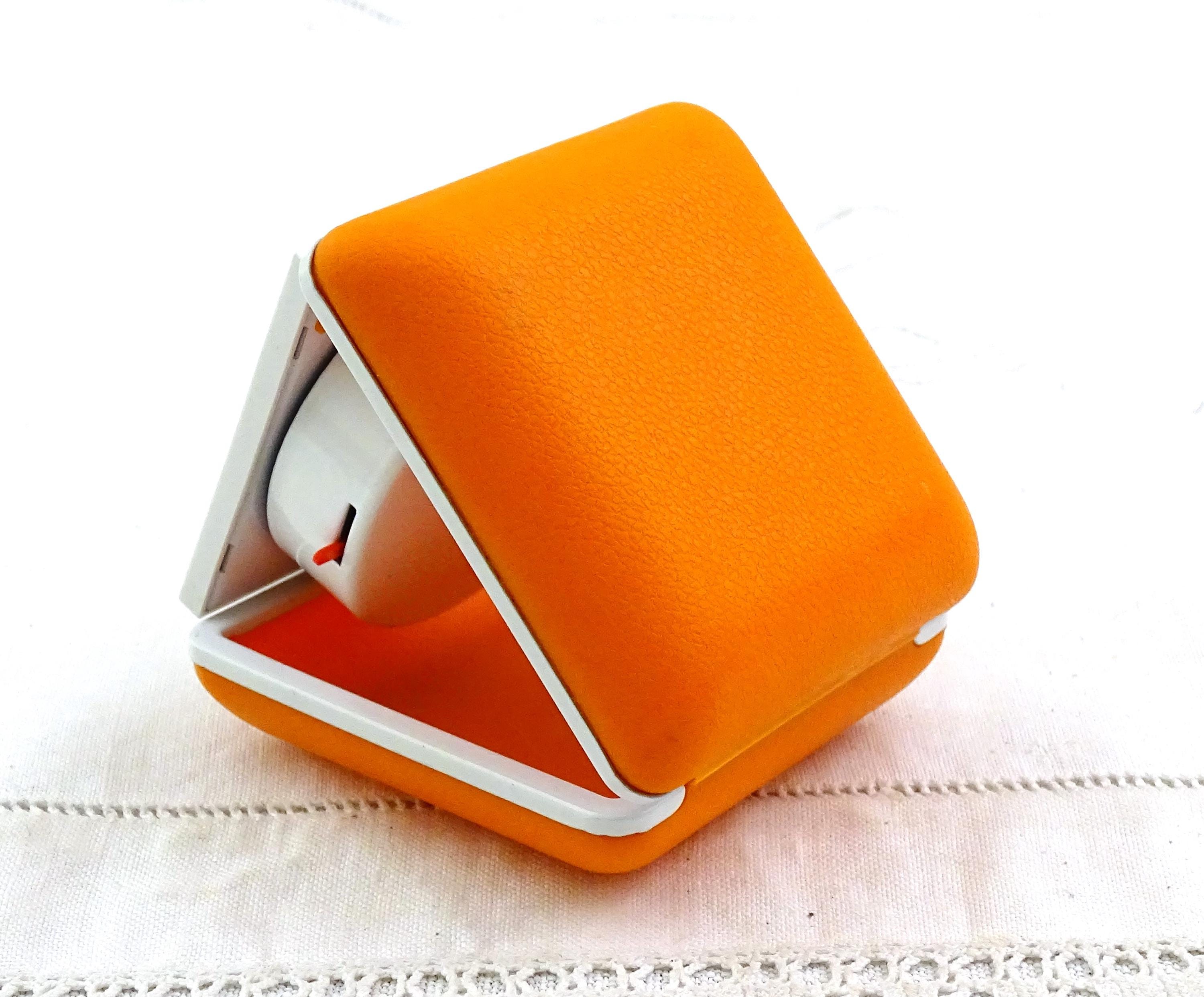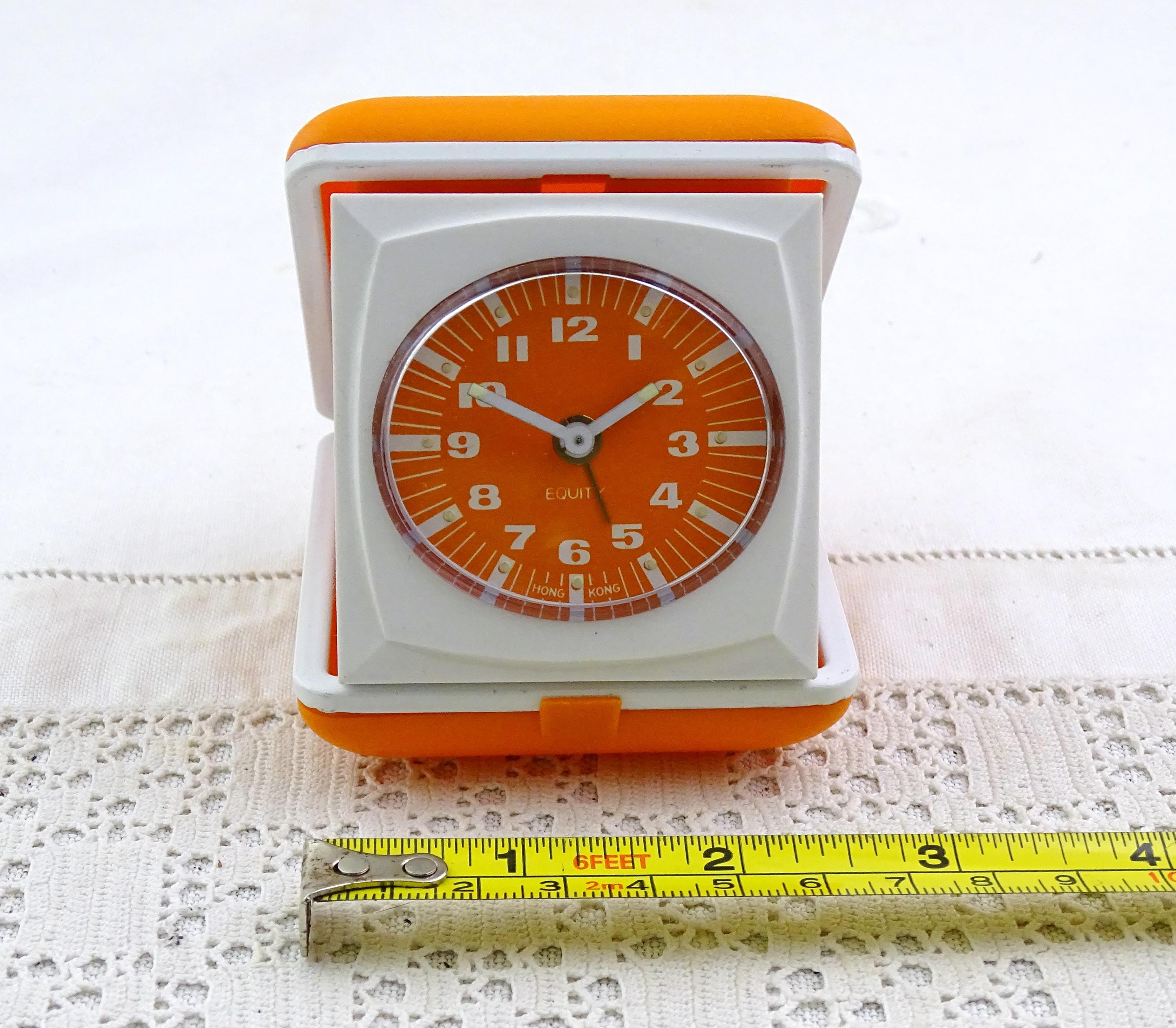 Vintage Mid Century bright orange folding mechanical travel alarm clock. Made by Equity in Hong Kong of strong plastic and metal. This clock is a wind up mechanism. Ca 1960s.