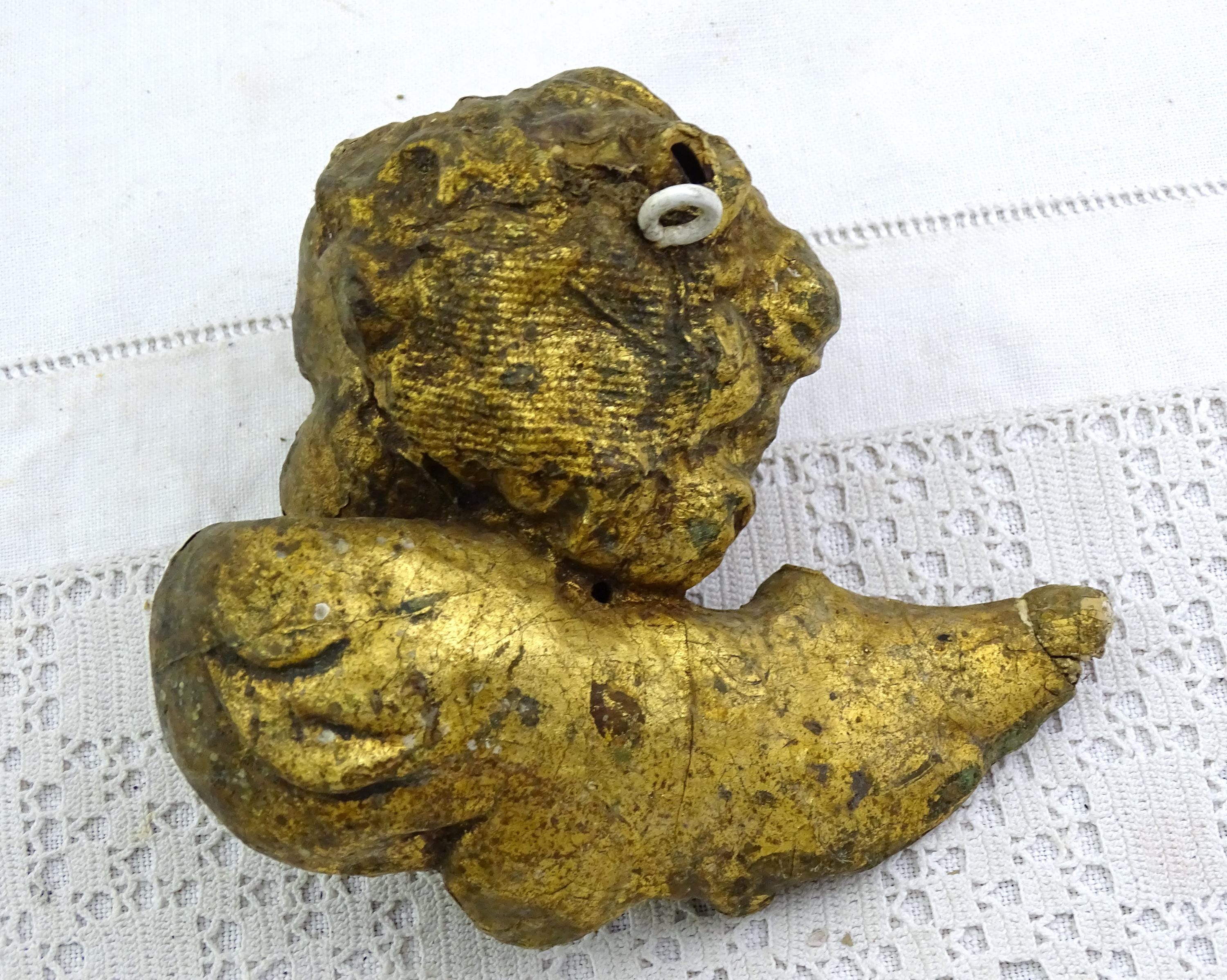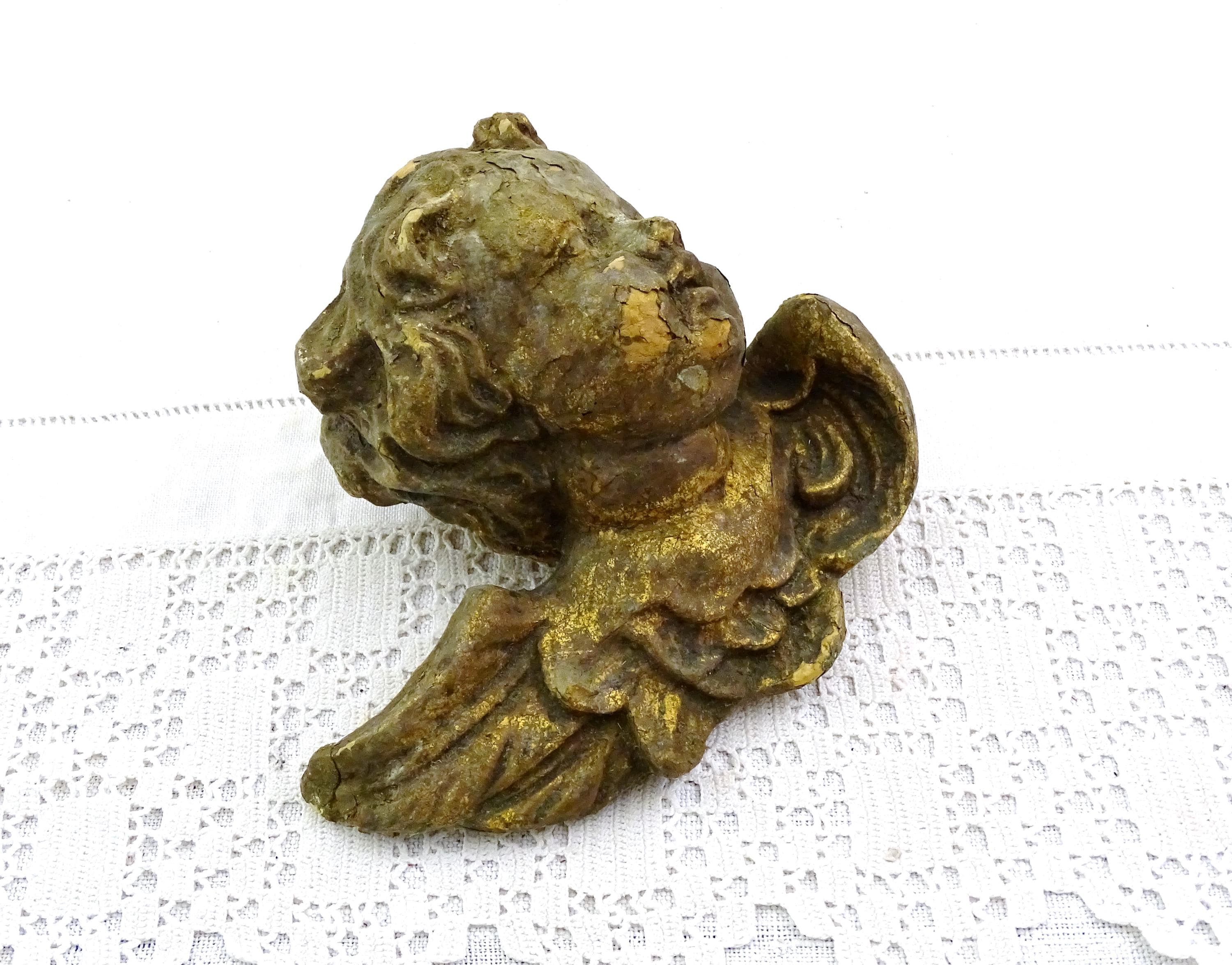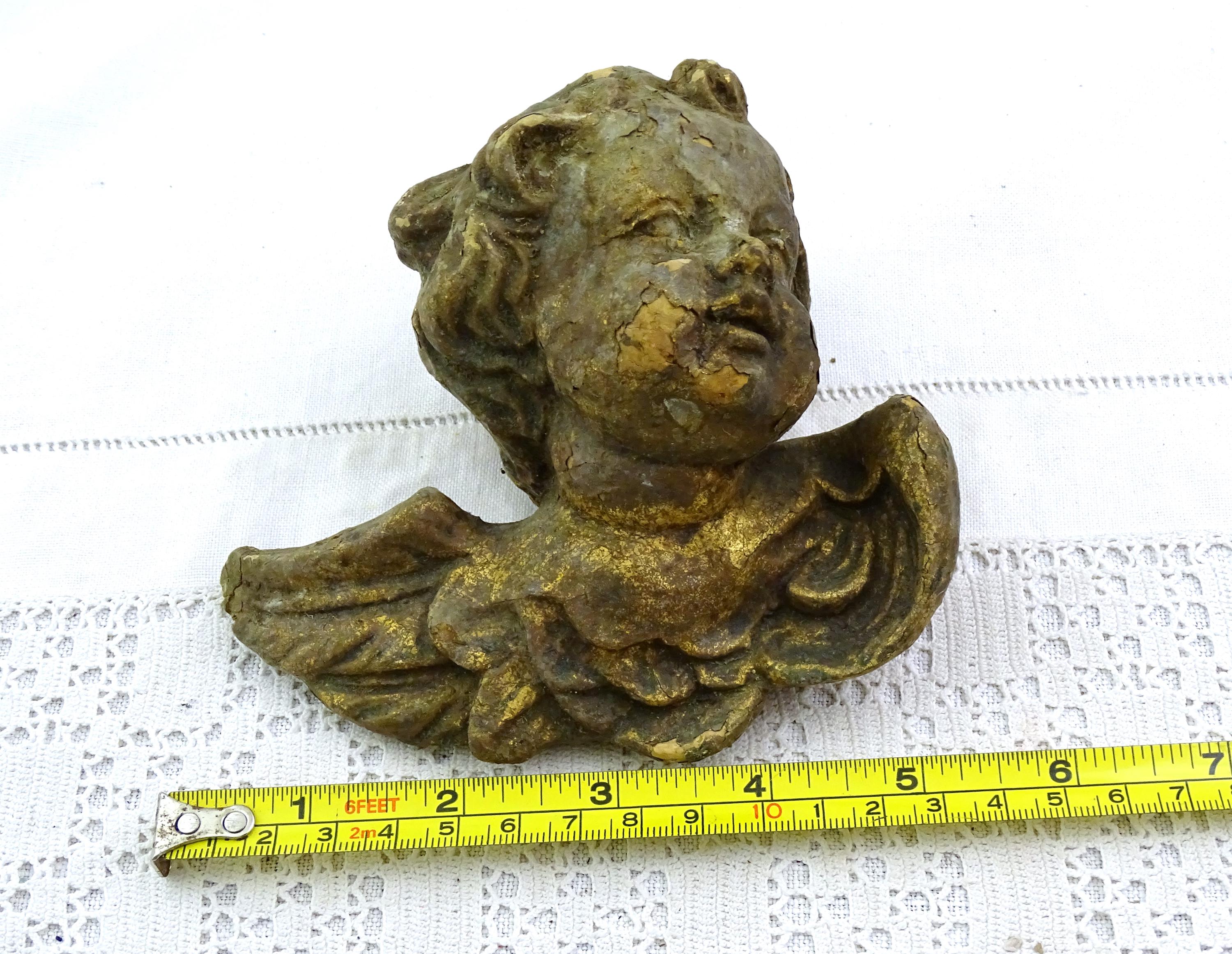 Antique wall hanging sculpture of cherub. Made of gilded plaster composite. Ca early to mid 1900s.