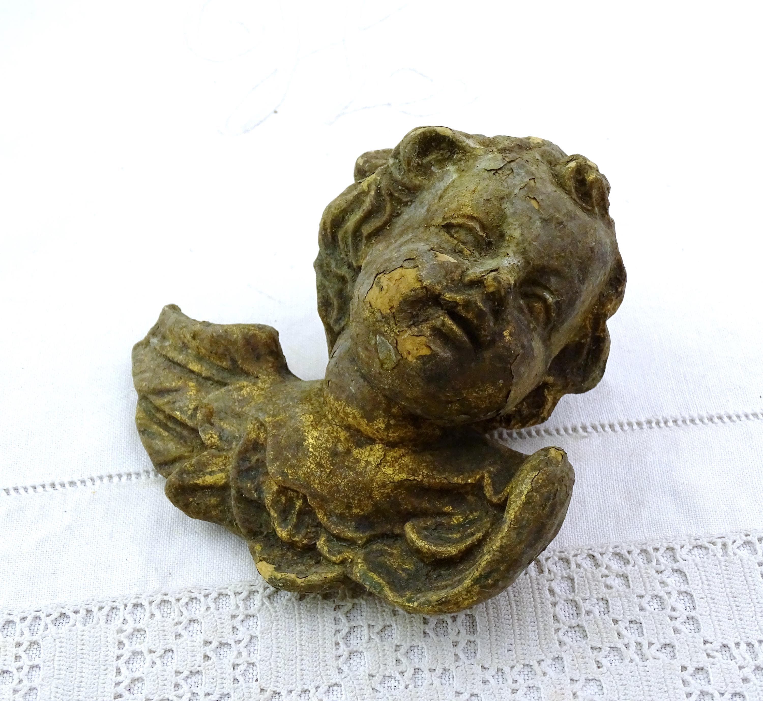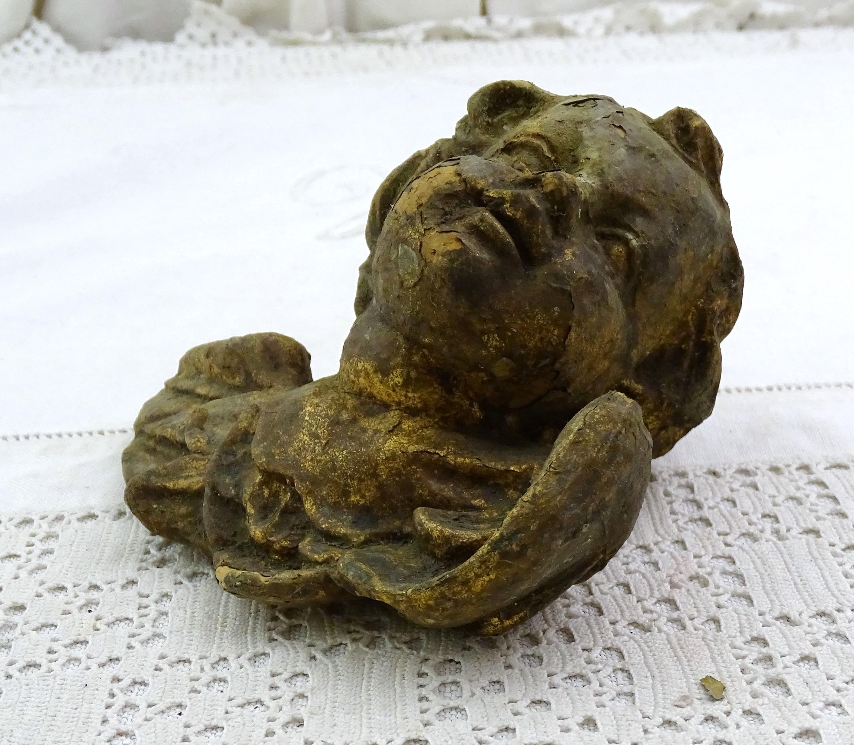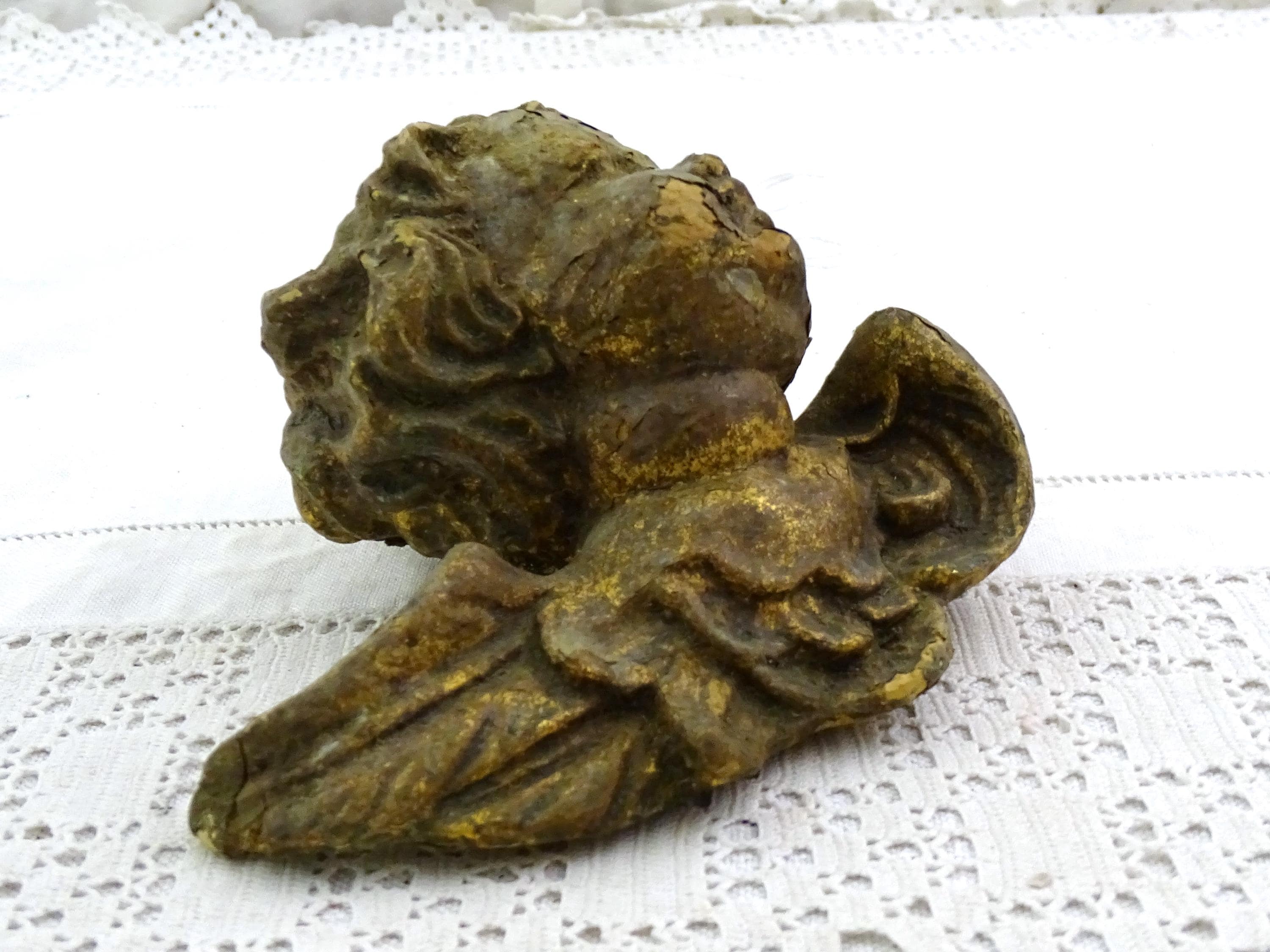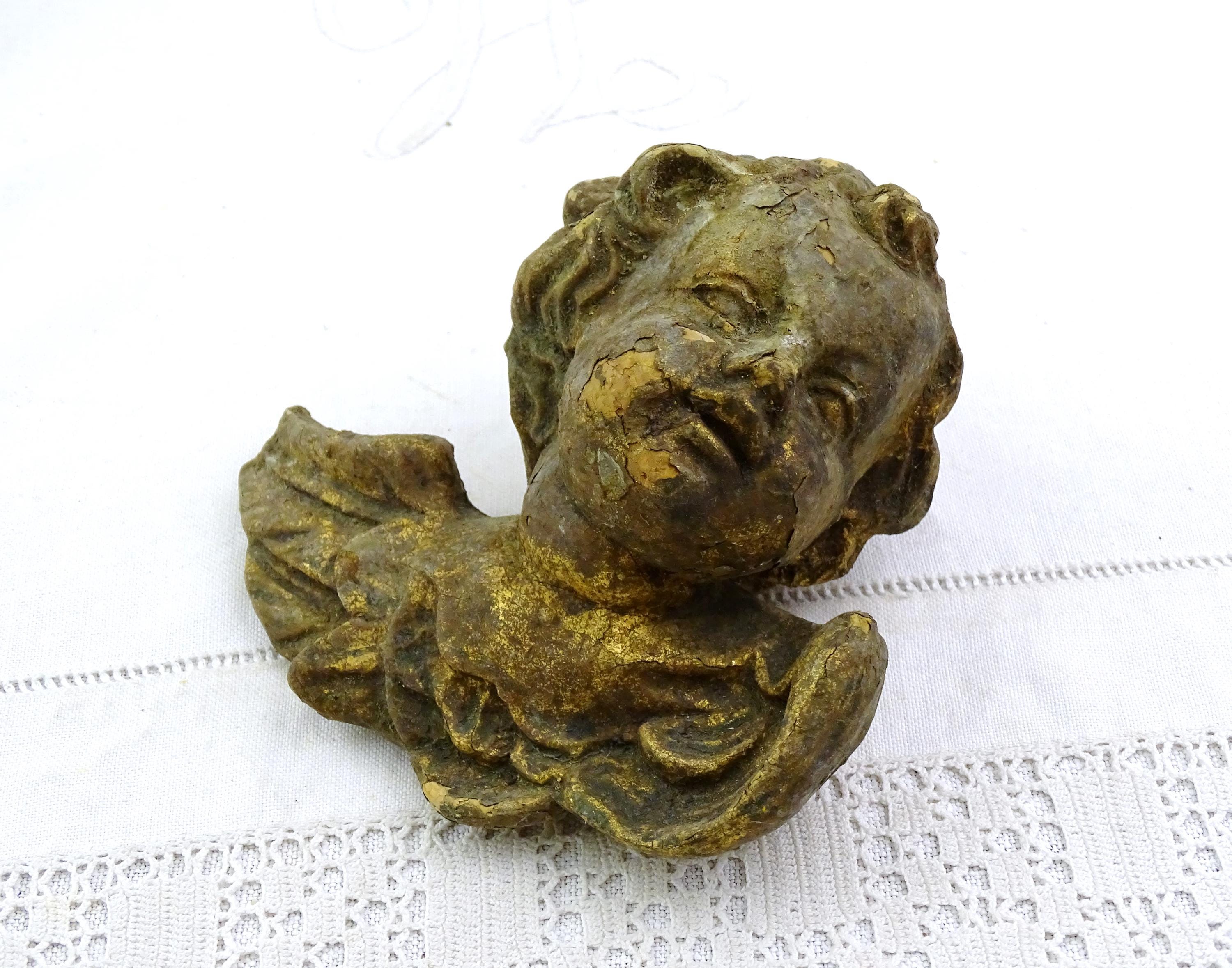 Antique wall hanging sculpture of cherub. Made of gilded plaster composite. Ca early to mid 1900s.