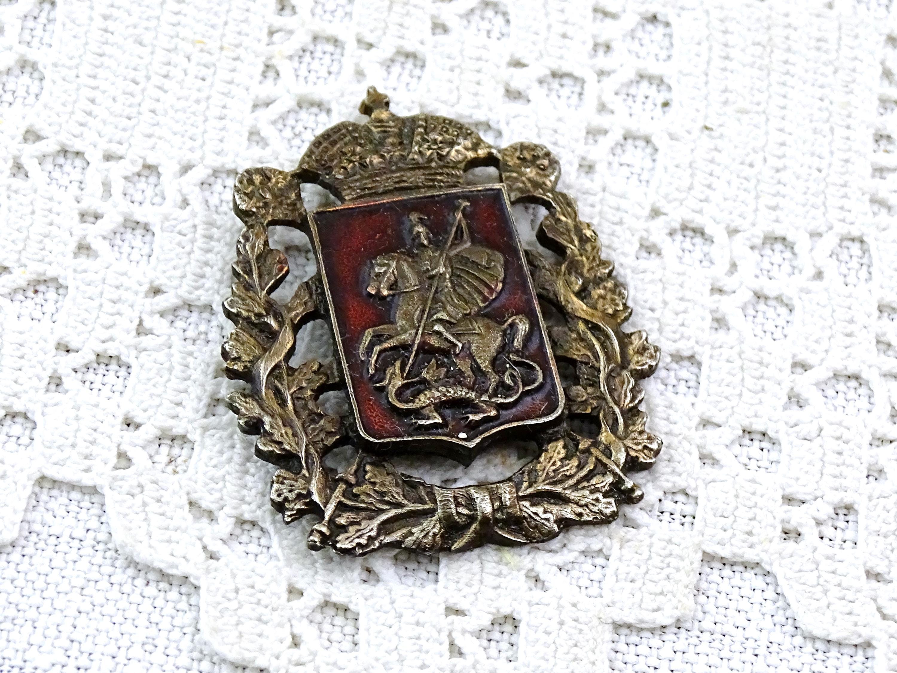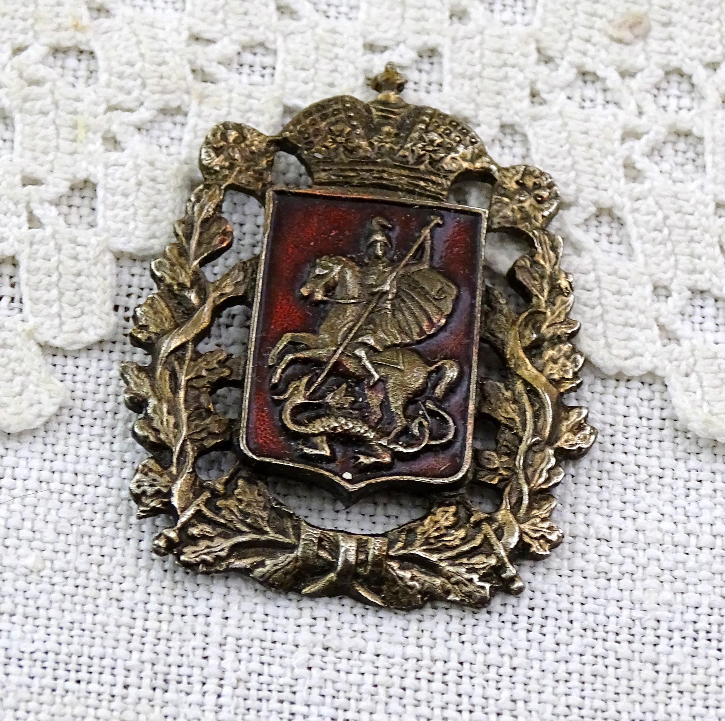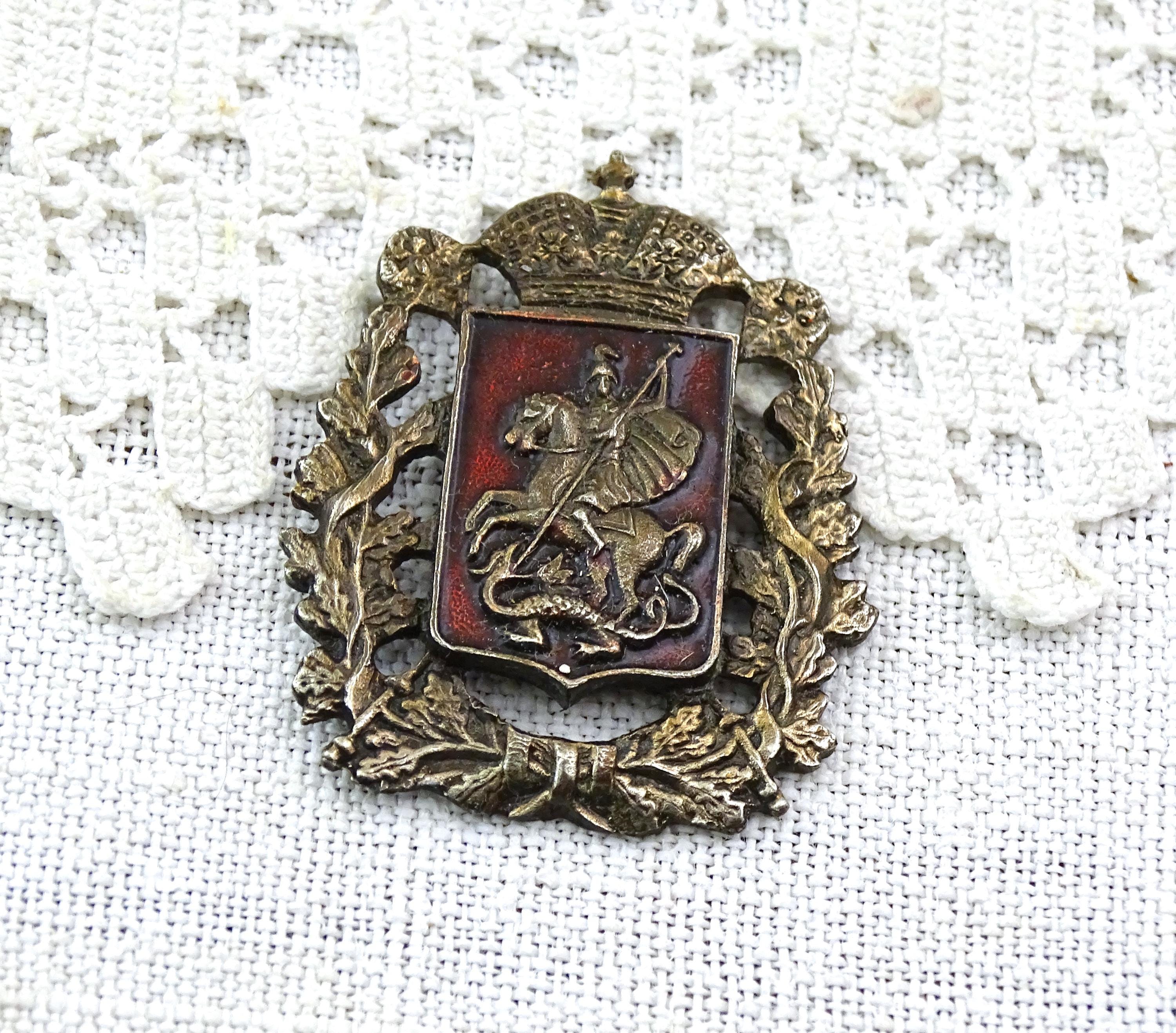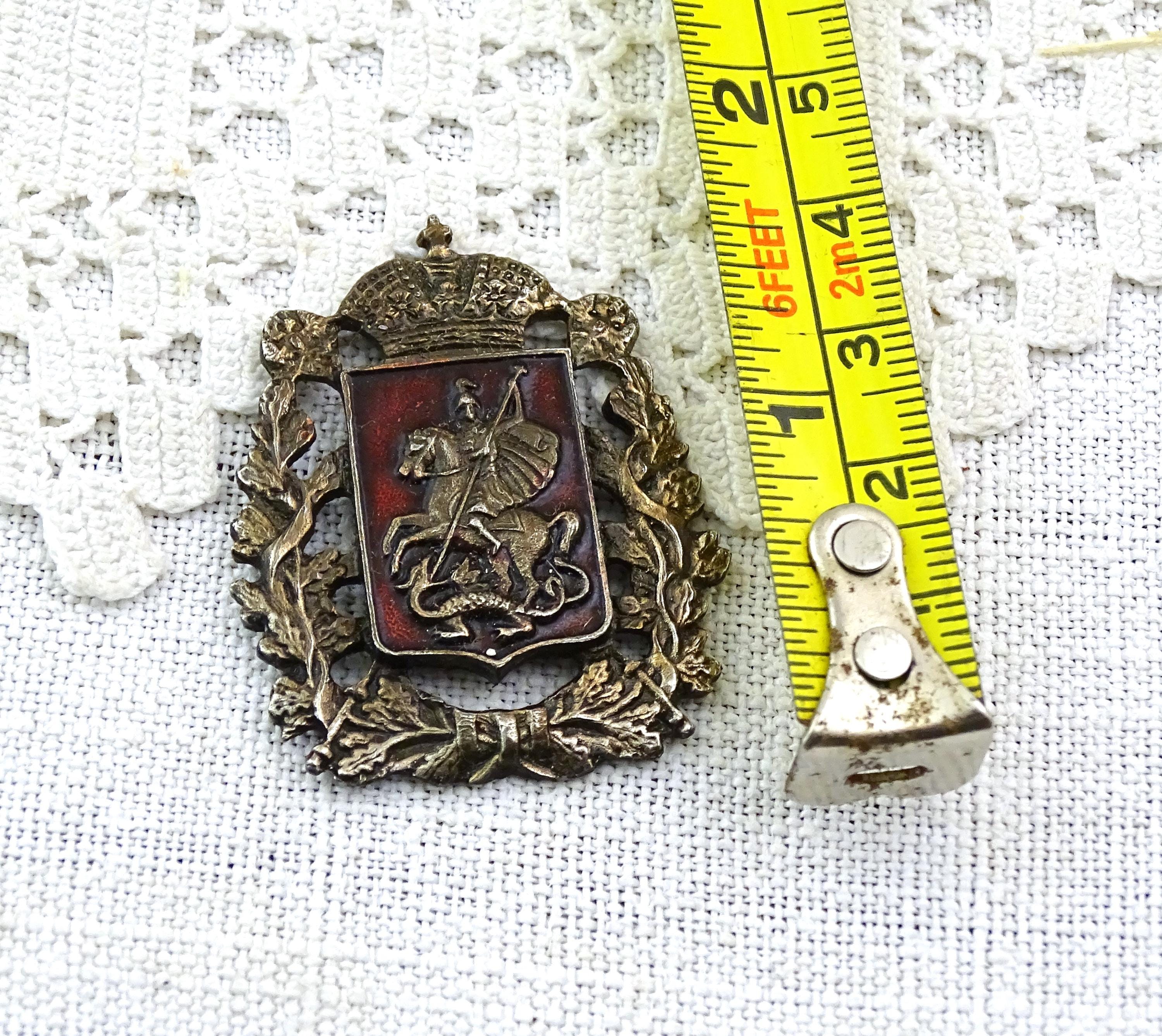 Antique Saint George and the dragon pin. Made of silver plated metal with red enamel. Ca early 1900s.
