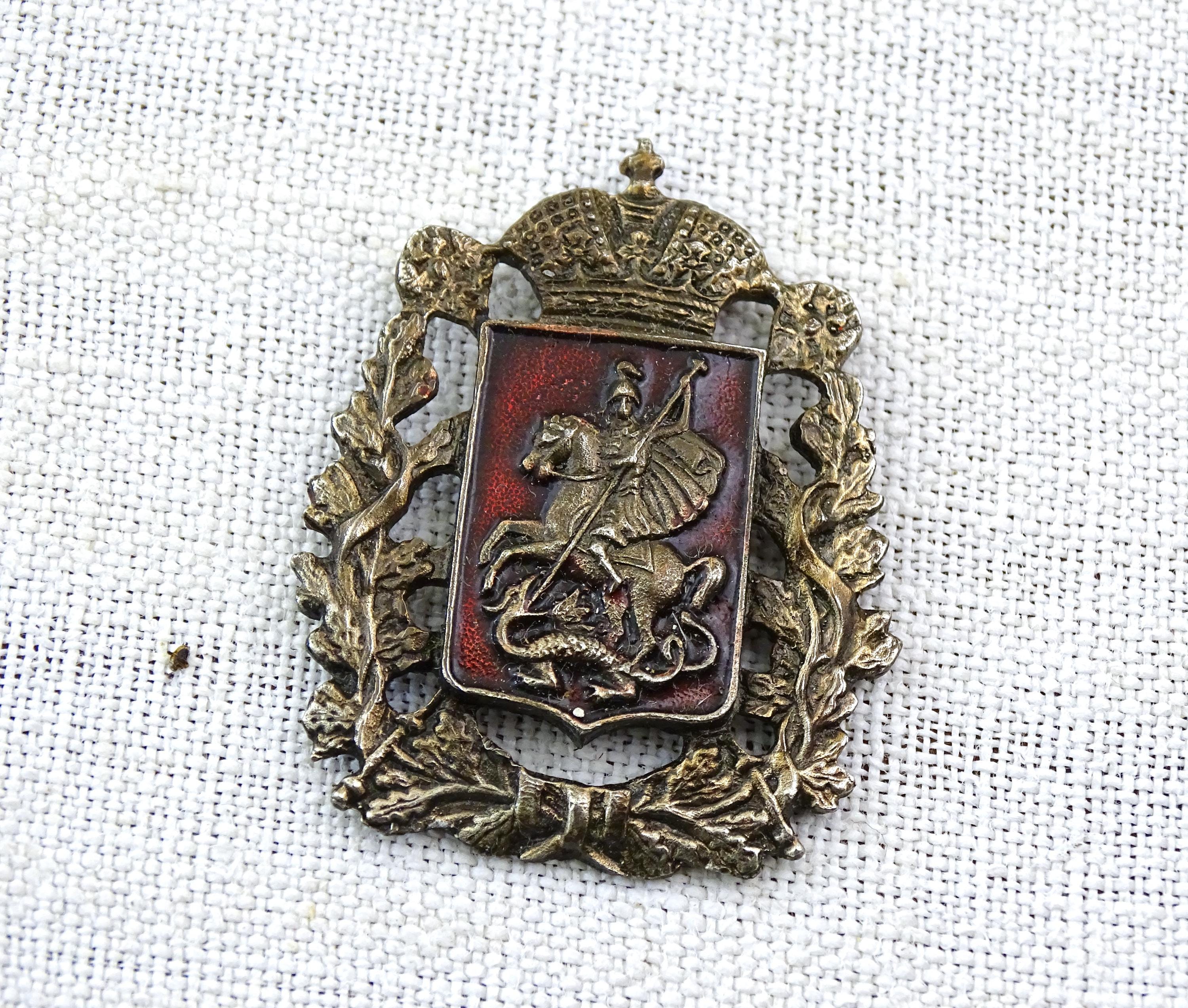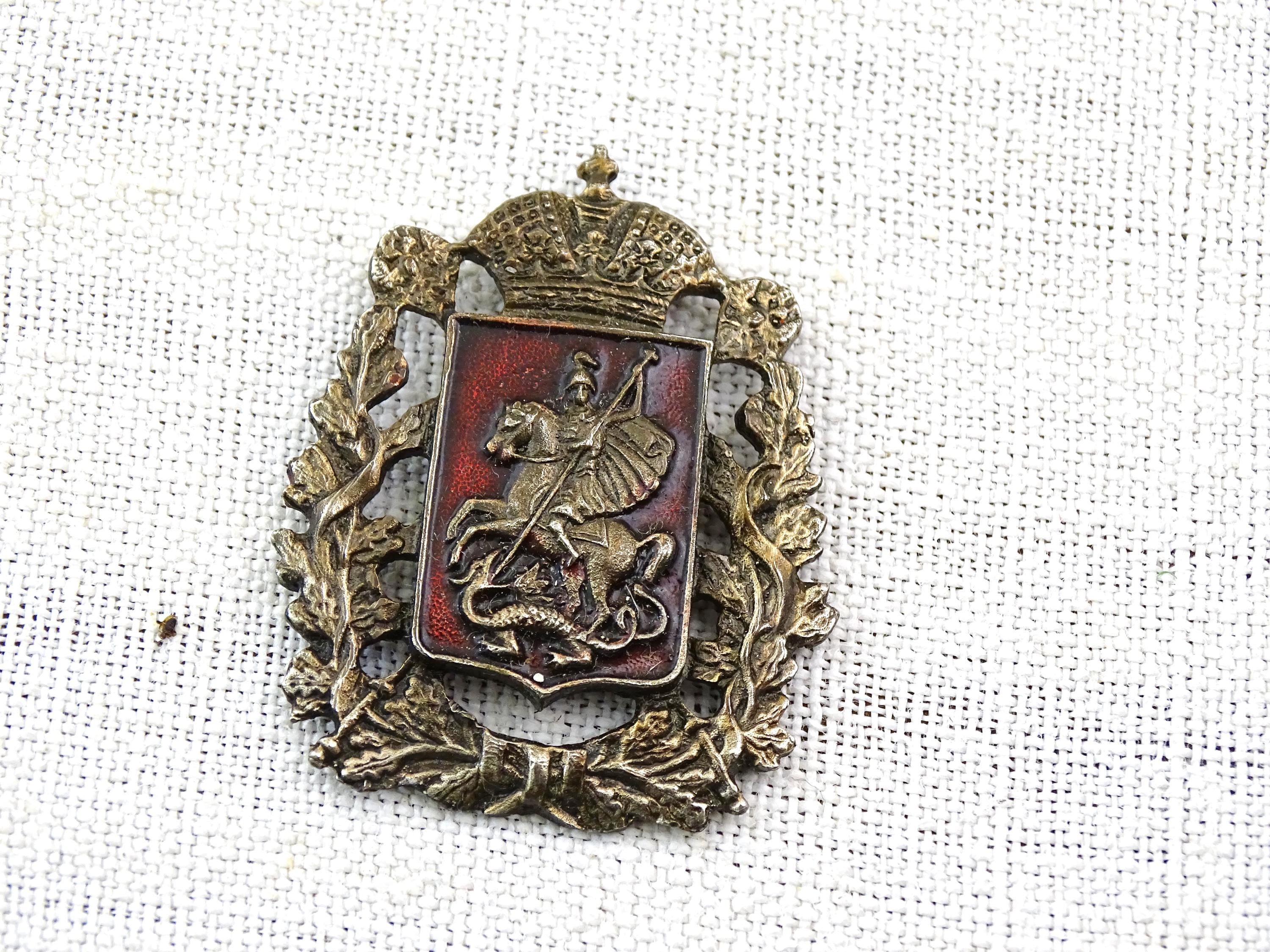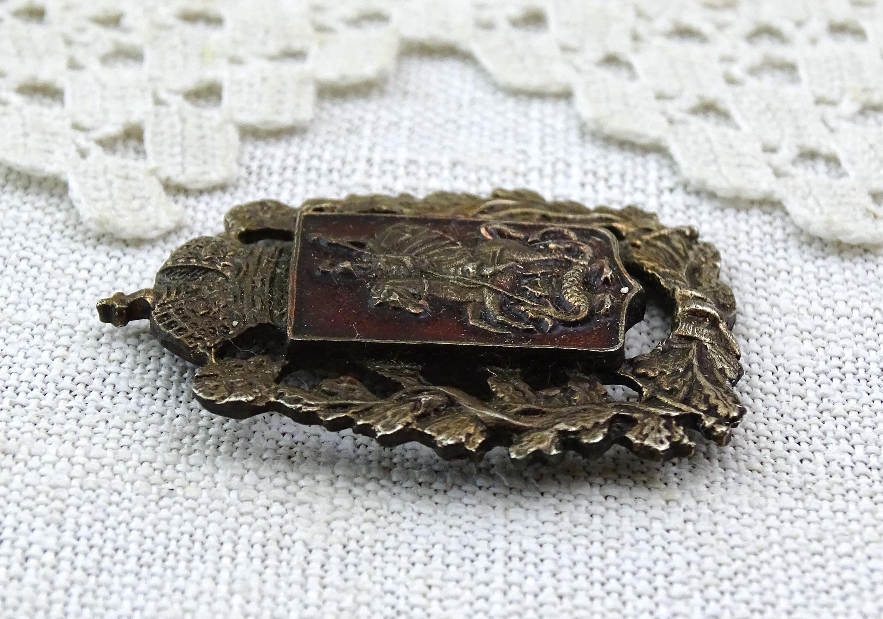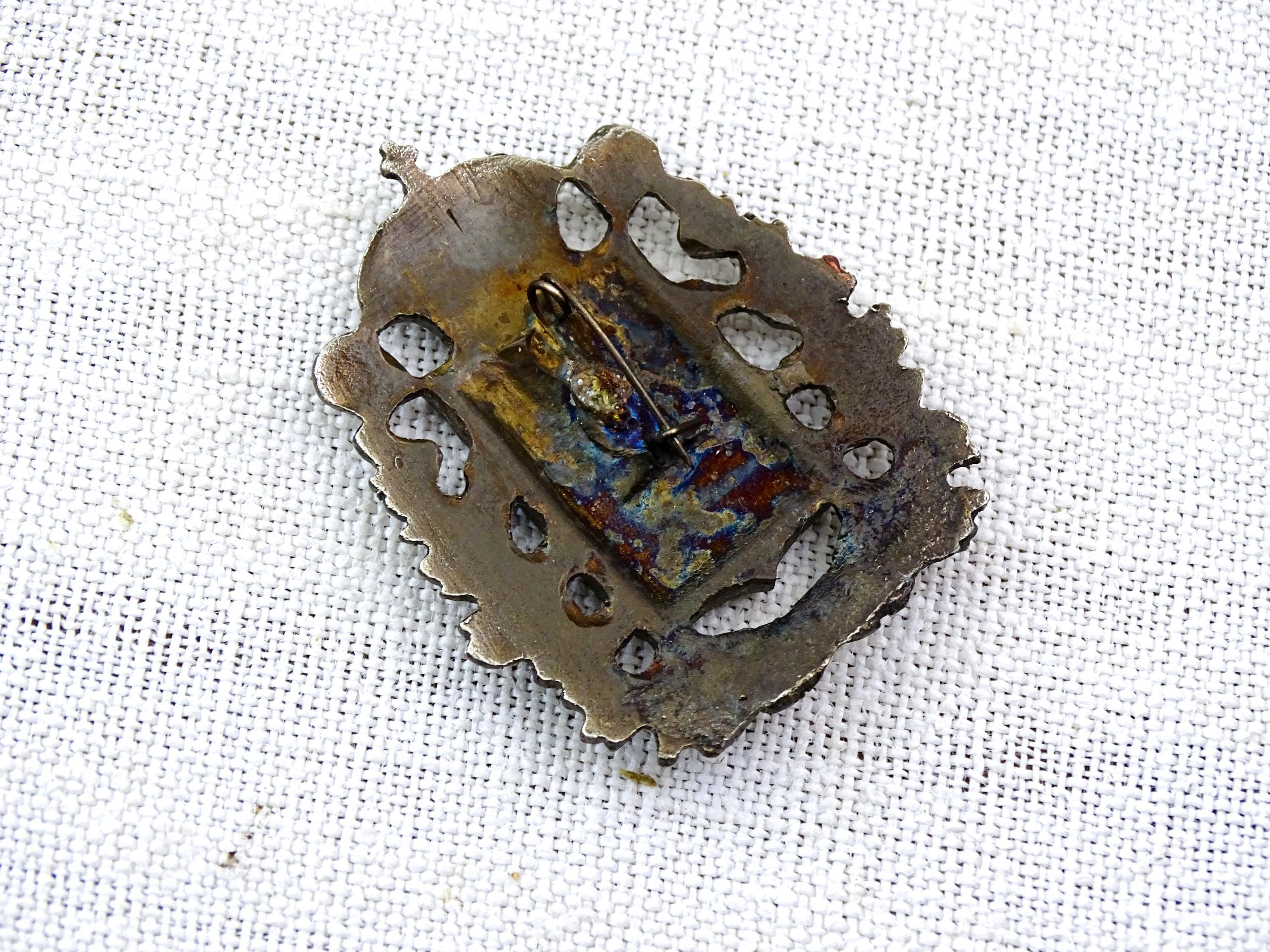 Antique Saint George and the dragon pin. Made of silver plated metal with red enamel. Ca early 1900s.
