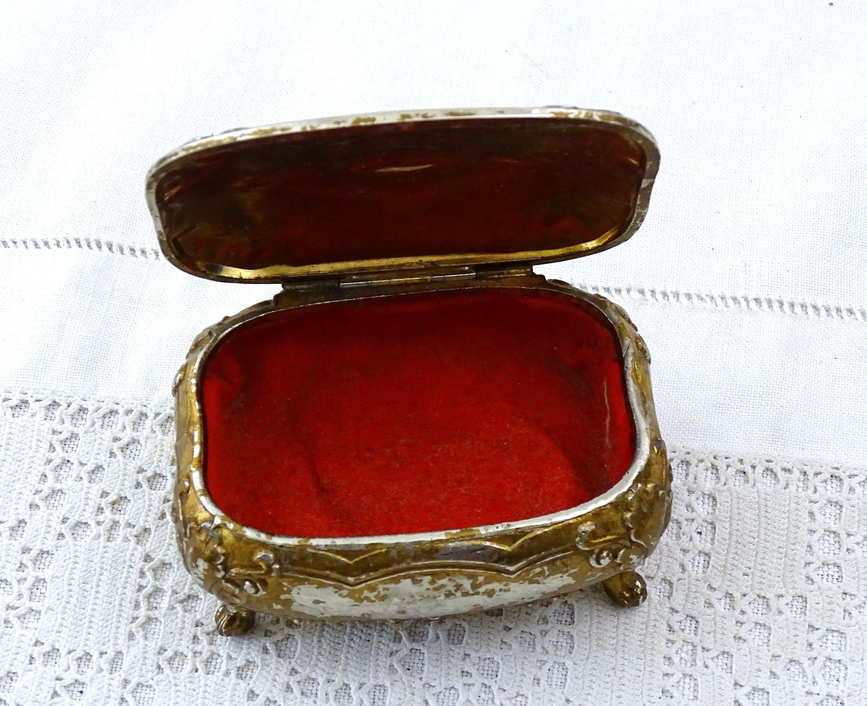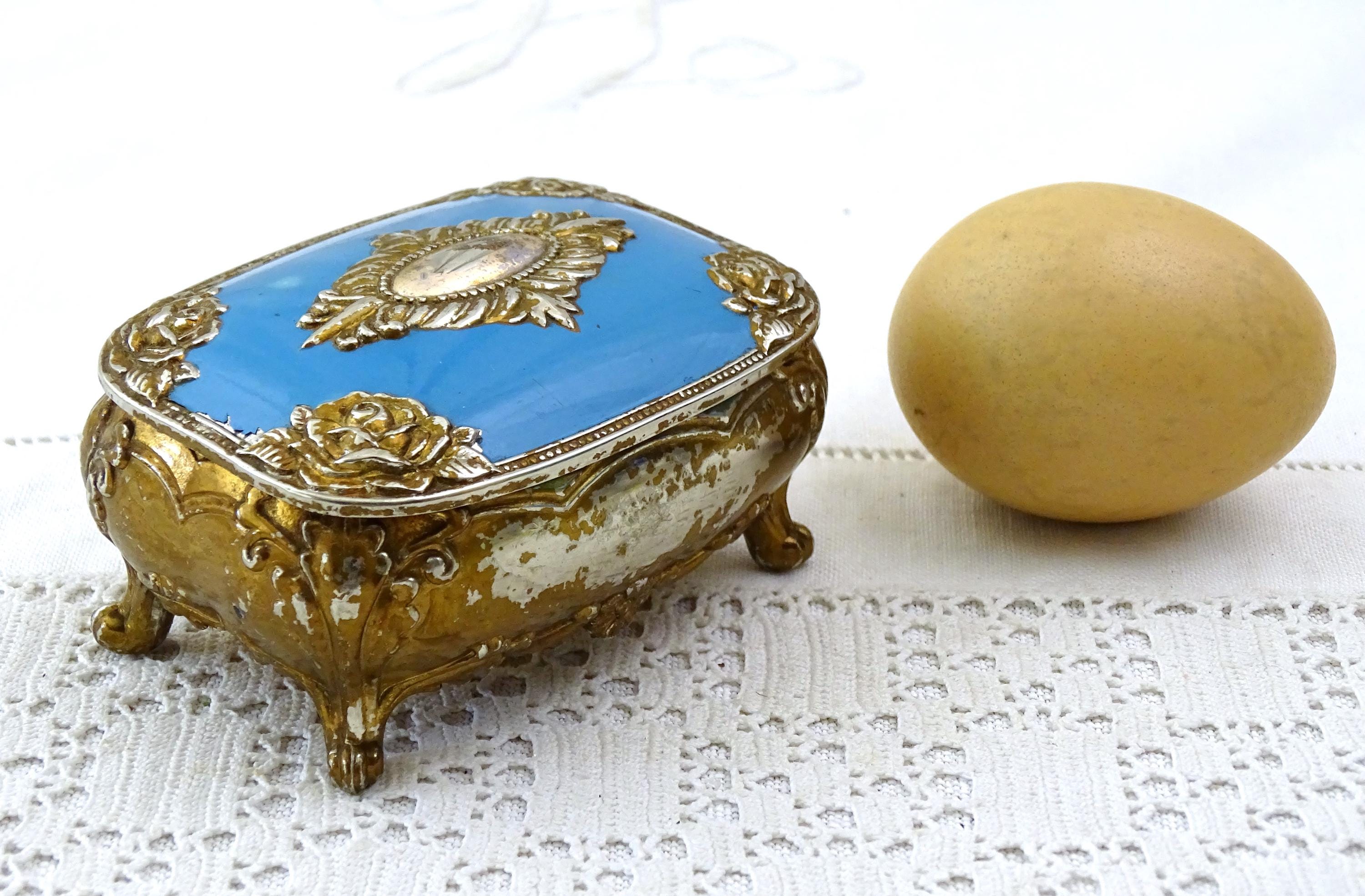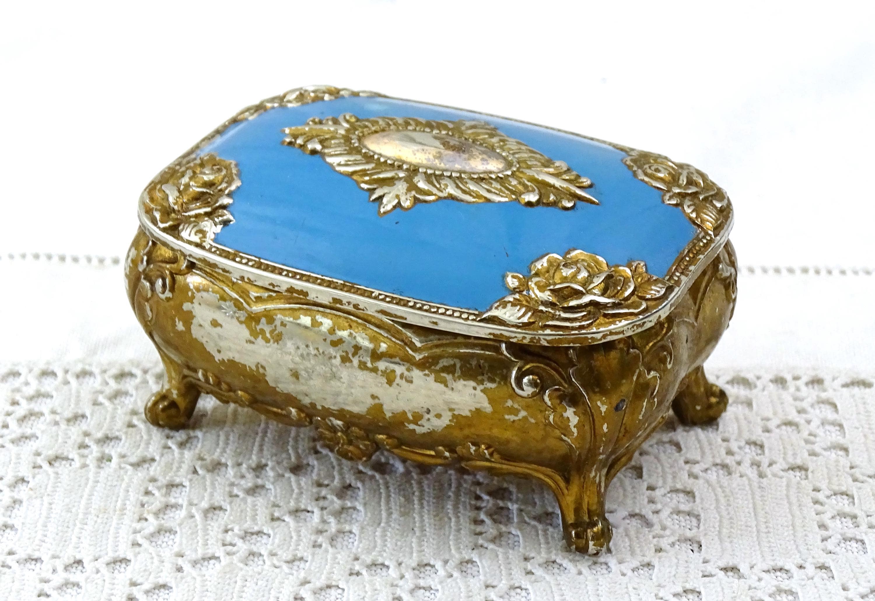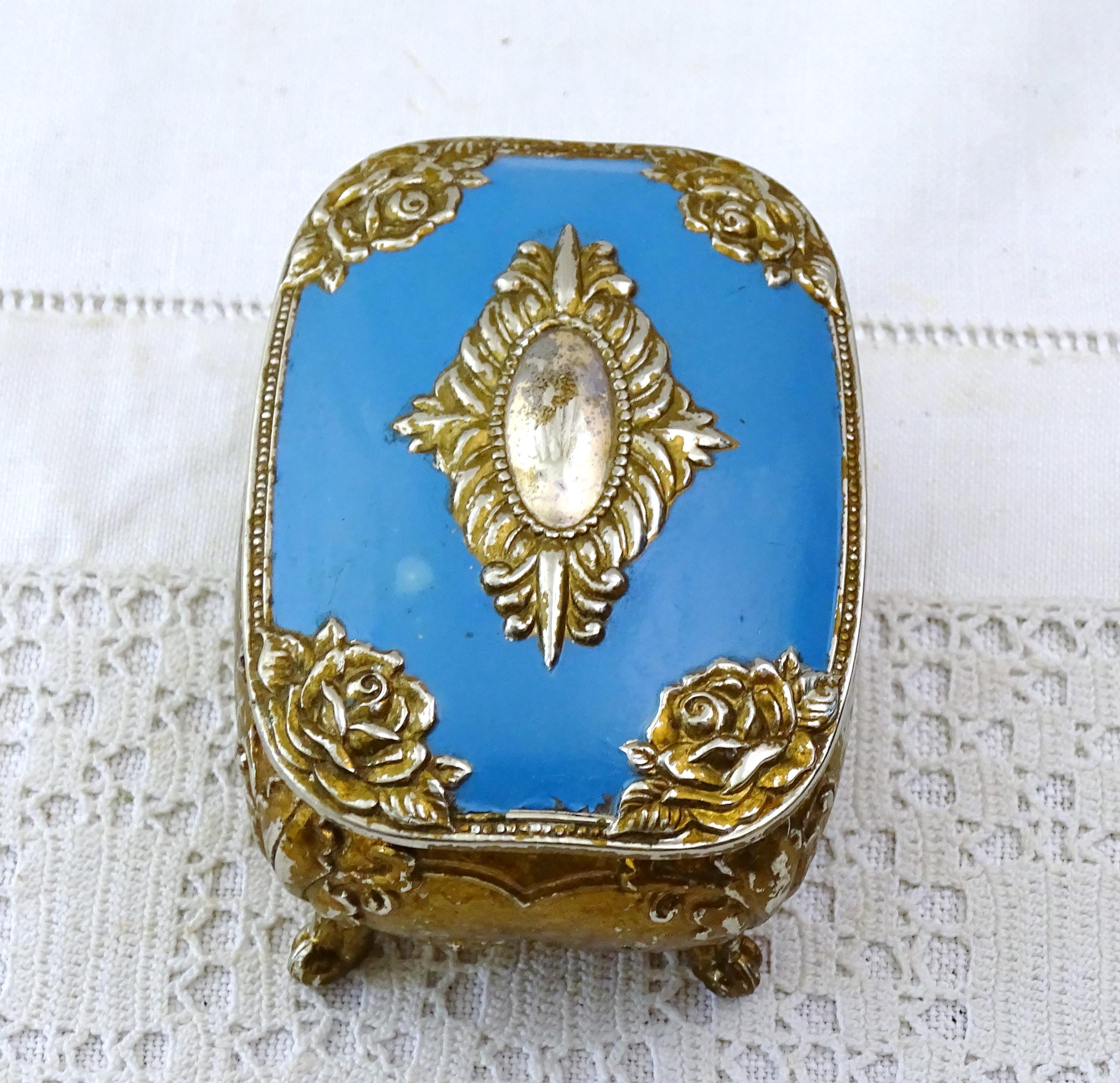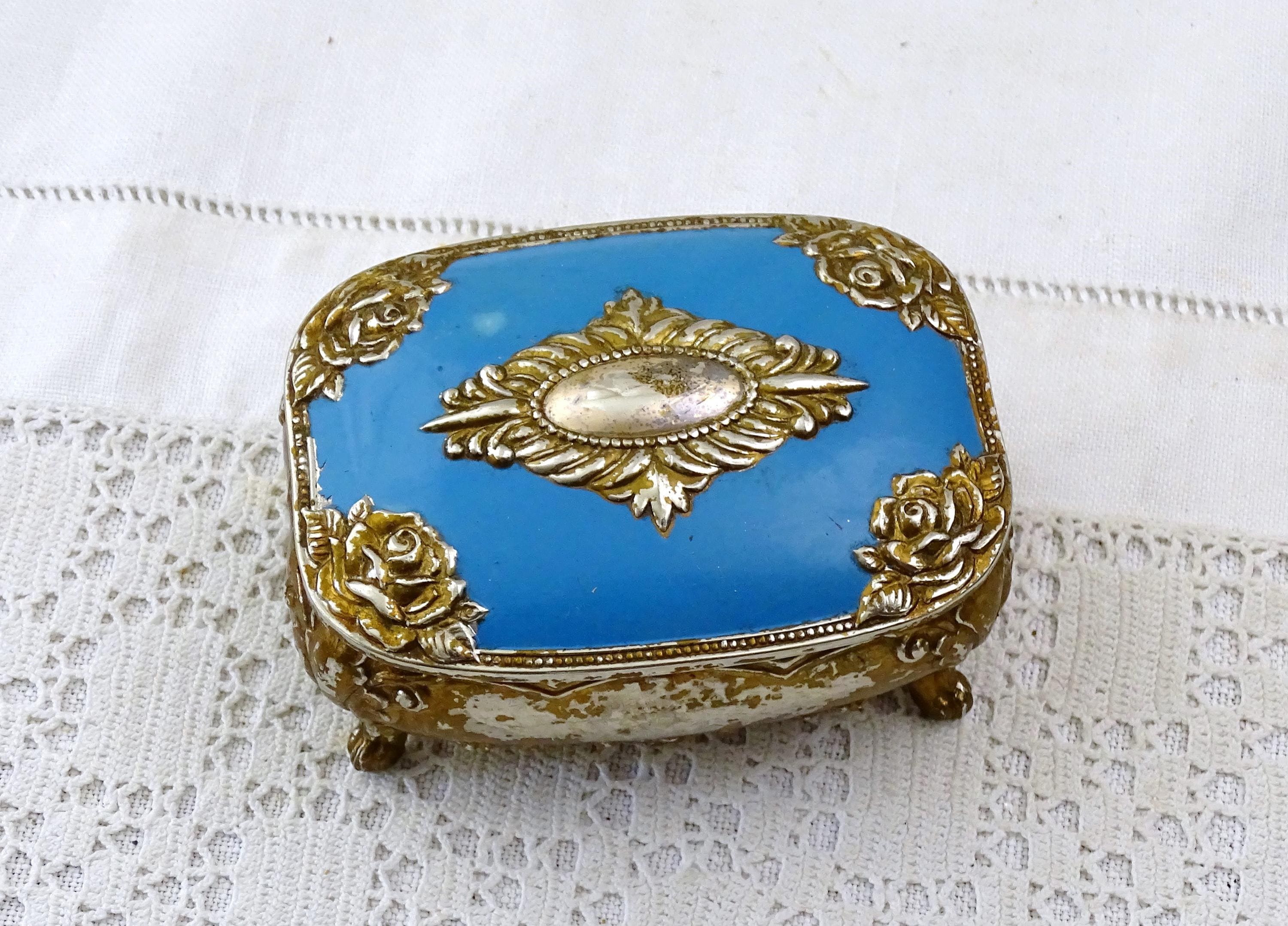 Small vintage Rococo style trinket box. Made of blue lacquered metal with worn bronzed patina effect. Ca late 1900s.
