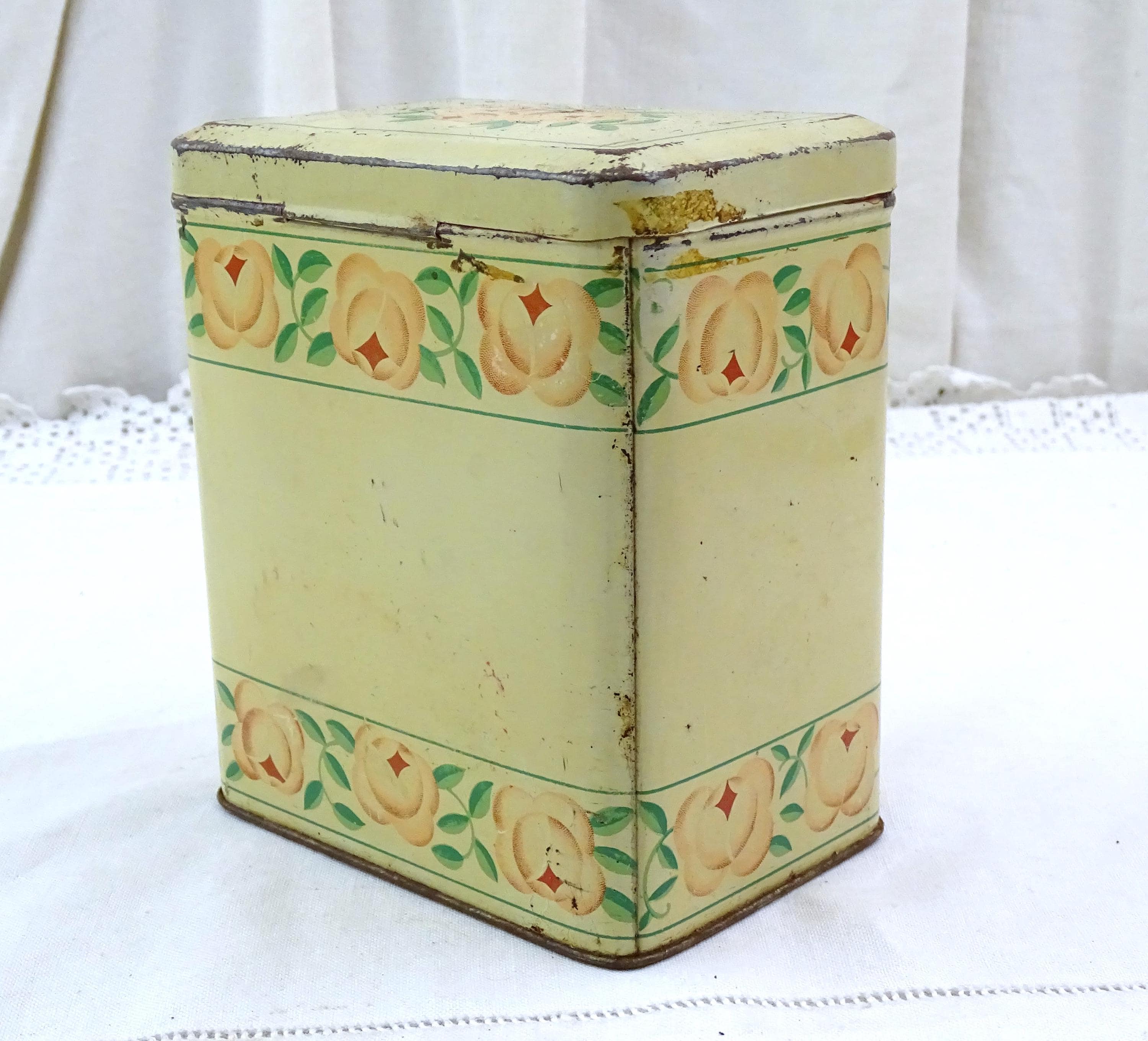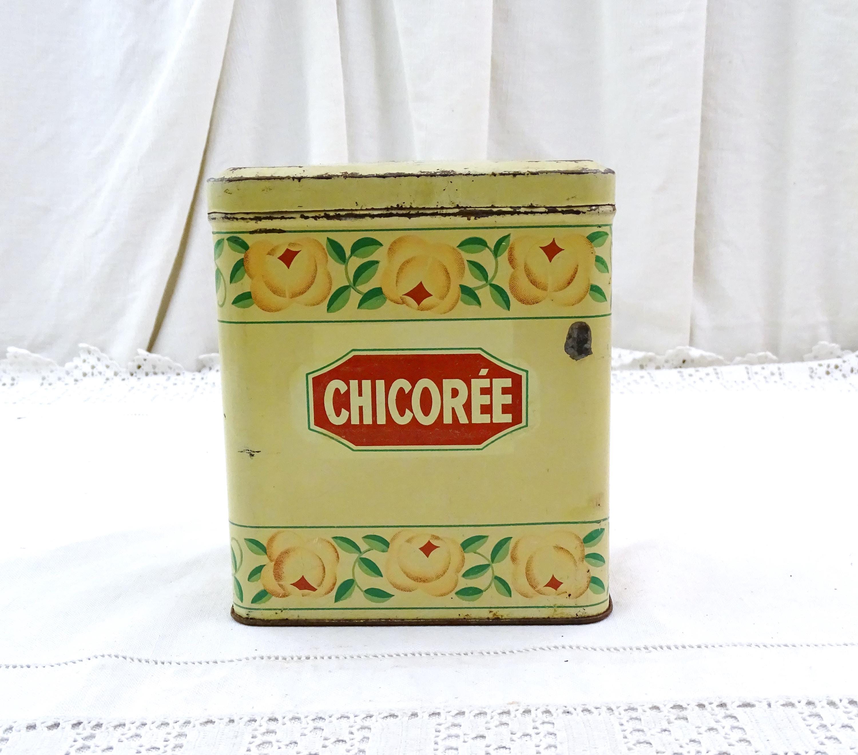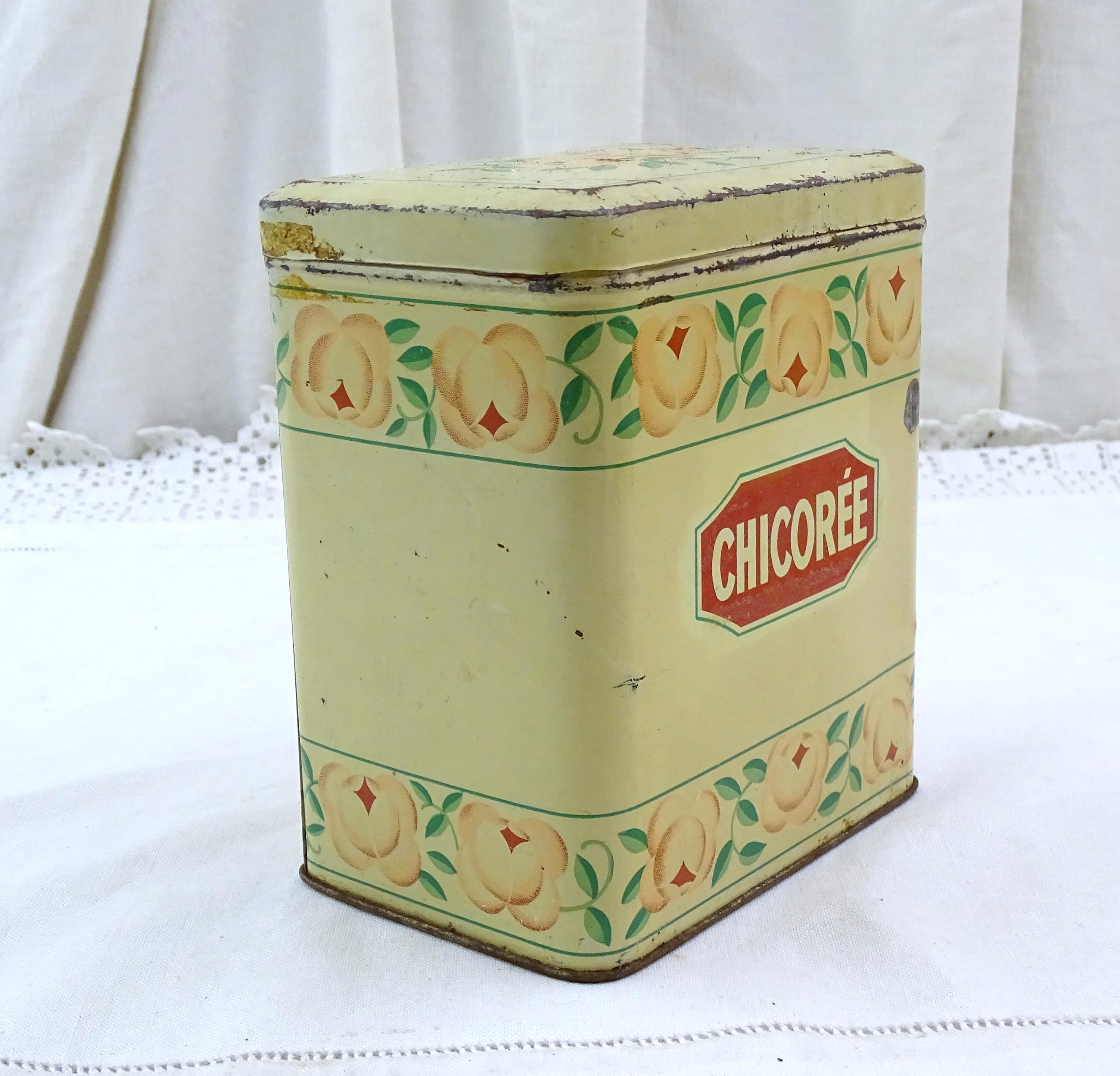 Vintage French canister tin for chicorée. Made of lithographed metal in beige color with pink rose pattern. Ca 1920s