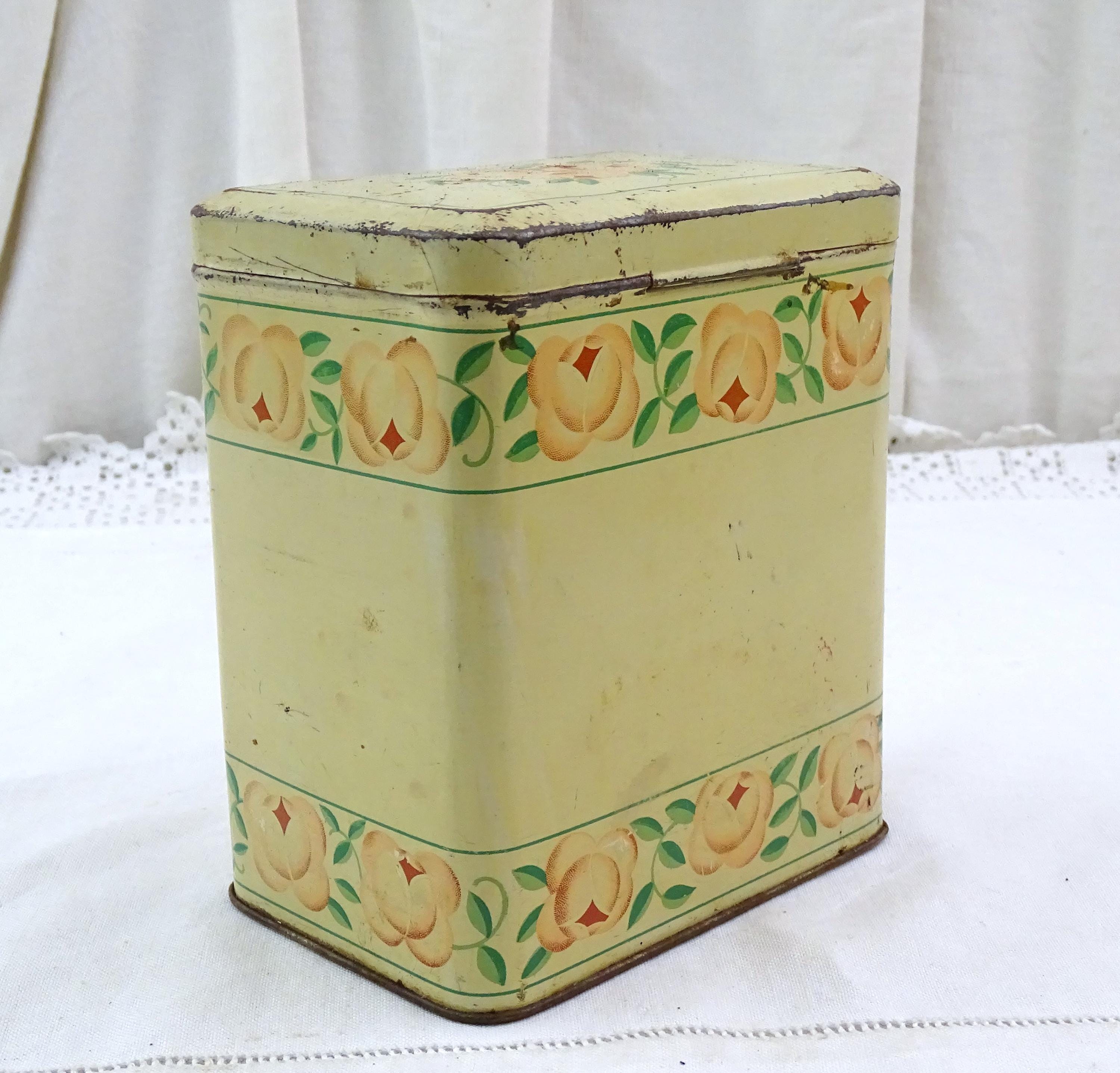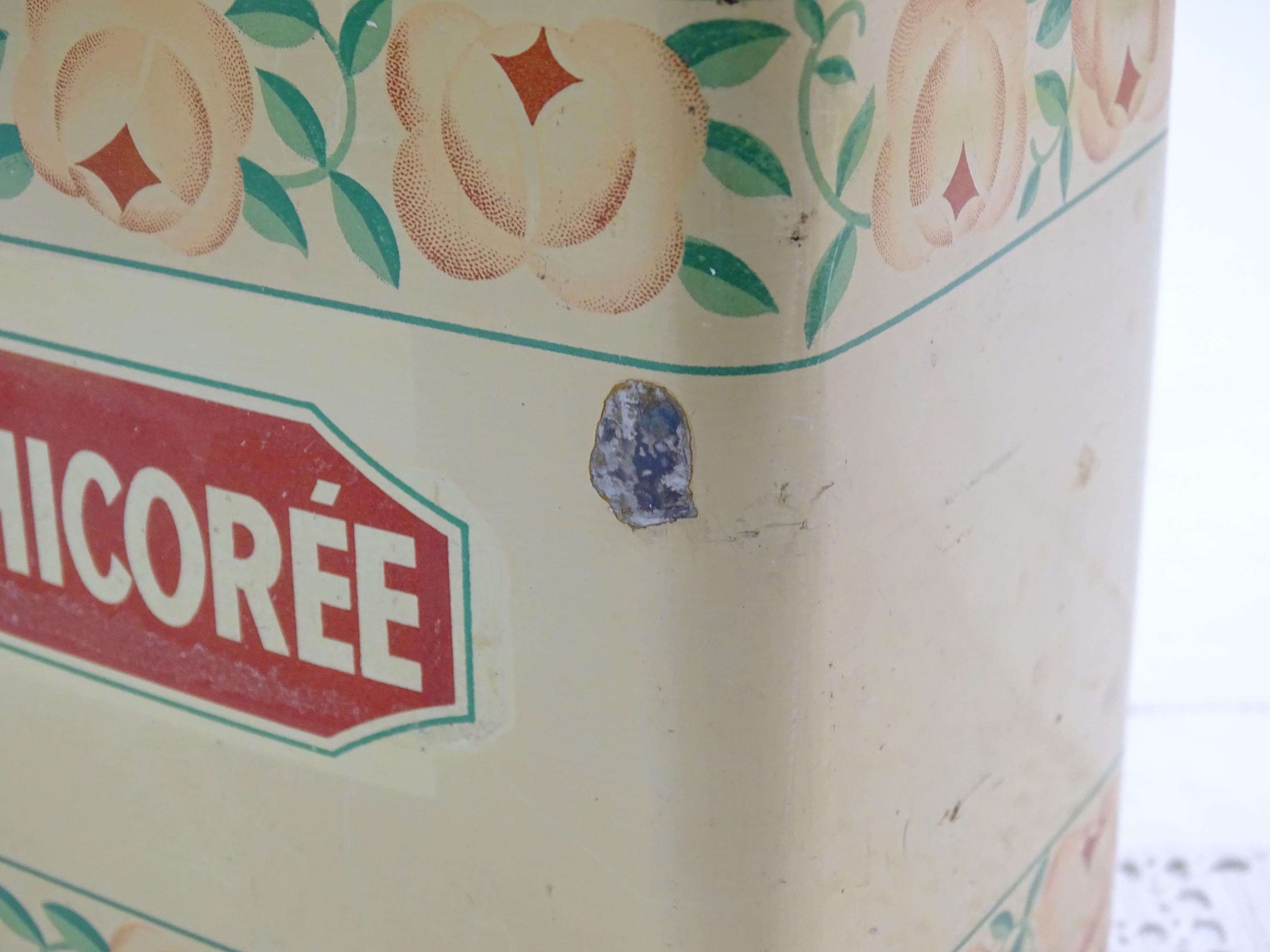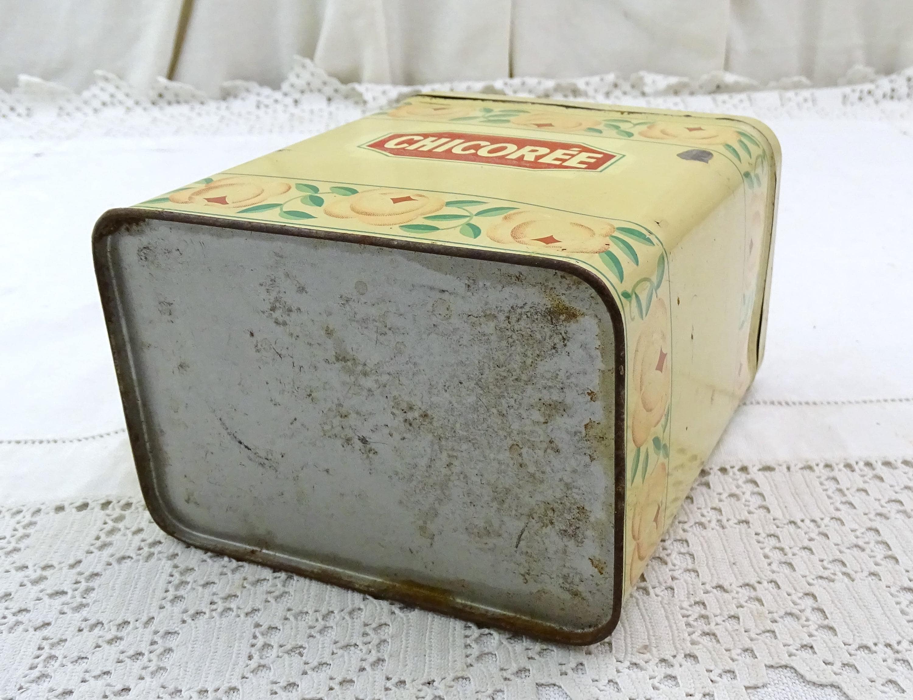 Vintage French canister tin for chicorée. Made of lithographed metal in beige color with pink rose pattern. Ca 1920s