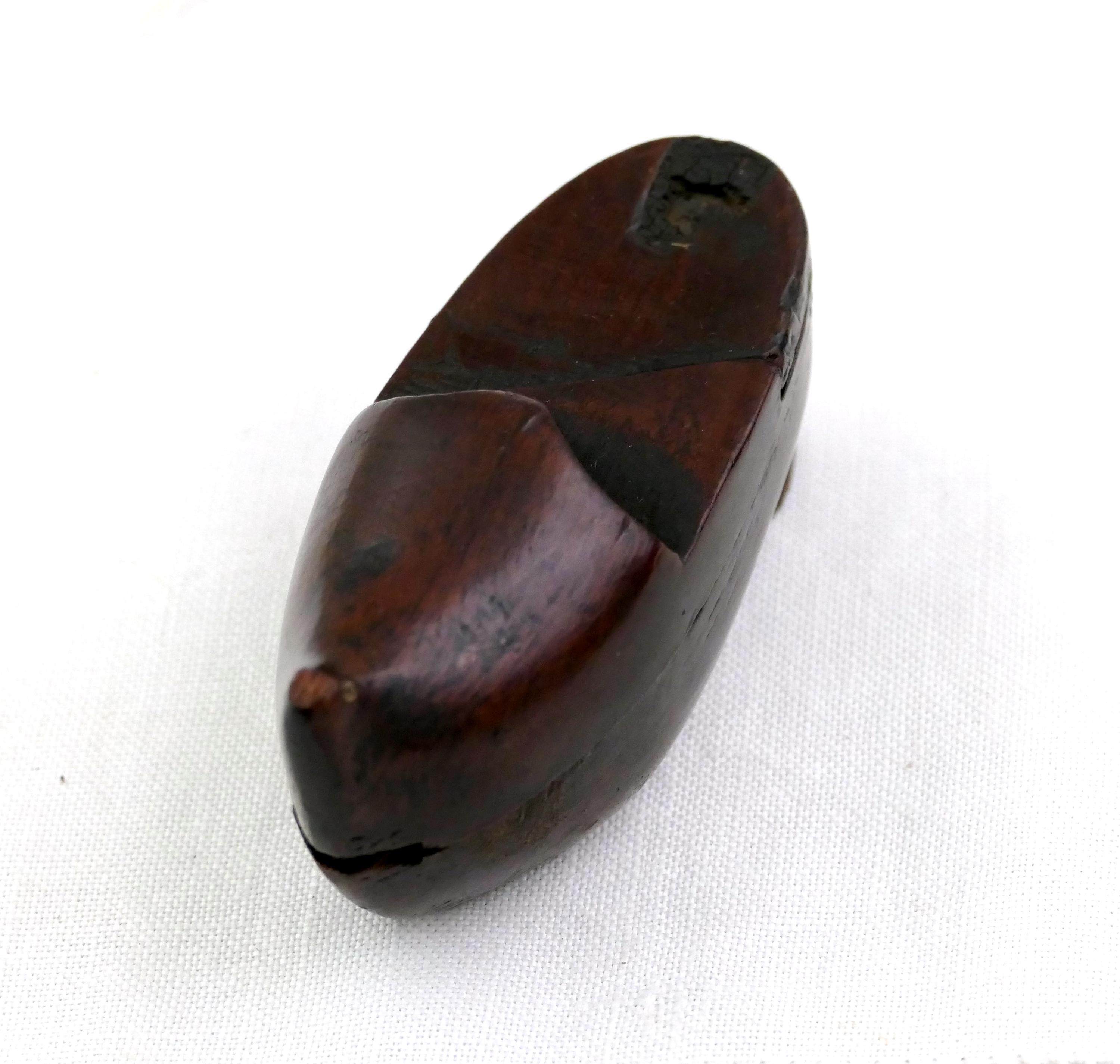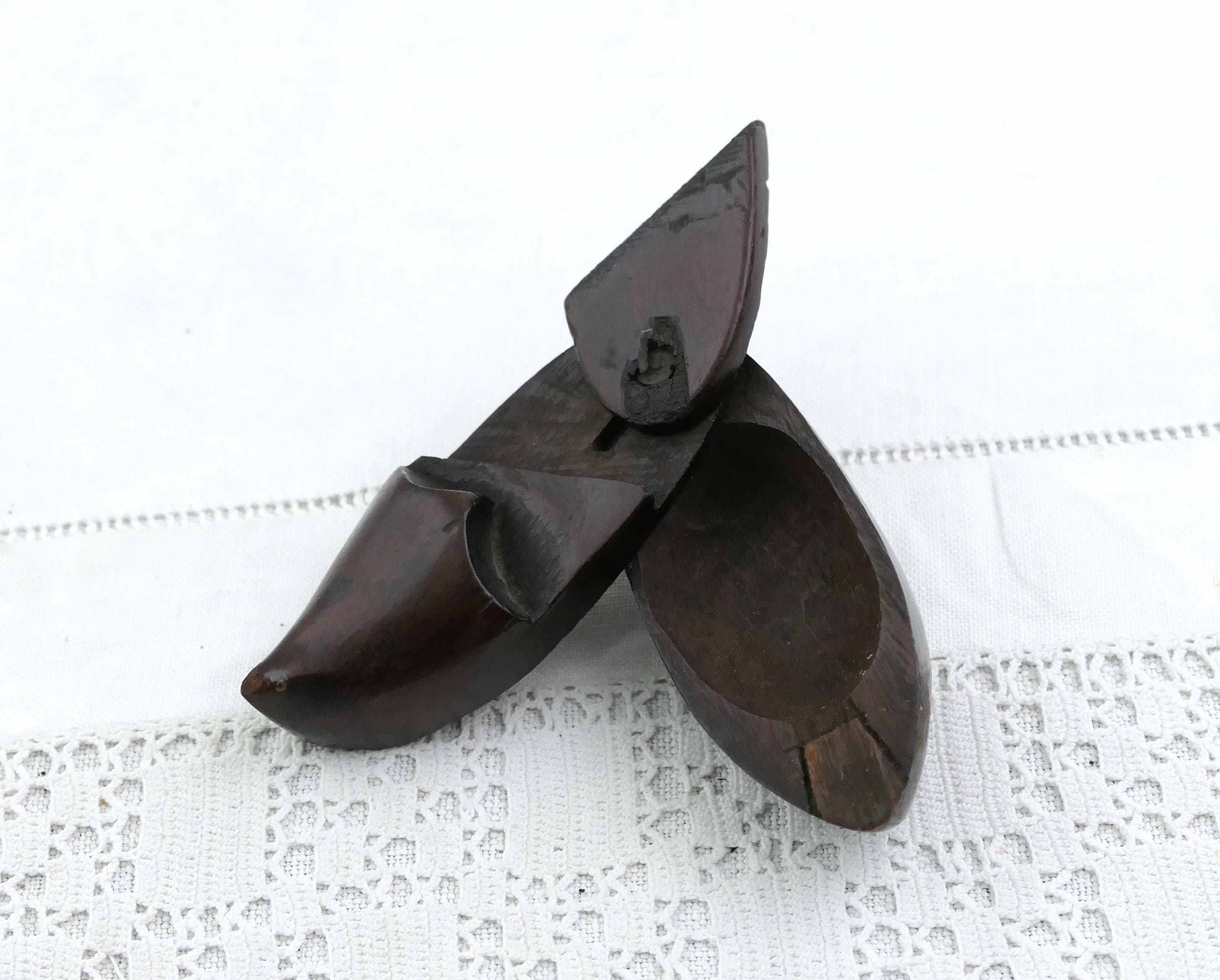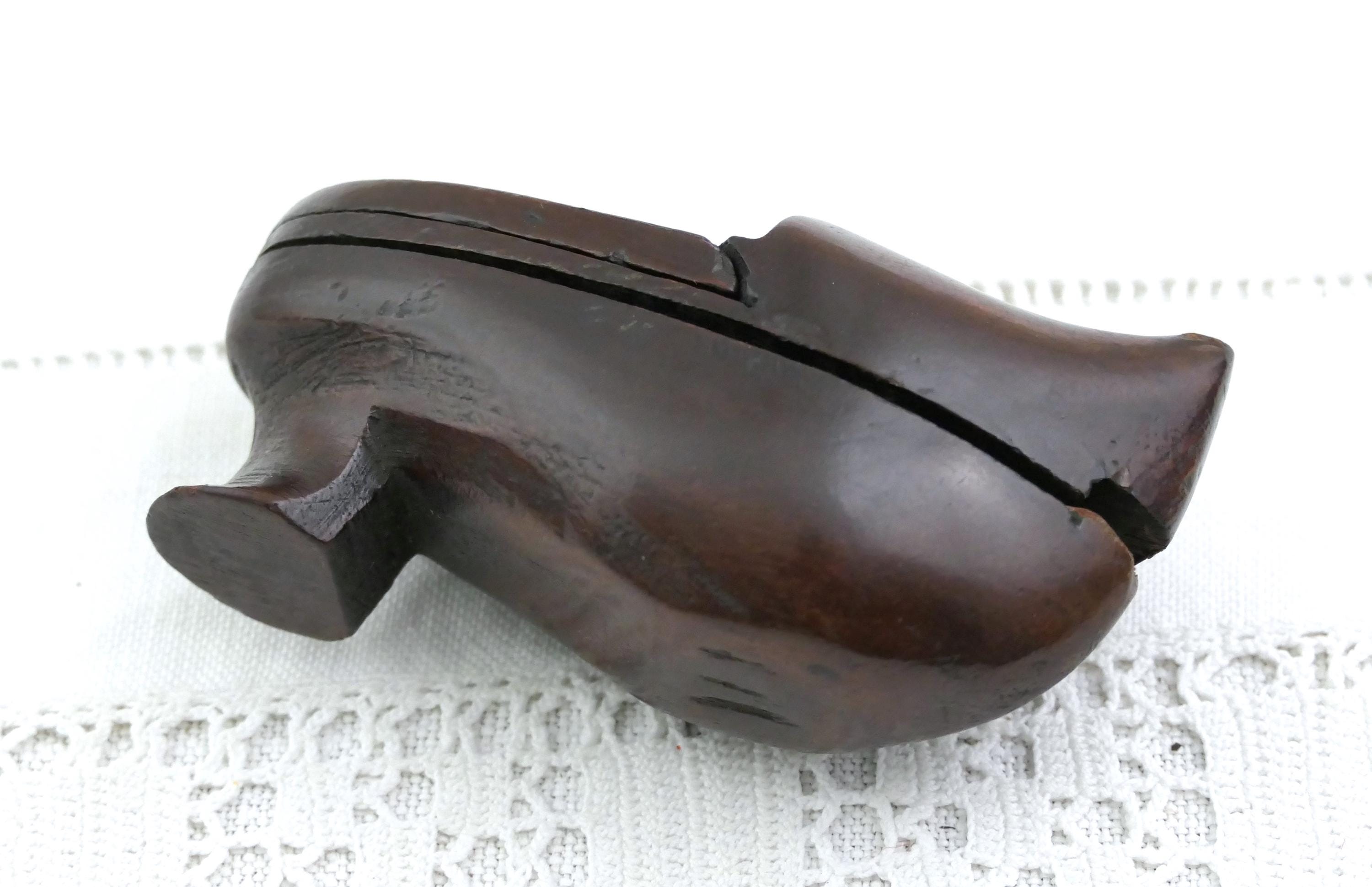 Antique French treen secret box shaped as a wooden clog. The opening of the box is a a puzzle, unfortunately someone has forced and snapped the closure ( at toe end of the clog)